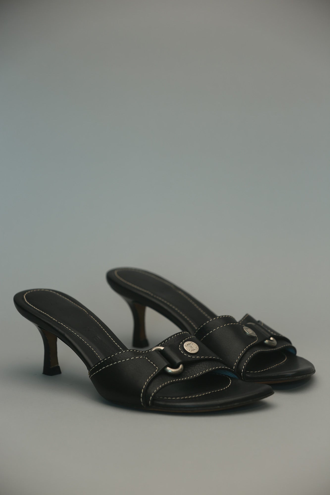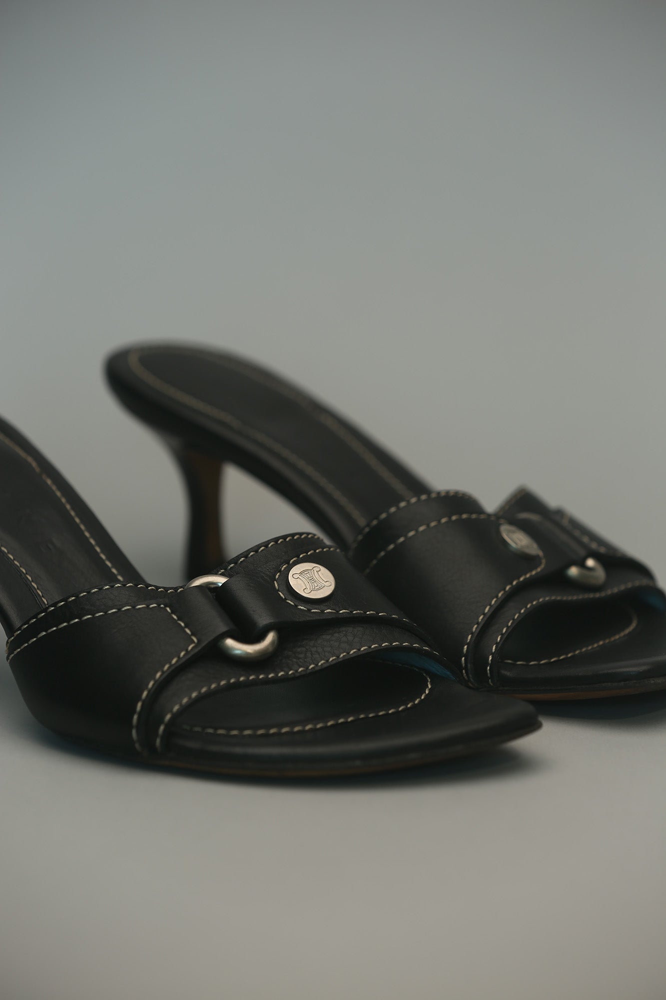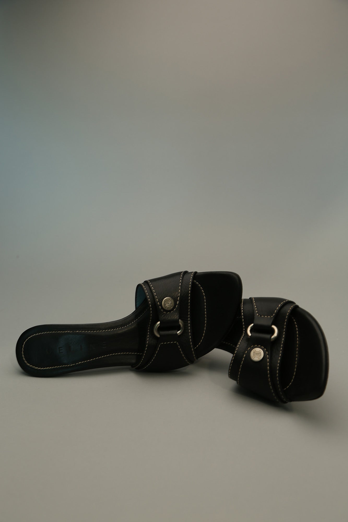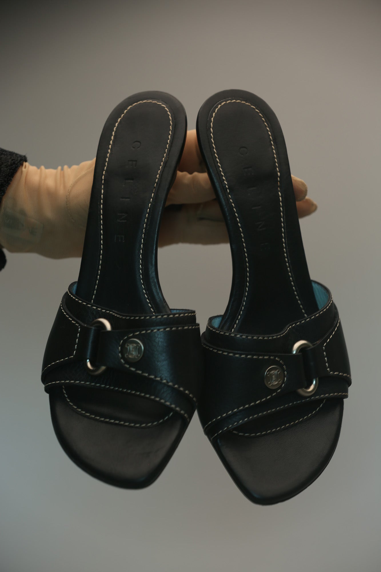 Vintage Celine black leather mules with white contrast stitching. A super trendy and timeless piece. Silver hardware chain link and button with Celine logo.