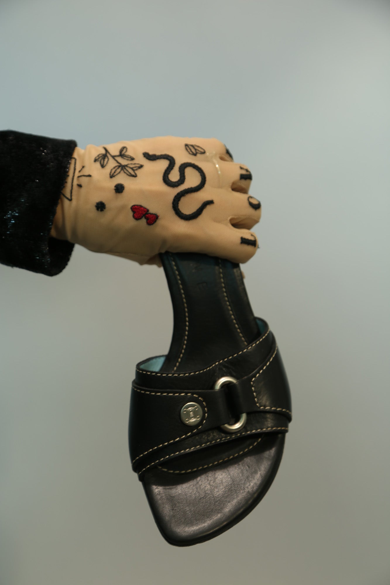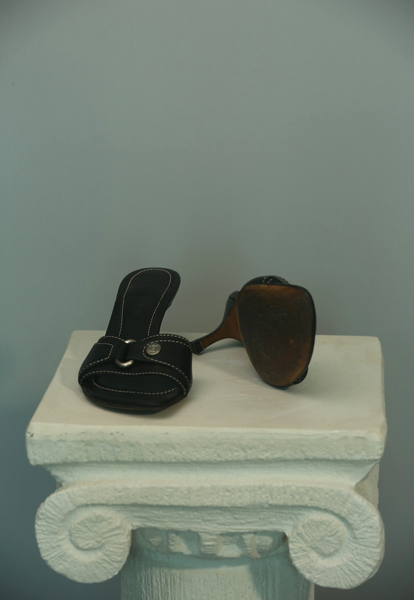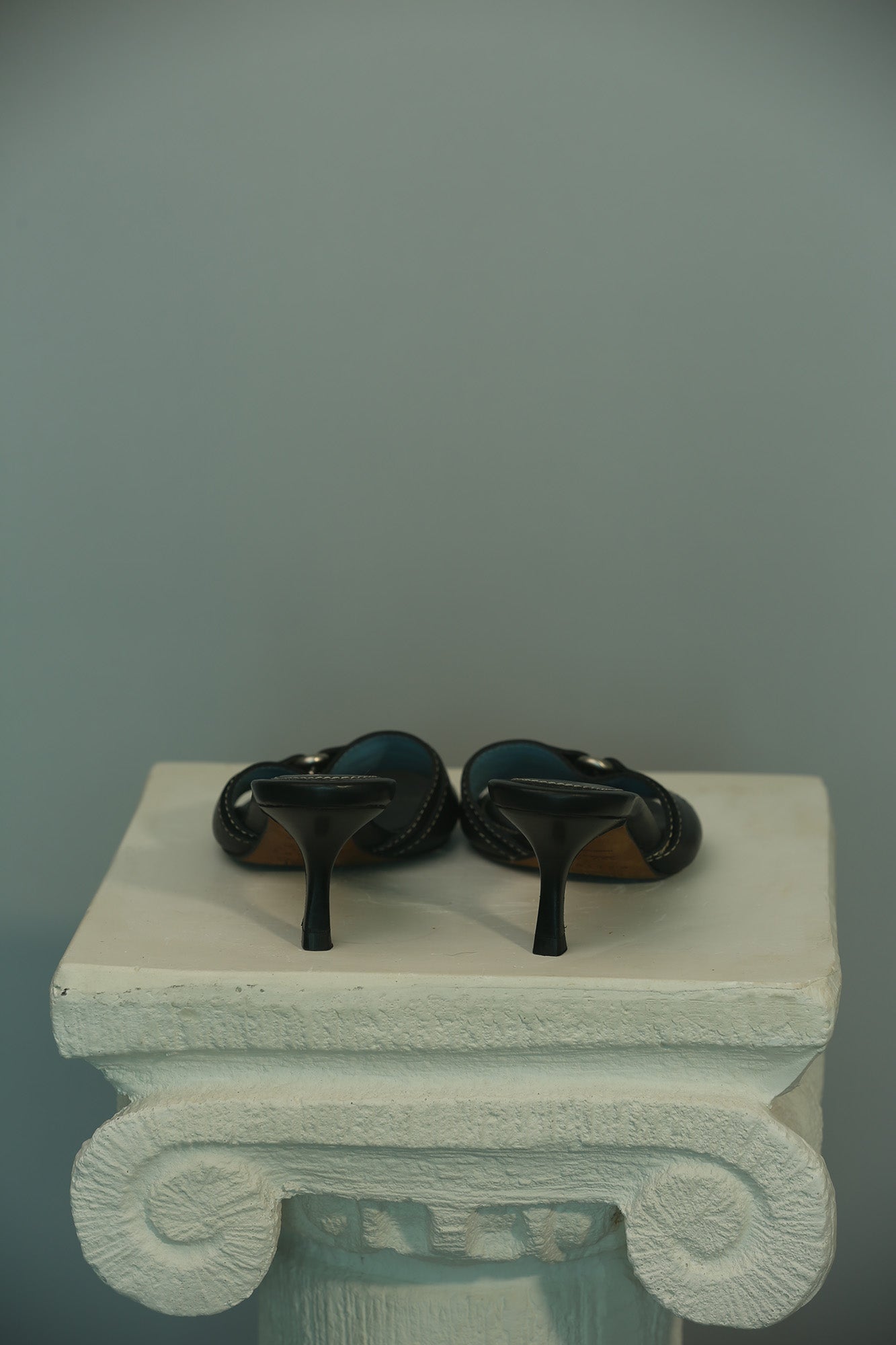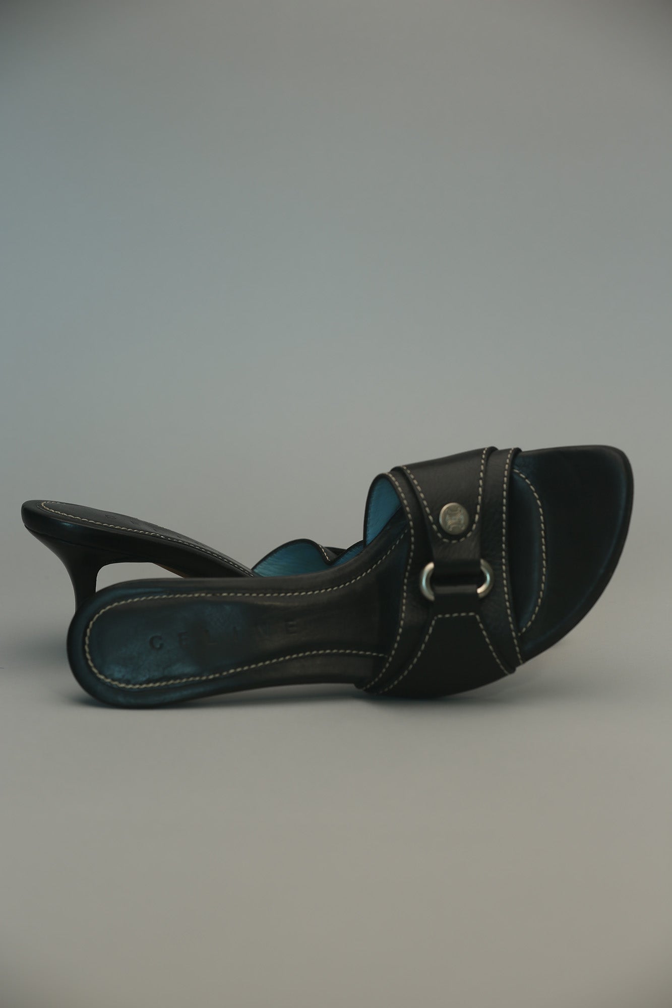Vintage Celine black leather mules with white contrast stitching. A super trendy and timeless piece. Silver hardware chain link and button with Celine logo.
