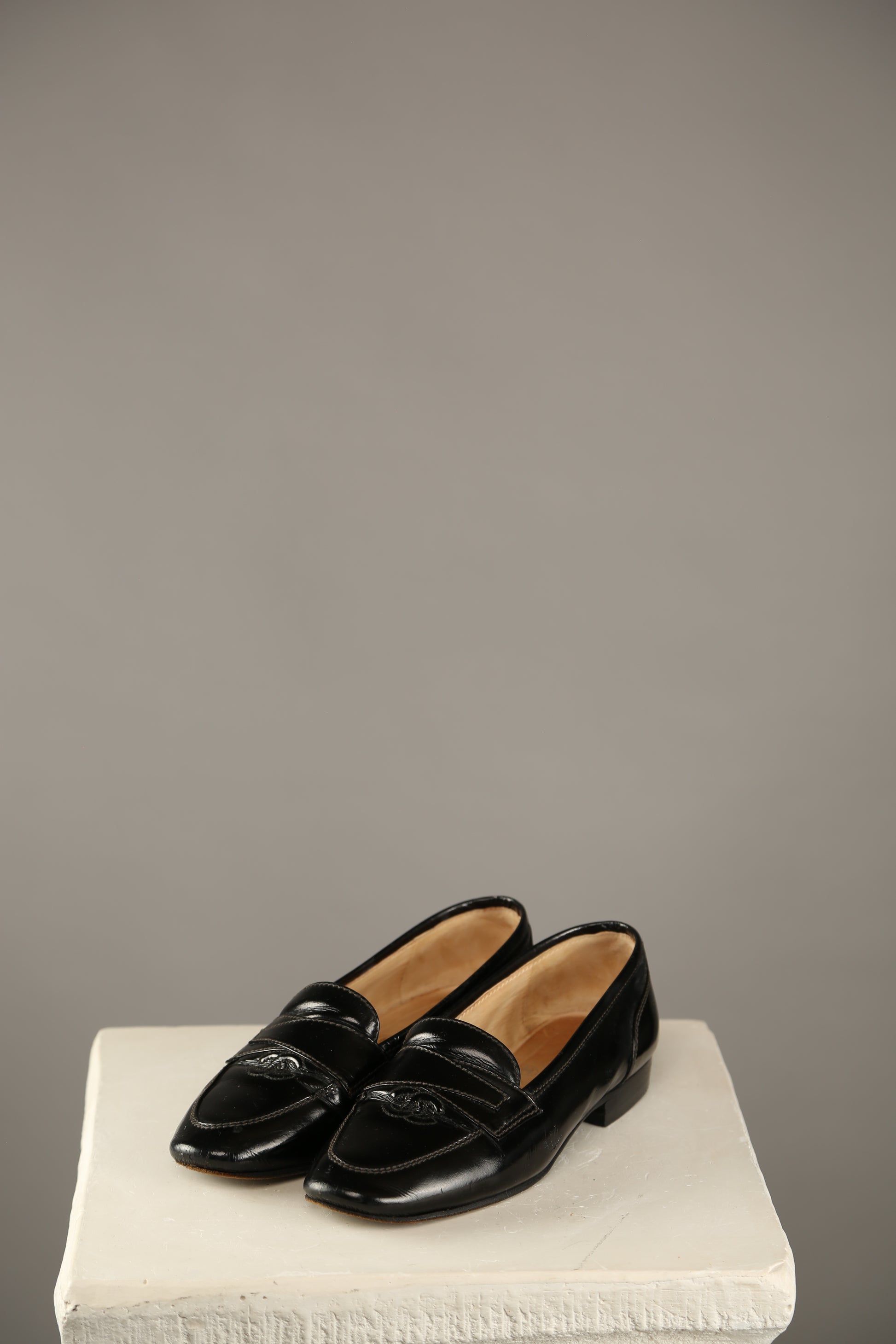 Beautiful and hard to find, these rare vintage Chanel loafers feature sleek black patent leather and the iconic CC logo on the toe—a classic, polished Chanel silhouette that never goes out of style.