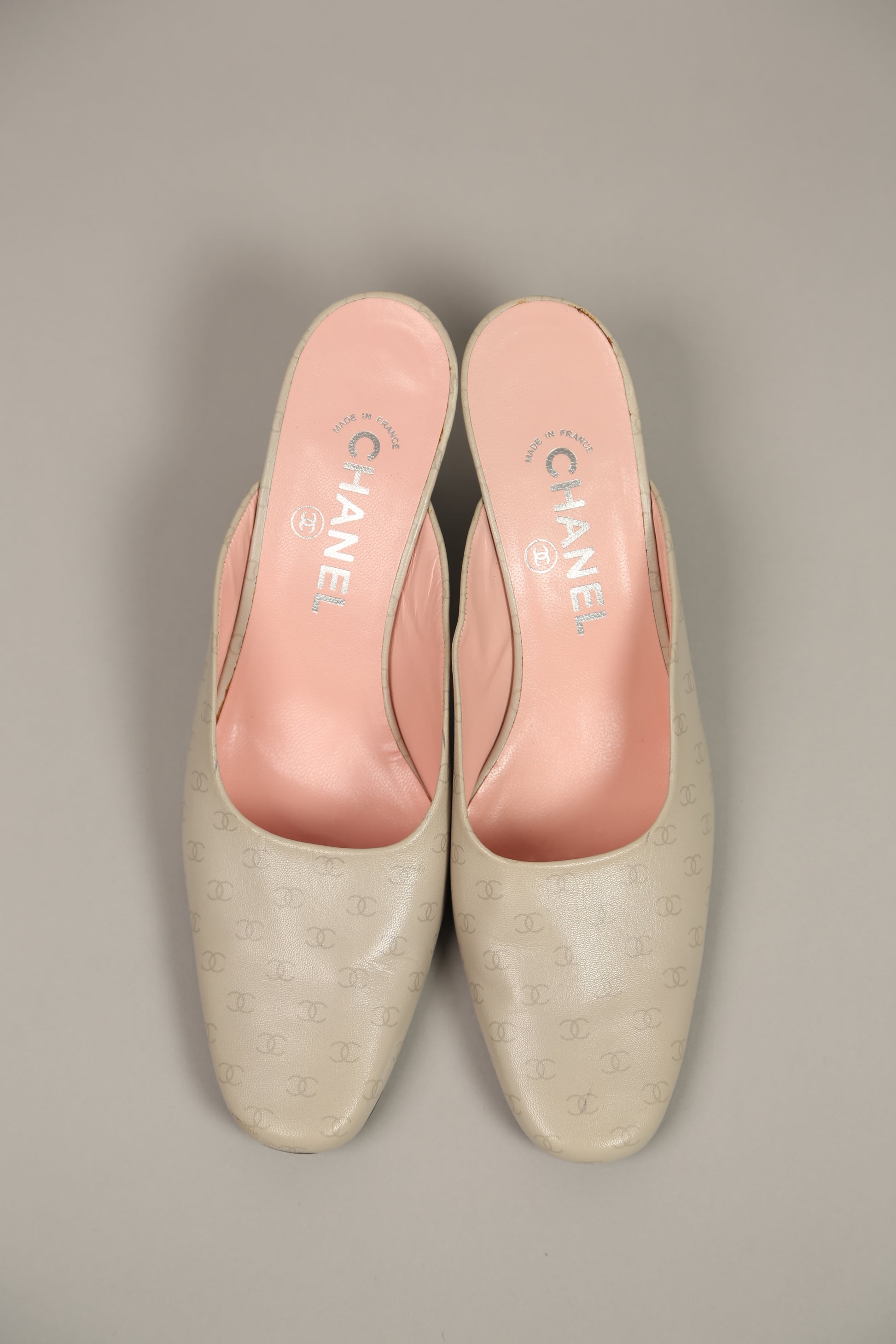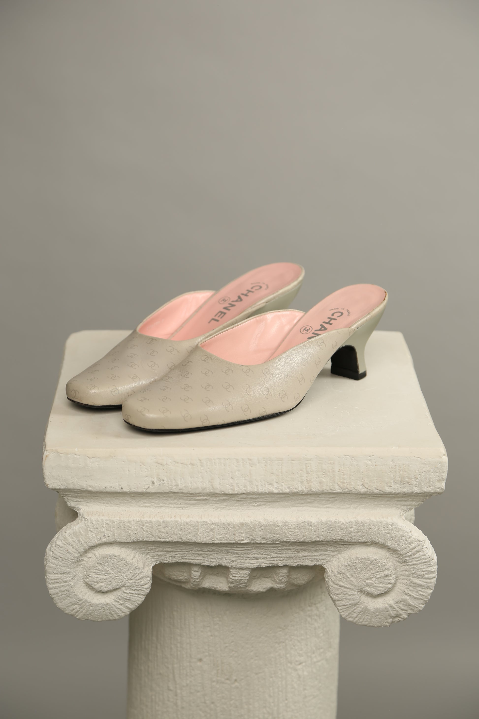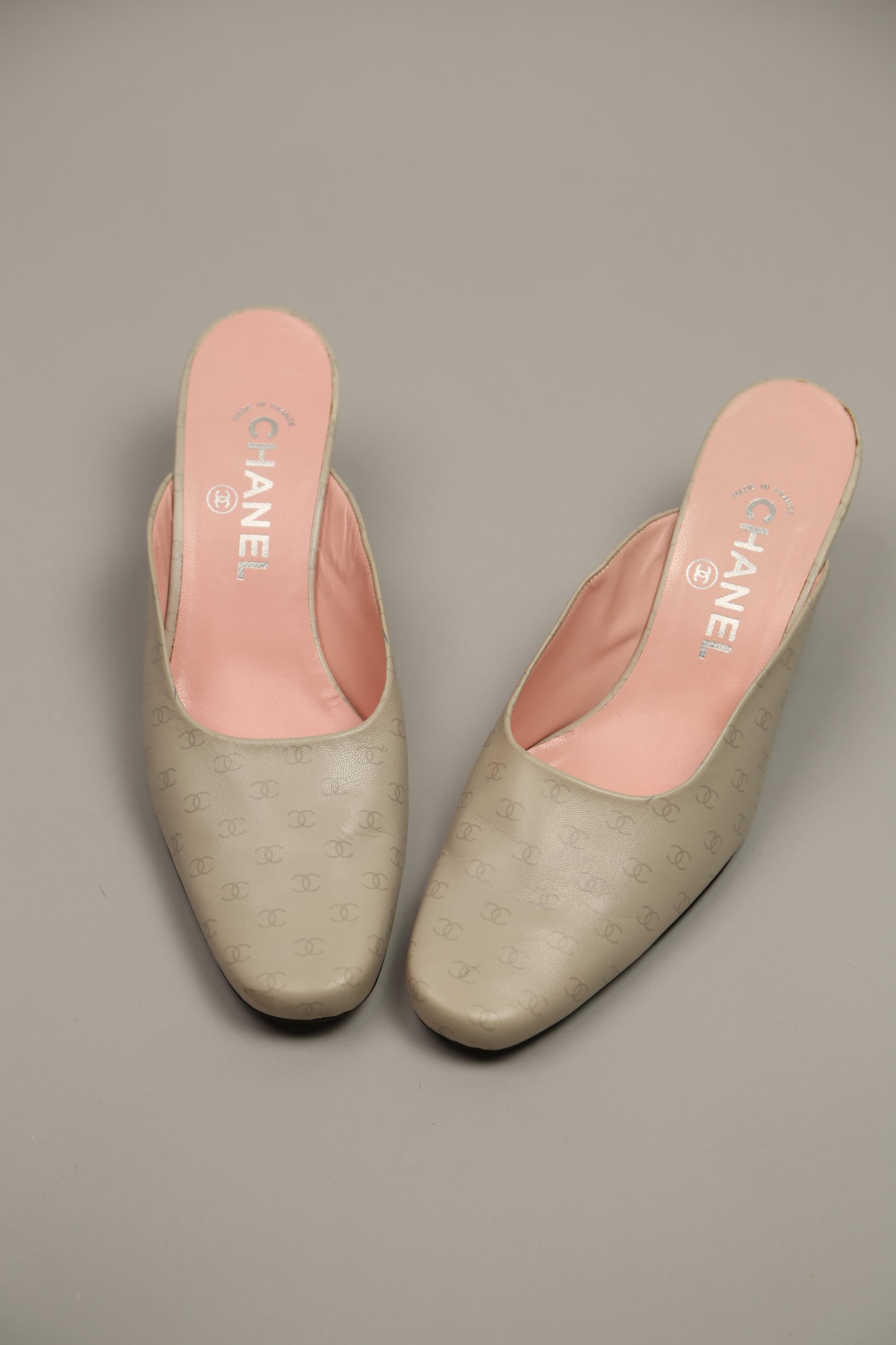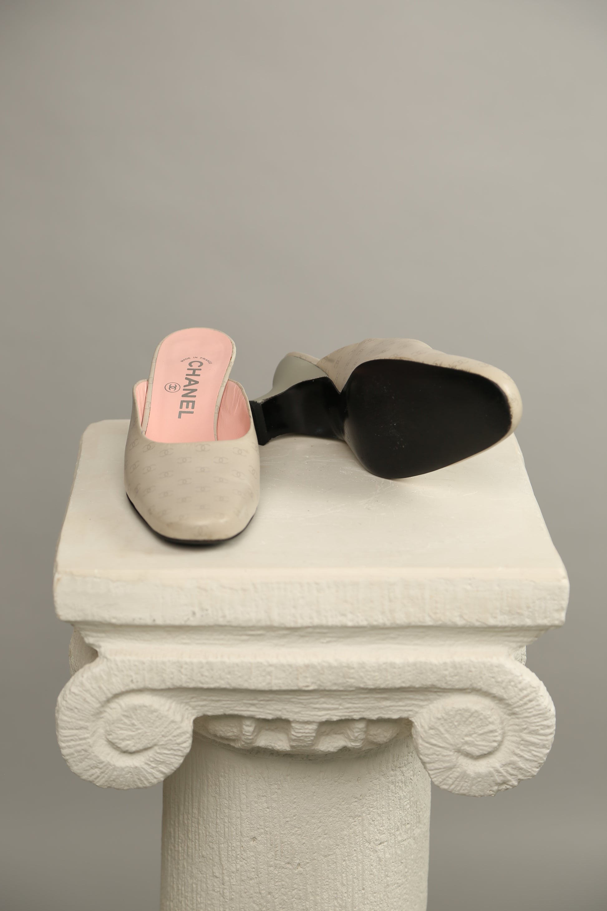 Iconic Vintage Chanel CC Logo Mules – 90s Pastel Grey