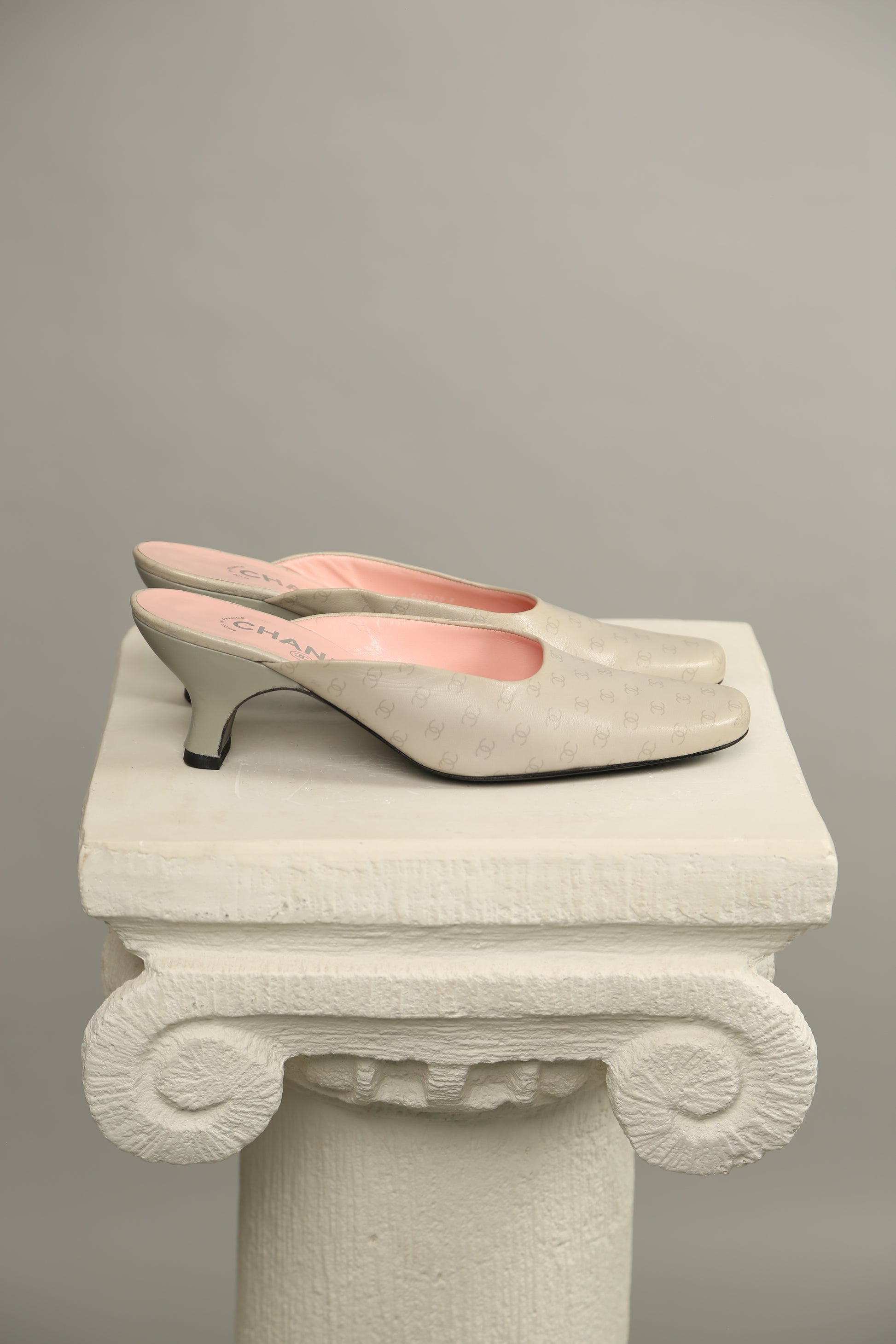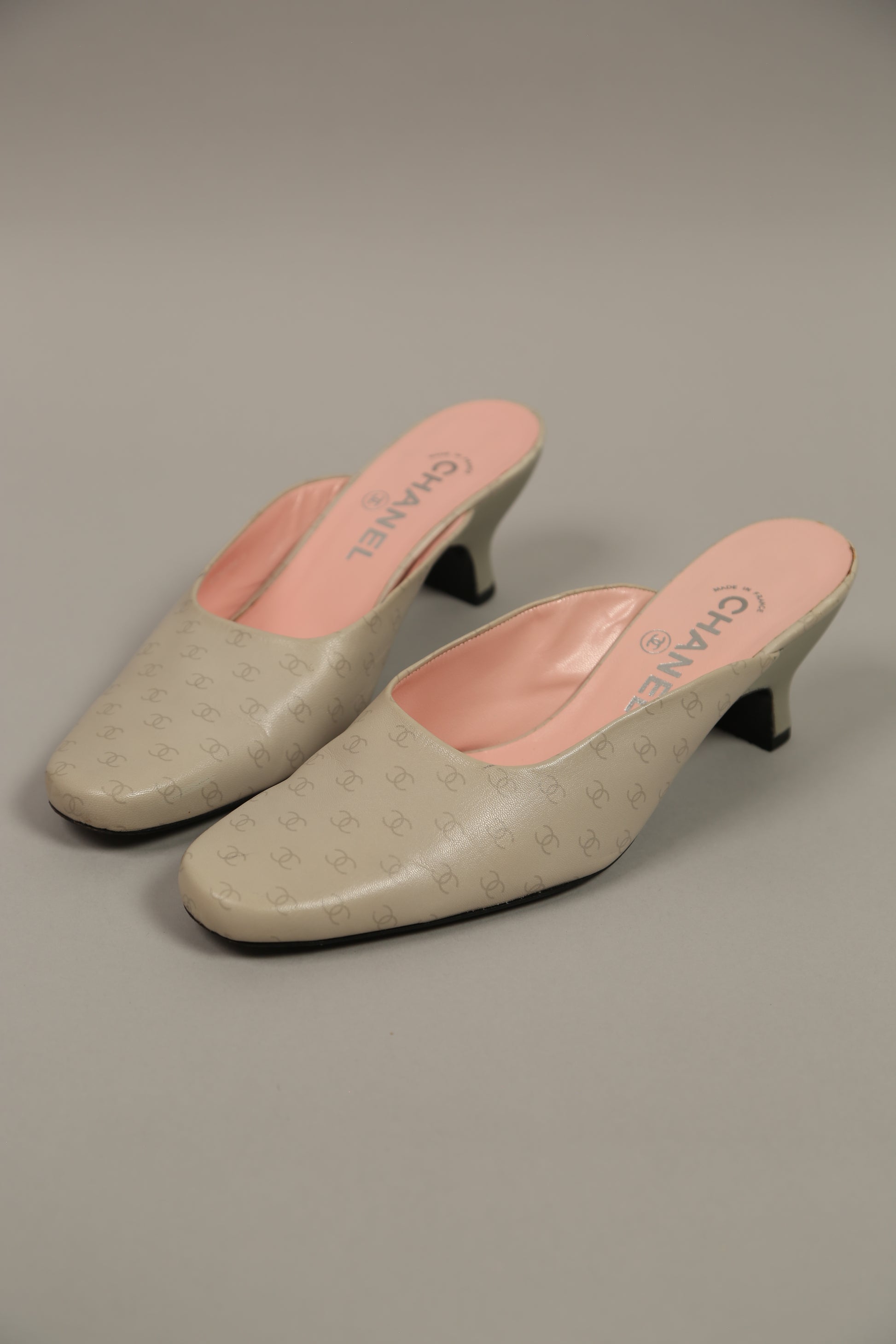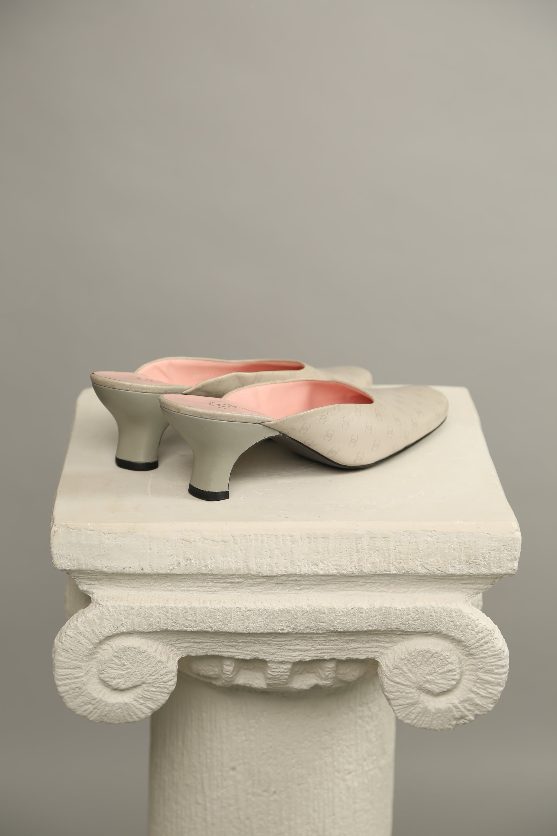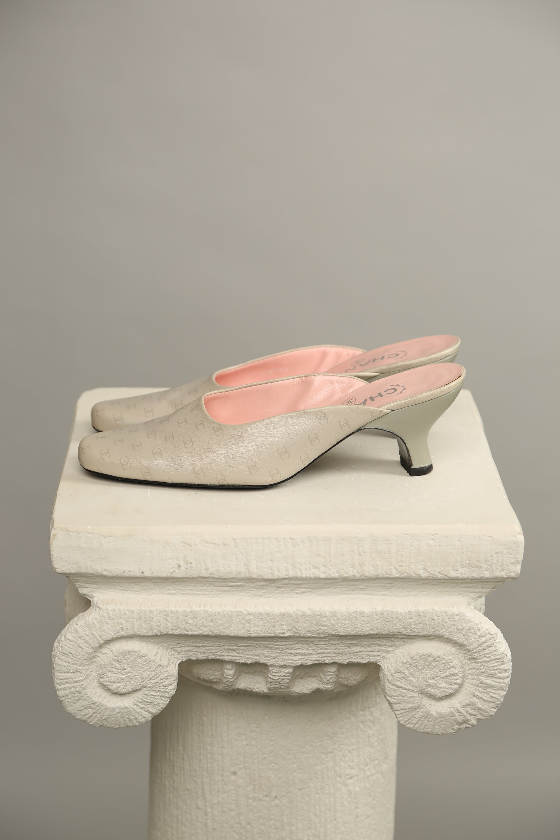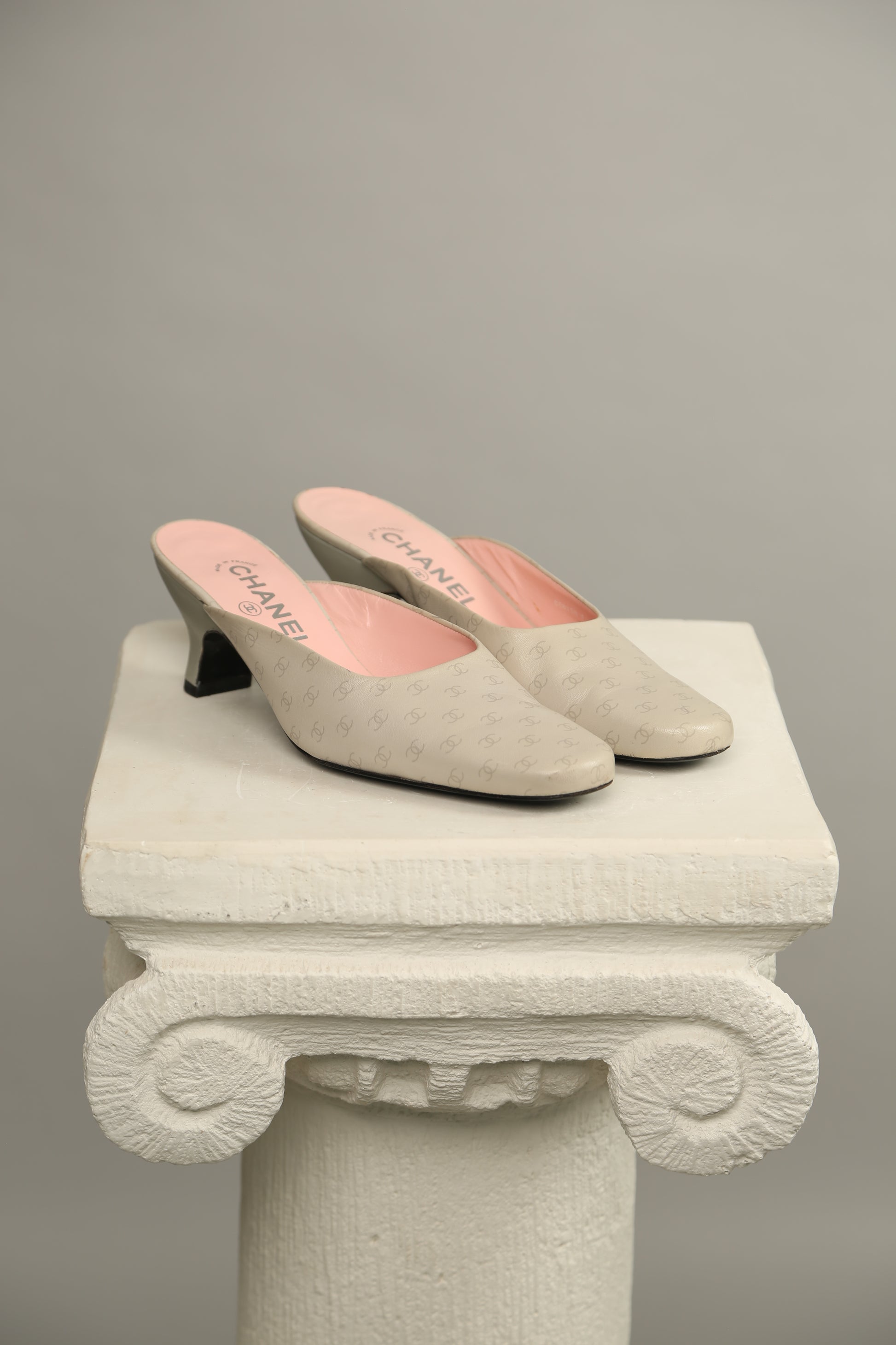 Iconic Vintage Chanel CC Logo Mules – 90s Pastel Grey