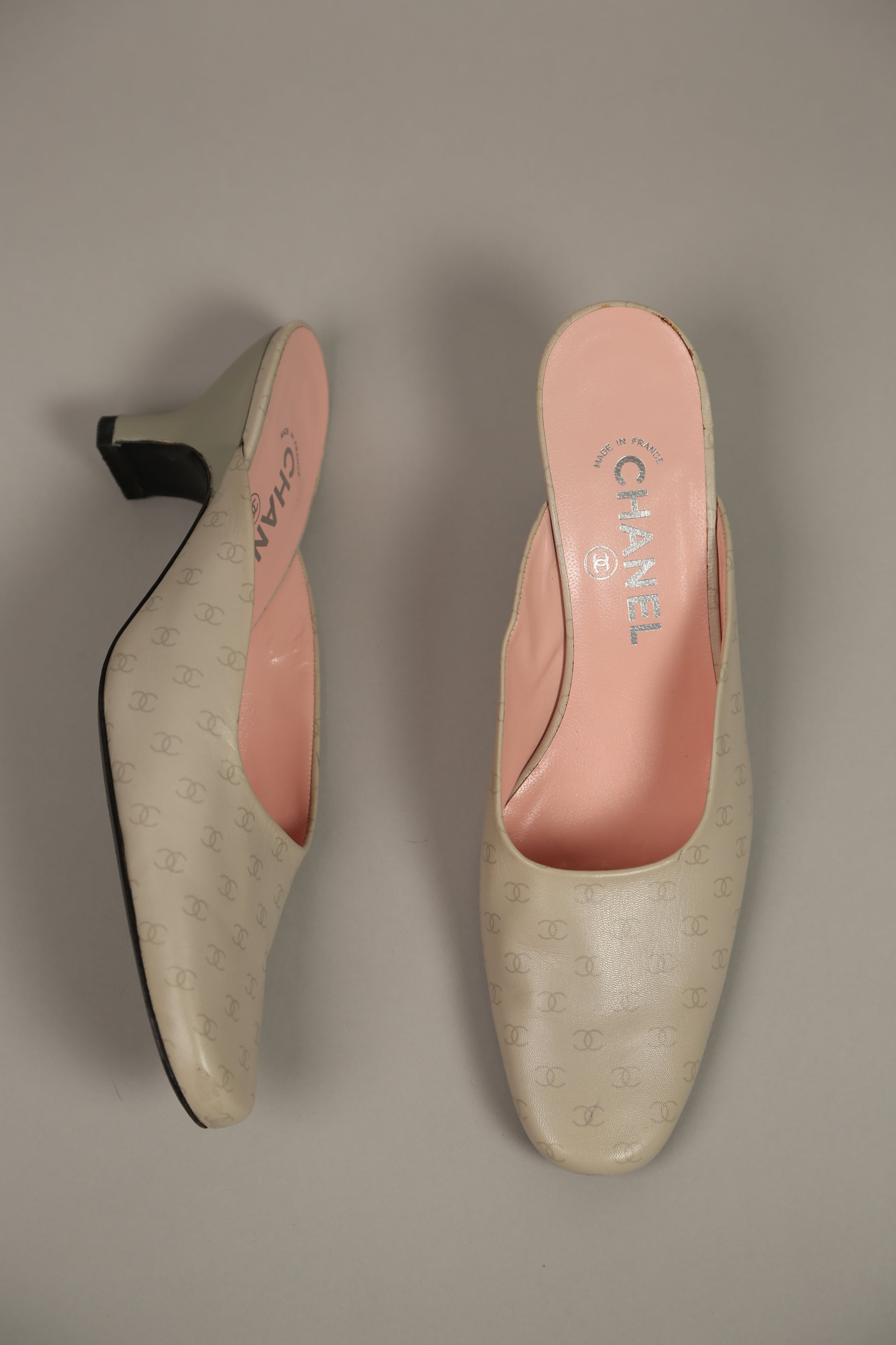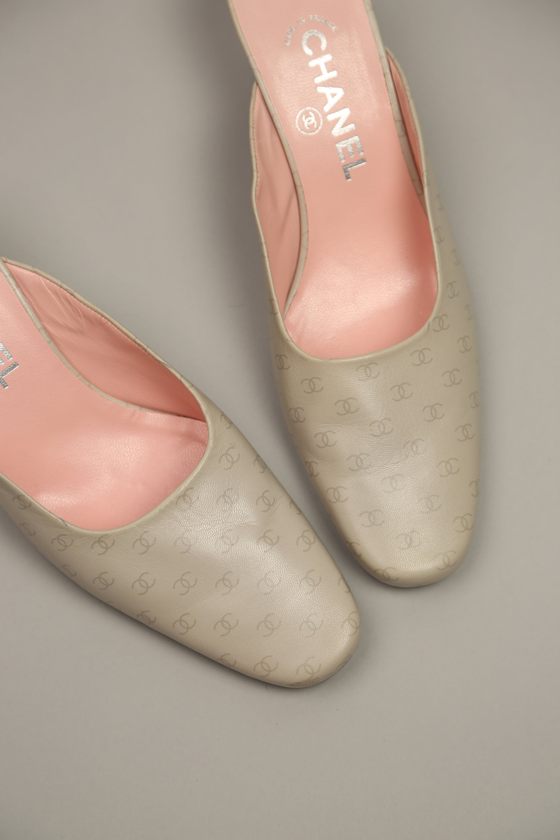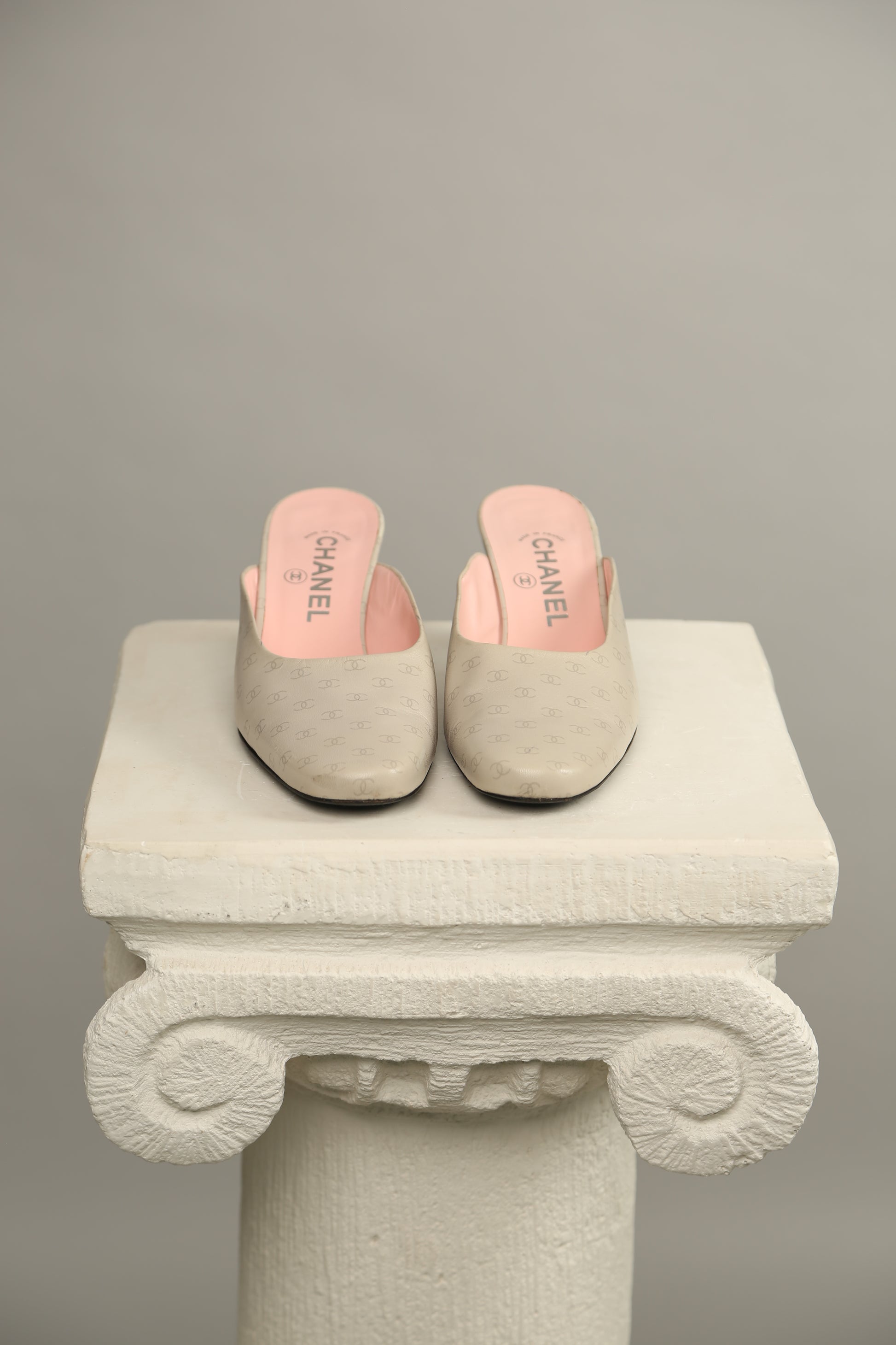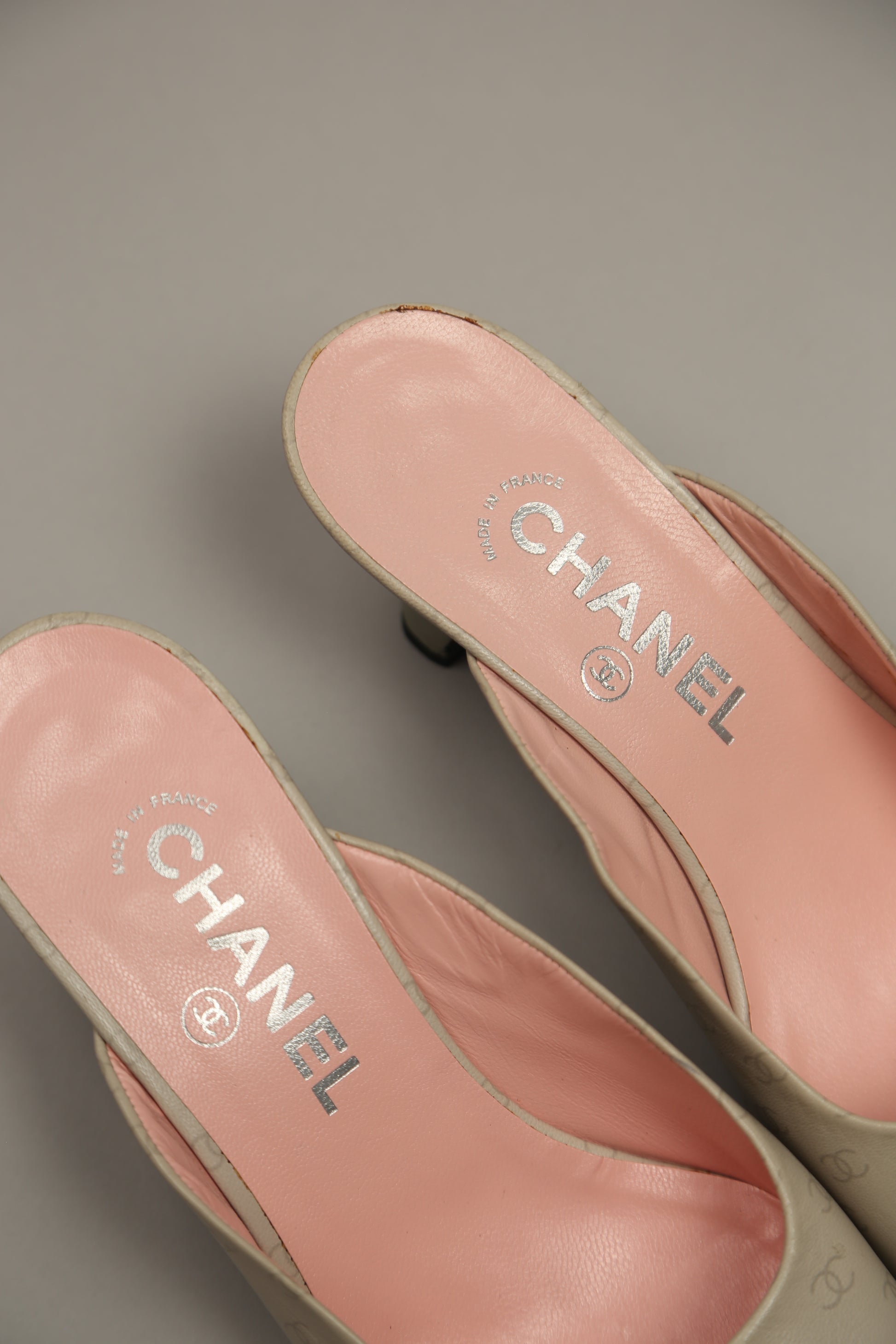 Iconic Vintage Chanel CC Logo Mules – 90s Pastel Grey