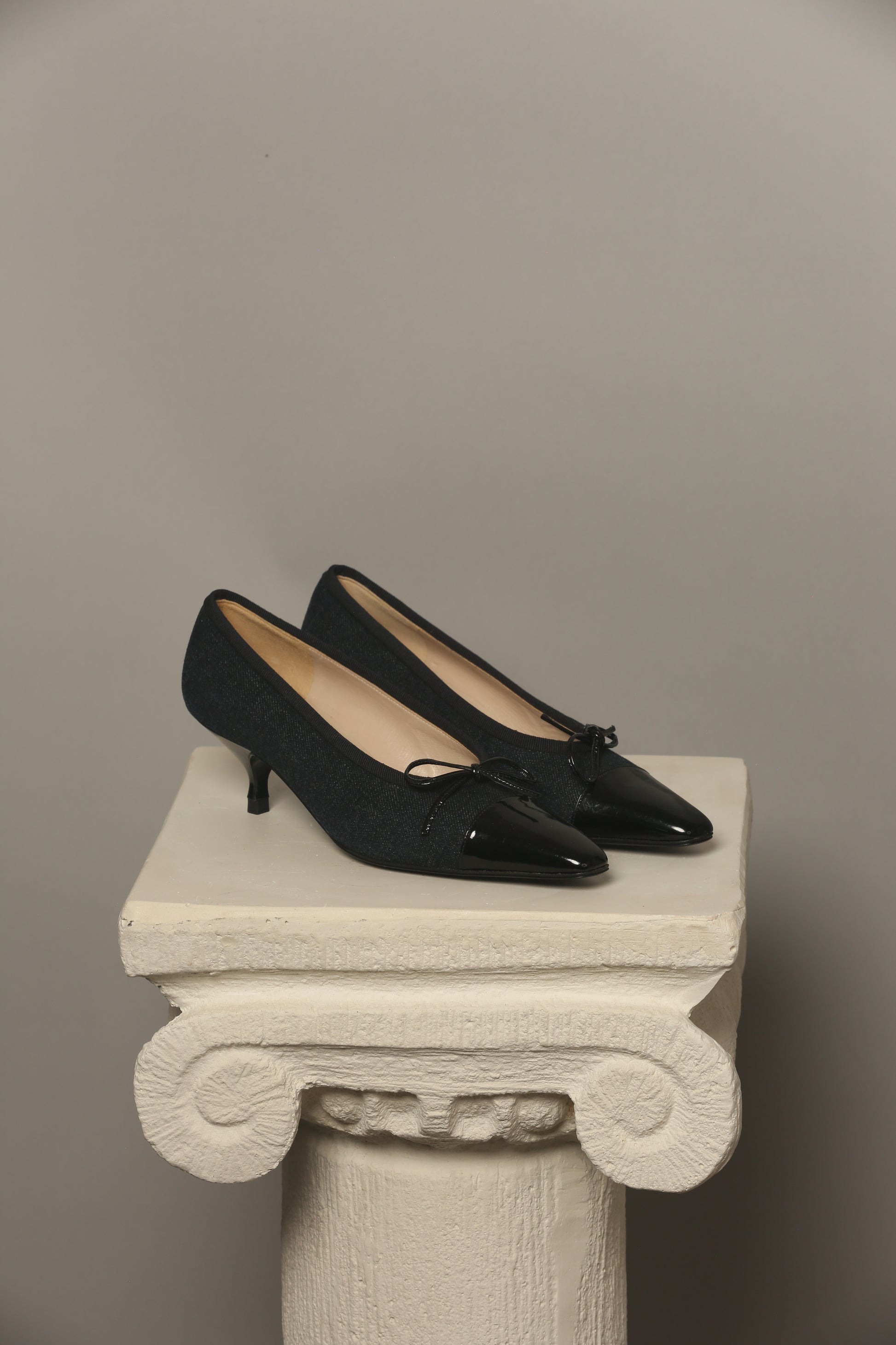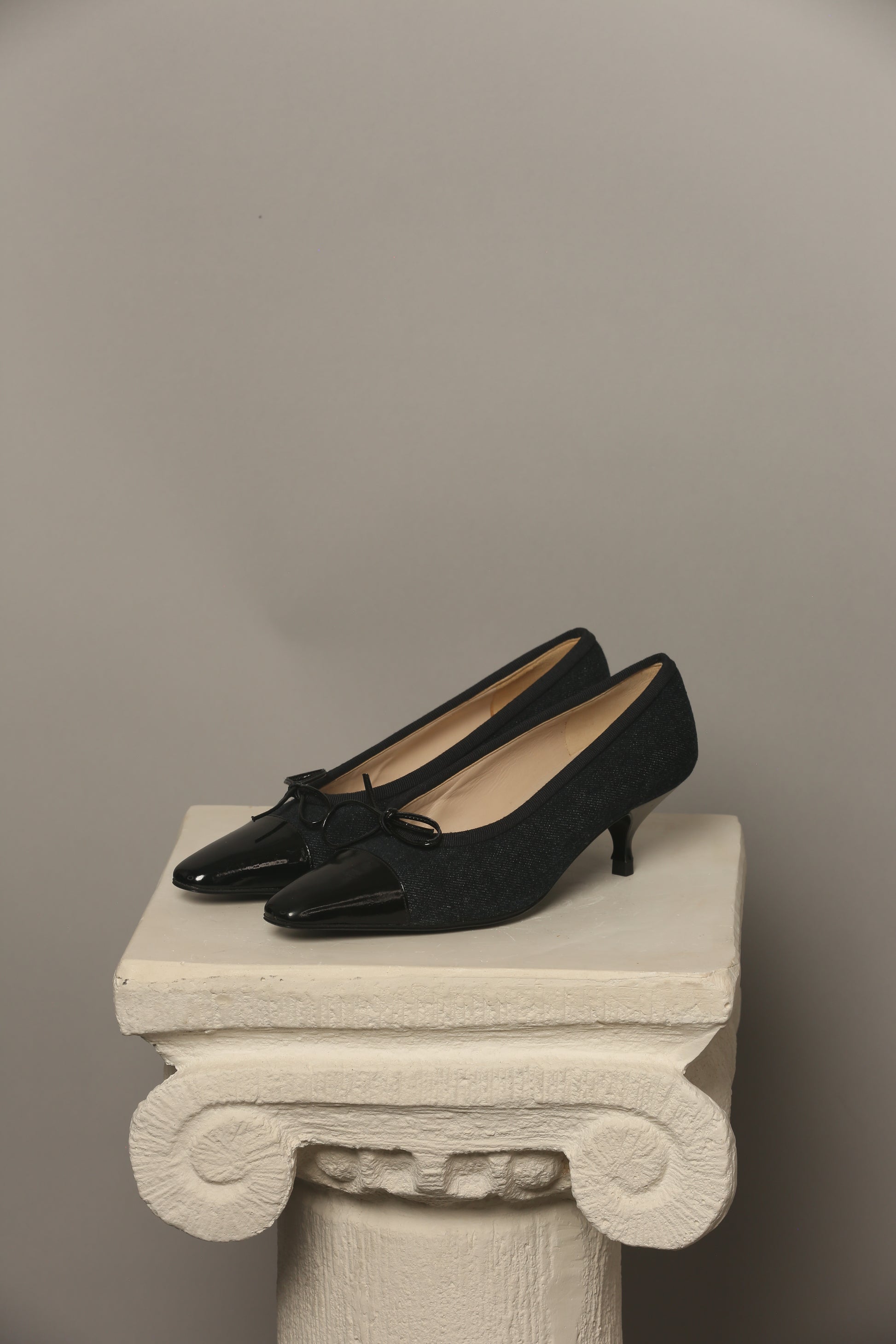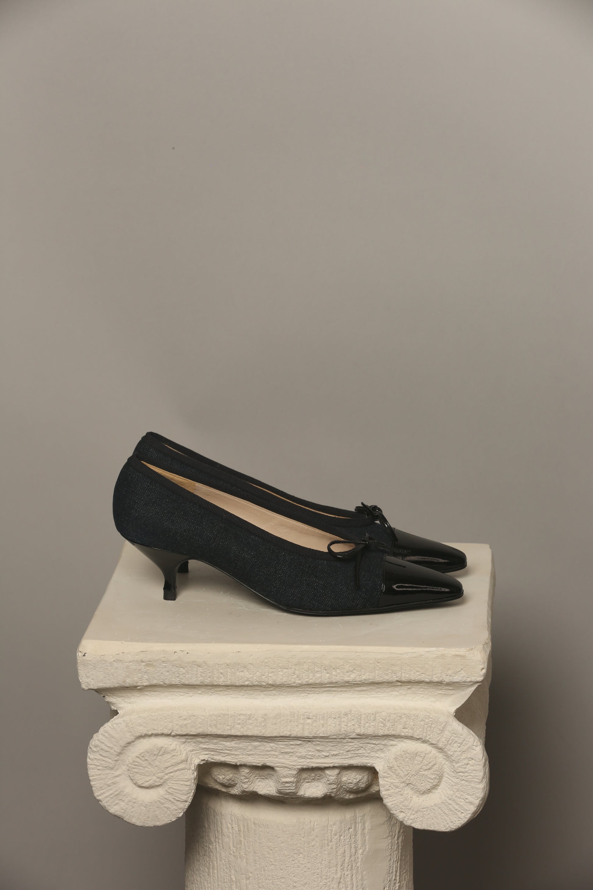 Discover a rare vintage gem! These never-worn shoes present a super cute fusion of dark blue denim and sleek black patent leather, an iconic combination that stands out. Adorned with the signature bow on the toe, these shoes exude a timeless charm. Included with an Authenticity Certificate.