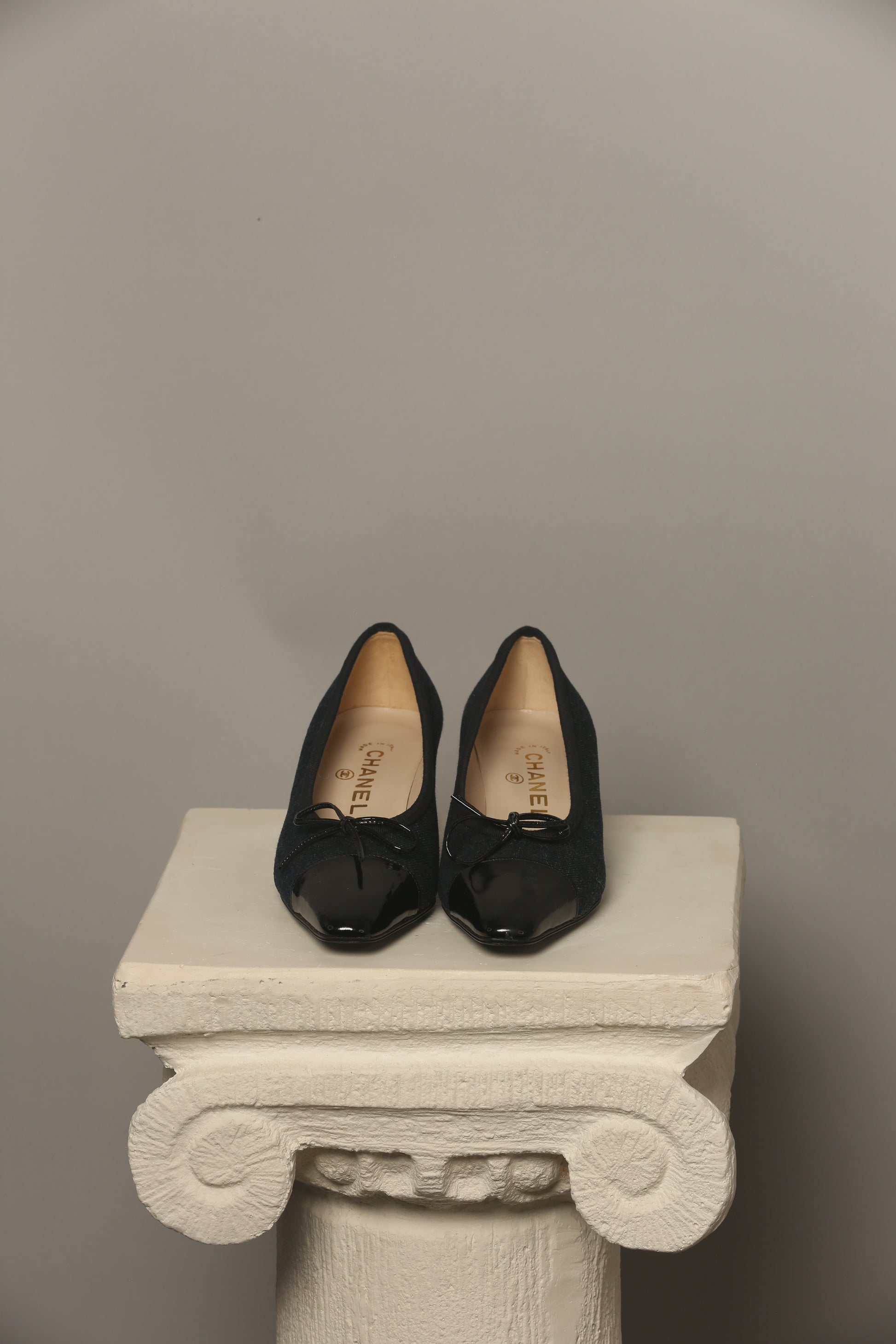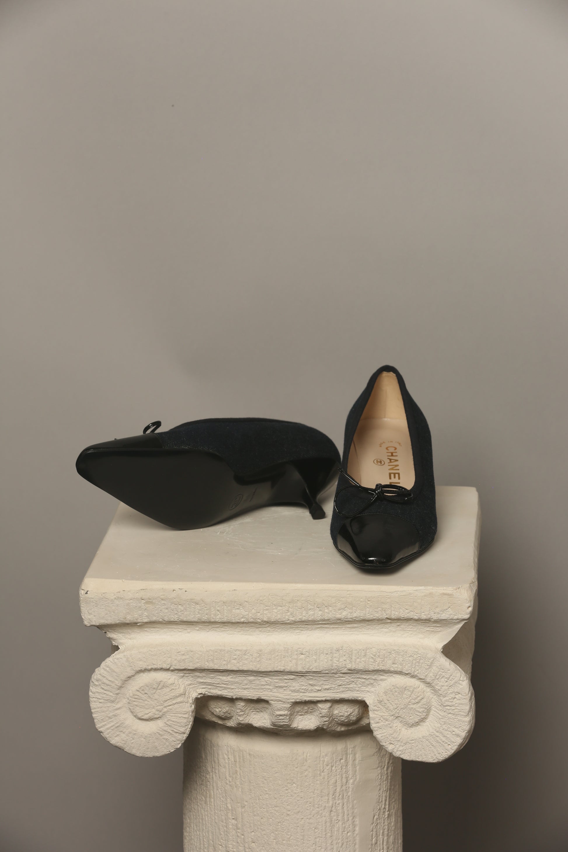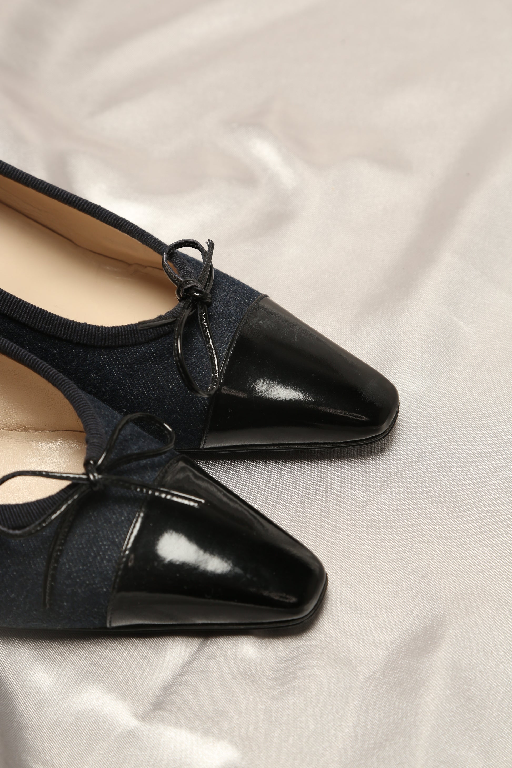 Discover a rare vintage gem! These never-worn shoes present a super cute fusion of dark blue denim and sleek black patent leather, an iconic combination that stands out. Adorned with the signature bow on the toe, these shoes exude a timeless charm. Included with an Authenticity Certificate.