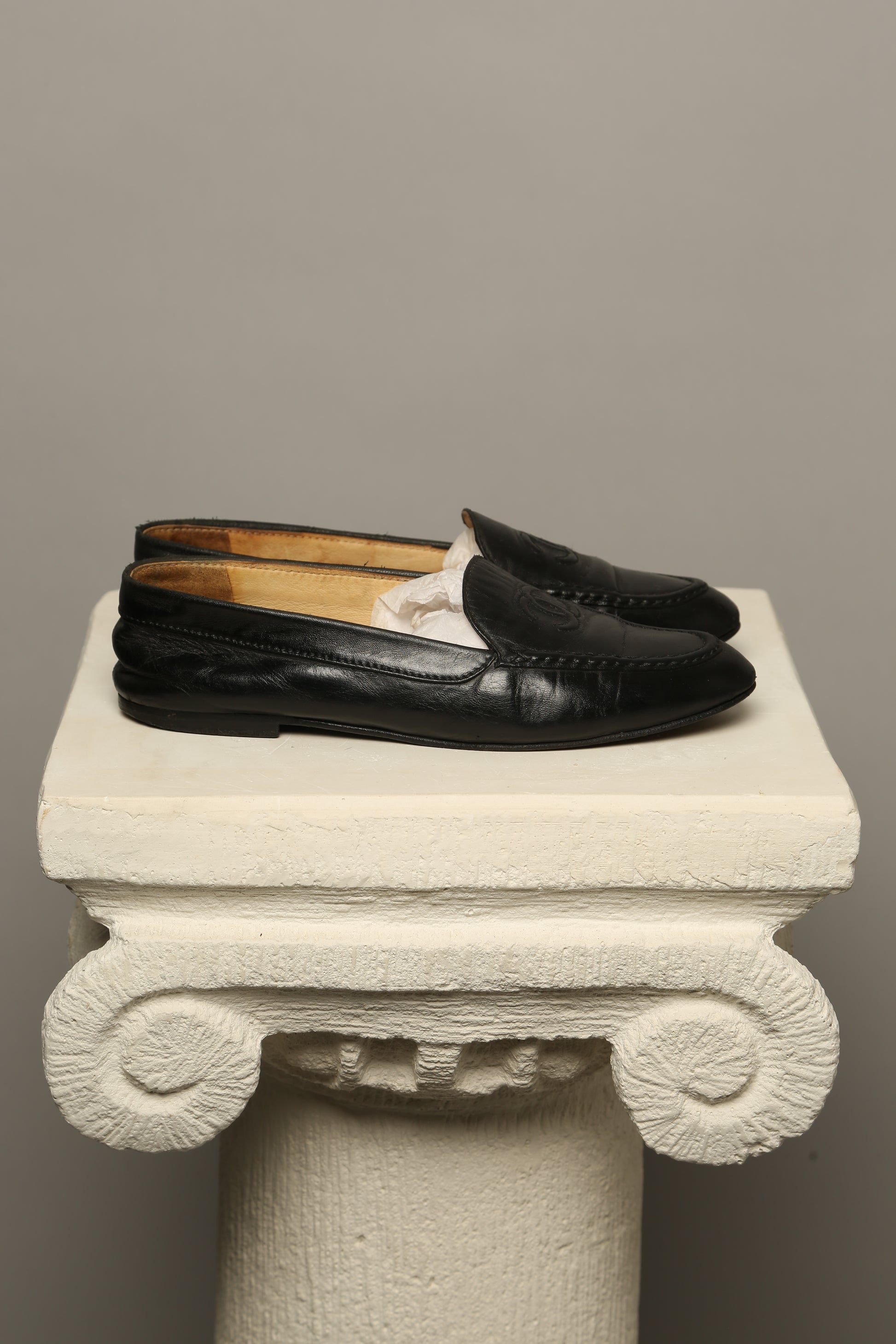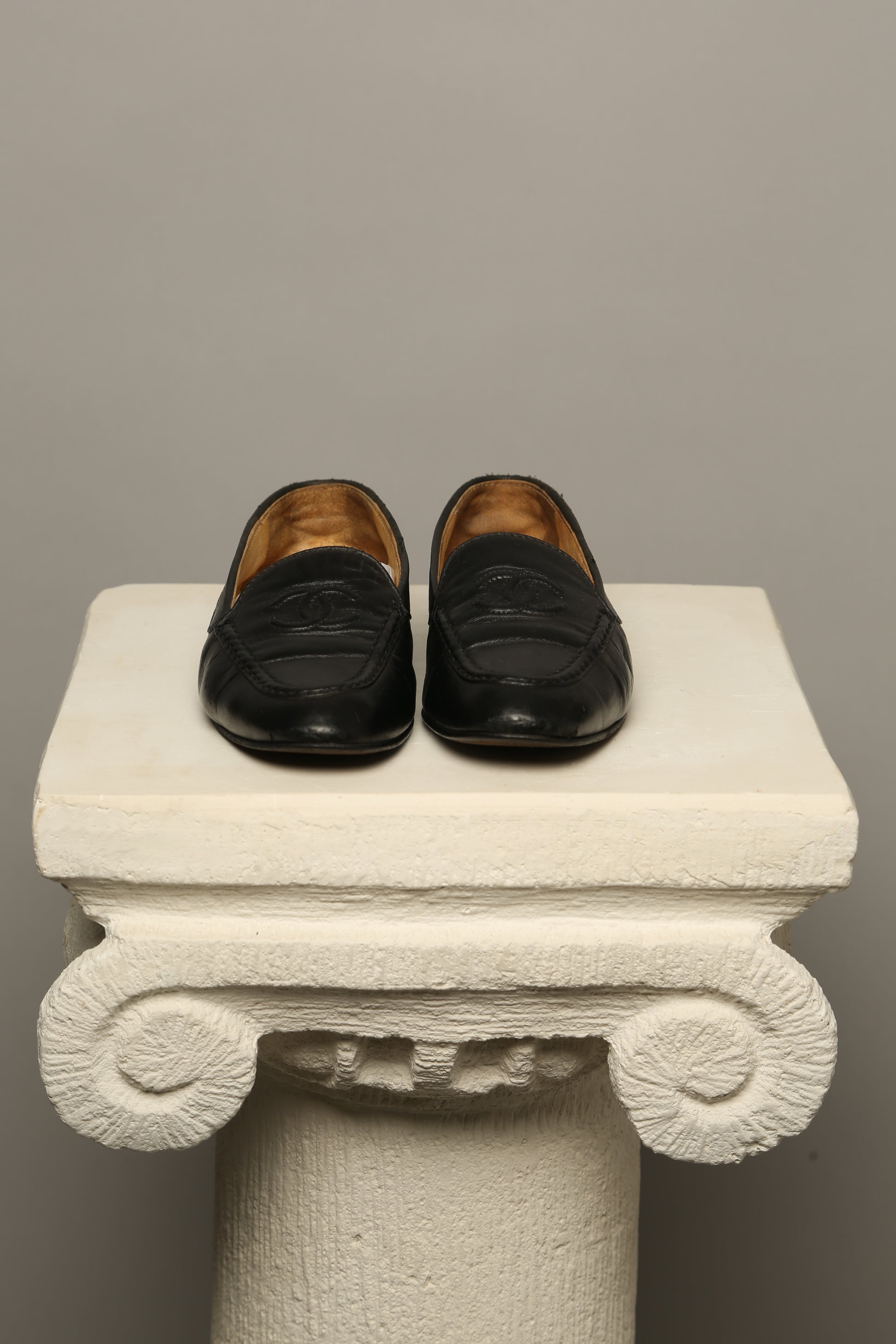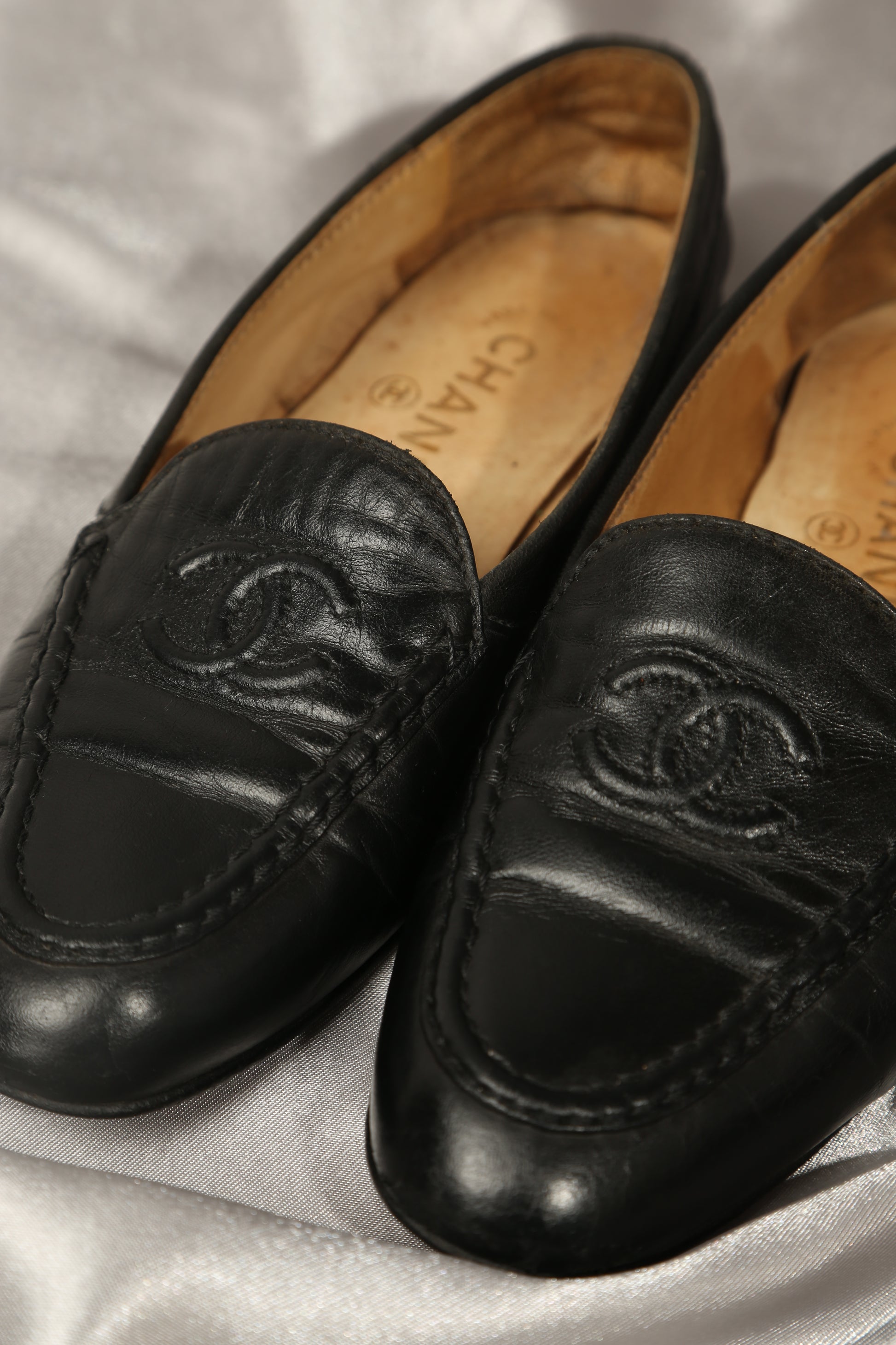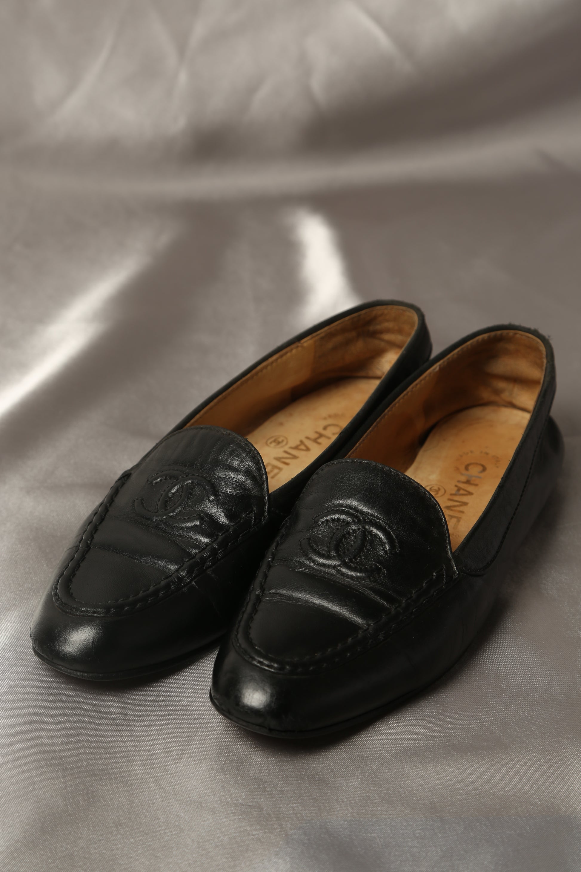Presenting the Chanel Women's Double C Slip-On Loafers in classic black. Featuring a slip-on style with an oval toe design, these loafers showcase the iconic CC logos on the uppers, adding a touch of elegance. Crafted with lambskin leather uppers, leather insoles, and leather soles, these well-loved shoes carry a unique vintage character. These vintage shoes exhibit signs of wear, with noticeable scuffs and stains on the leather due to their age and use. While they show signs of wear and rubbing, they hold a vintage charm.