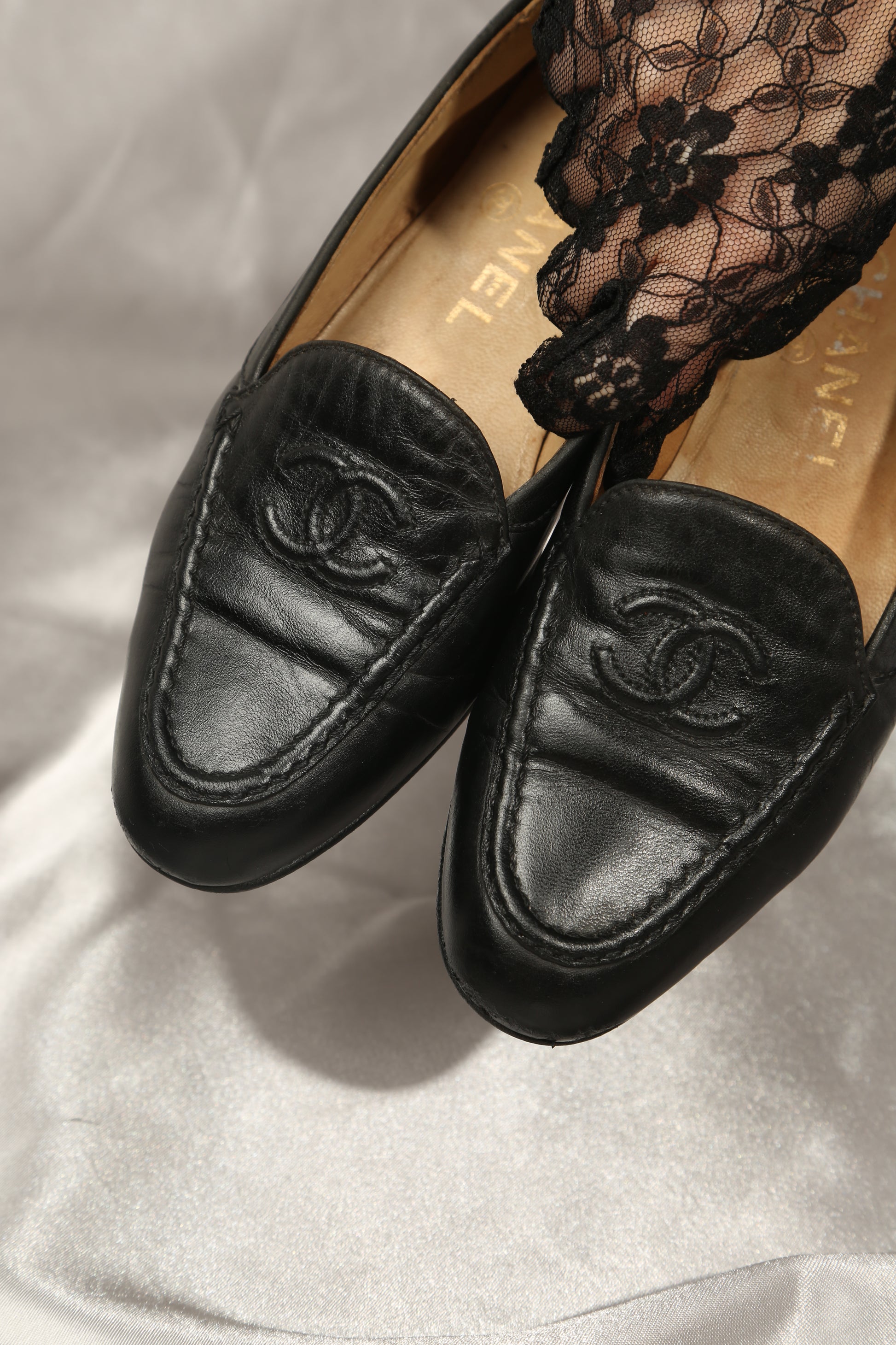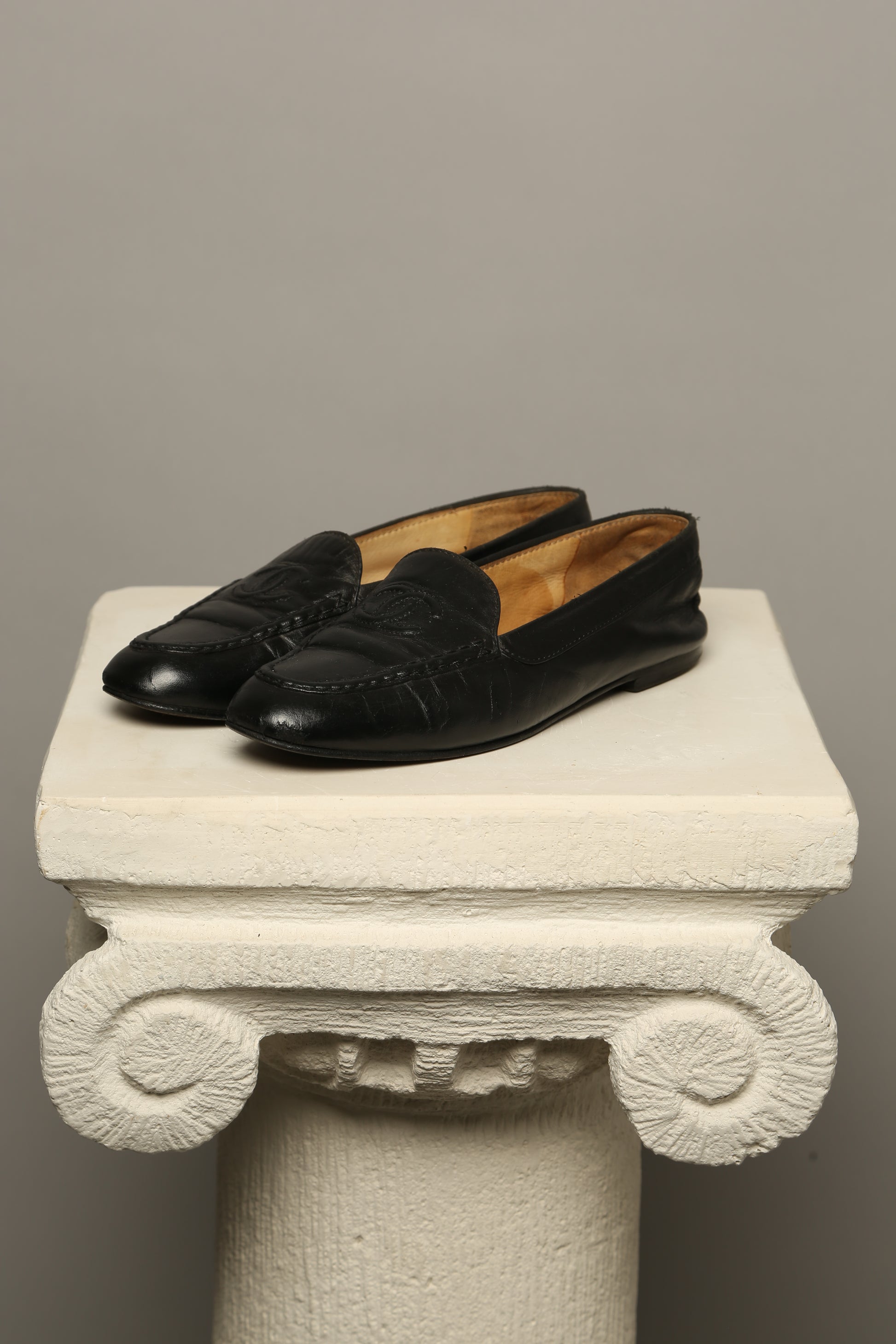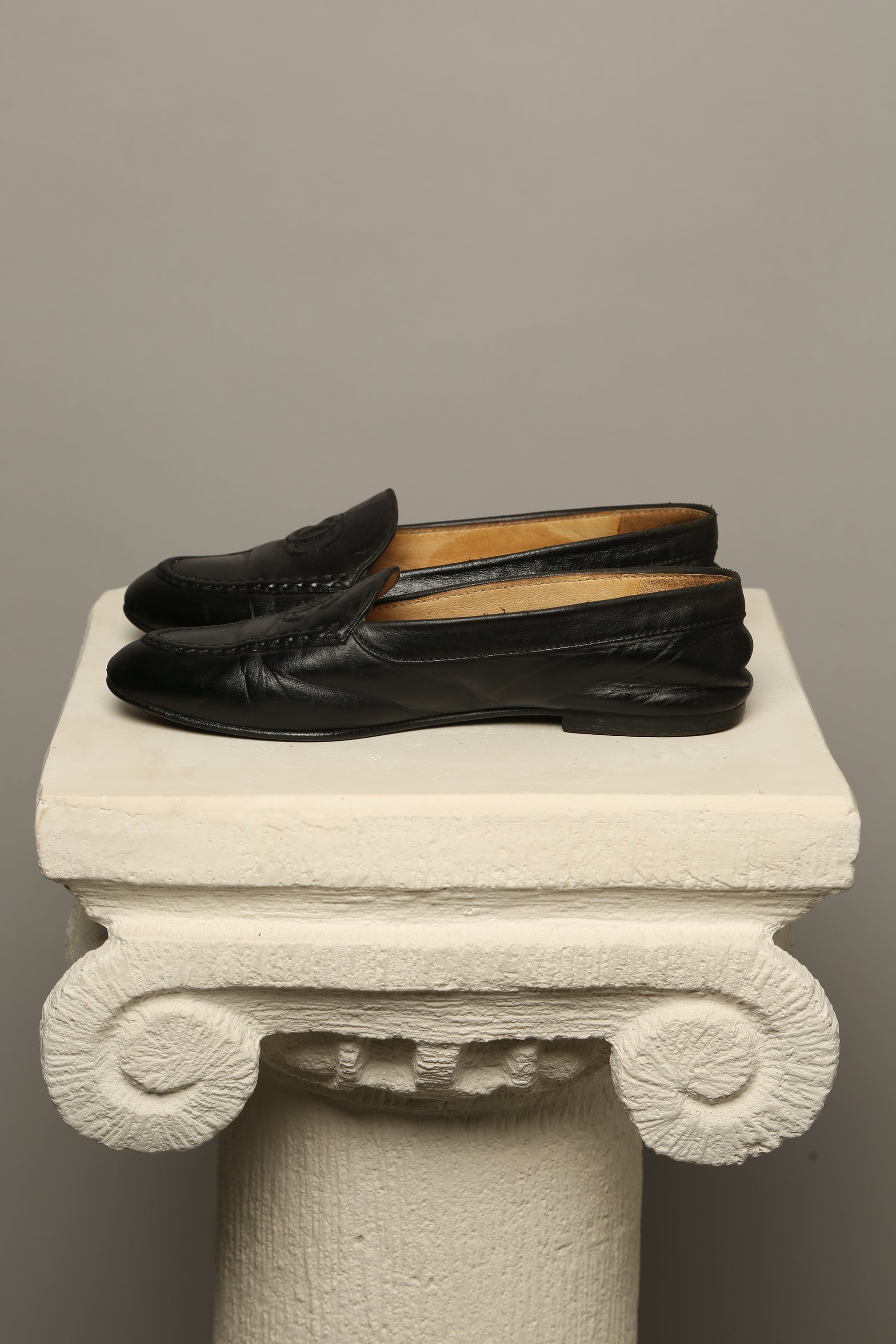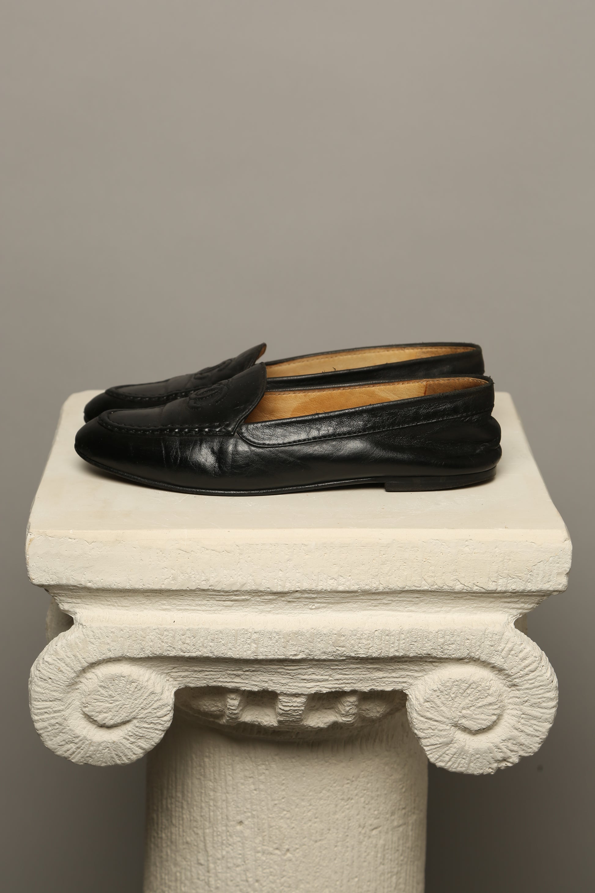 Presenting the Chanel Women's Double C Slip-On Loafers in classic black. Featuring a slip-on style with an oval toe design, these loafers showcase the iconic CC logos on the uppers, adding a touch of elegance. Crafted with lambskin leather uppers, leather insoles, and leather soles, these well-loved shoes carry a unique vintage character. These vintage shoes exhibit signs of wear, with noticeable scuffs and stains on the leather due to their age and use. While they show signs of wear and rubbing, they hold a vintage charm.