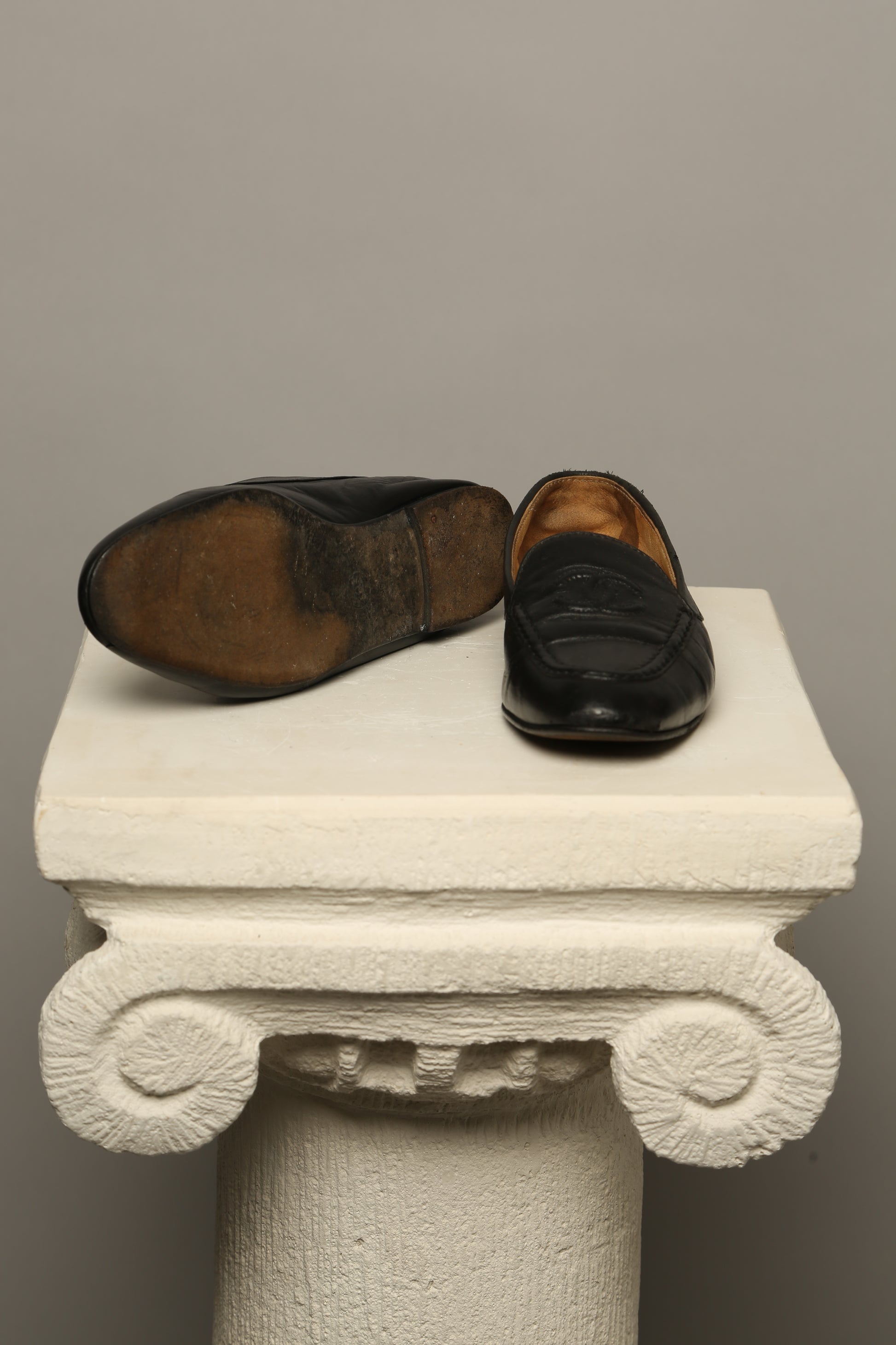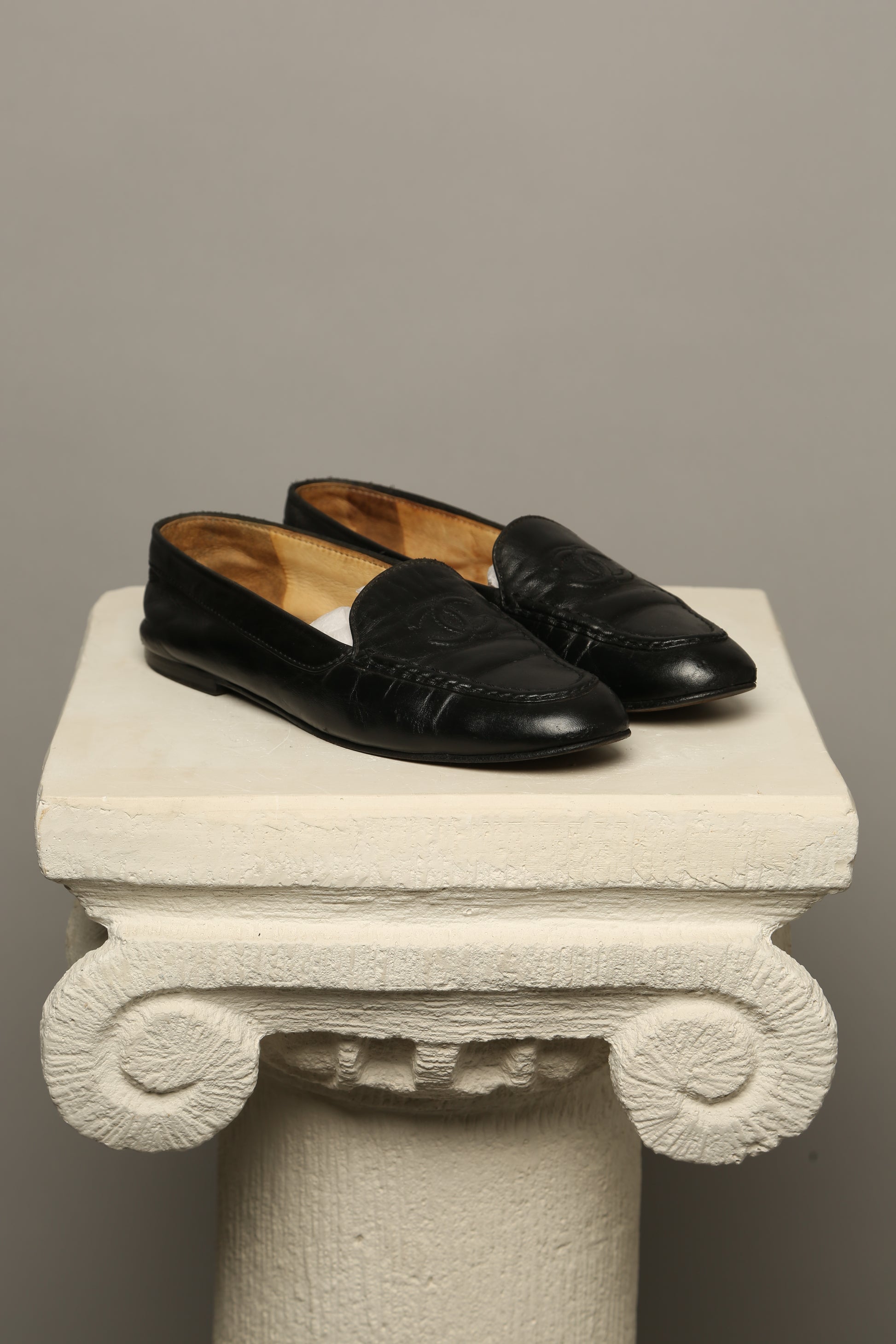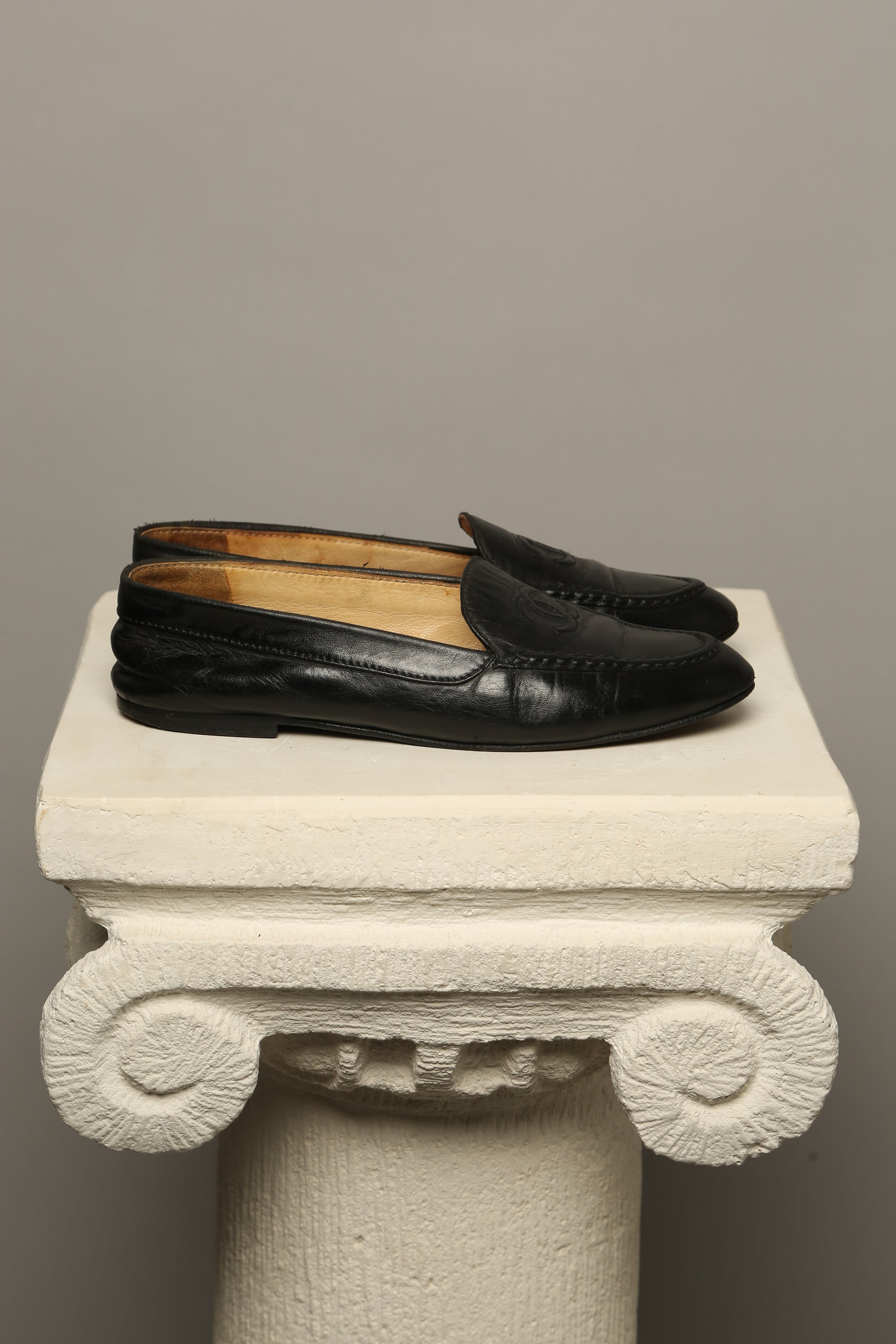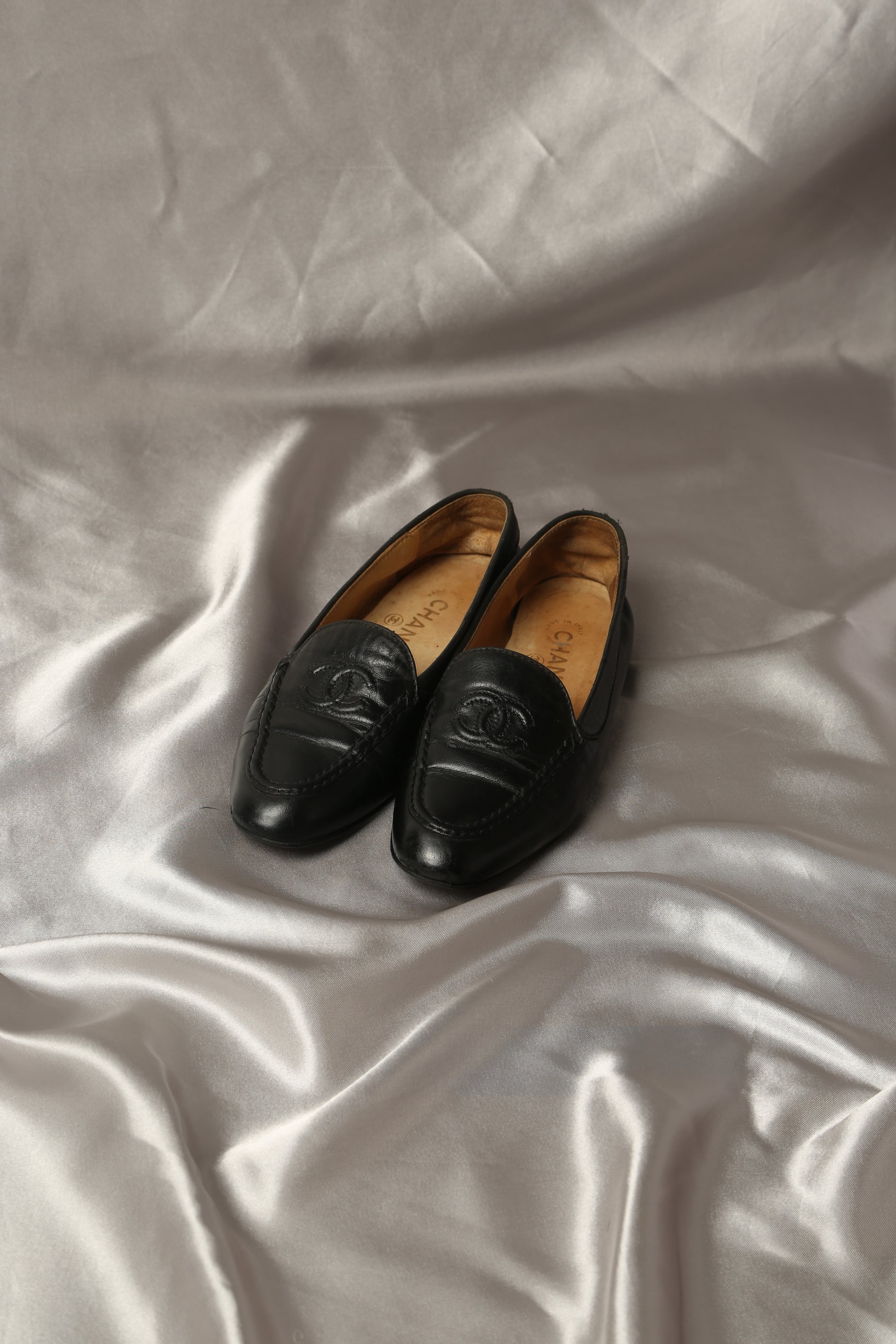 Presenting the Chanel Women's Double C Slip-On Loafers in classic black. Featuring a slip-on style with an oval toe design, these loafers showcase the iconic CC logos on the uppers, adding a touch of elegance. Crafted with lambskin leather uppers, leather insoles, and leather soles, these well-loved shoes carry a unique vintage character. These vintage shoes exhibit signs of wear, with noticeable scuffs and stains on the leather due to their age and use. While they show signs of wear and rubbing, they hold a vintage charm.