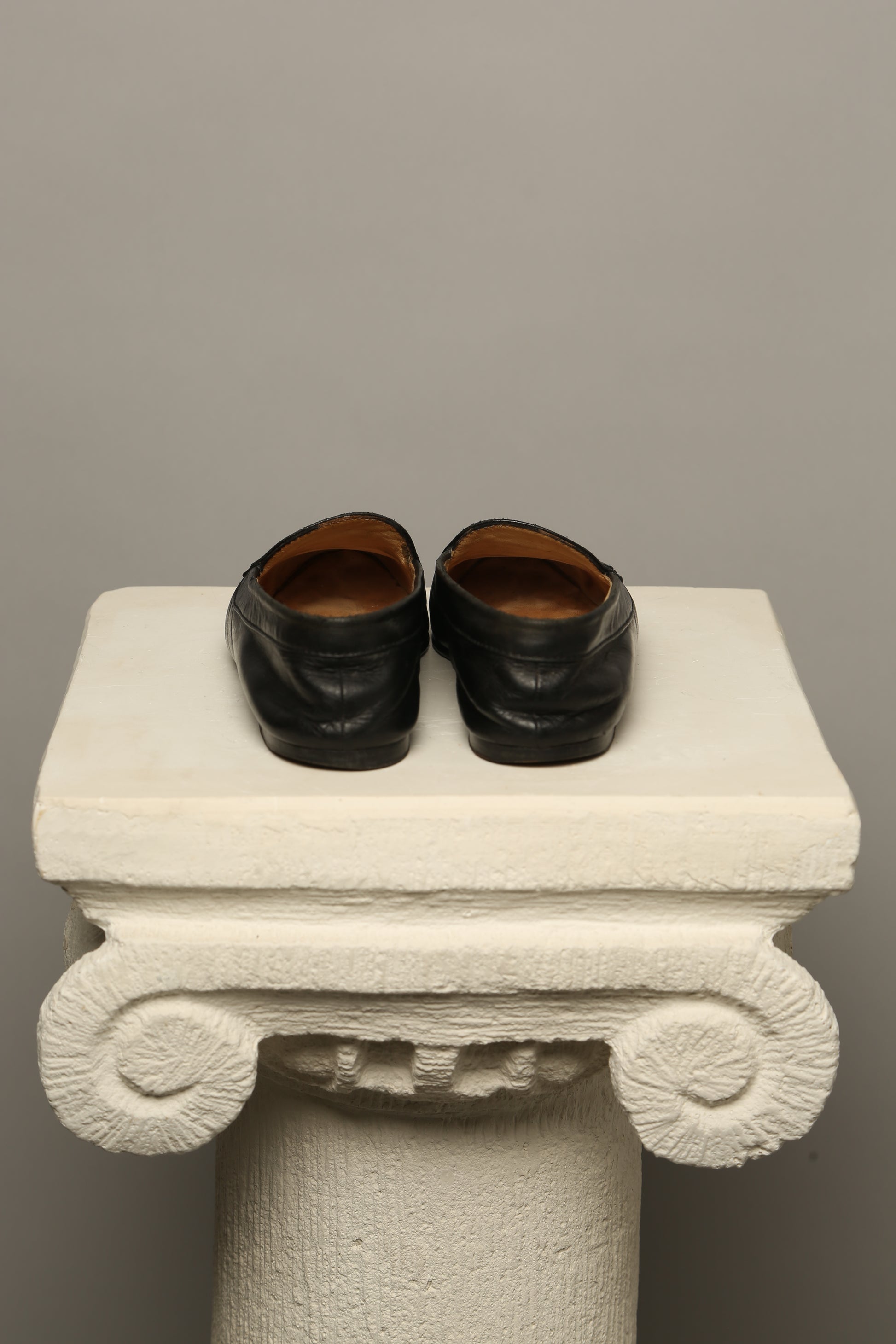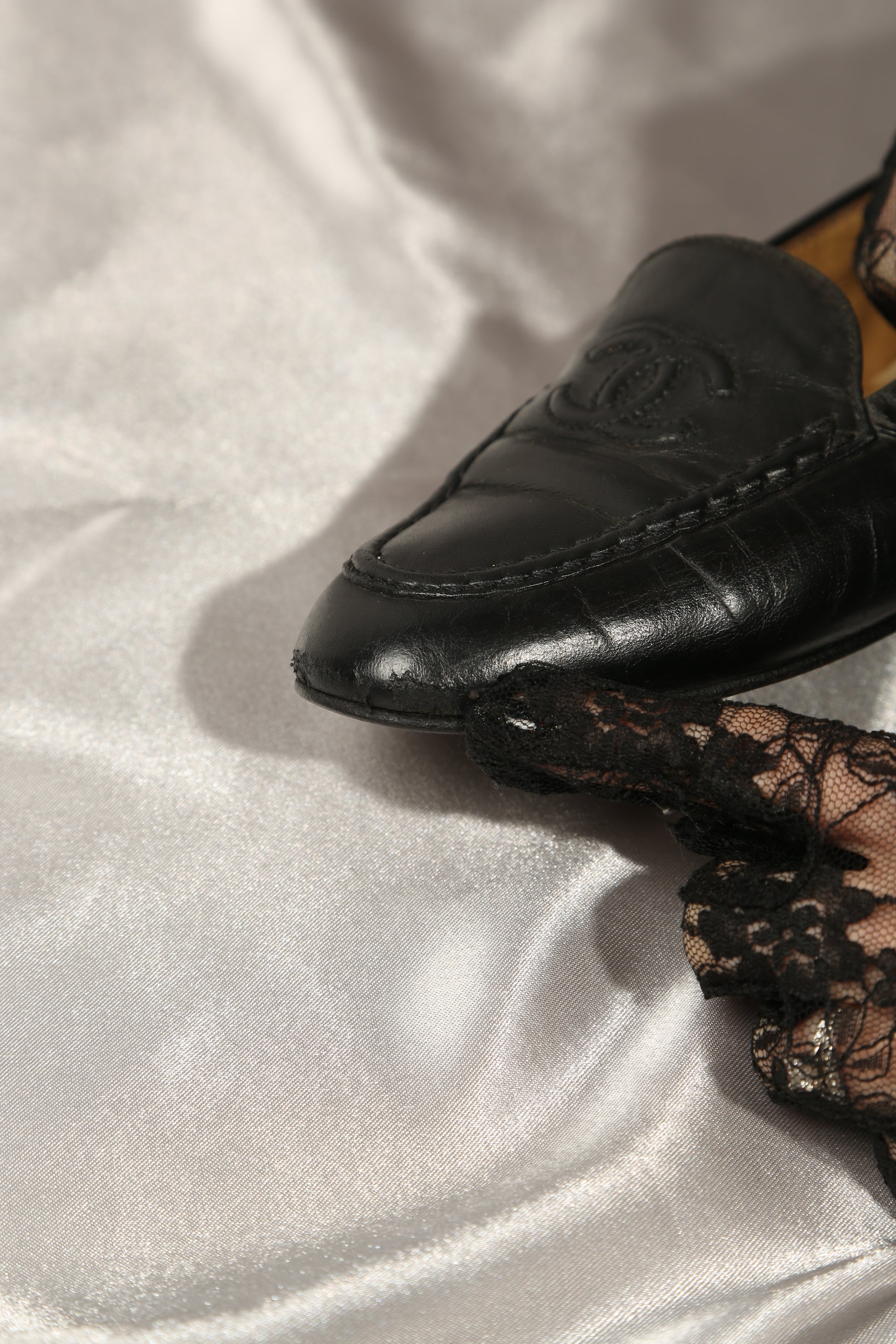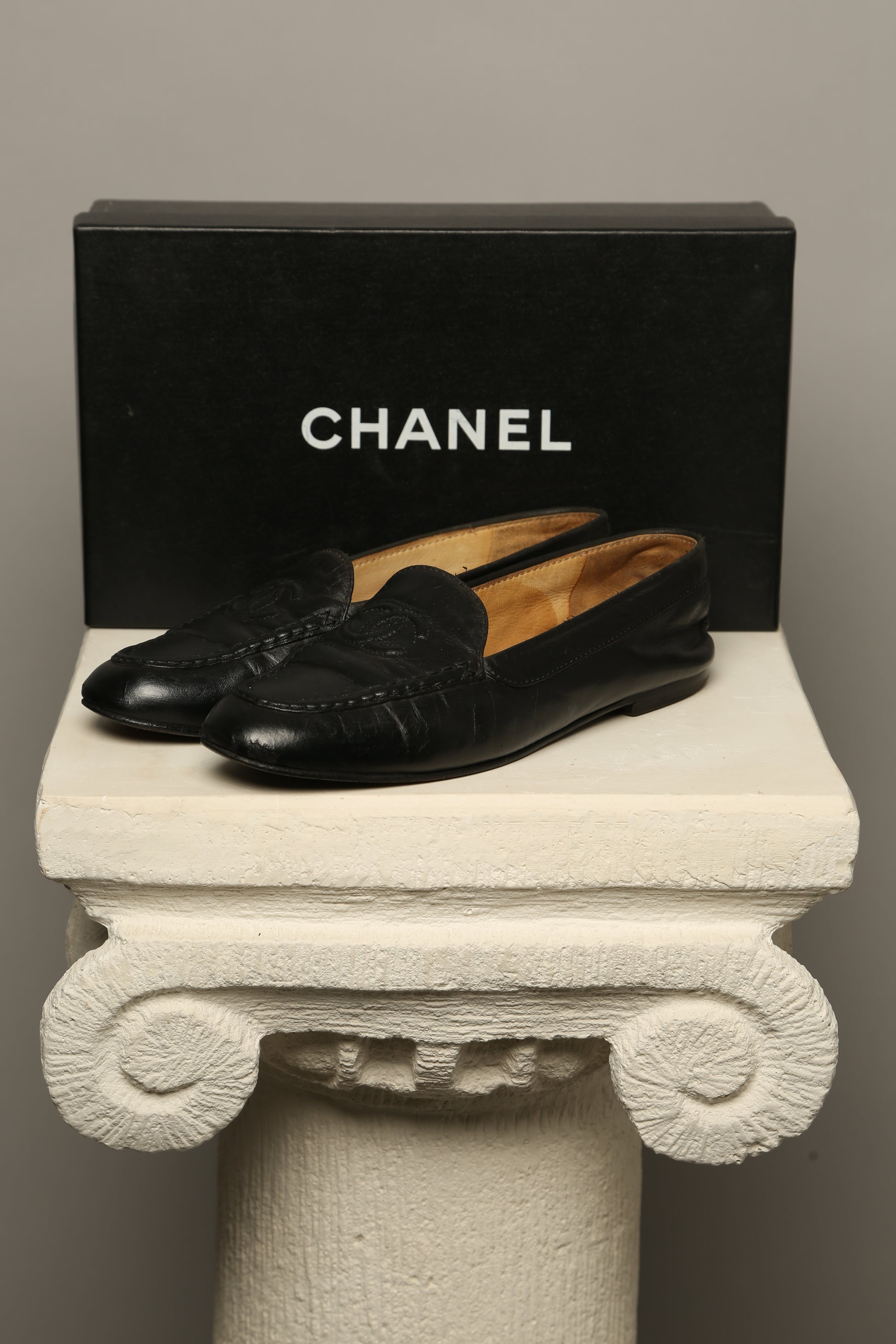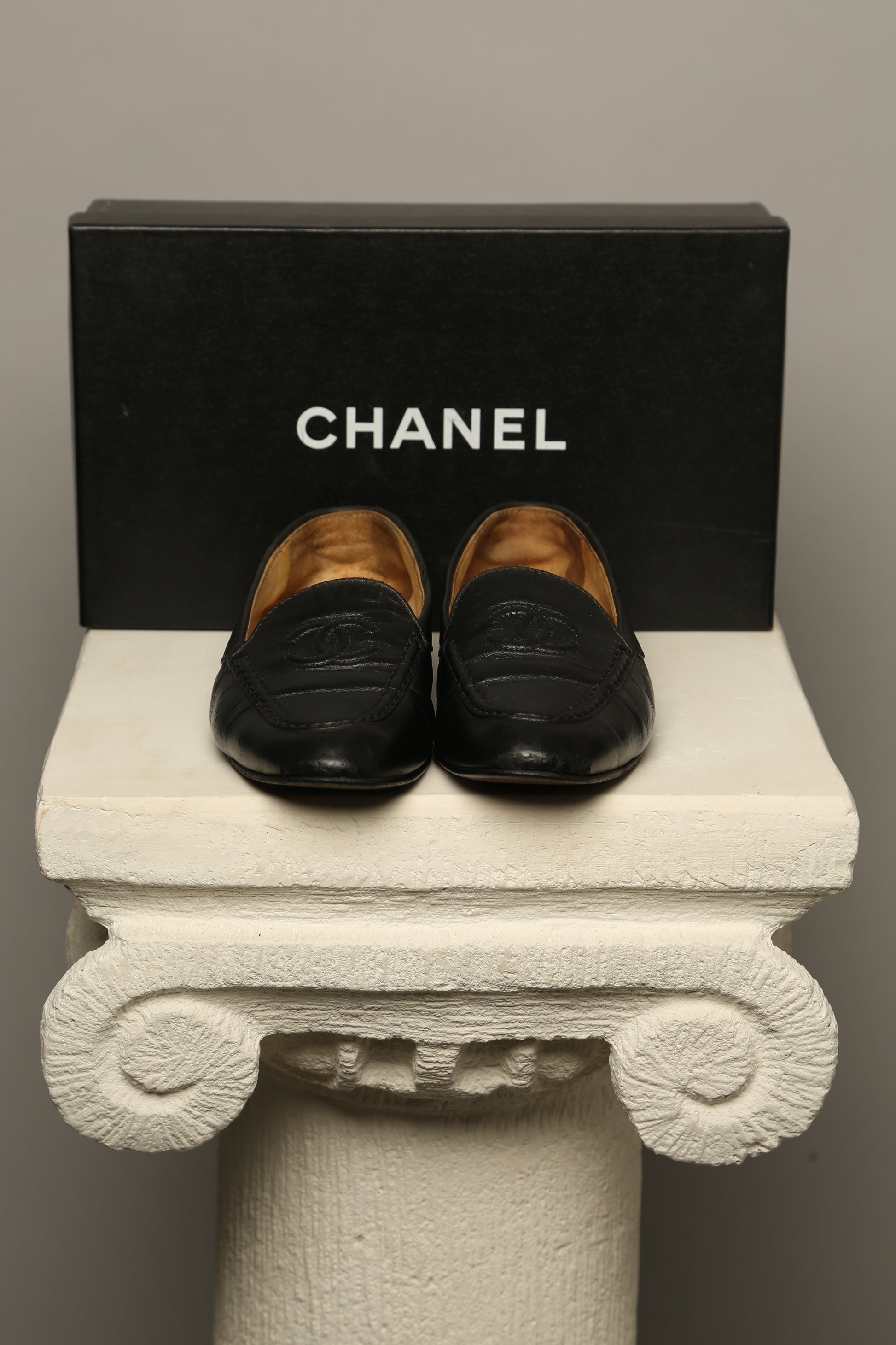 Presenting the Chanel Women's Double C Slip-On Loafers in classic black. Featuring a slip-on style with an oval toe design, these loafers showcase the iconic CC logos on the uppers, adding a touch of elegance. Crafted with lambskin leather uppers, leather insoles, and leather soles, these well-loved shoes carry a unique vintage character. These vintage shoes exhibit signs of wear, with noticeable scuffs and stains on the leather due to their age and use. While they show signs of wear and rubbing, they hold a vintage charm.