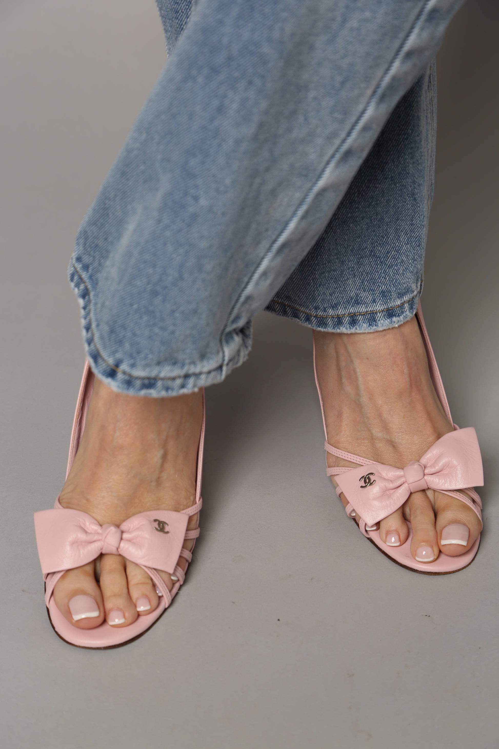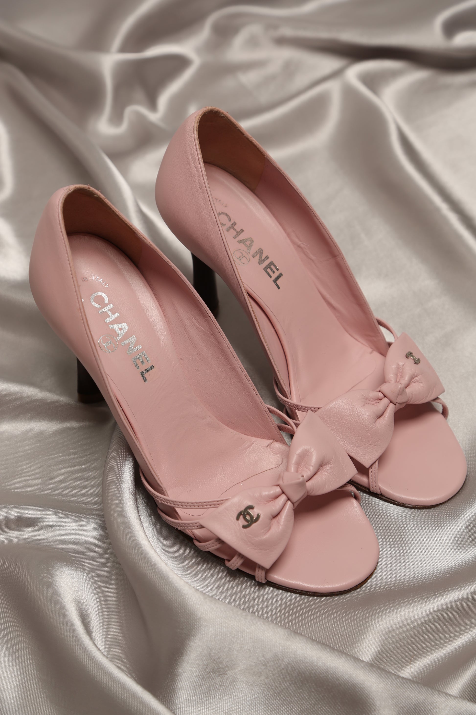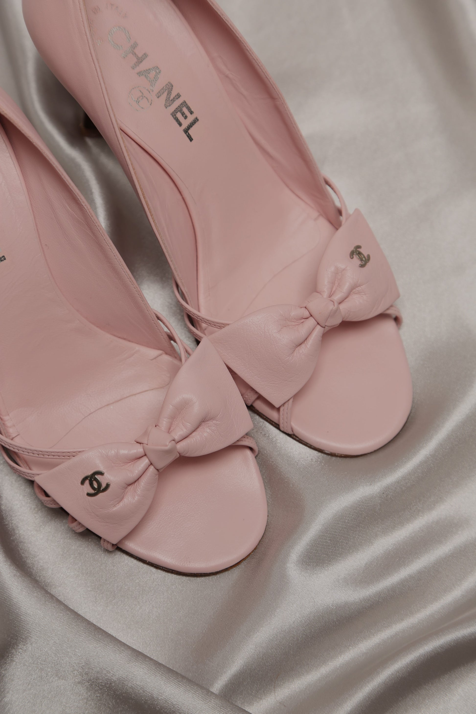 Rare Y2K Chanel heels in a delightful baby pink color. Adorned with a super cute oversized bow on the toe area and features the iconic silver CC logo. They have been lovingly refurbished by our cobbler, ensuring they are in great condition, though they do show normal signs of wear on the sole. This unique pair has even made an appearance on Sex and the City, adding a touch of celebrity glam to your collection.