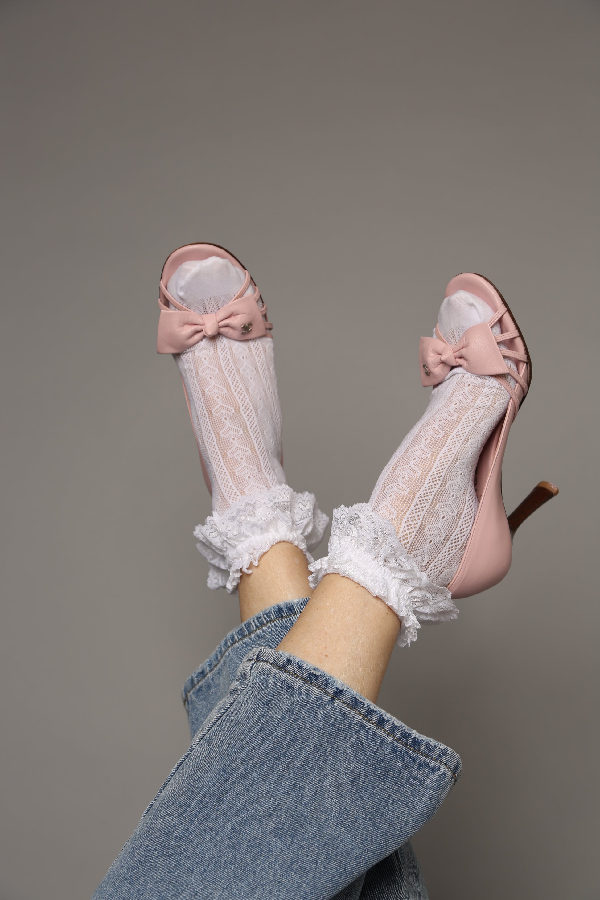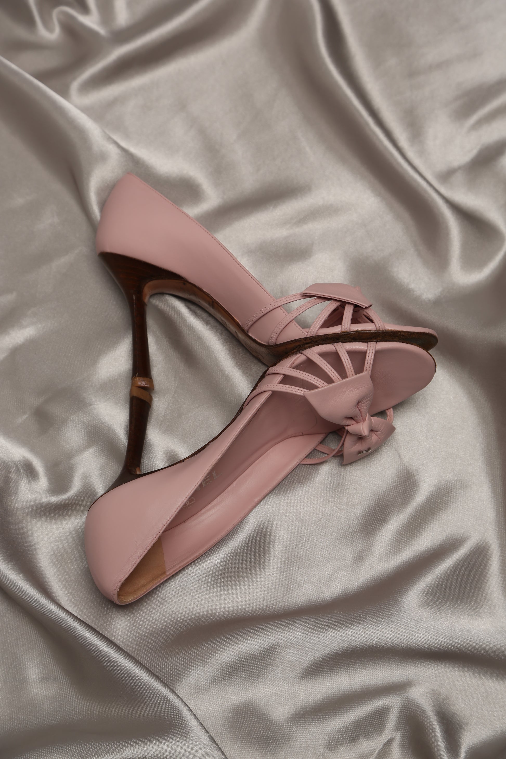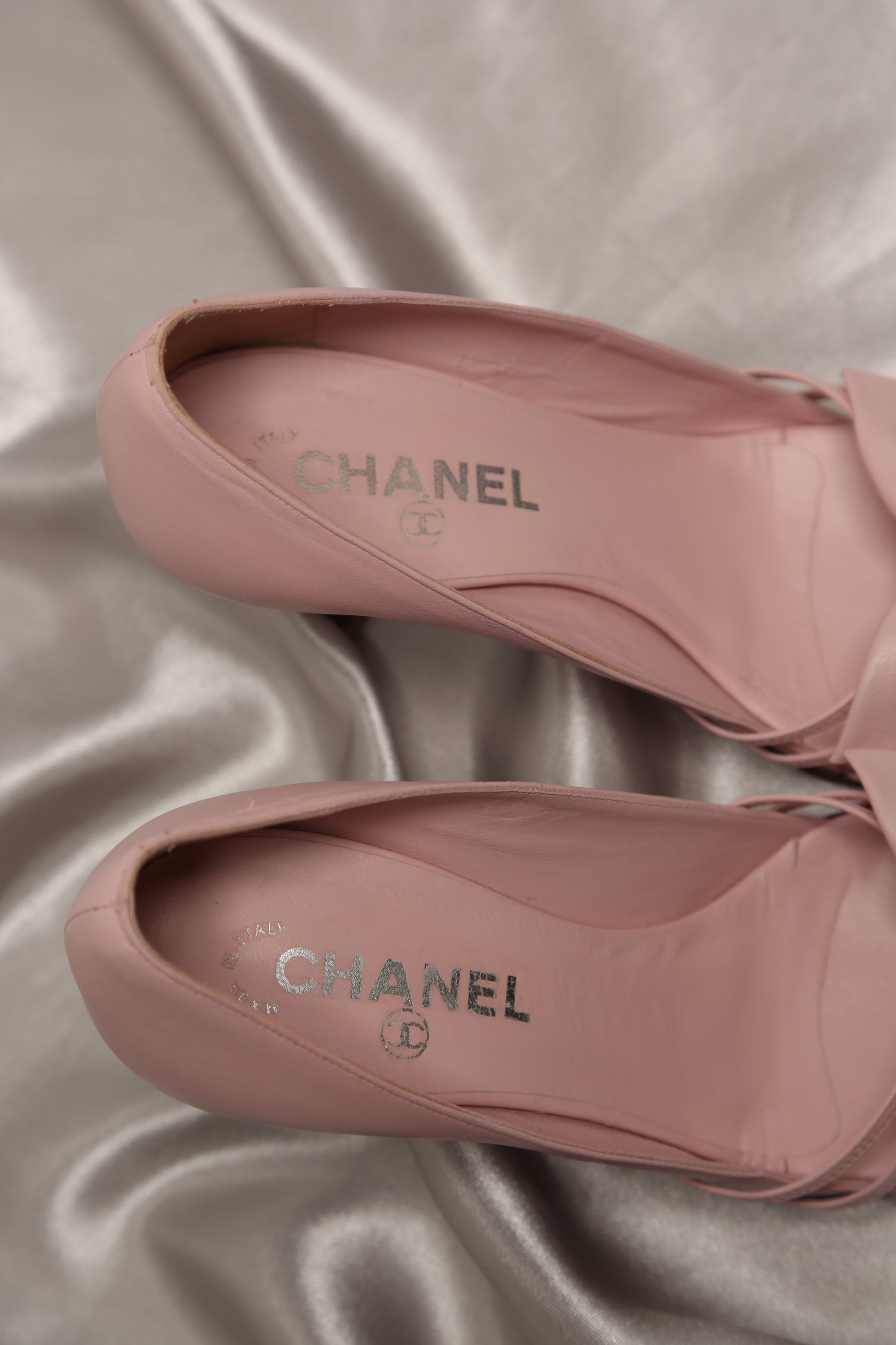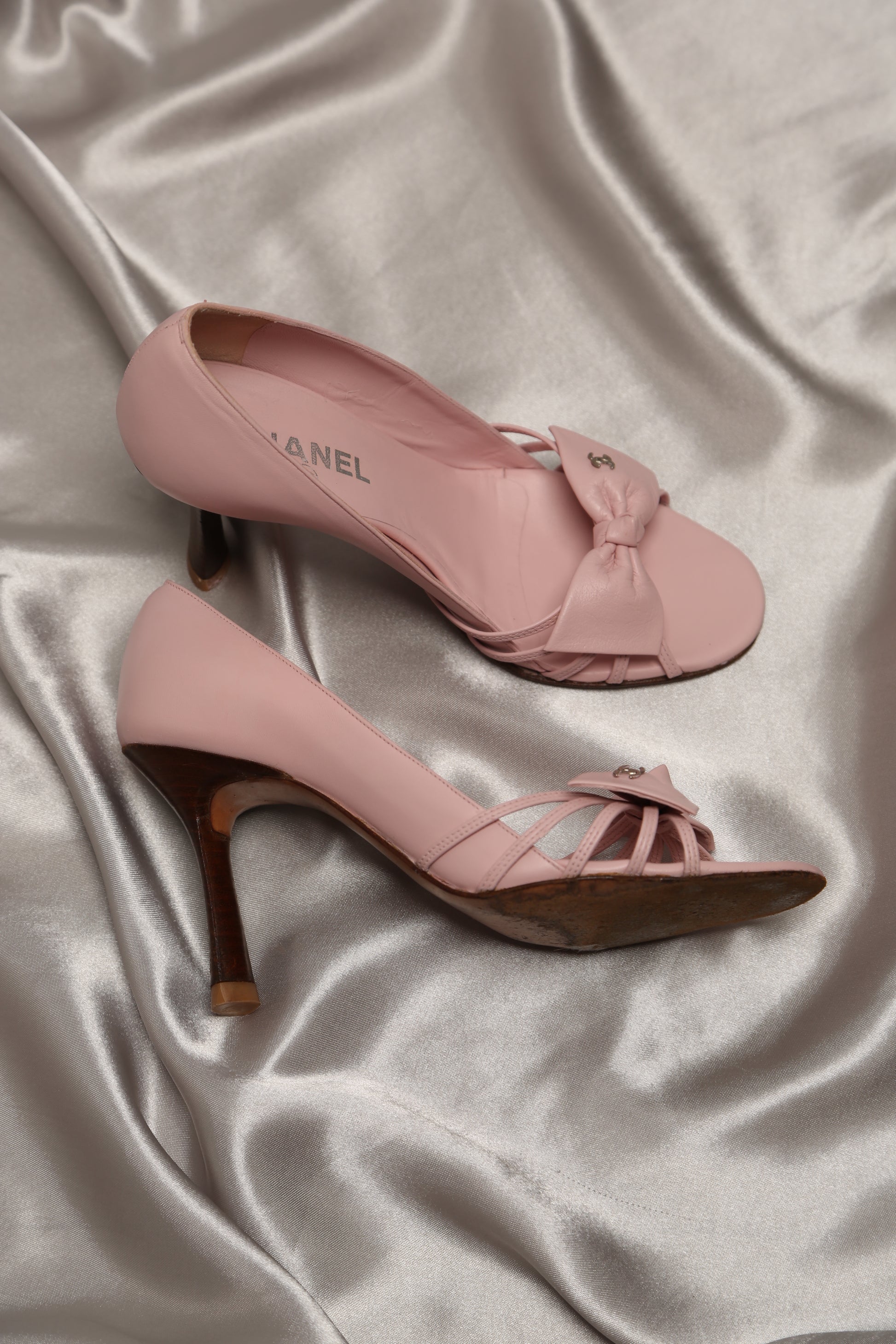 Rare Y2K Chanel heels in a delightful baby pink color. Adorned with a super cute oversized bow on the toe area and features the iconic silver CC logo. They have been lovingly refurbished by our cobbler, ensuring they are in great condition, though they do show normal signs of wear on the sole. This unique pair has even made an appearance on Sex and the City, adding a touch of celebrity glam to your collection.