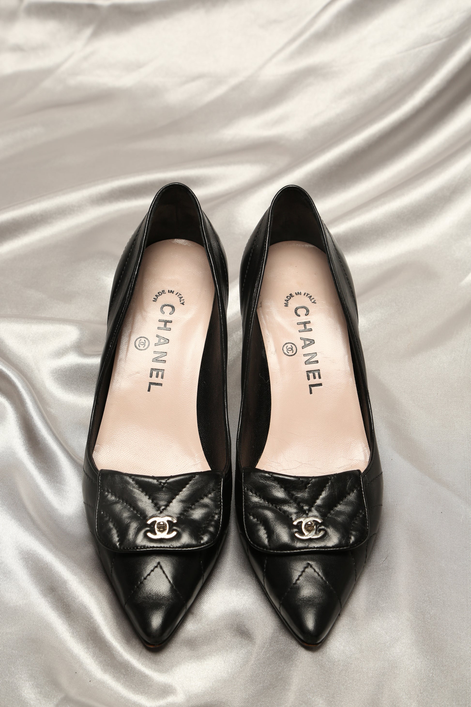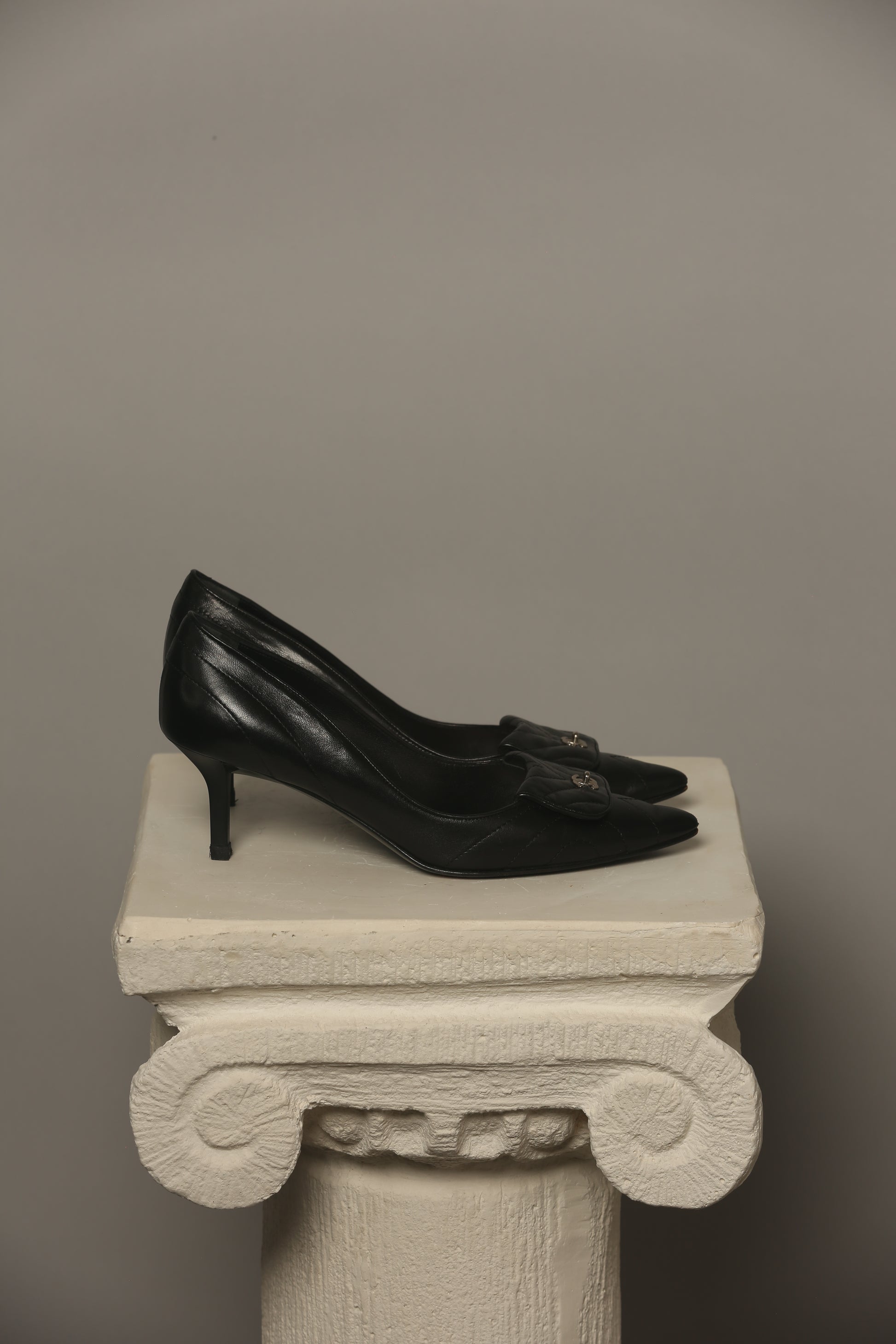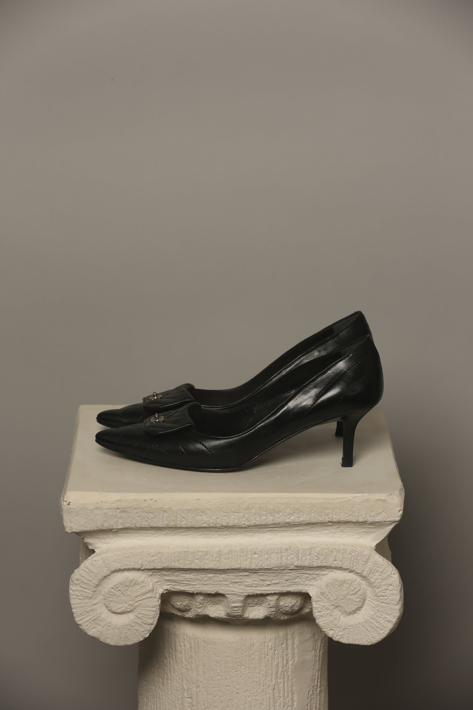 Exude timeless elegance with these Chanel CC Turn-Lock Quilted Leather Pumps Heels. Crafted with meticulous attention to detail, these shoes boast the iconic and softest lambskin quilted leather synonymous with Chanel's sophistication. The signature CC turn-lock embellishment adds a touch of luxury and class, making these pumps super unique and elegant.