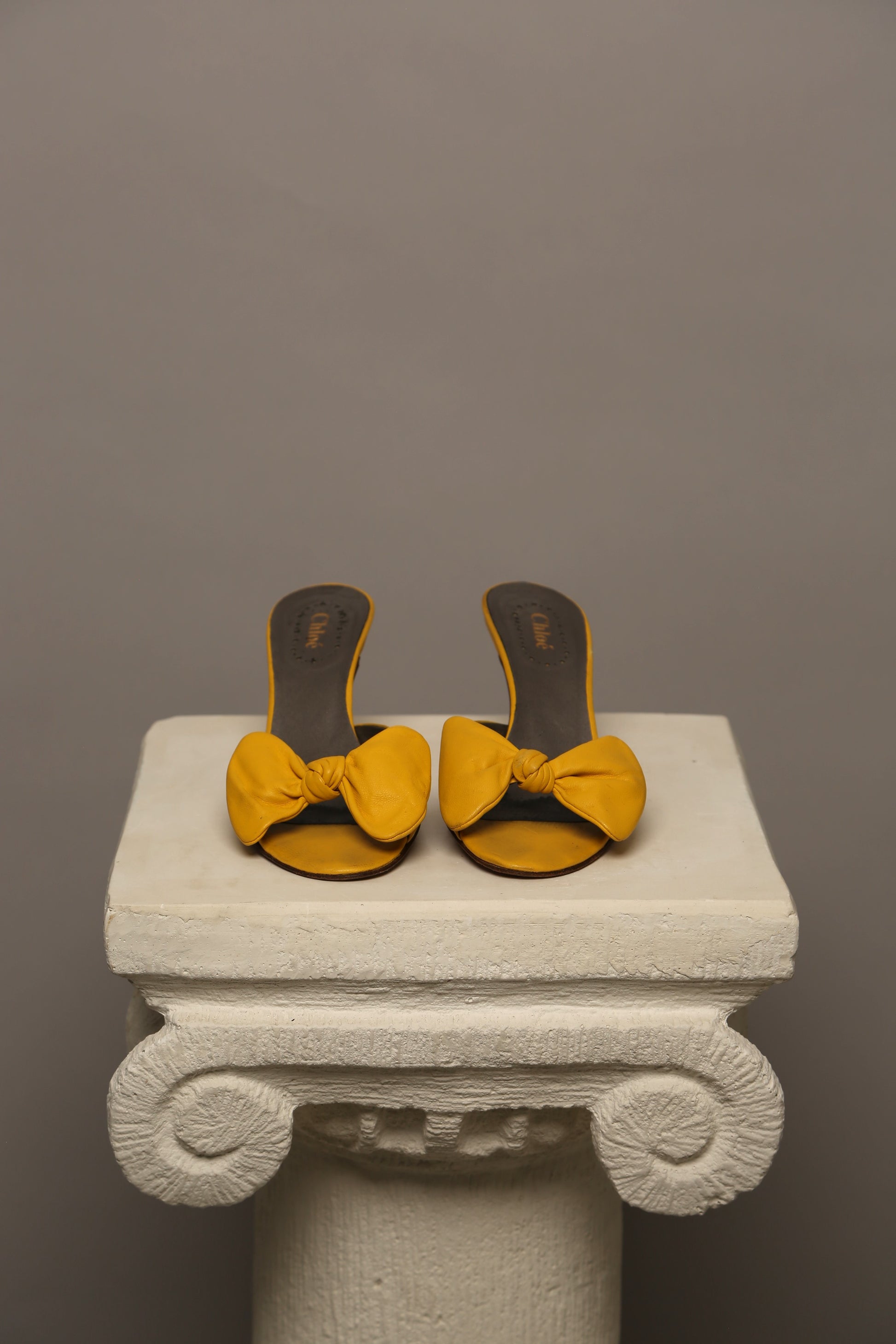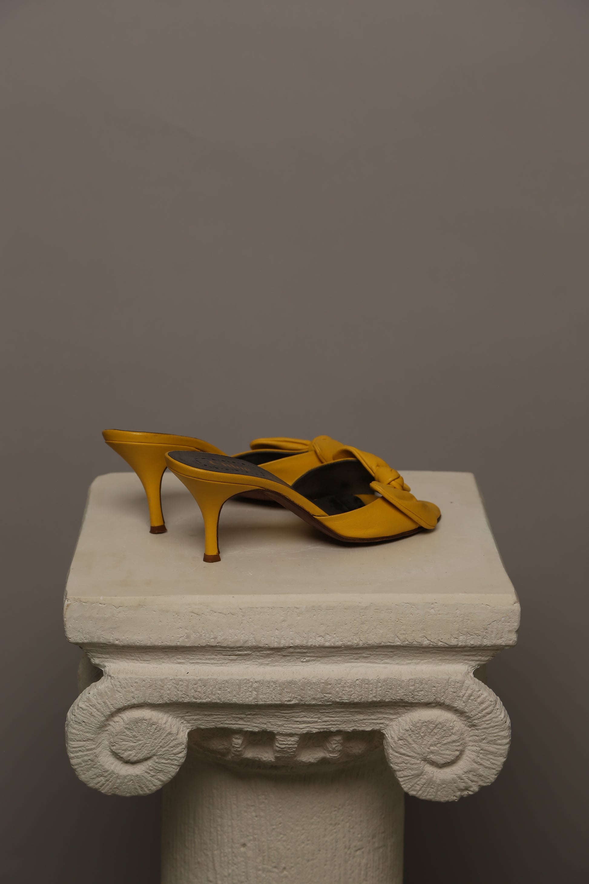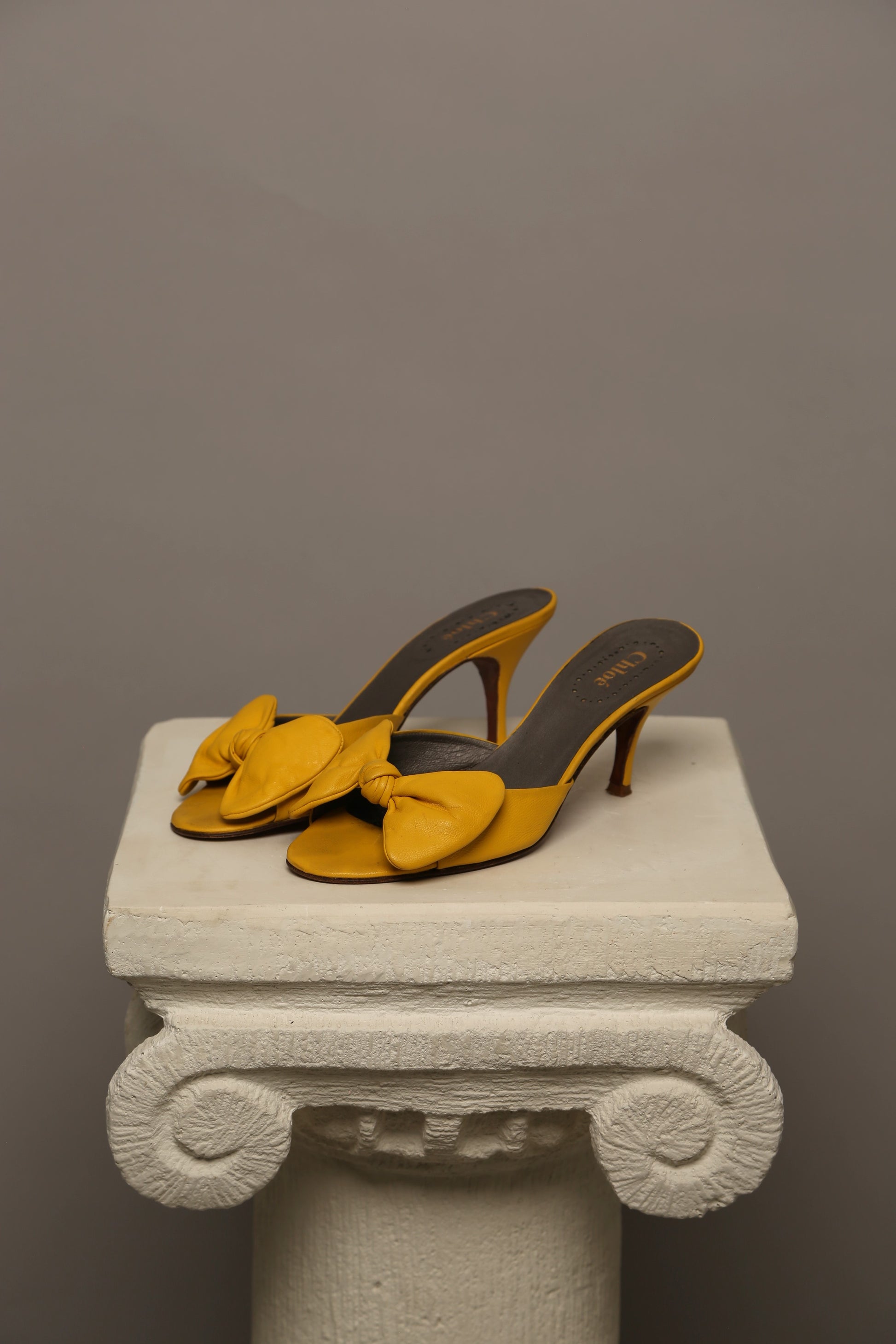 Very rare and cute sandals with a bow on top. Made with soft lambskin leather. There are normal signs of wear. Super fun yellow color: perfect for summer, adds a spicy pop of color to your outfit. We also have it in white color and new condition.