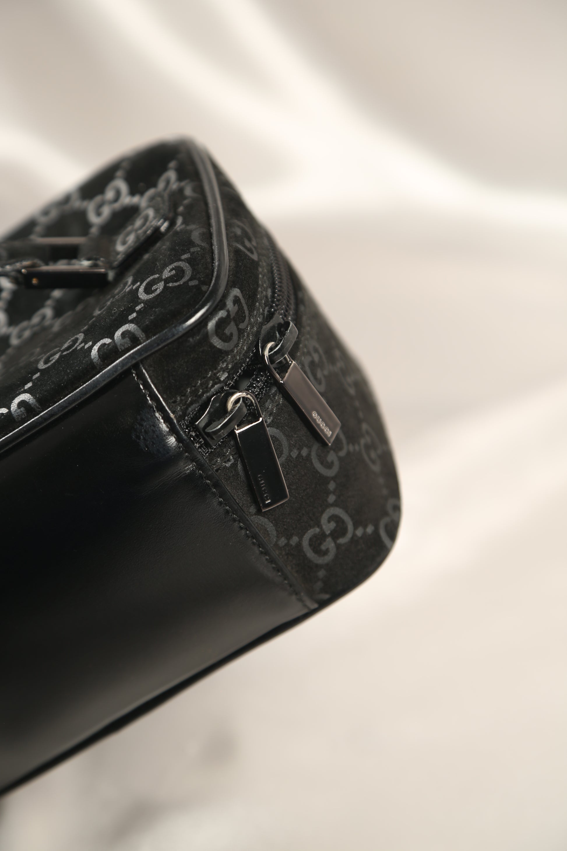 Extremely rare and highly collectible — this vanity bag is an authentic piece from the iconic Tom Ford era at Gucci, a time defined by bold silhouettes and unapologetic luxury. Crafted from ultra-soft suede leather with the classic GG monogram, it embodies the refined yet daring aesthetic of early 2000s Gucci. Featuring sleek gunmetal hardware, this piece offers multiple styling possibilities. Carry it as a top-handle mini bag for a minimalist statement look. Use it as a makeup or organizer case or add your own chain to convert it into a shoulder or crossbody bag. Normal signs of wear.
