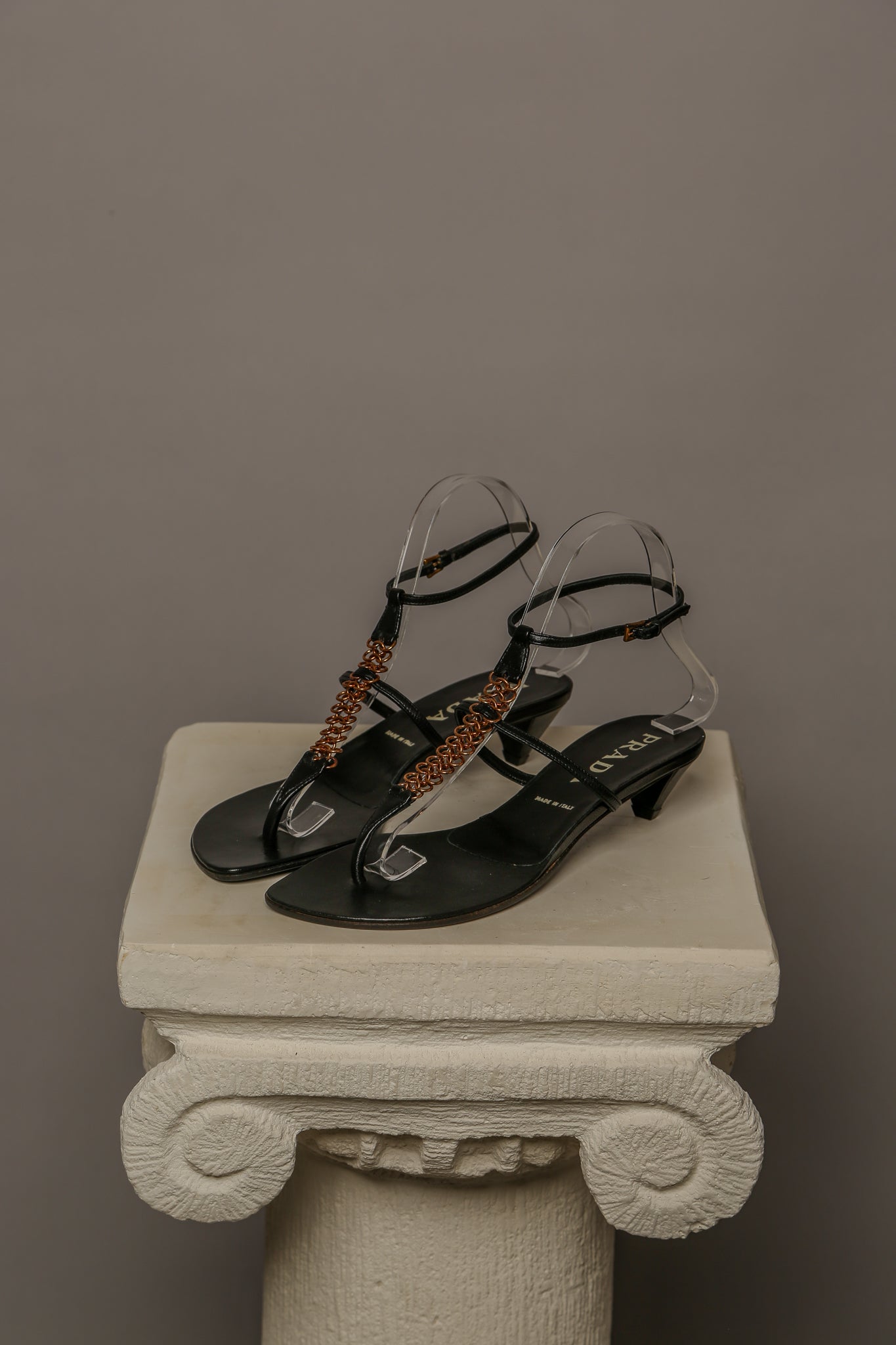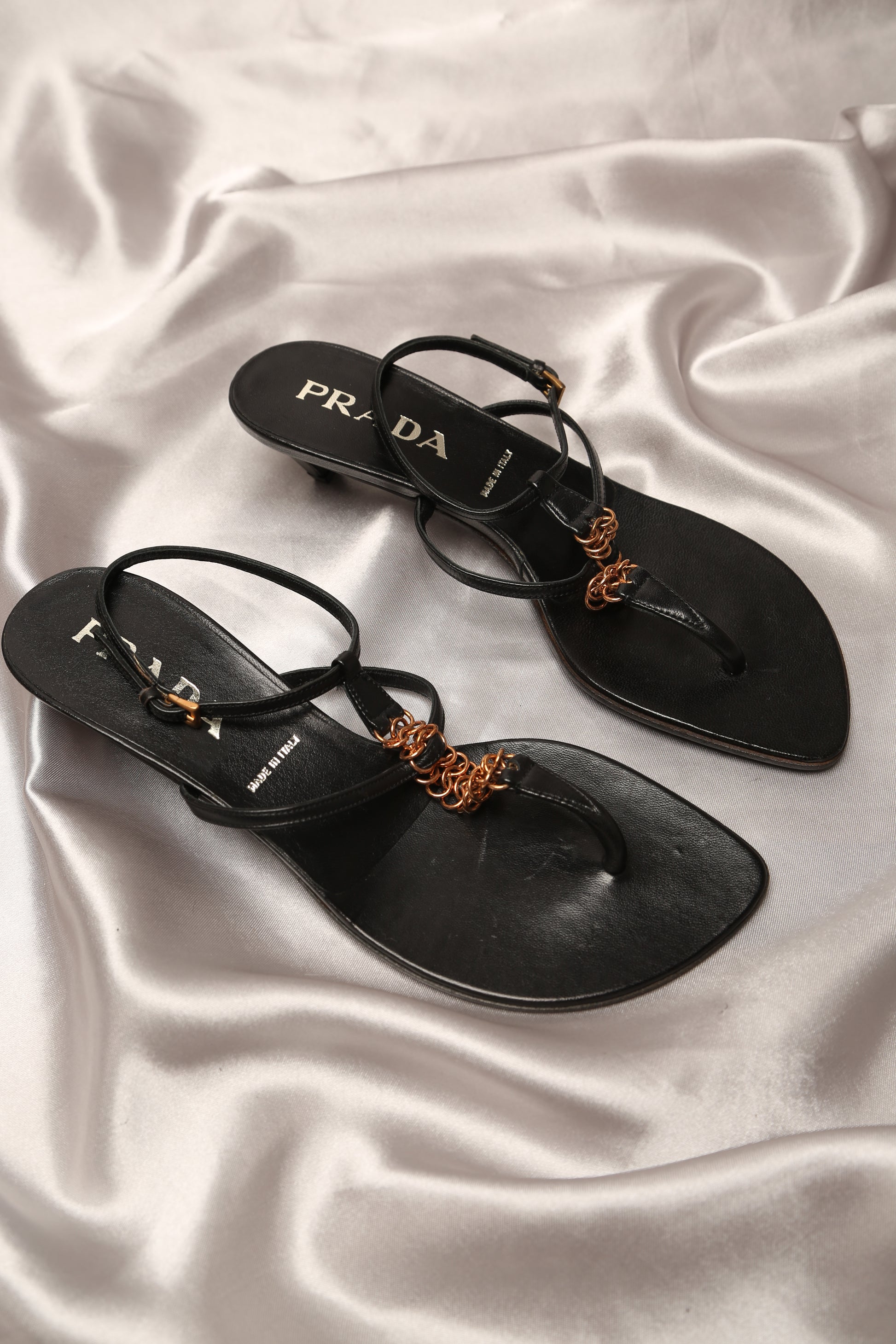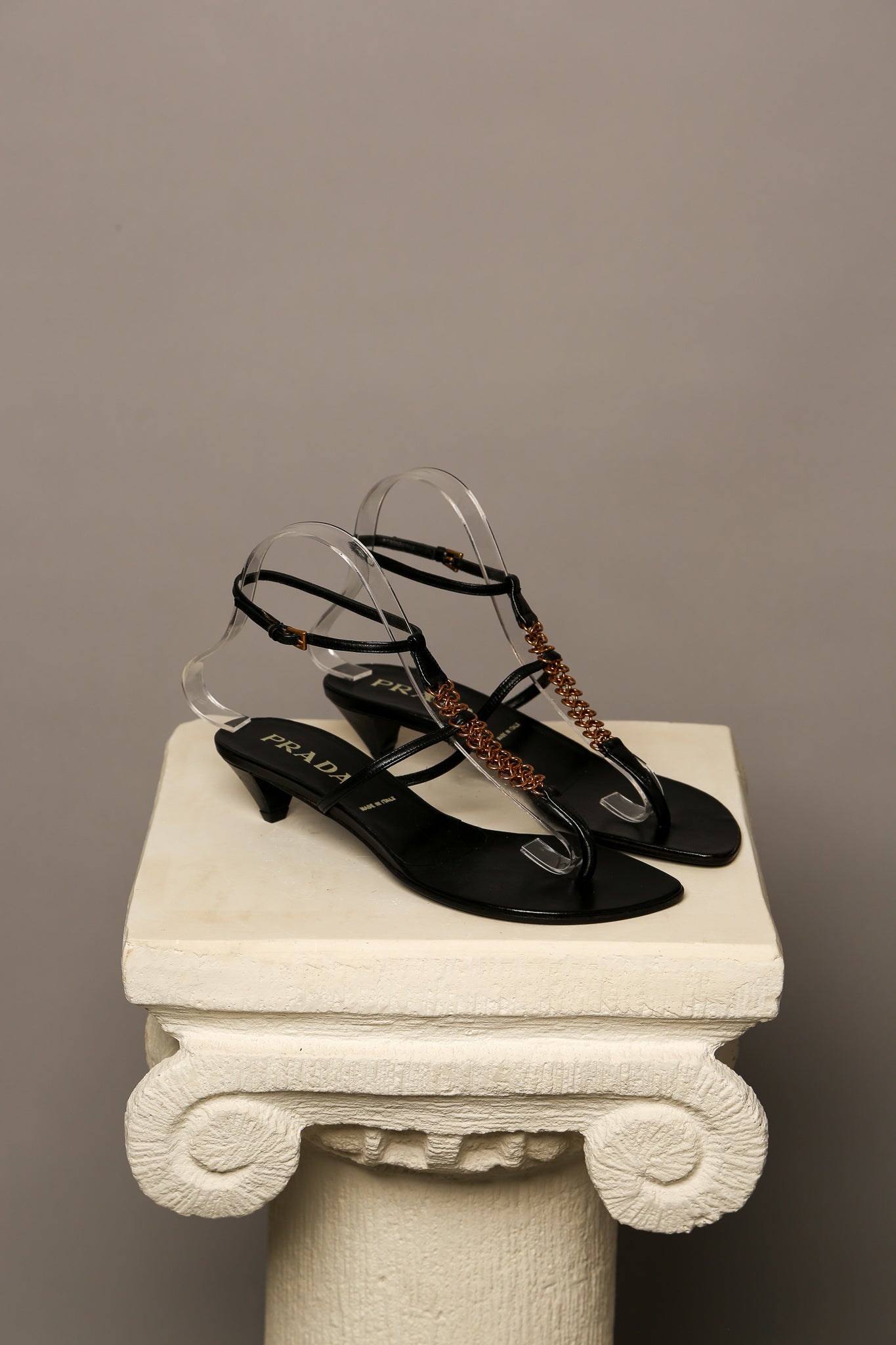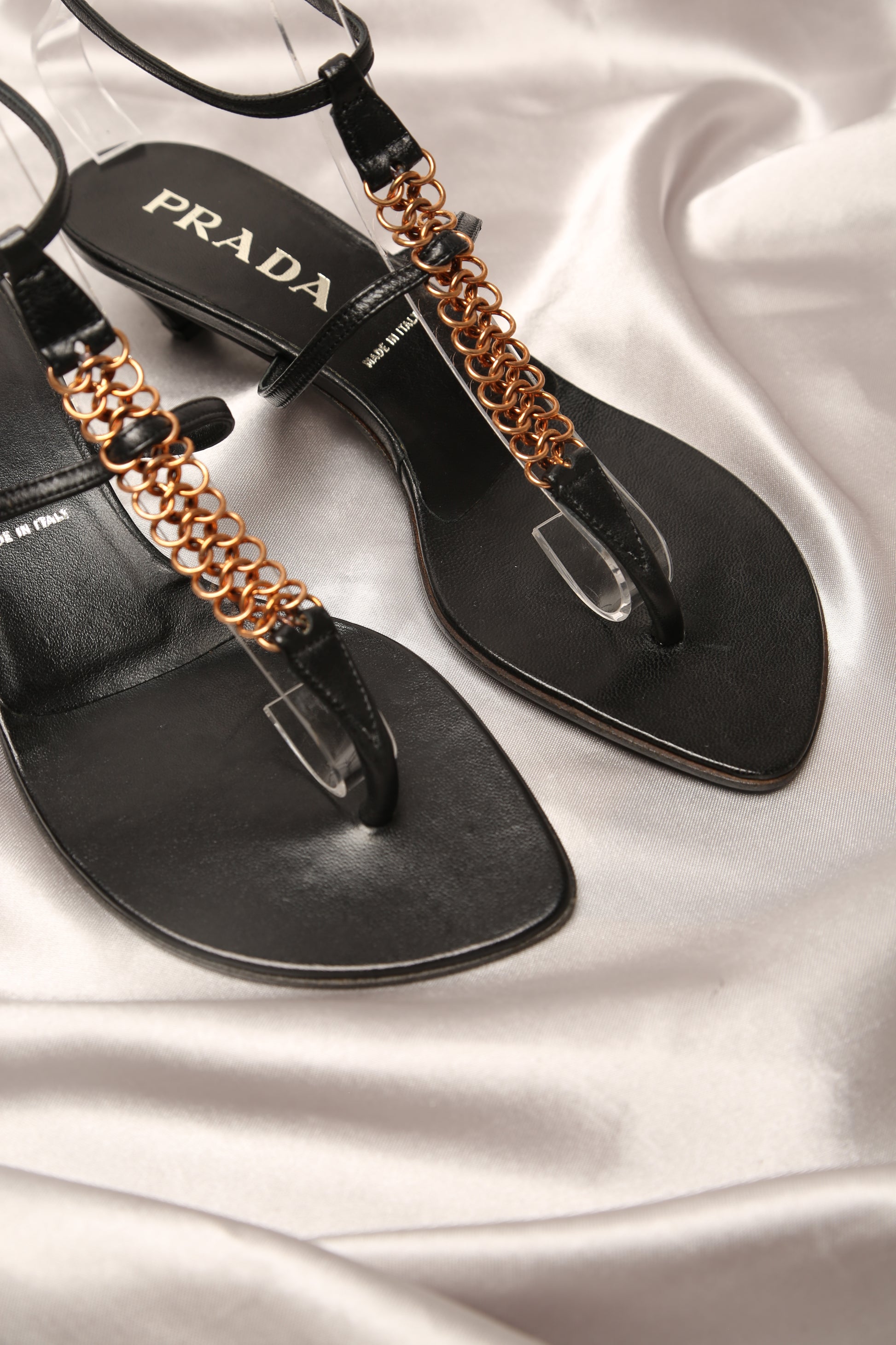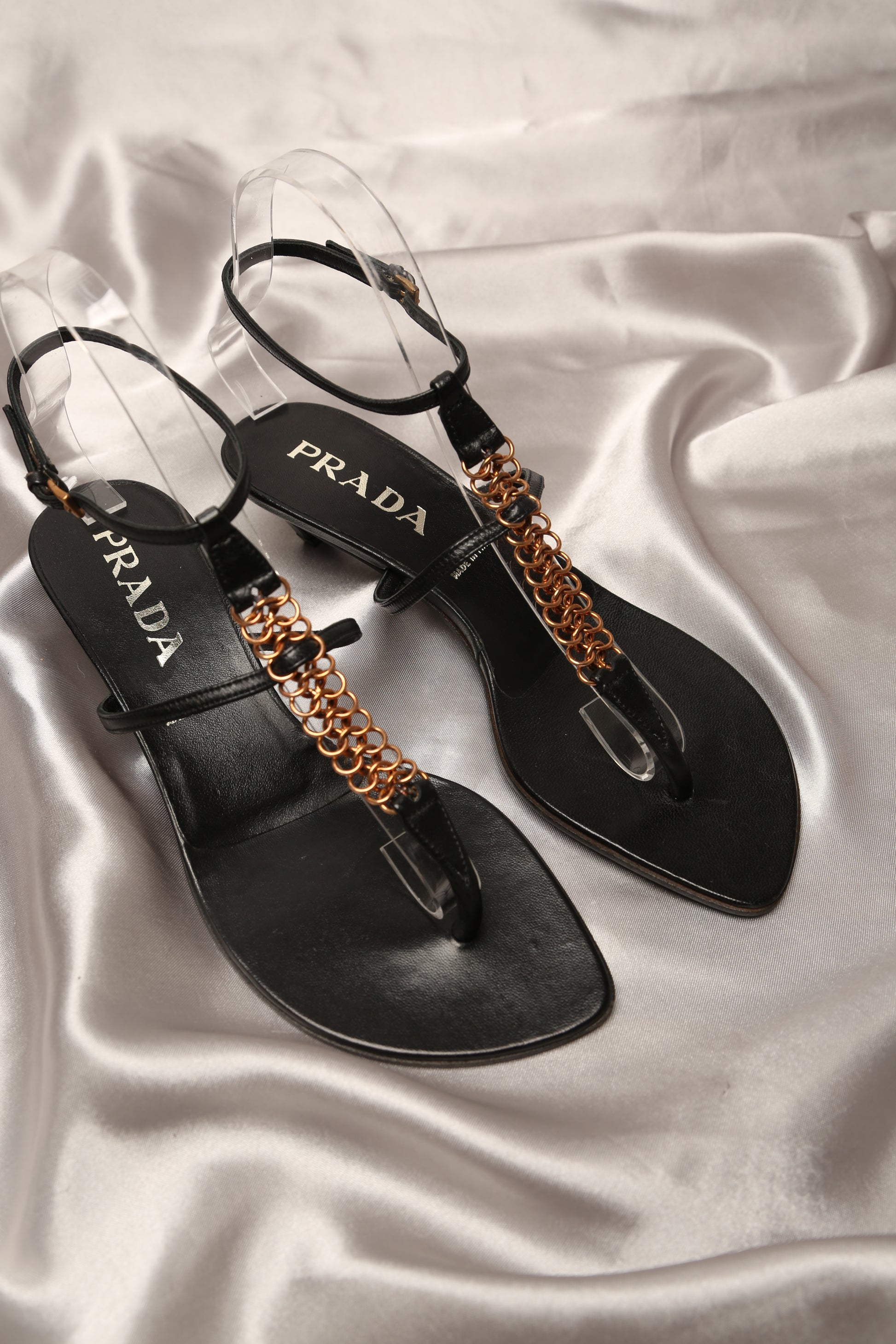 Add to your summer wardrobe these vintage but never-been-worn extremely rare Prada leather sandals. The perfect vacation sandals. Their minimal design is ultra-trendy, while the gold metal chain detail adds a unique touch. Complete with an ankle strap and kitten heels for comfort and style.