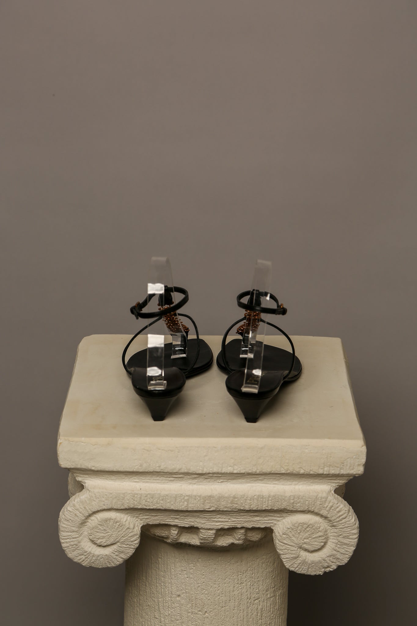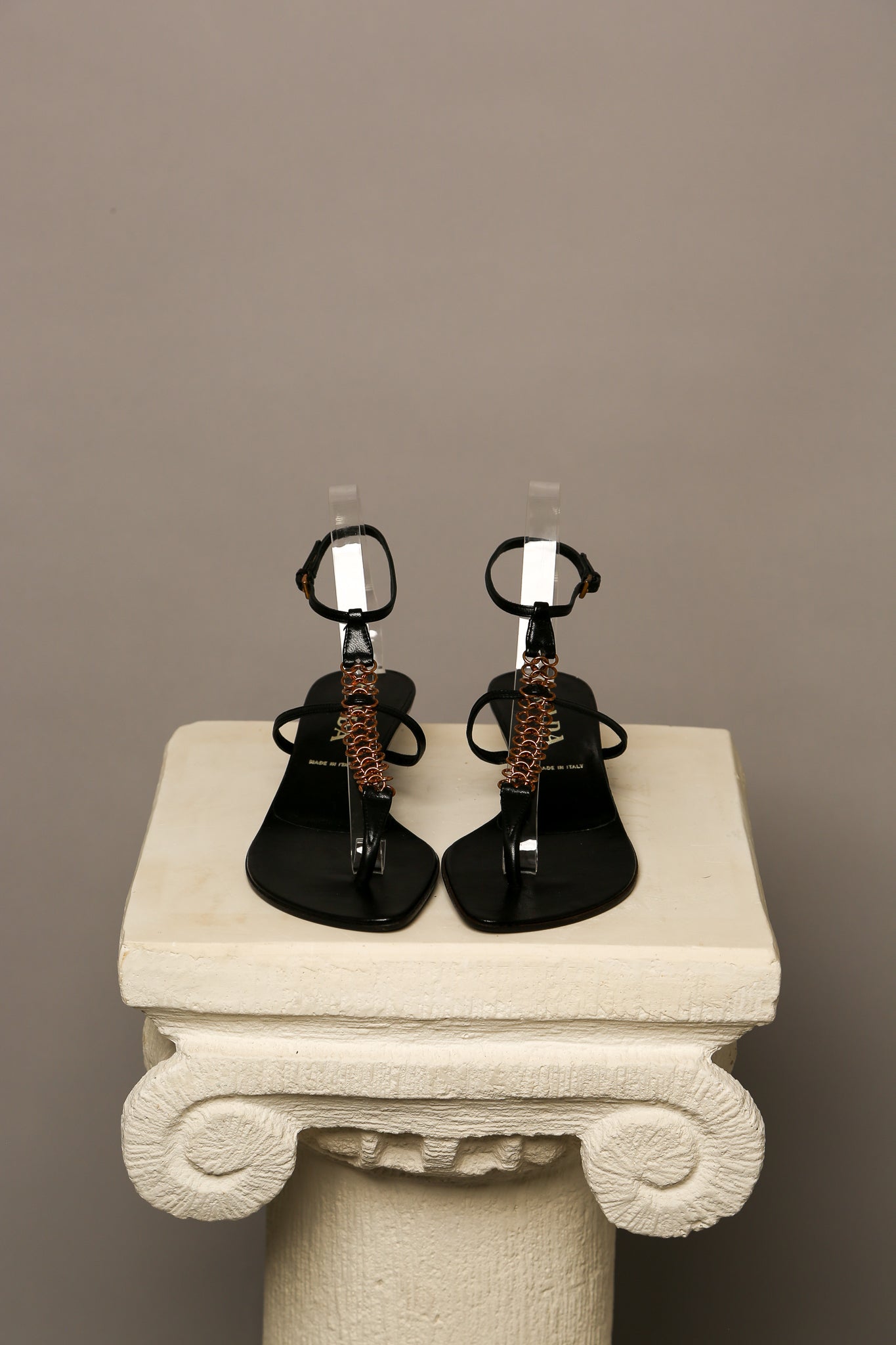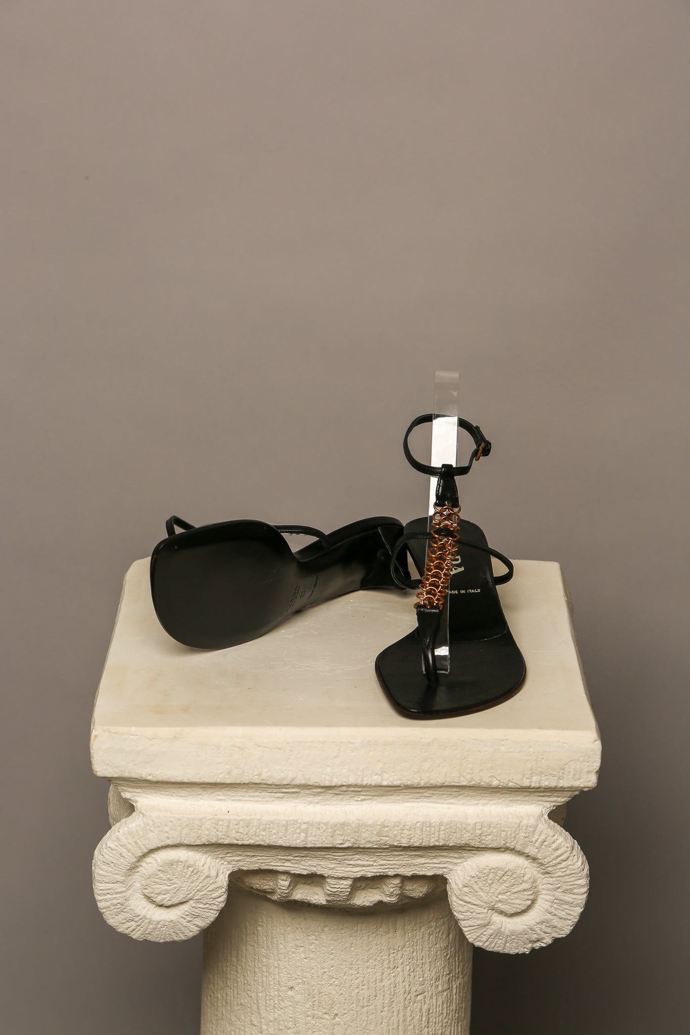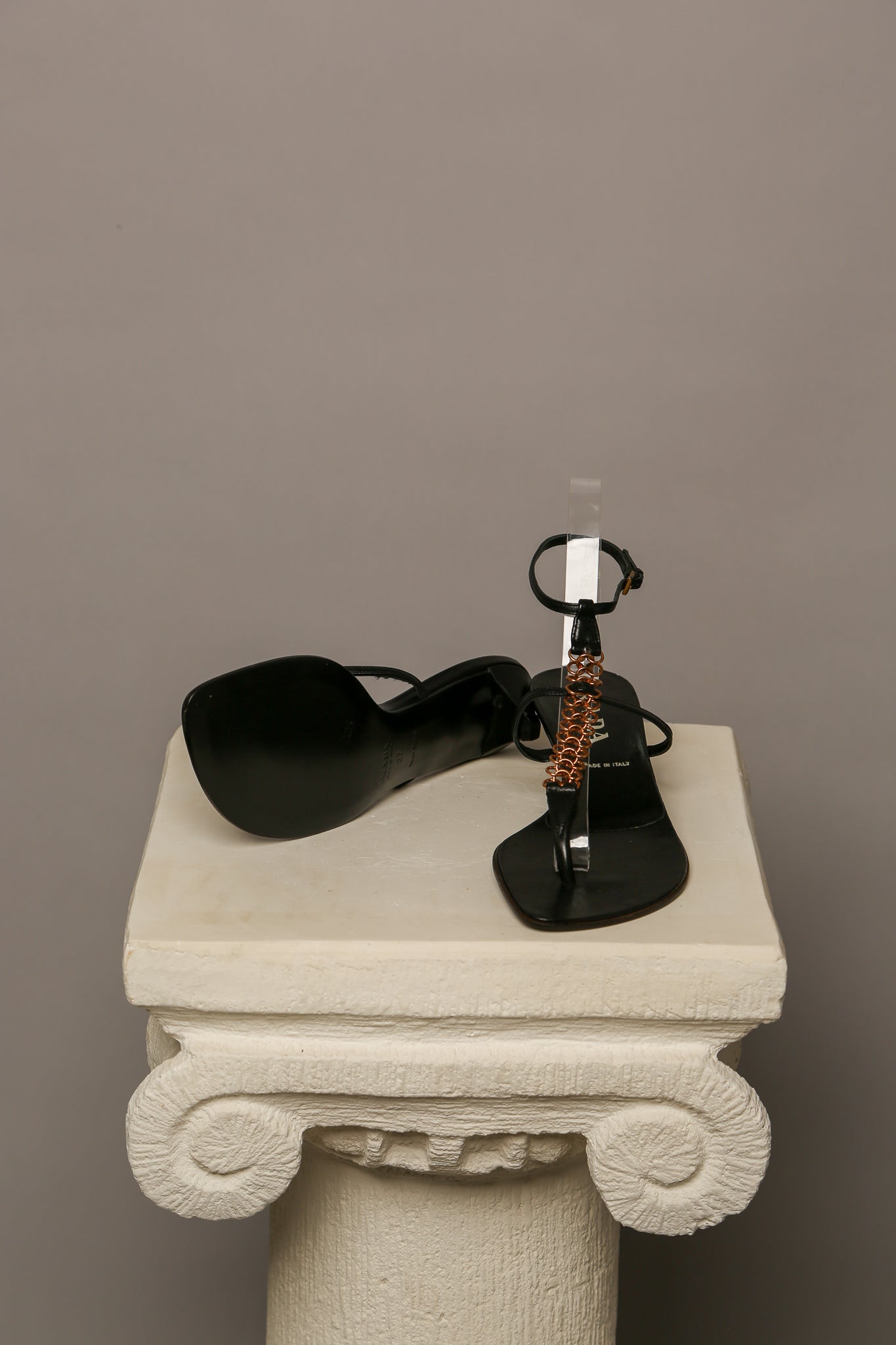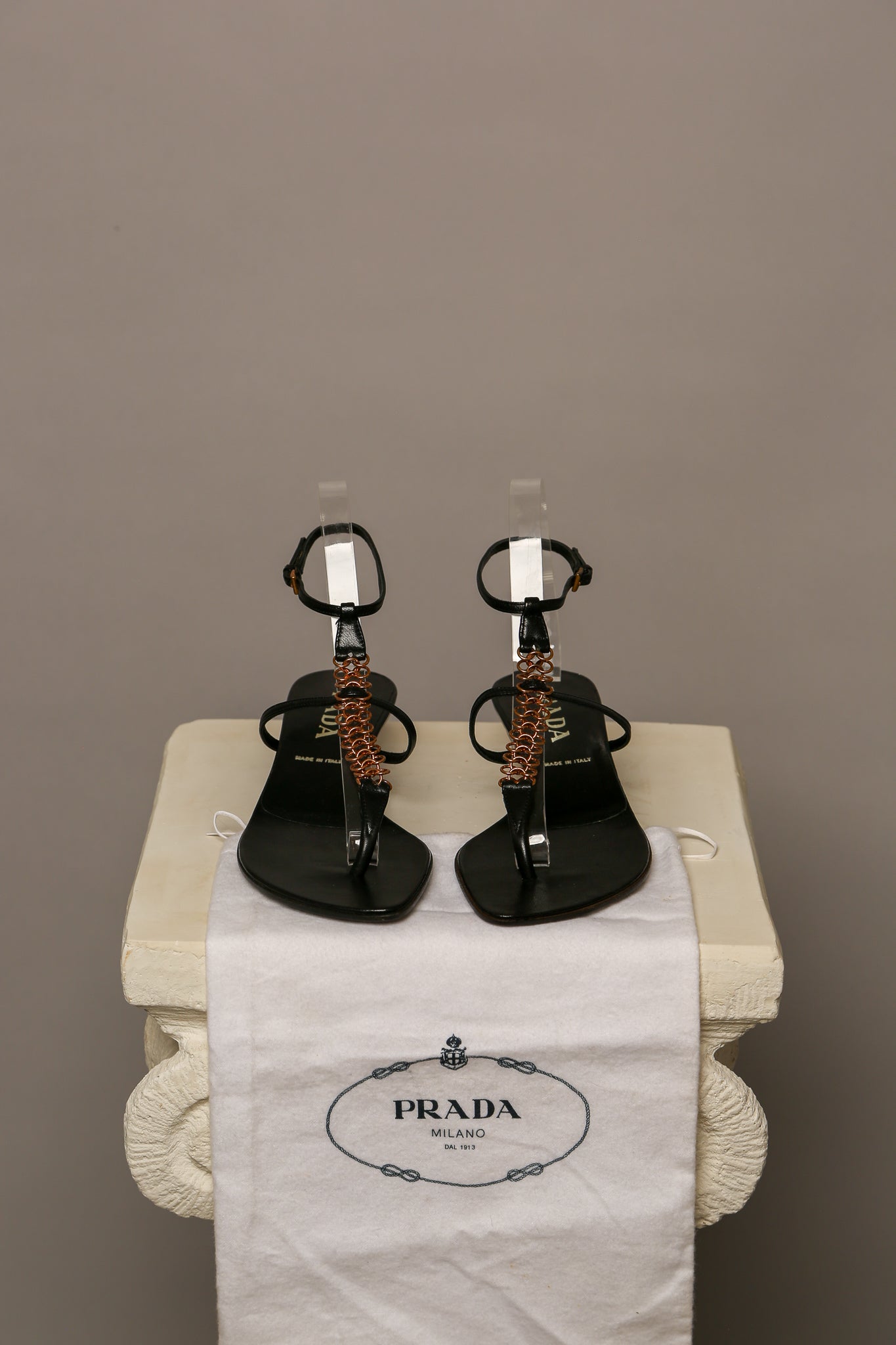 Add to your summer wardrobe these vintage but never-been-worn extremely rare Prada leather sandals. The perfect vacation sandals. Their minimal design is ultra-trendy, while the gold metal chain detail adds a unique touch. Complete with an ankle strap and kitten heels for comfort and style.