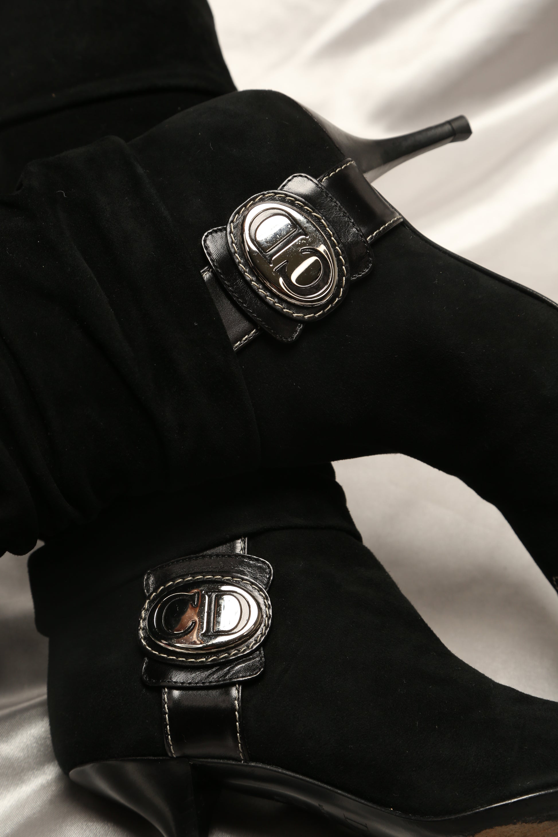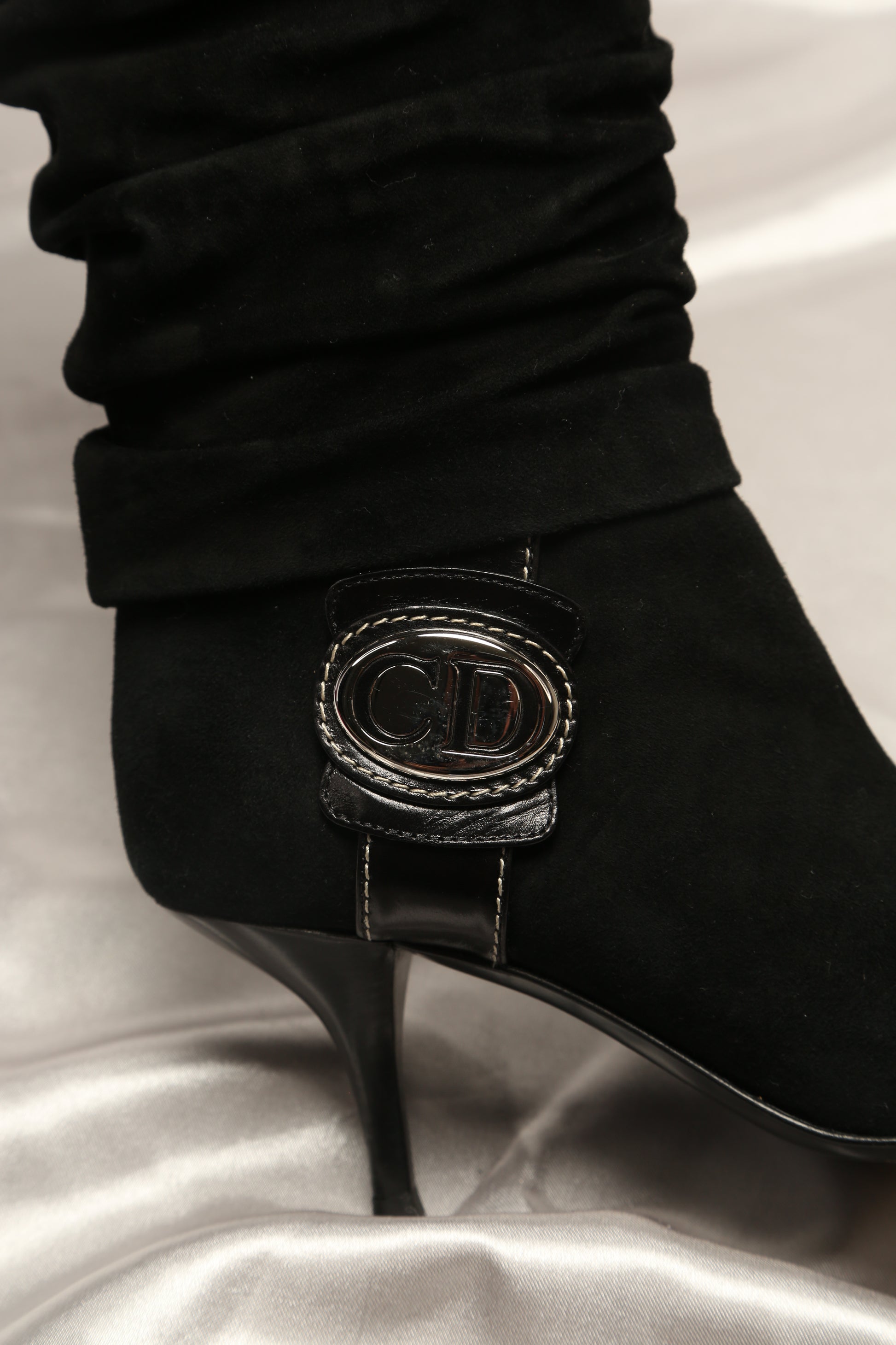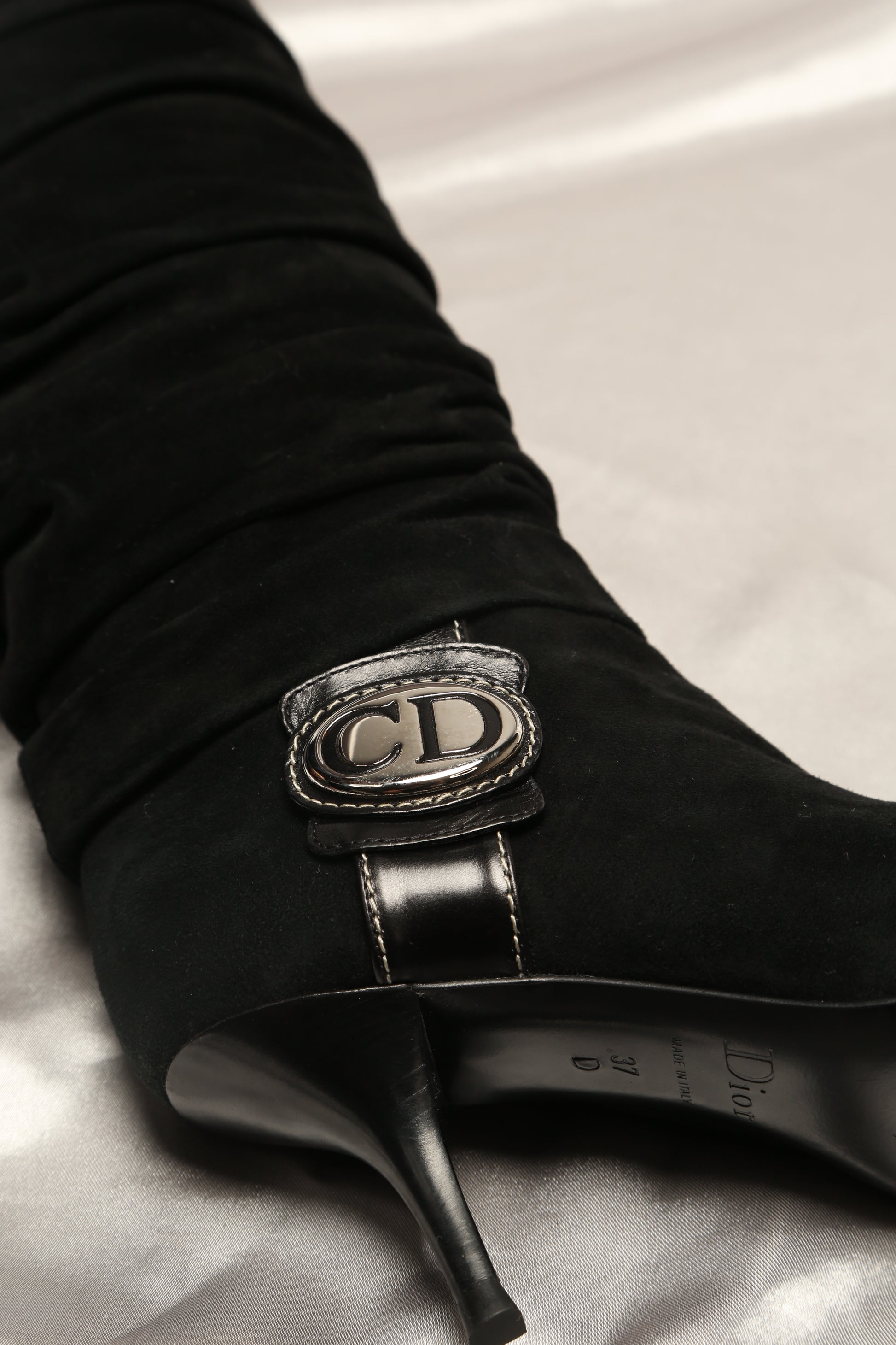 Indulge in elegance with these stunning rare Dior suede leather boots, impeccably maintained in perfect condition. The standout feature of these boots lies in the oversized CD silver details adorning the sides, adding a unique and edgy touch. Crafted to perfection, these boots are not only a statement of style but a testament to fine craftsmanship, perfect for those seeking a distinct, fashion-forward edge in their footwear collection.