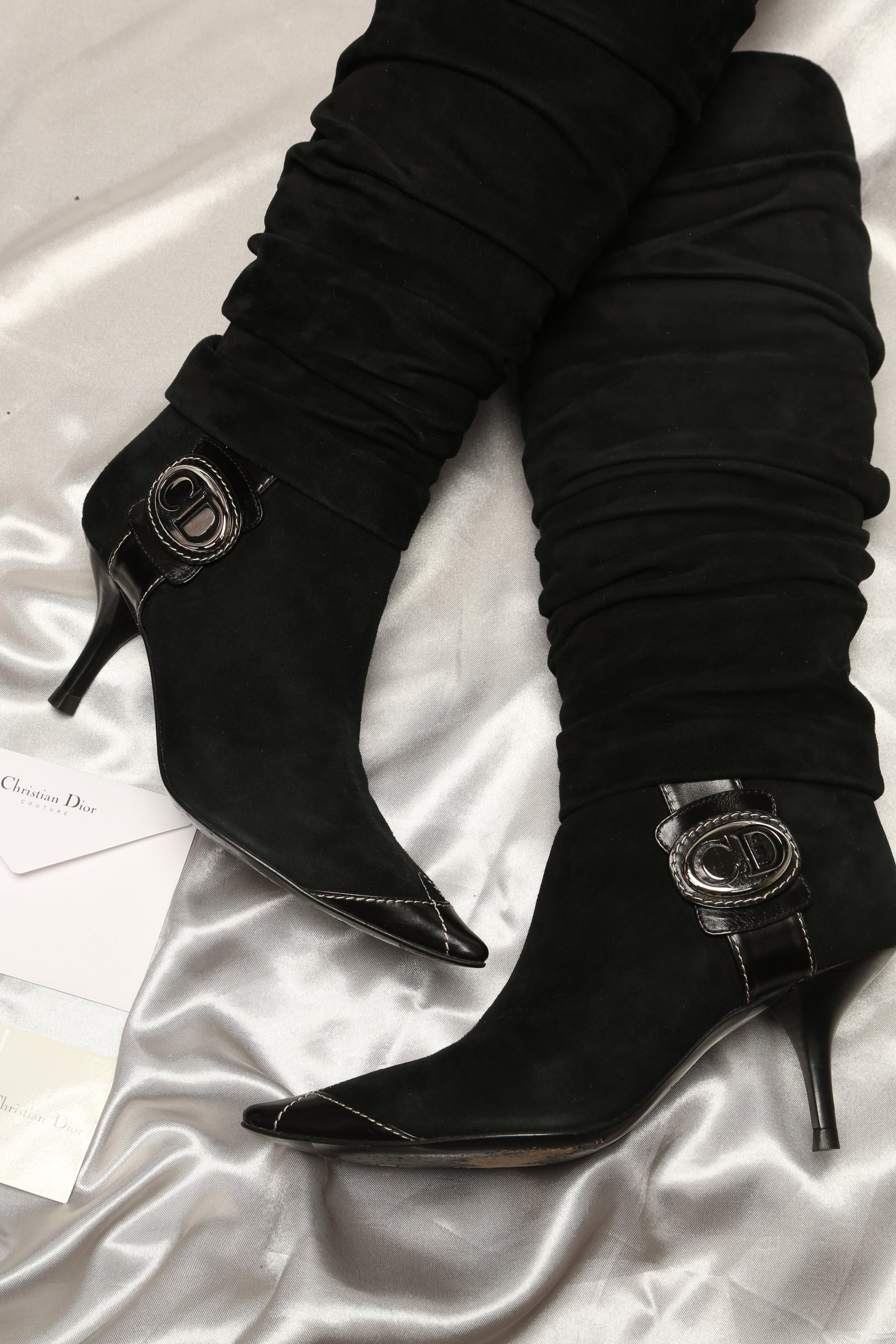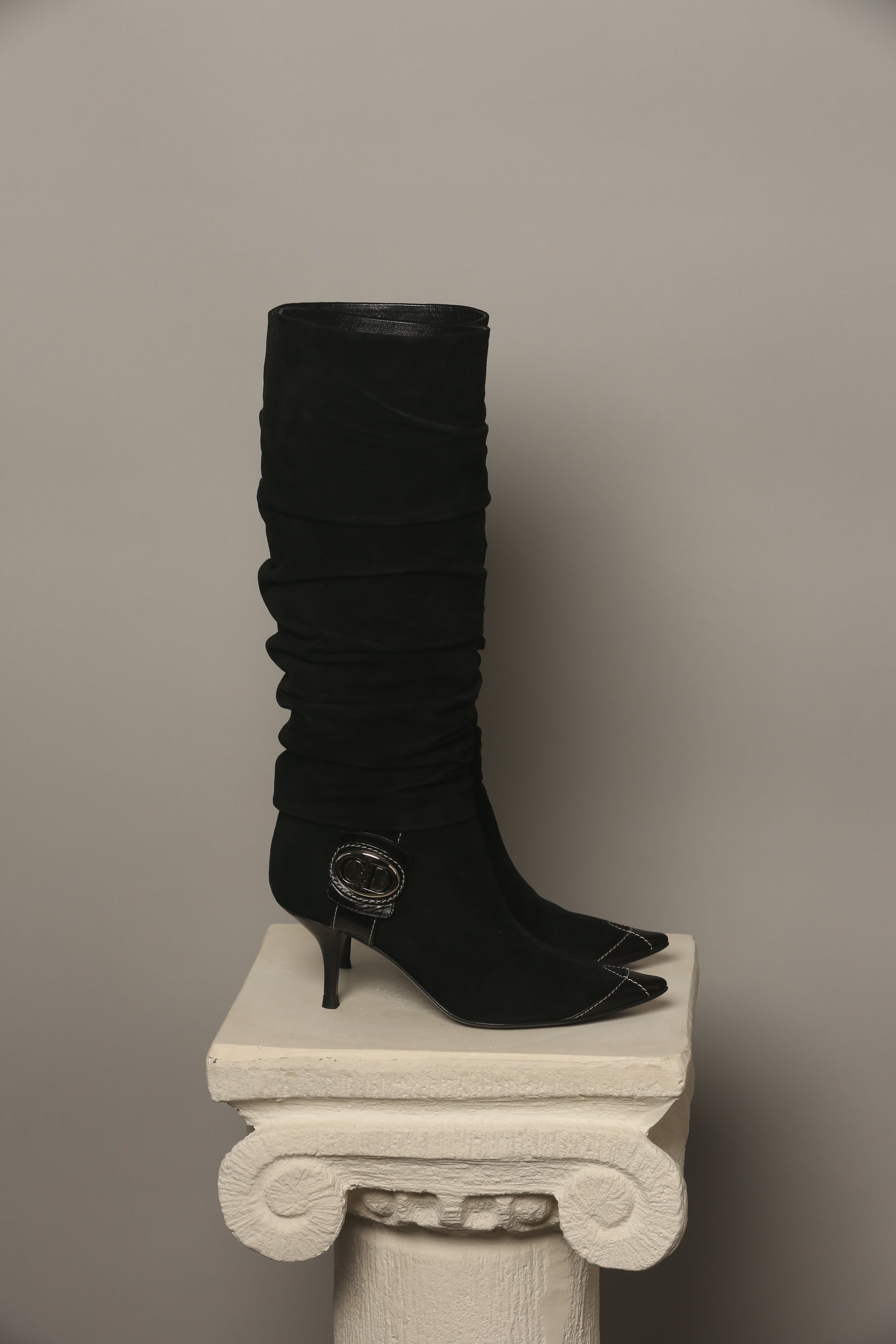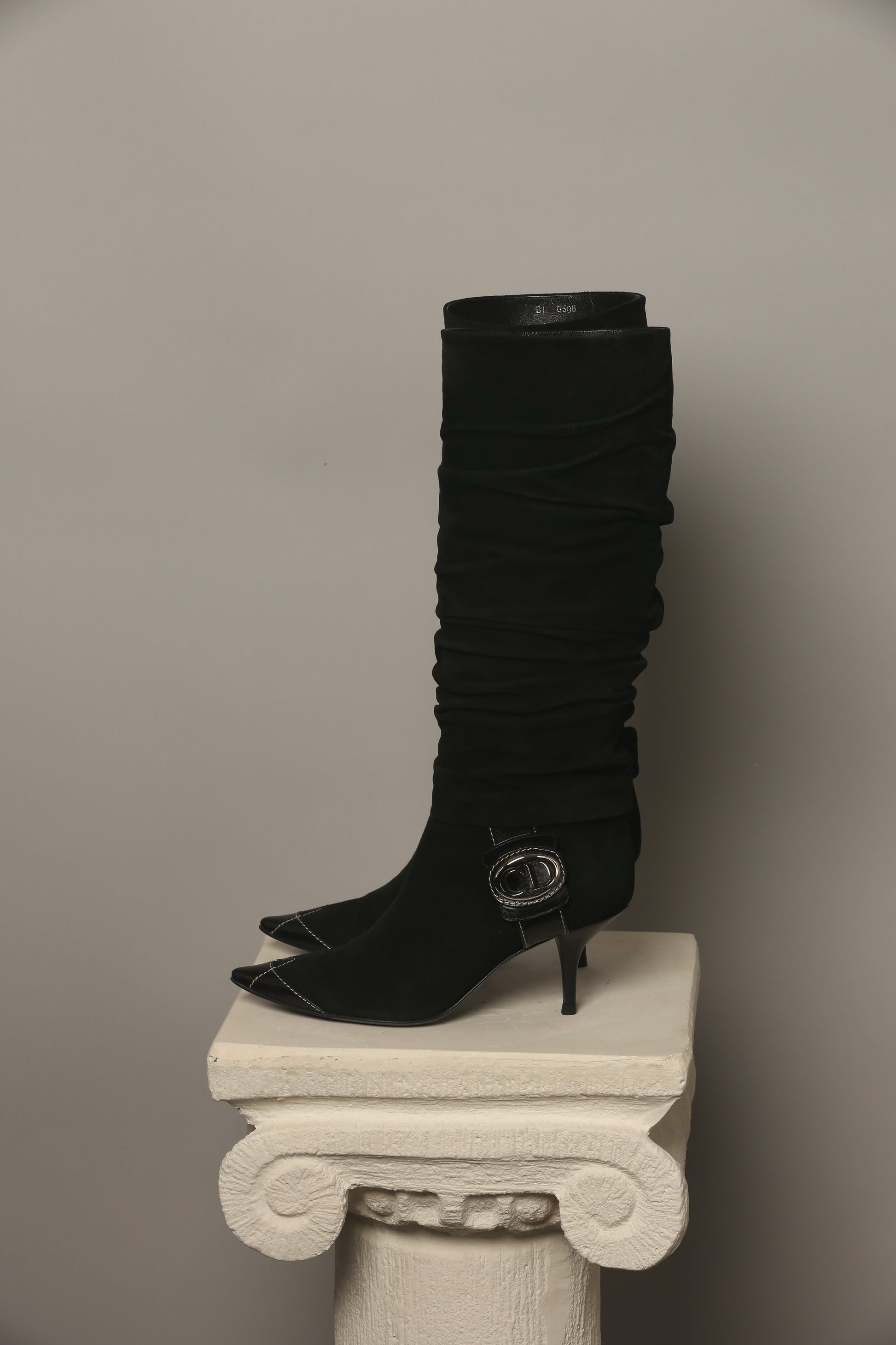 Indulge in elegance with these stunning rare Dior suede leather boots, impeccably maintained in perfect condition. The standout feature of these boots lies in the oversized CD silver details adorning the sides, adding a unique and edgy touch. Crafted to perfection, these boots are not only a statement of style but a testament to fine craftsmanship, perfect for those seeking a distinct, fashion-forward edge in their footwear collection.