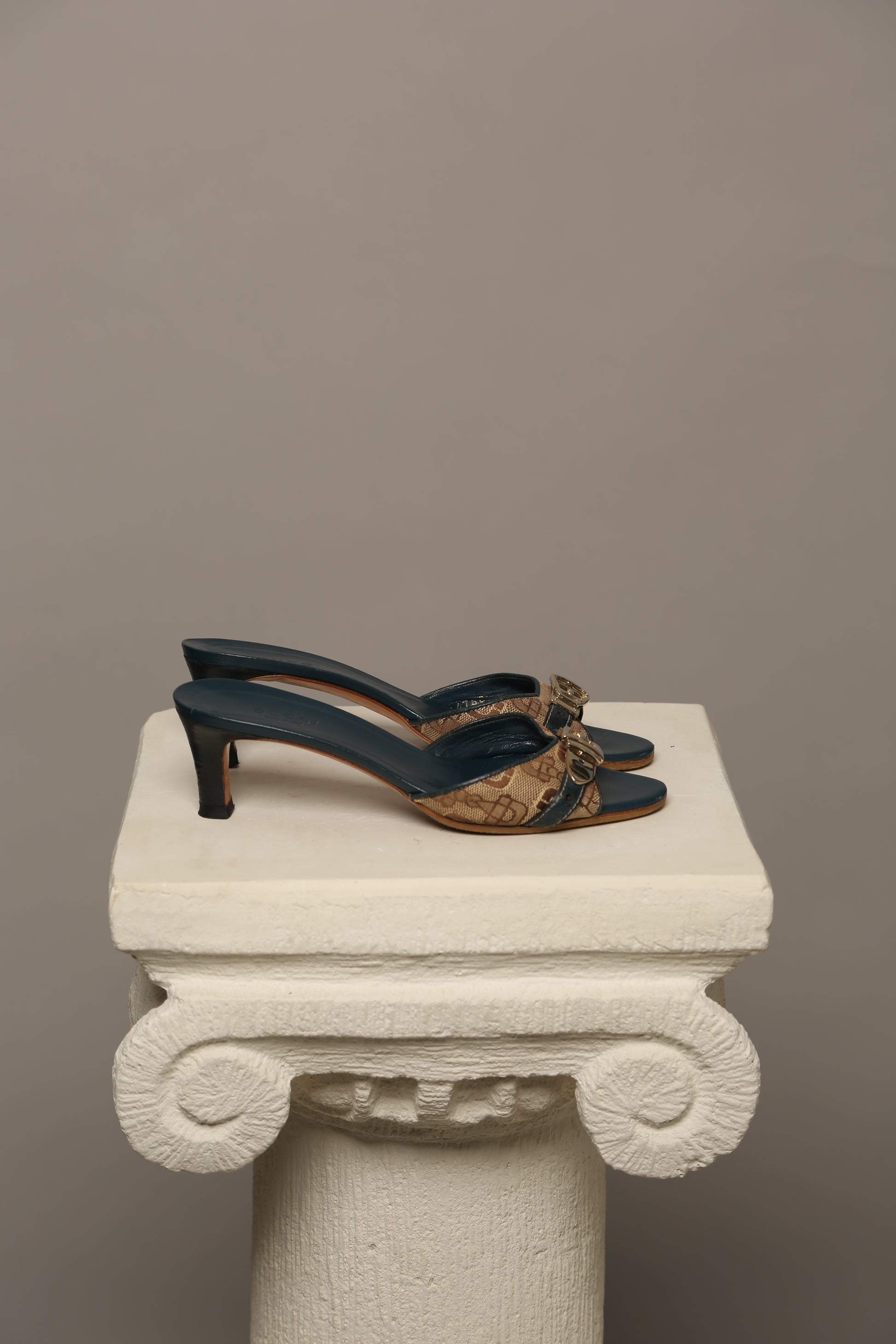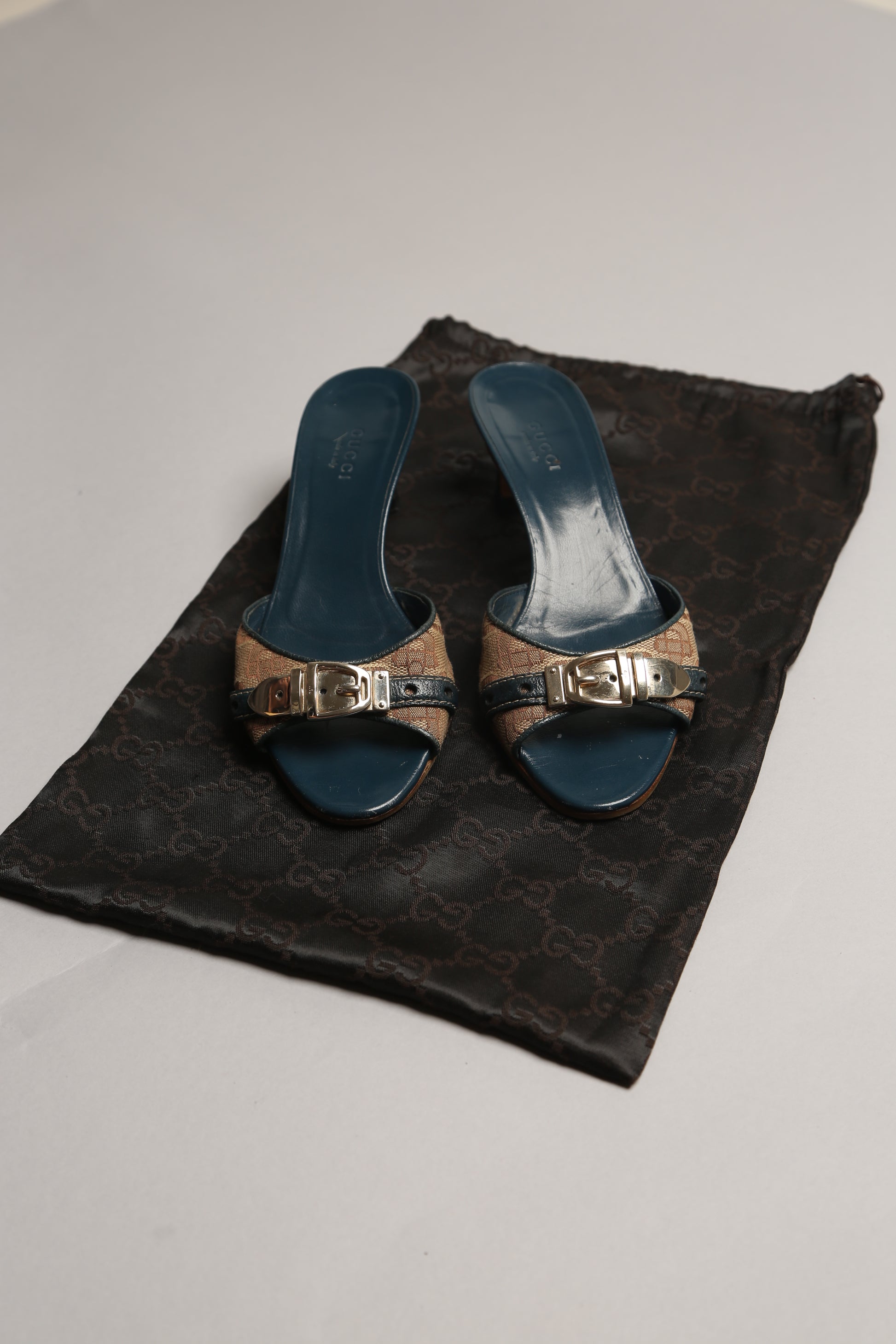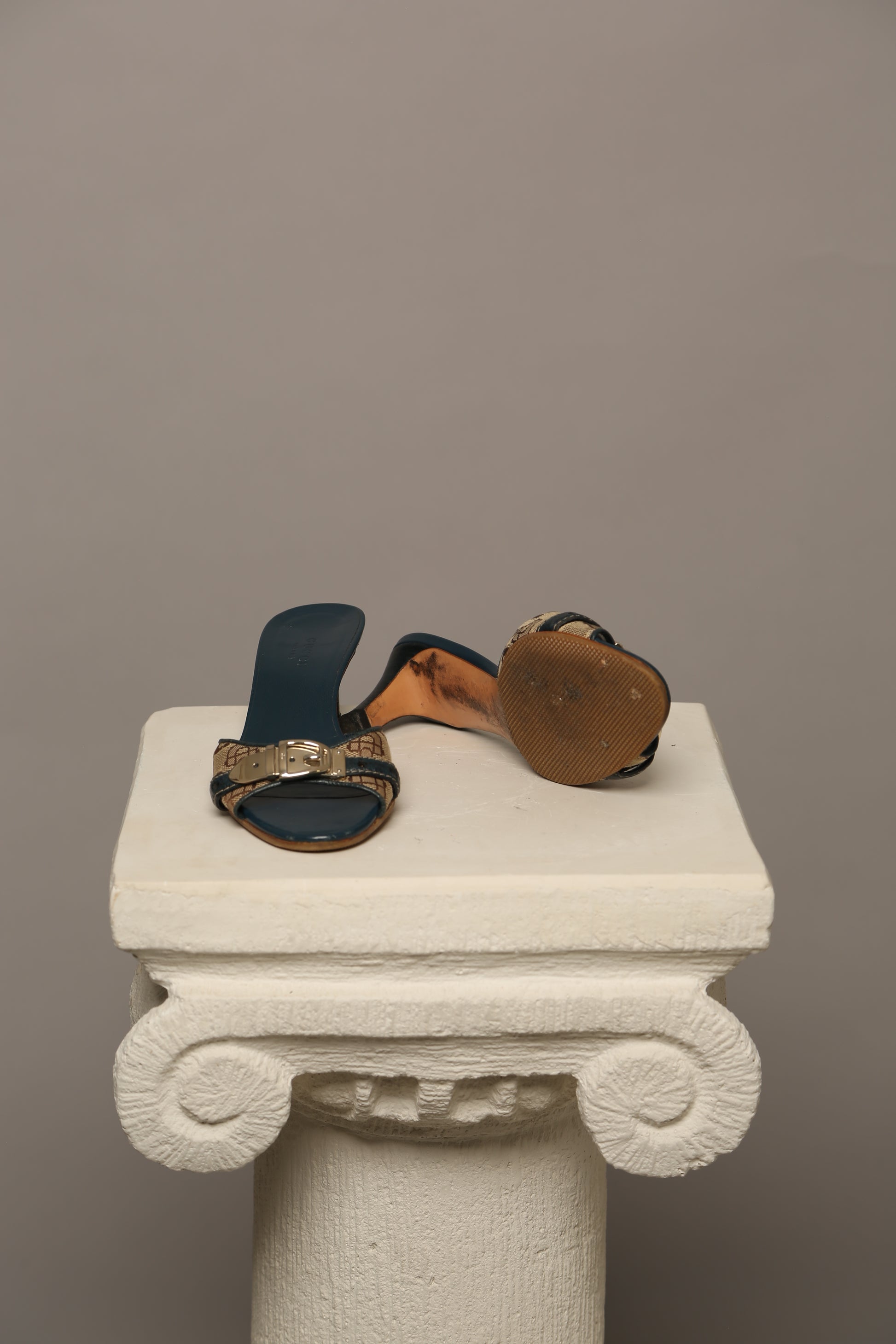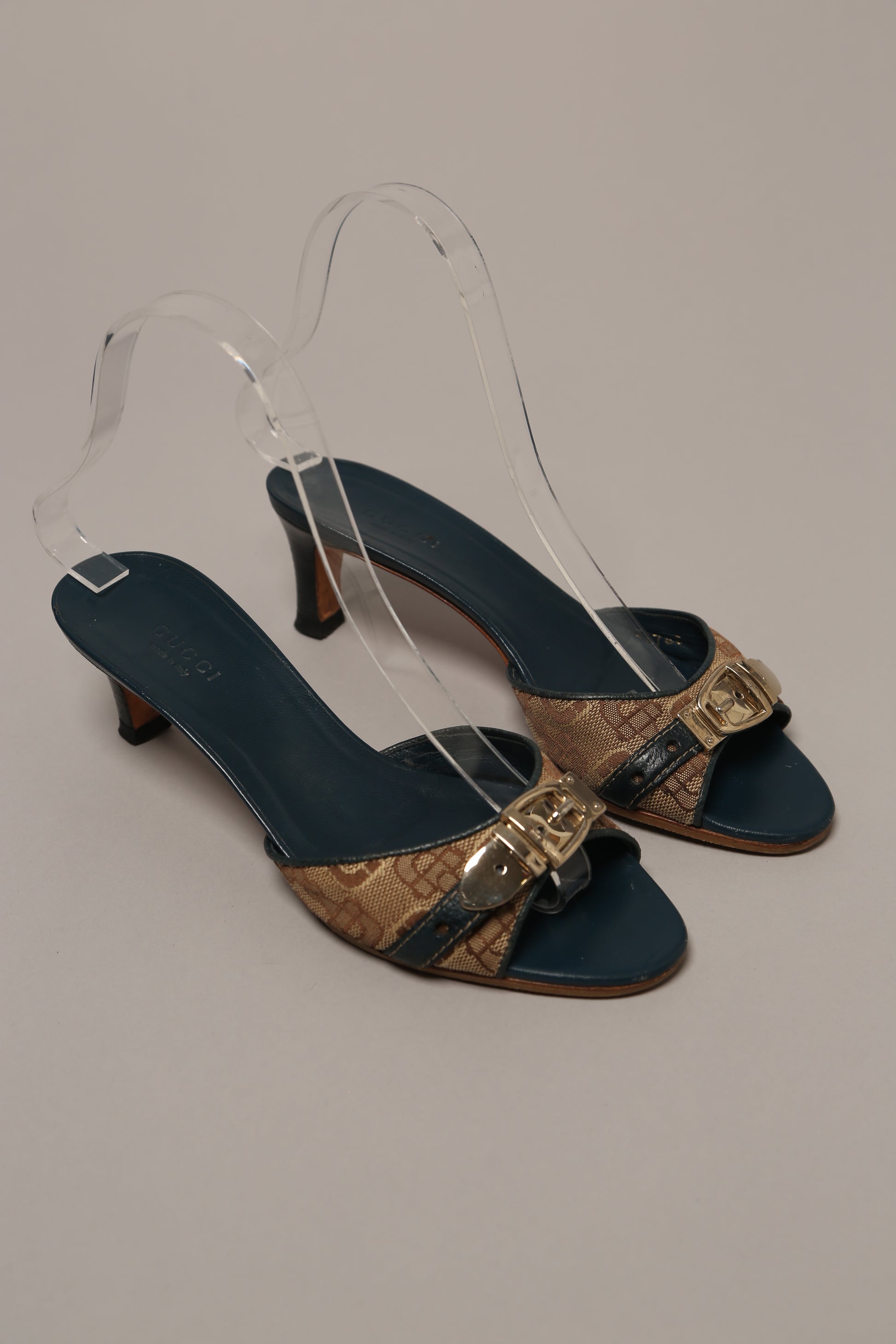 Gucci sandals, featuring distinctive horse-bit details on canvas and a leather "belt" adorned with elegant gold buckle hardware. This unique combination of materials and design elements epitomizes Gucci's signature blend of luxury and craftsmanship.