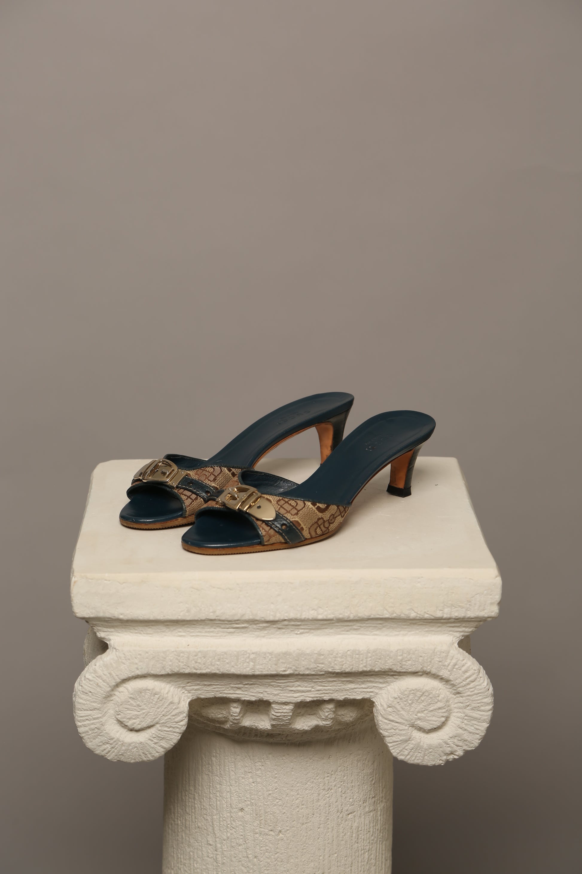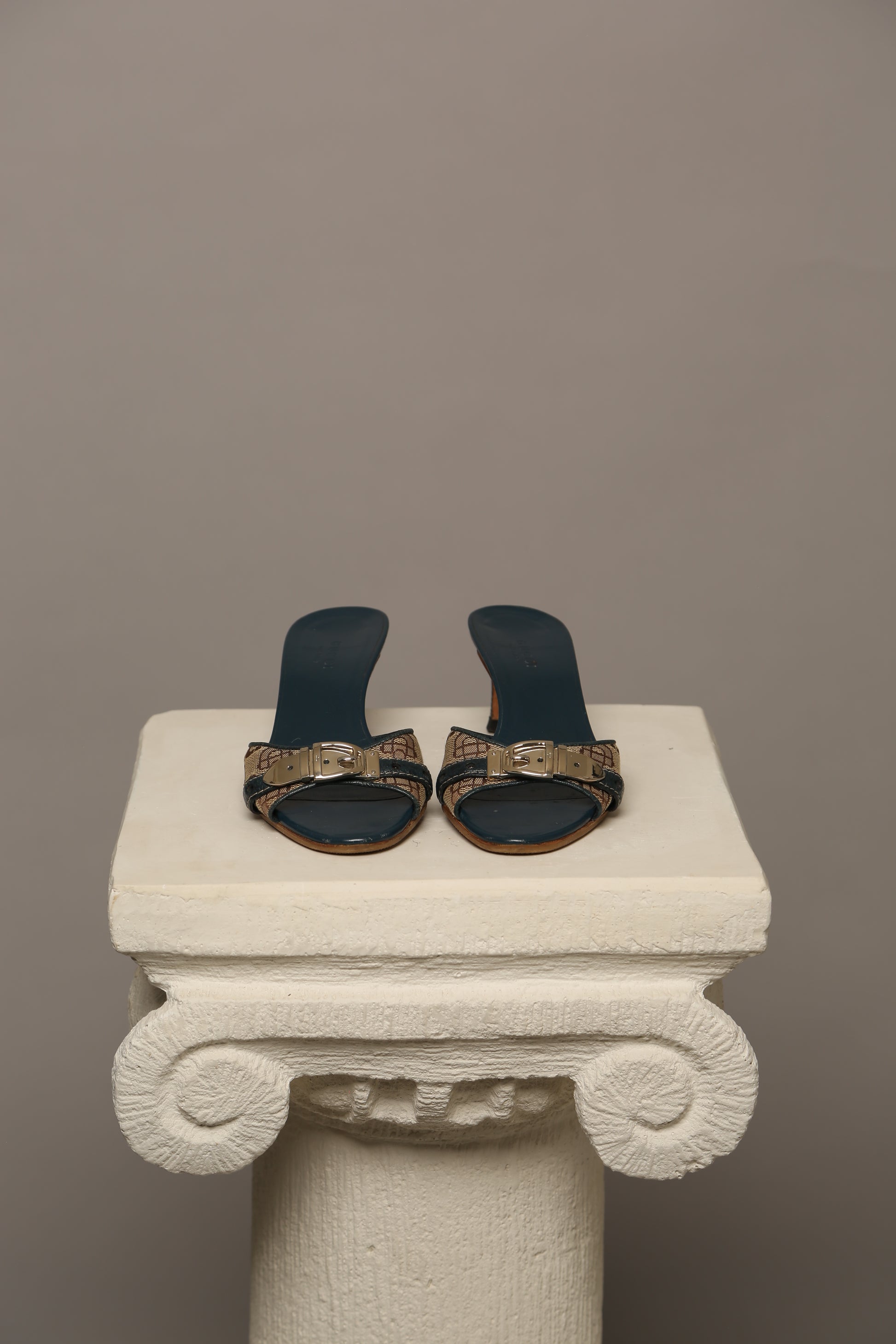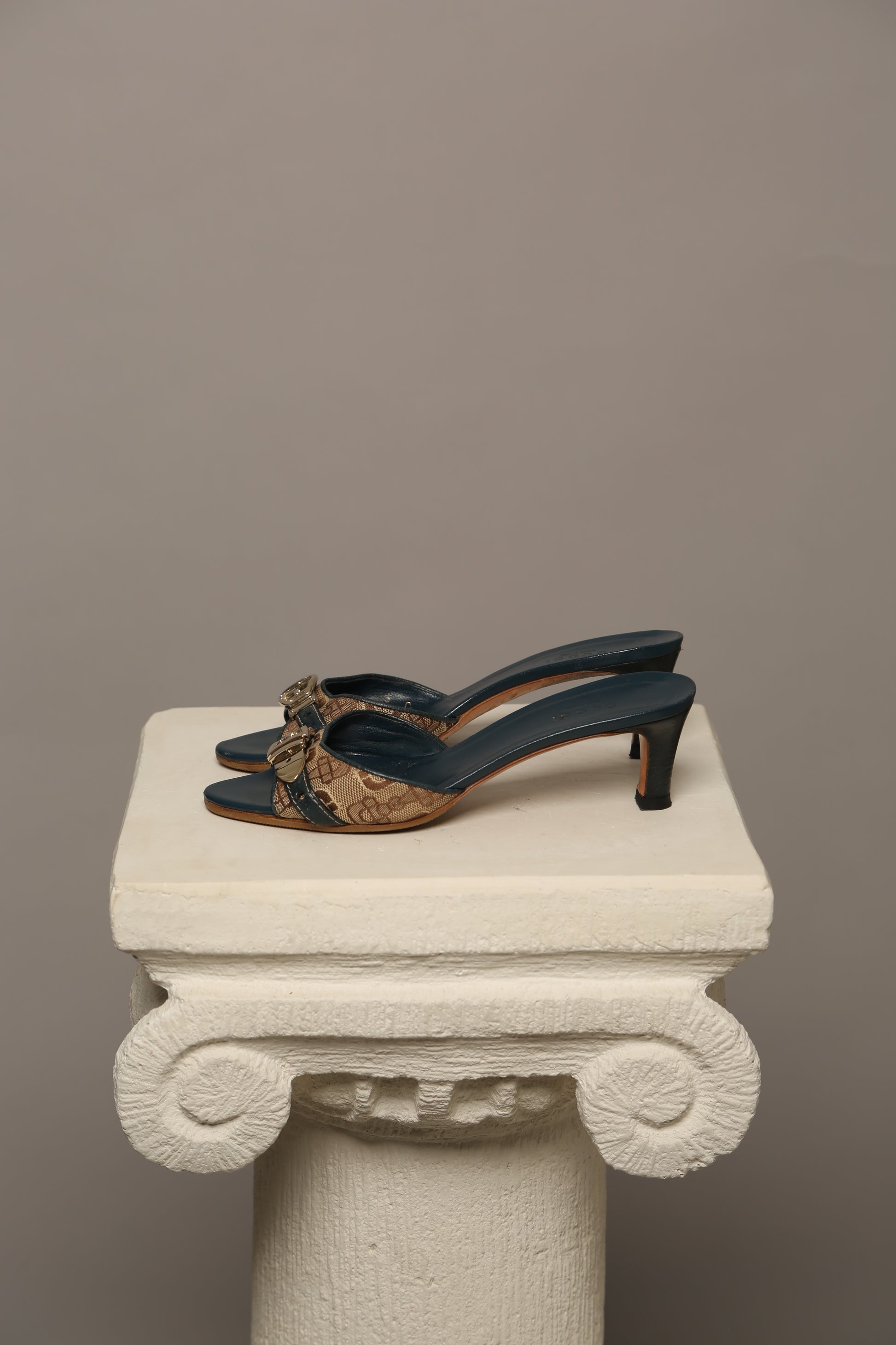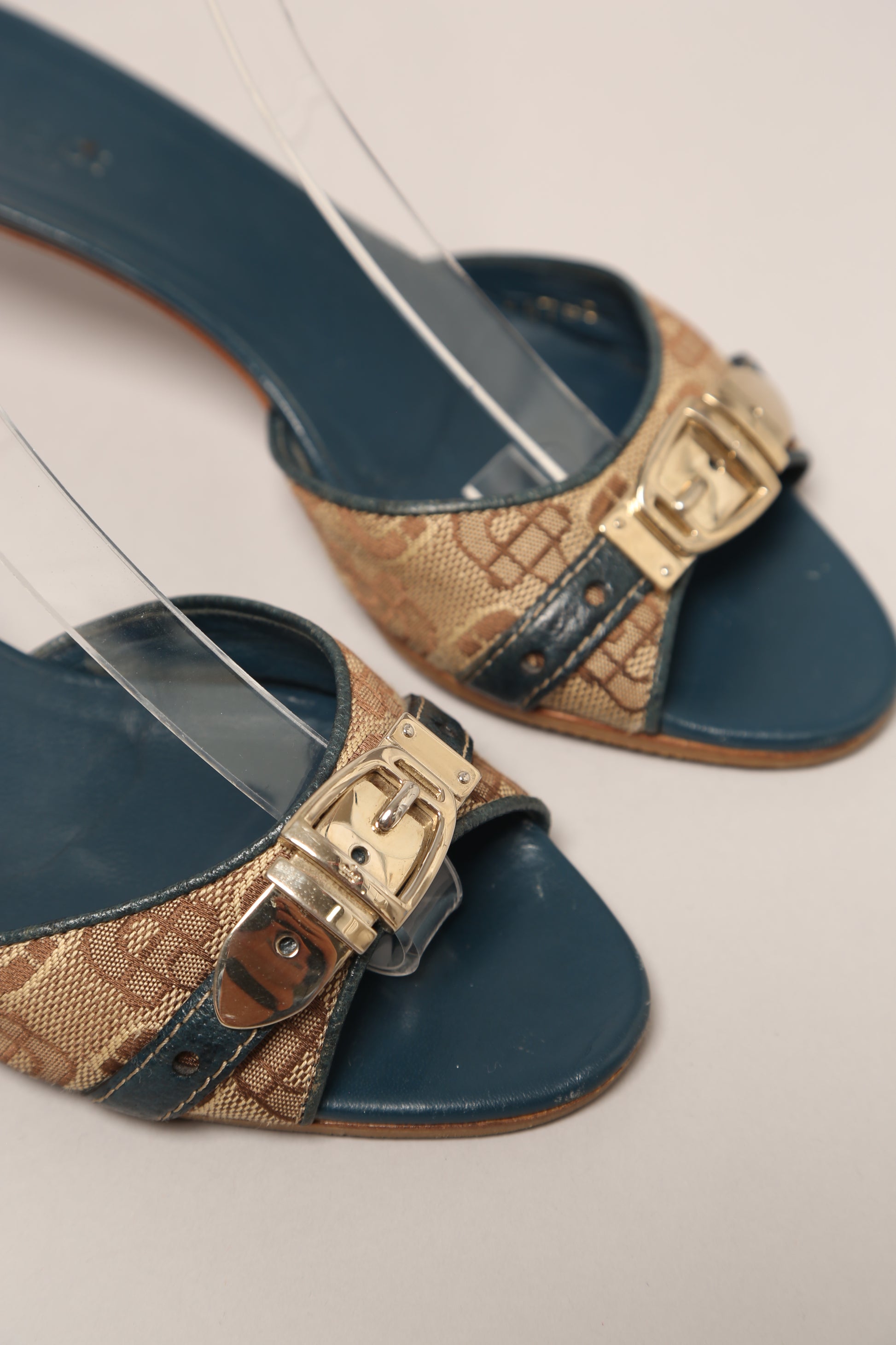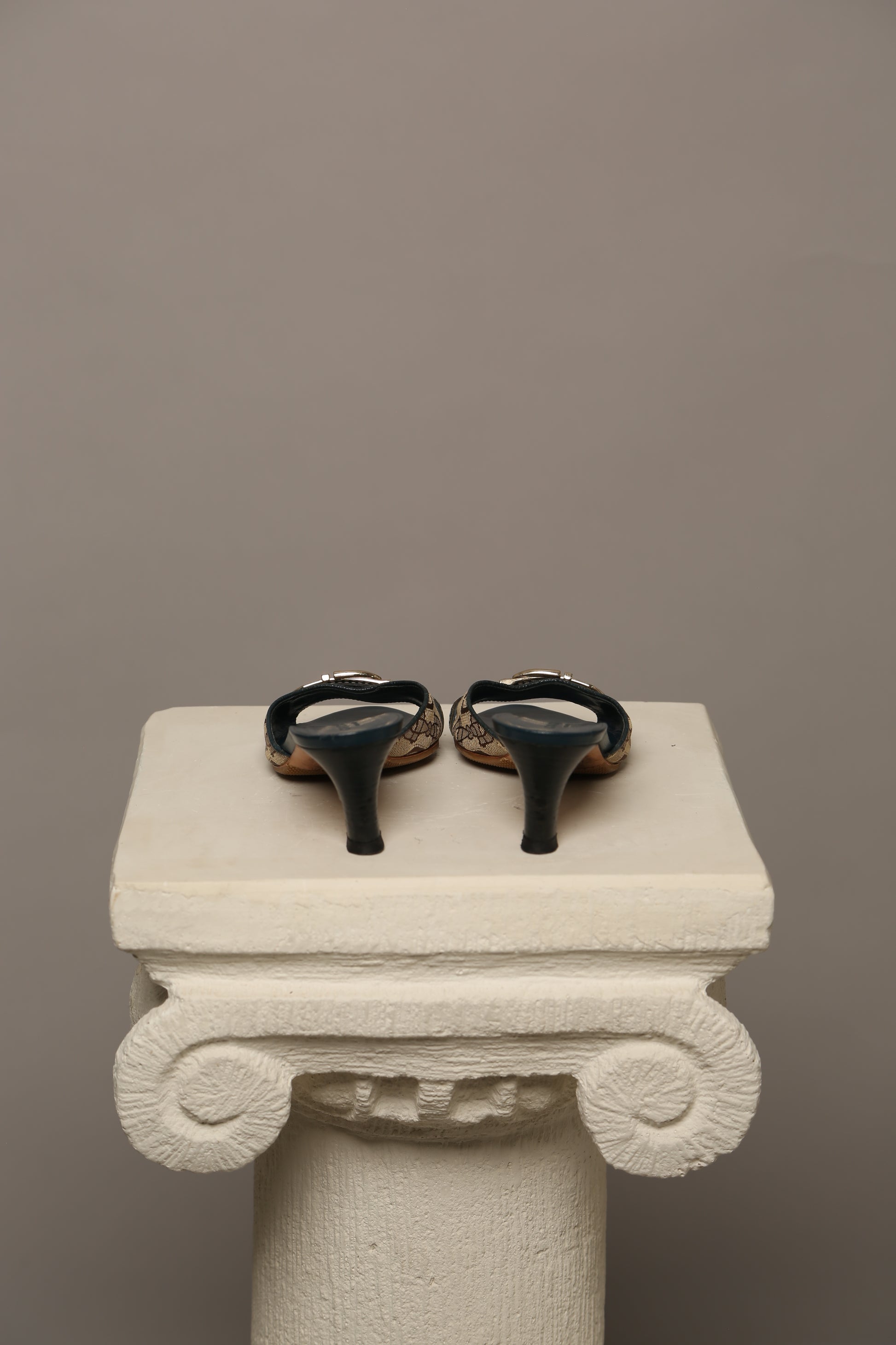 Gucci sandals, featuring distinctive horse-bit details on canvas and a leather "belt" adorned with elegant gold buckle hardware. This unique combination of materials and design elements epitomizes Gucci's signature blend of luxury and craftsmanship.