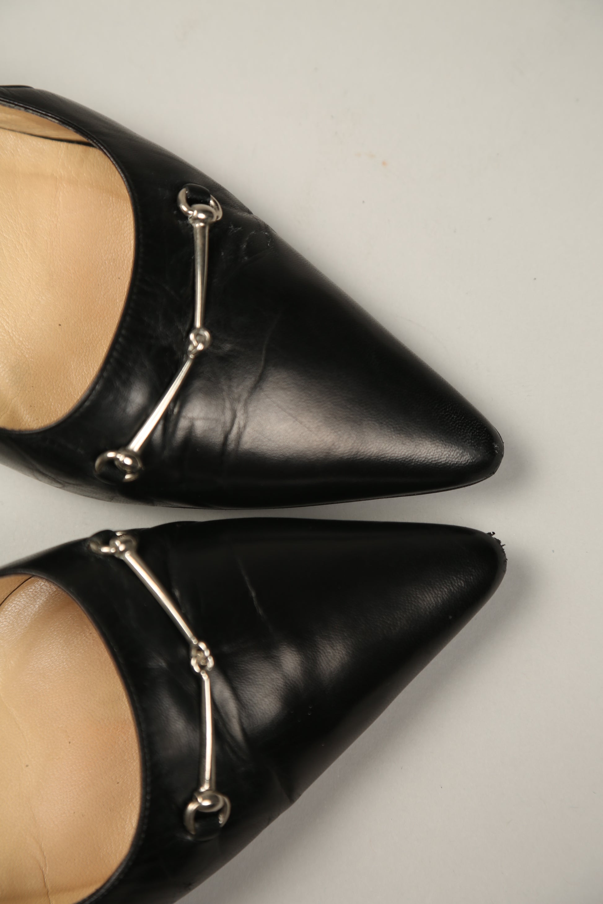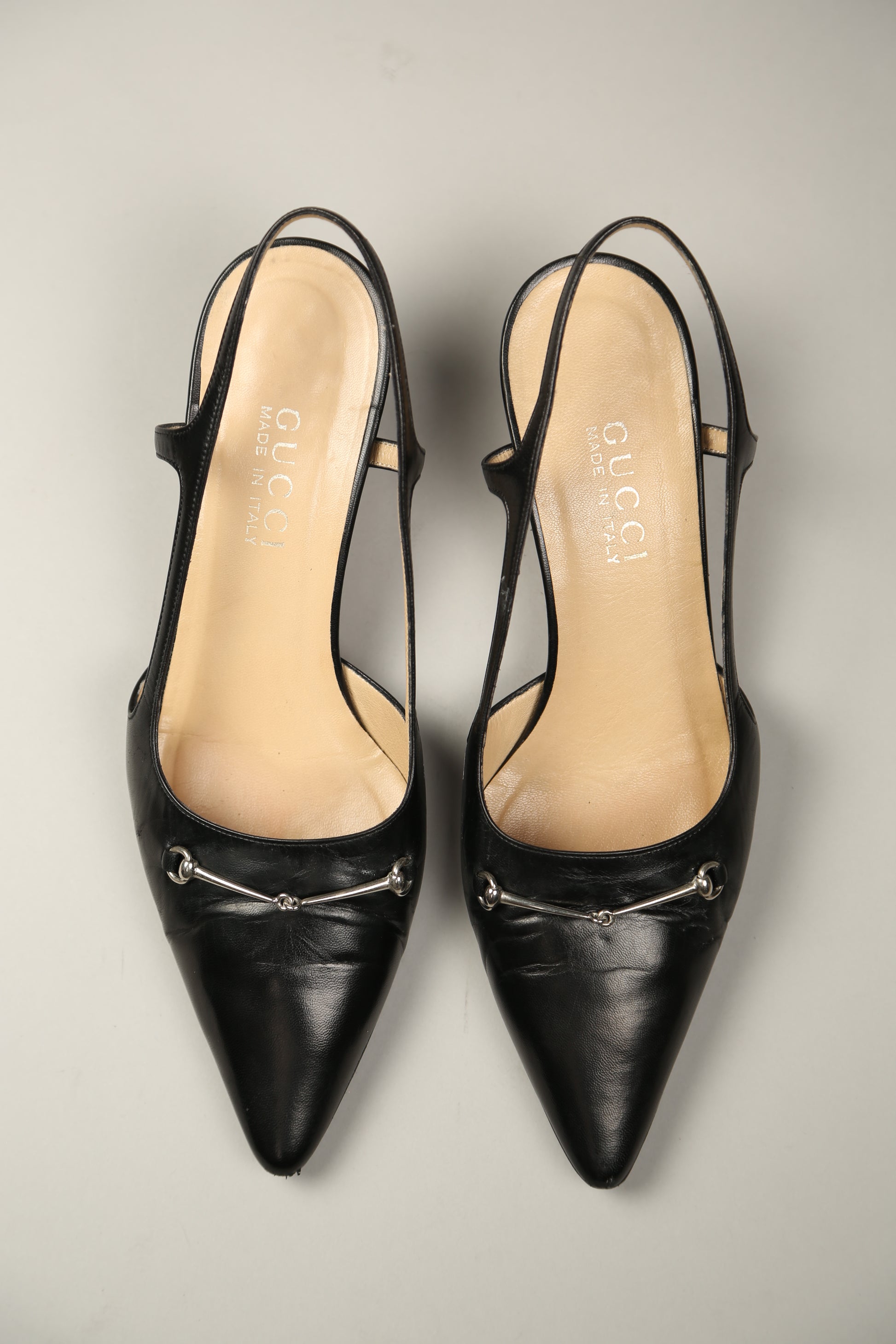 Elevate your wardrobe with these timeless Gucci slingback pumps, crafted from super soft, high-quality leather for a luxe, comfortable feel. Designed with the Italian fashion house’s signature horsebit hardware, this pair embodies understated elegance and iconic Gucci heritage. The silhouette is beautifully minimal—pointed toe, sleek lines, and a refined slingback strap—making them the perfect choice for a classic, minimalist outfit. A truly timeless piece that transitions effortlessly from day to night. Normal signs of wear. Leather shows soft wrinkles from use and minor hairline scratches on the hardware, nothing that affects wear or beauty.
