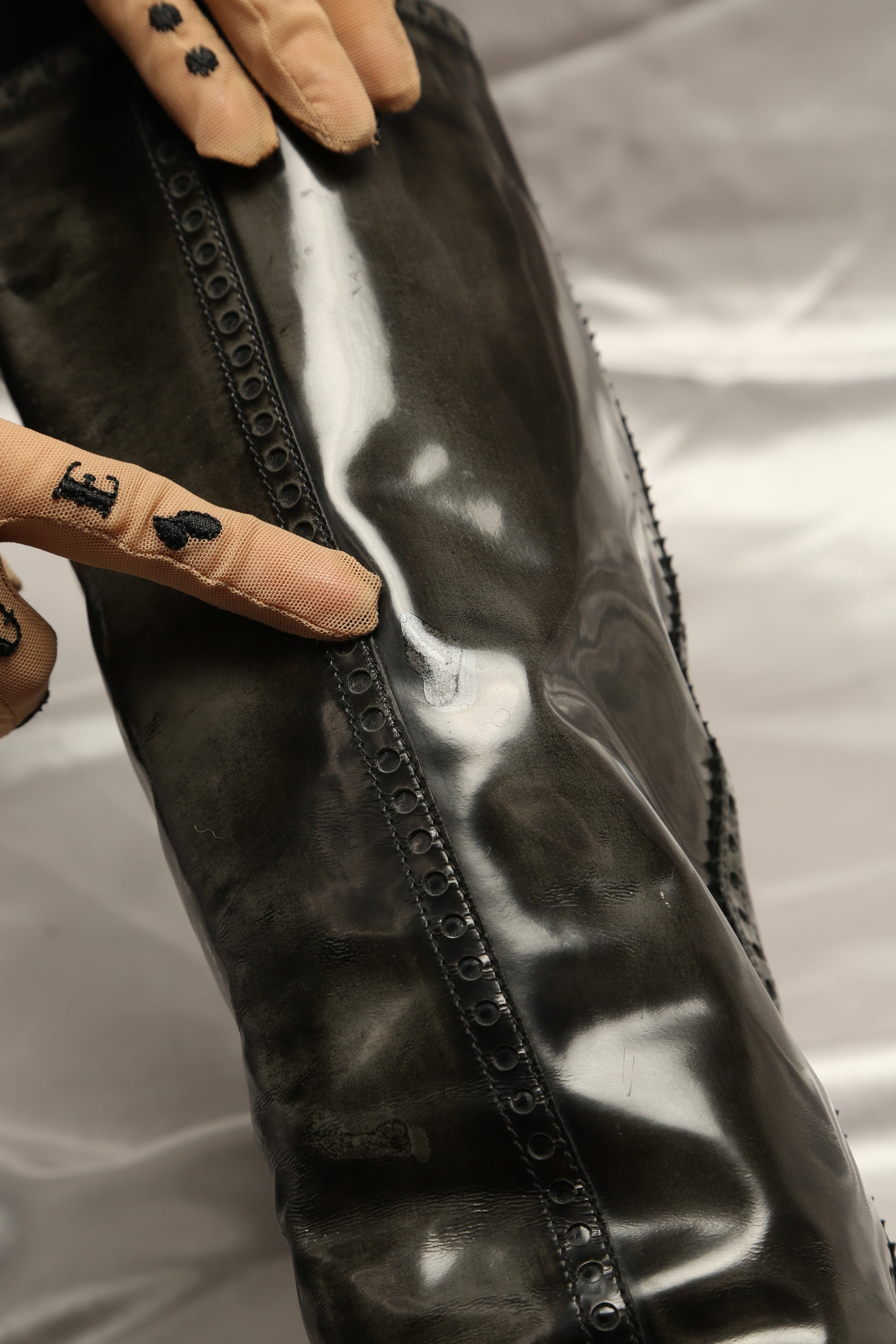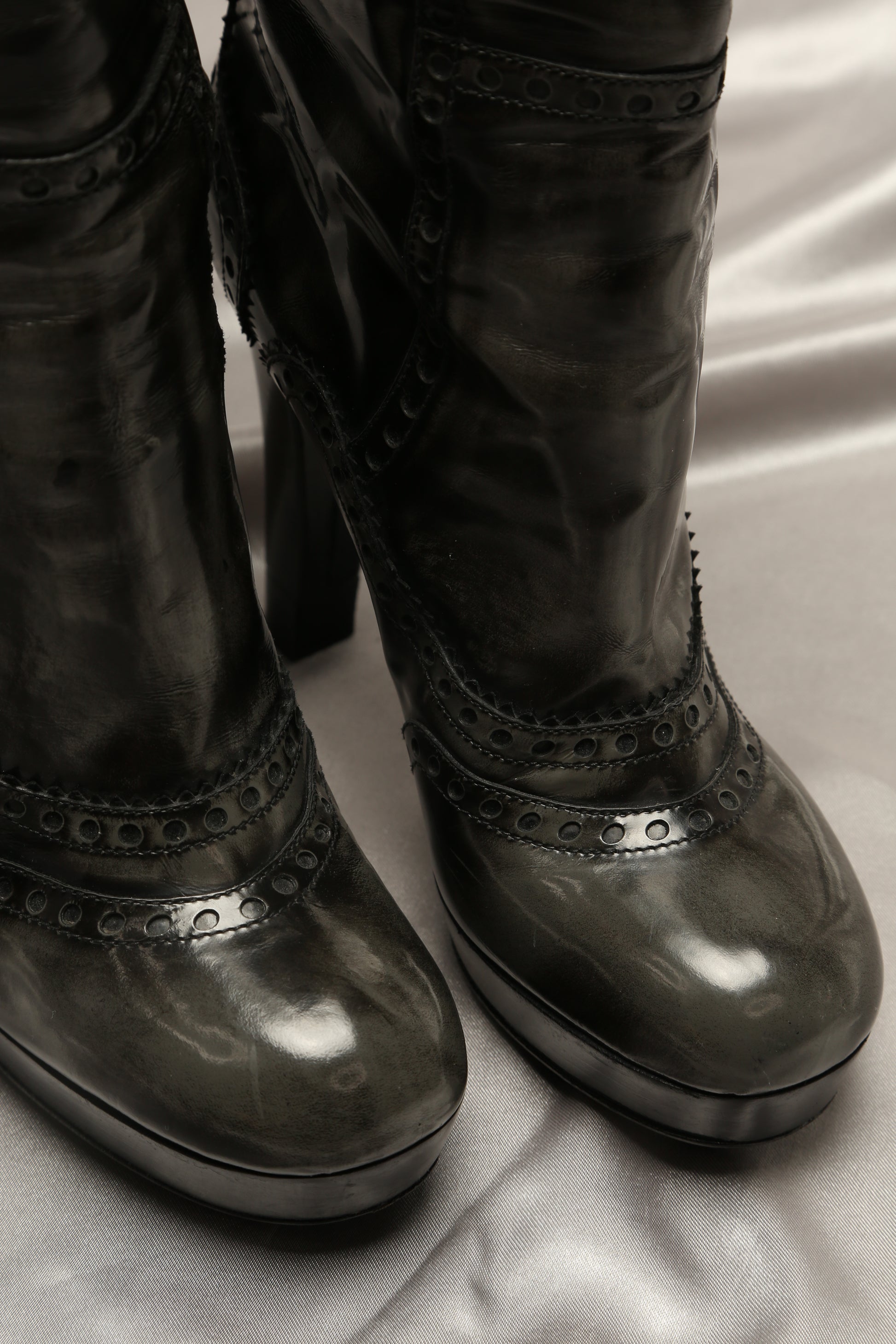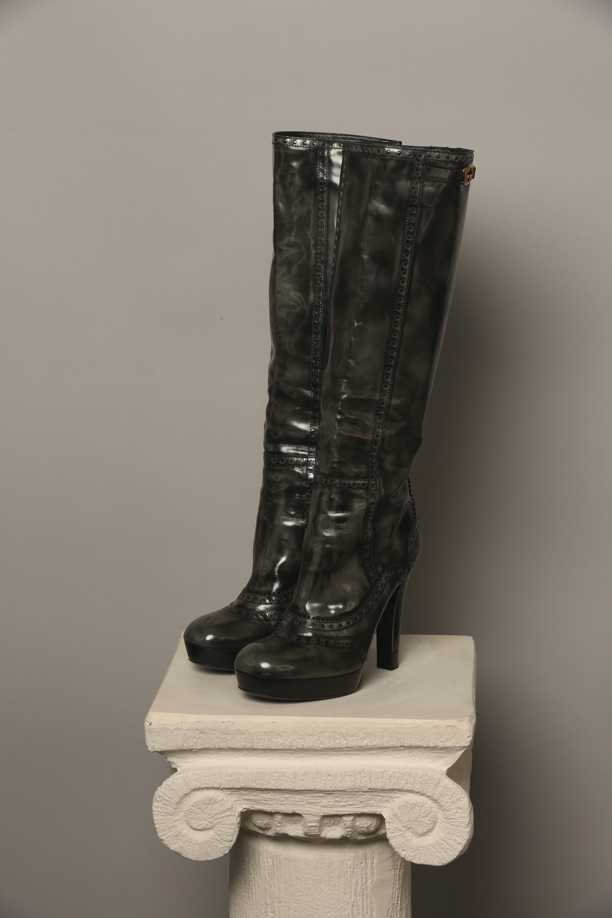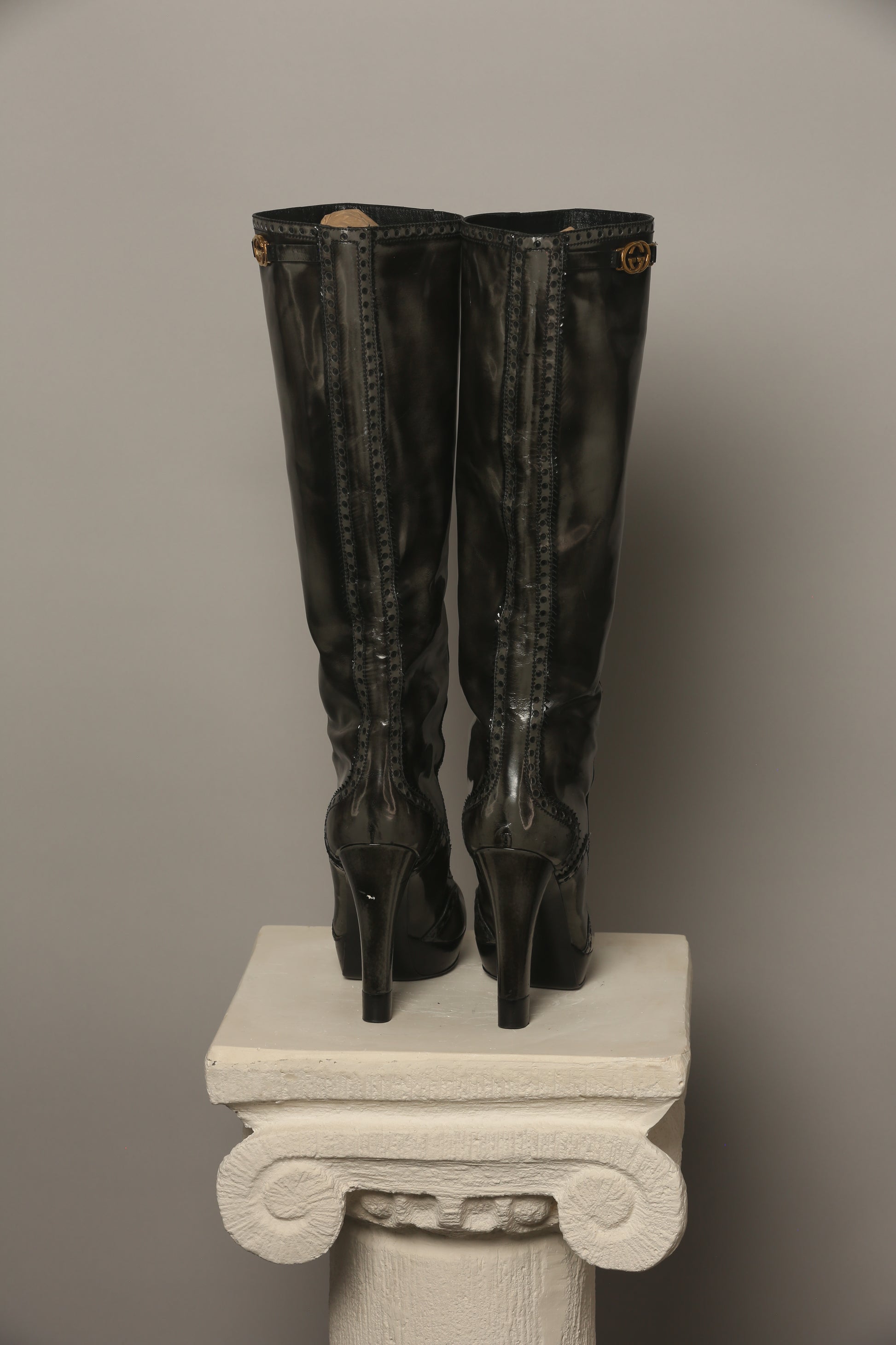 Gucci knee-high boots in a sophisticated dark grey faded grey/charcoal l and black hue, with unique laser cut detail. These statement boots feature an exquisite gold entwined GG logo positioned at the top of each boot, adding a touch of opulence and unmistakable Gucci elegance.