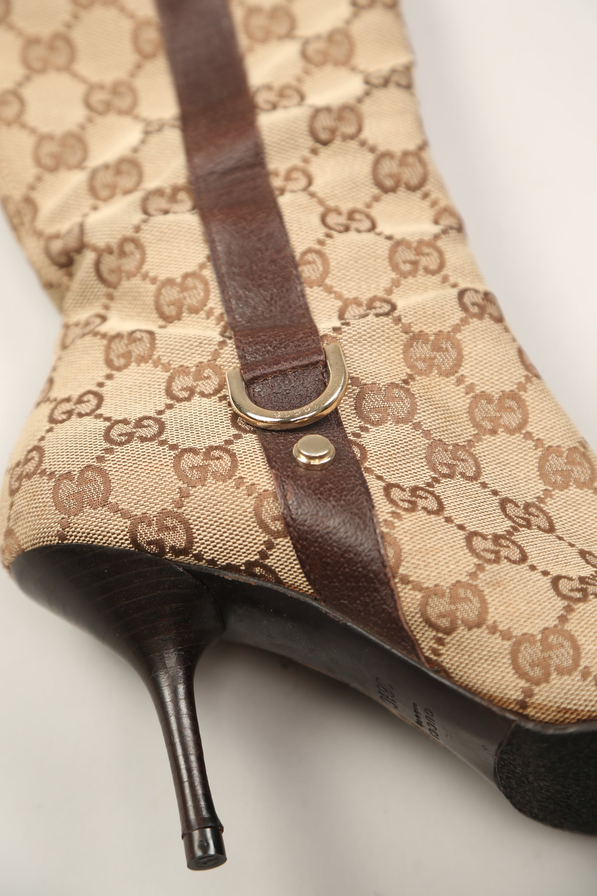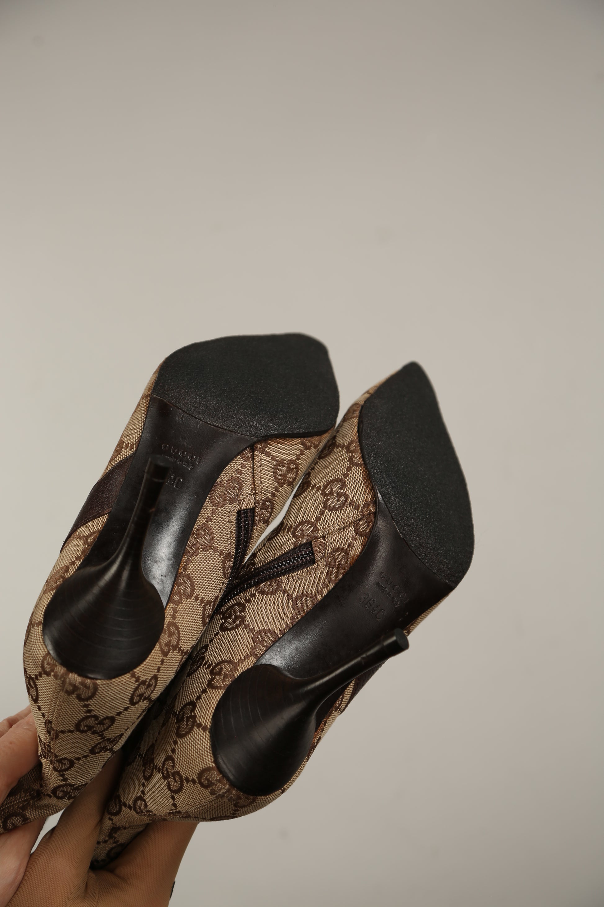 These Gucci canvas boots feature the iconic GG monogram print in rich brown tones, paired with dark brown leather trim and finished with classic gold Gucci hardware. A pointed-toe silhouette gives them that unmistakable, sleek Tom Ford–era edge — a highly coveted style that Gucci has recently brought back, making the vintage originals even more in demand.