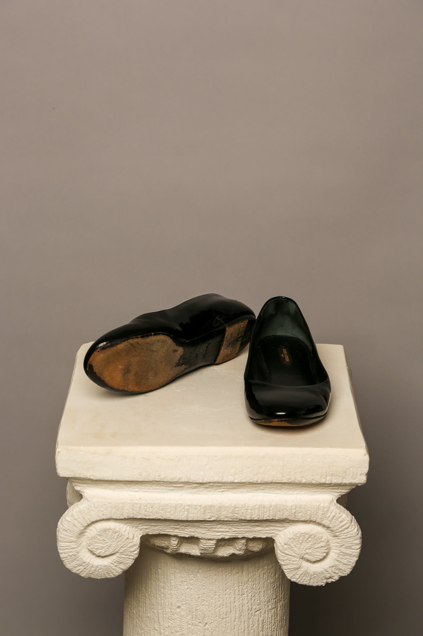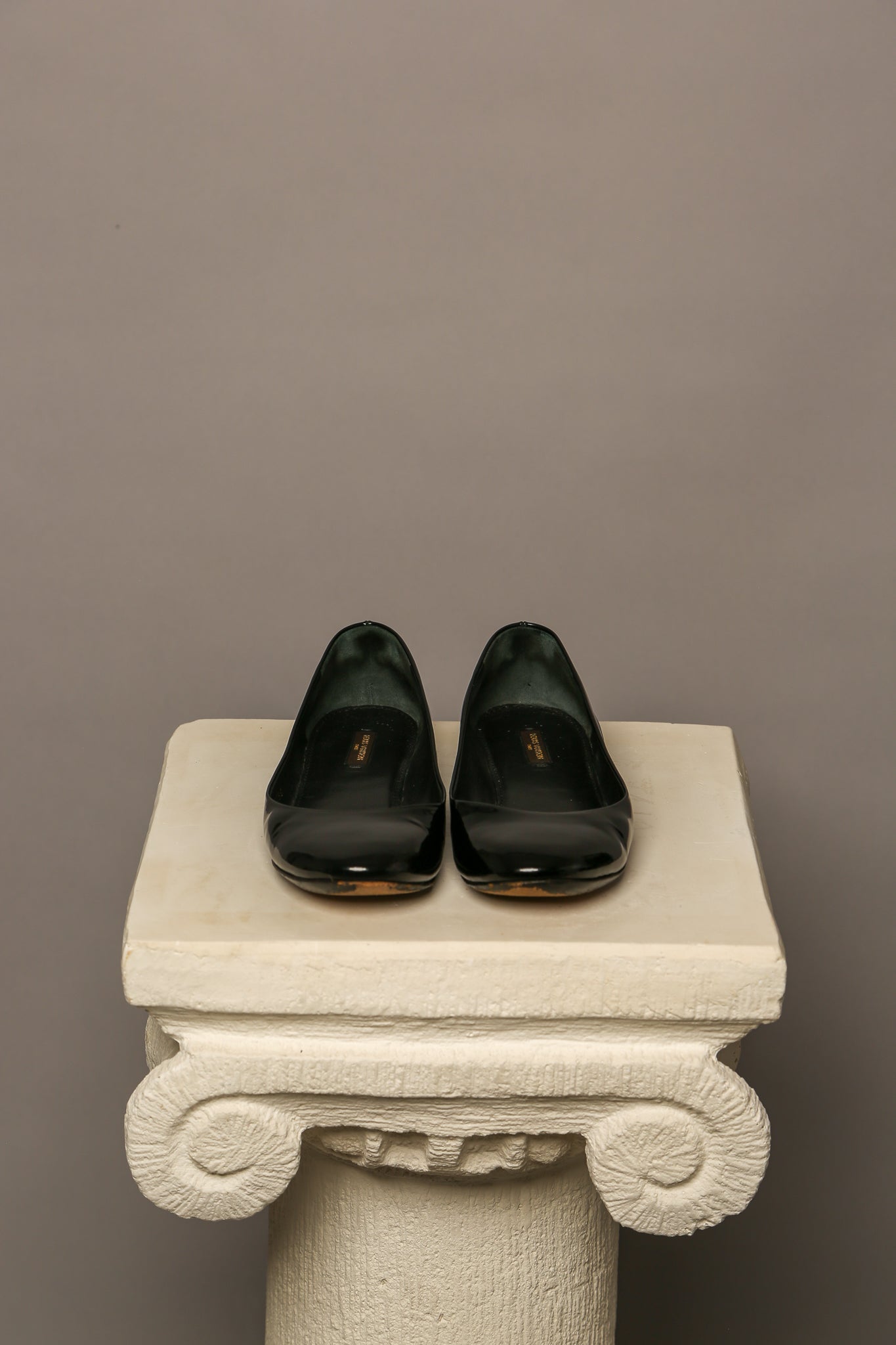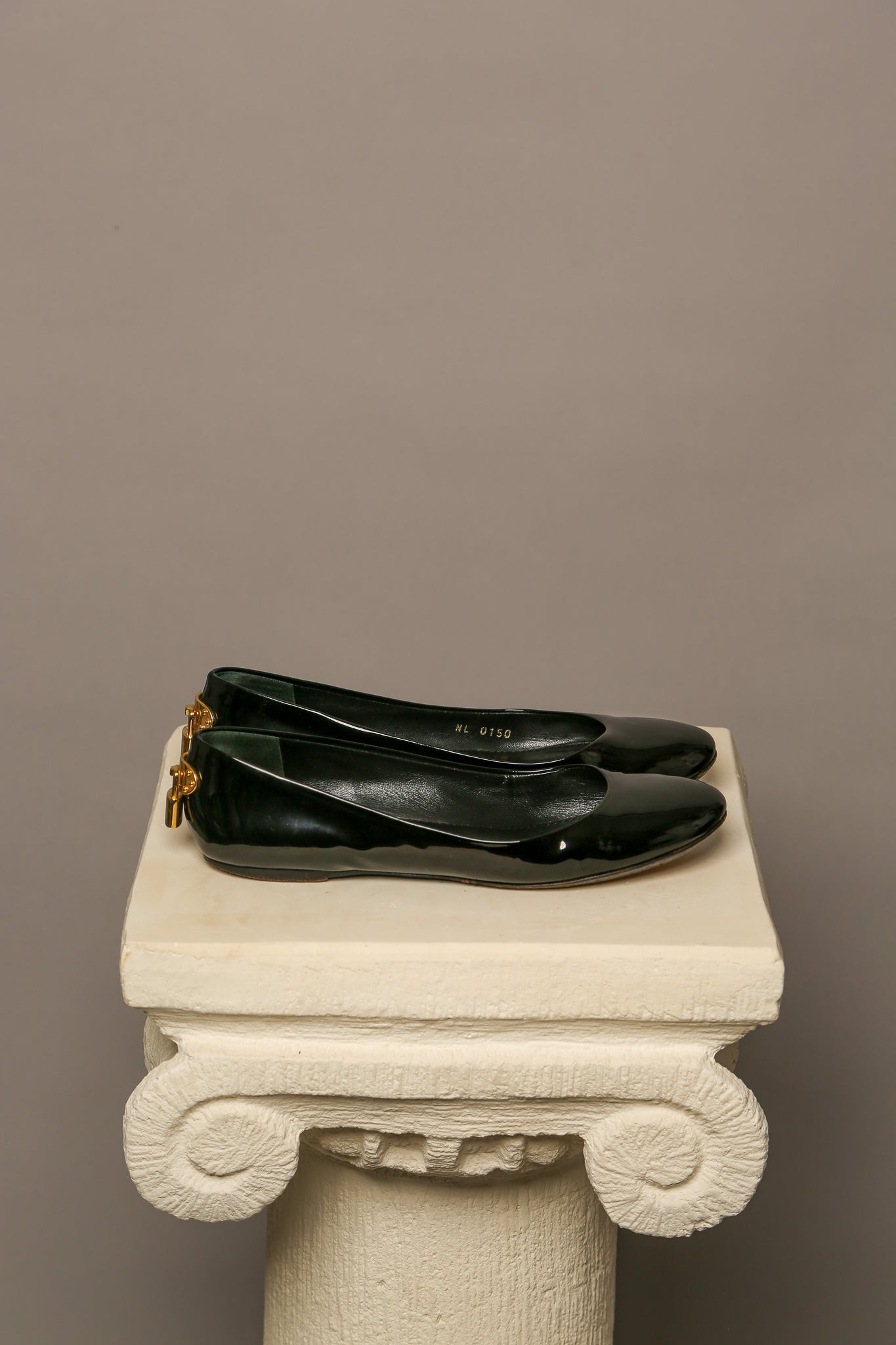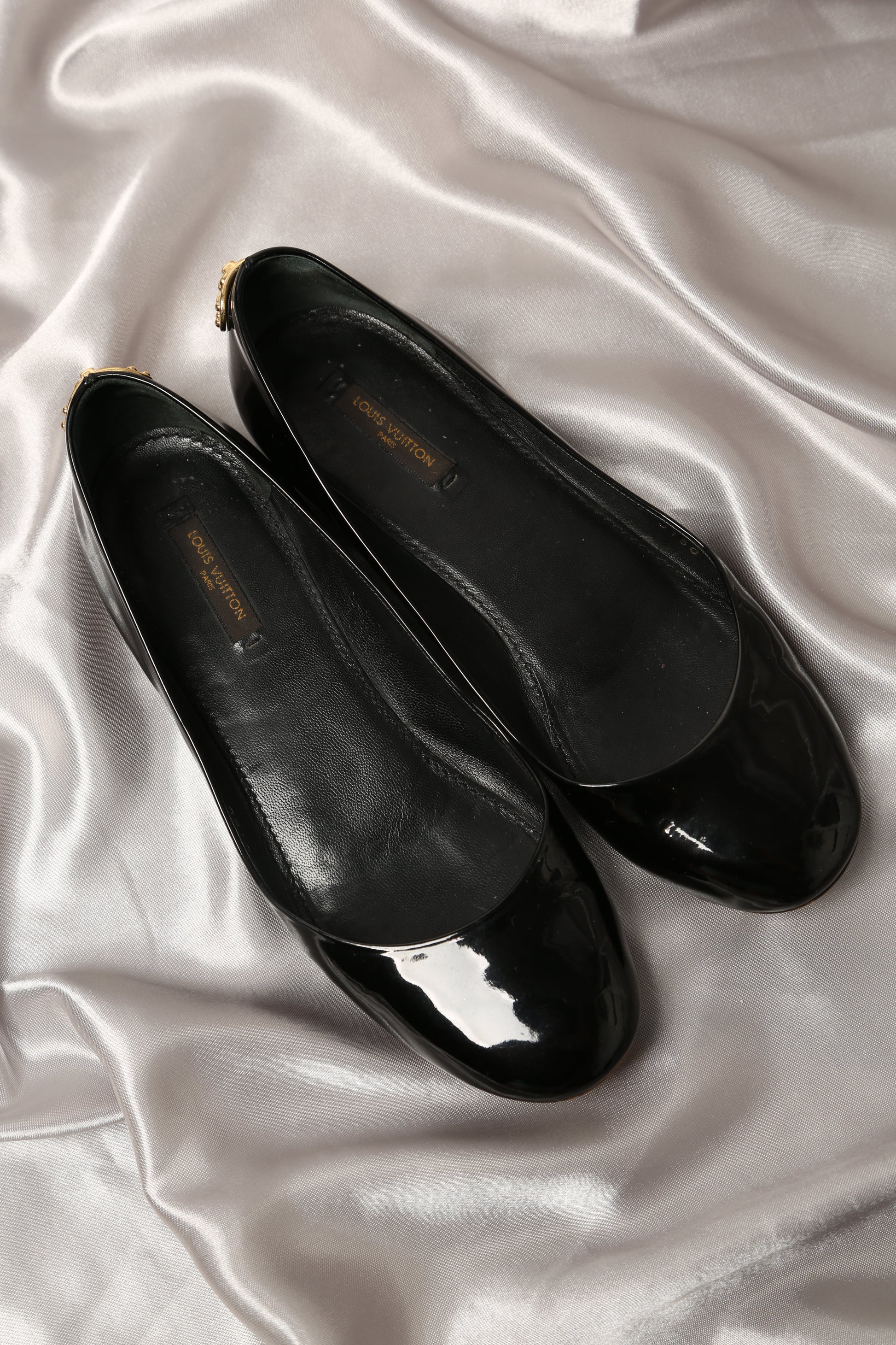 Louis Vuitton ballet flats. Crafted from patent leather with iconic LV gold padlock hardware detailing, they exude luxury. With rounded toes and classic style, these flats offer sophistication and comfort. While showing signs of wear on the soles, a cobbler can easily add protection to ensure their longevity.