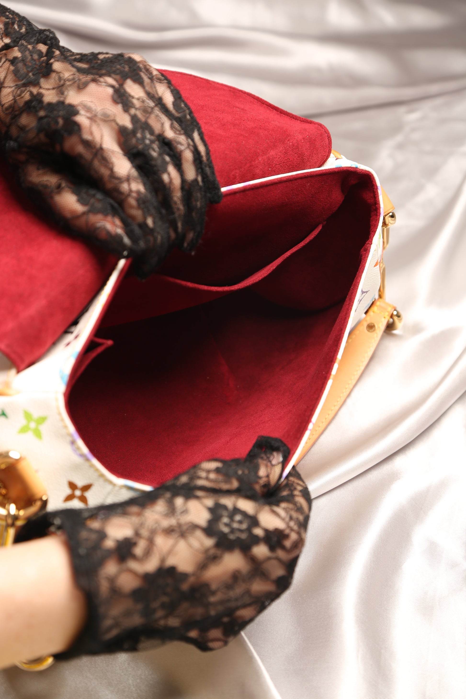Introduced in Spring 2003, Murakami reimagined the classic LV monogram into a vibrant, playful canvas using 33 silk-screened colors, making the Multicolor line an instant global sensation. This Beverly MM showcases that artistry on crisp white canvas, accented with luxurious vachetta leather, gold-tone studs, and a bold push-lock closure. The interior is lined in deep red Alcantara, offering both elegance and practicality, with enough space to comfortably hold all your daily essentials. A chain-link handle adds a touch of edge and effortless Y2K glamour — this bag truly stands out. Medium size — spacious and practical for everyday. Light wear on leather and hardware from gentle use