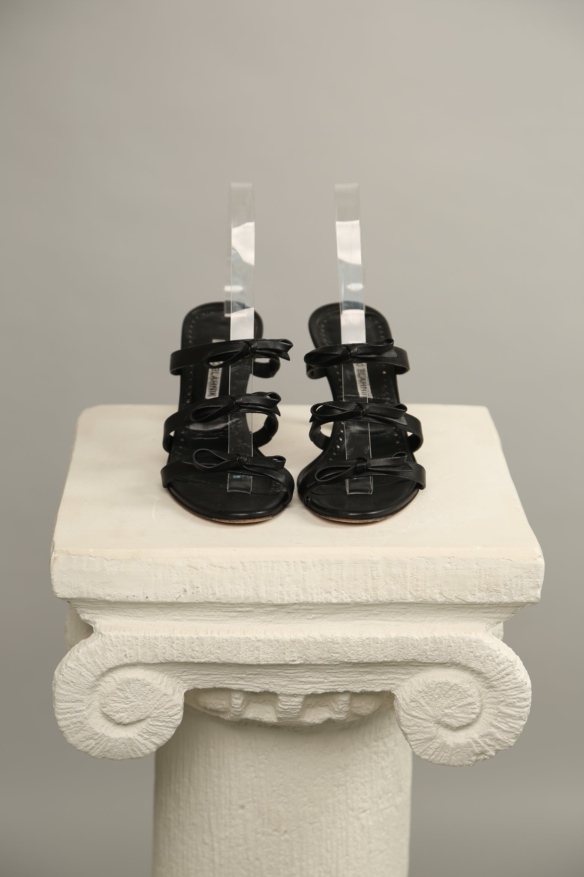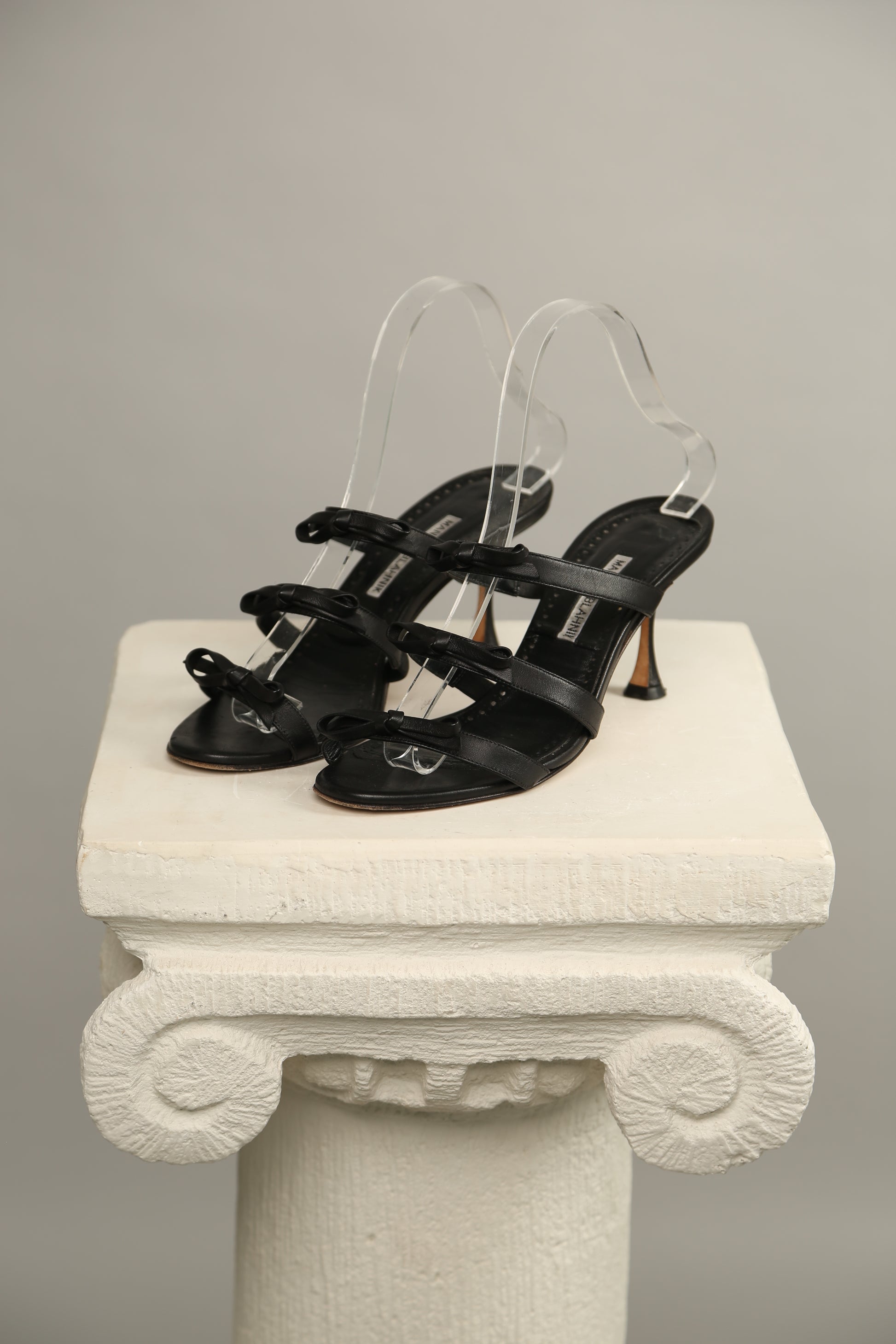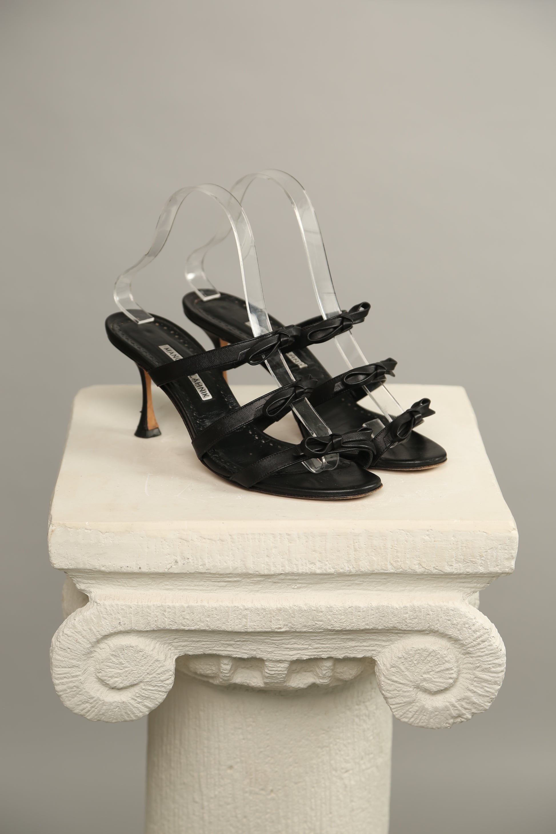 Elegant and timeless, these black leather Manolo Blahnik heels feature three delicate bow details for a feminine touch. Handcrafted in Italy with the signature Manolo quality. A classic silhouette that effortlessly transitions from day to night. Normal signs of wear on the heels and on the insole.