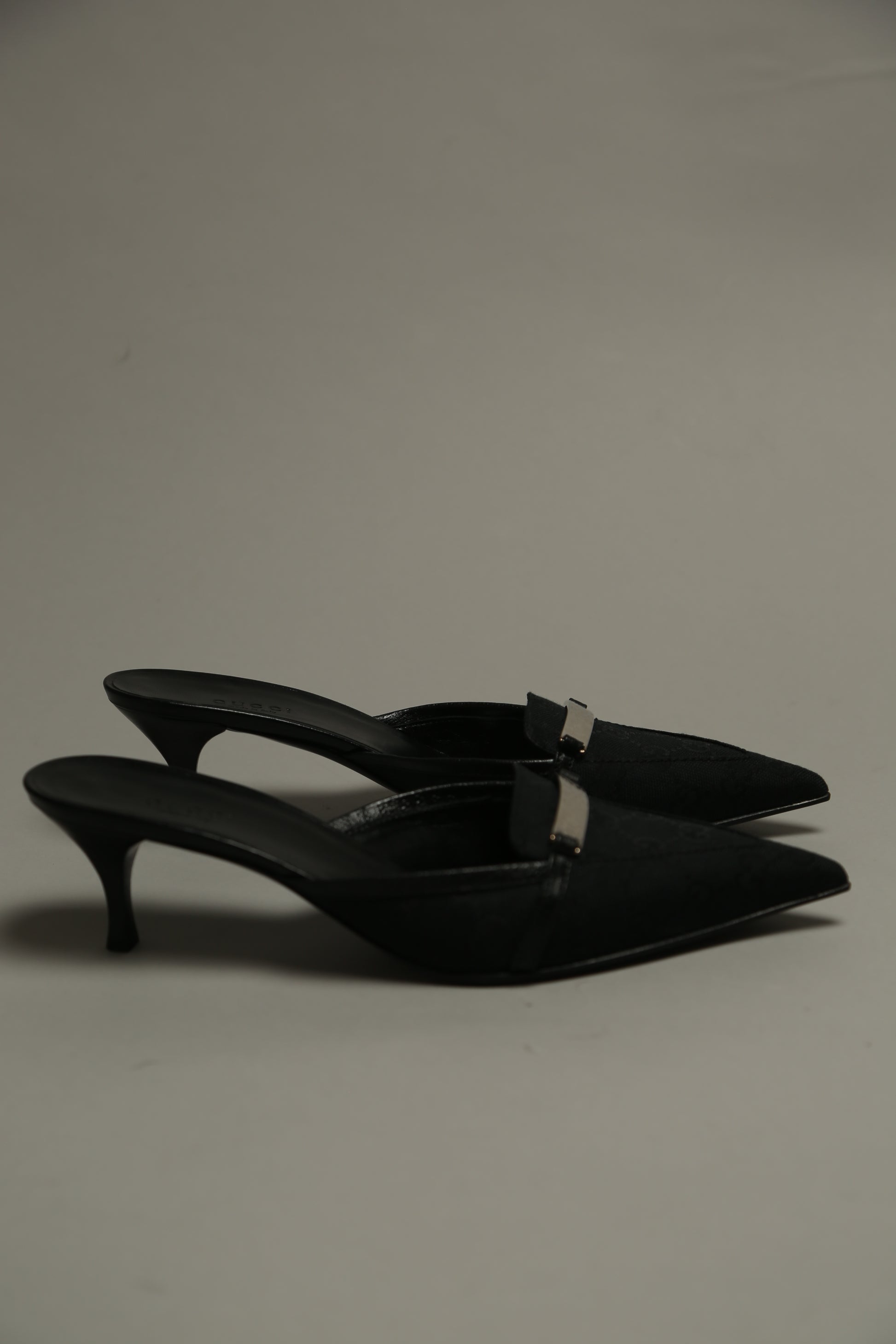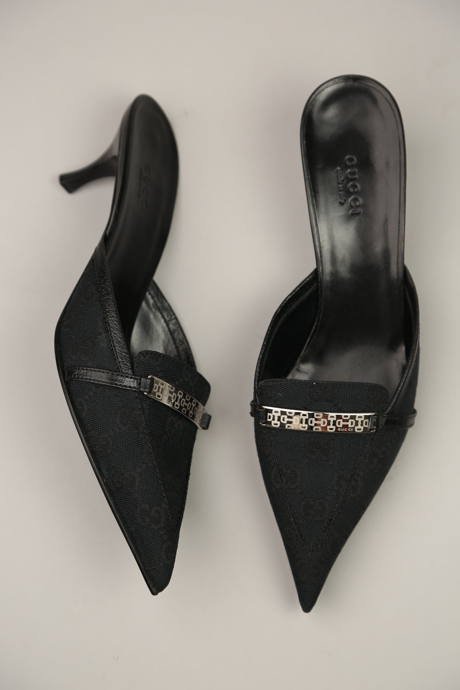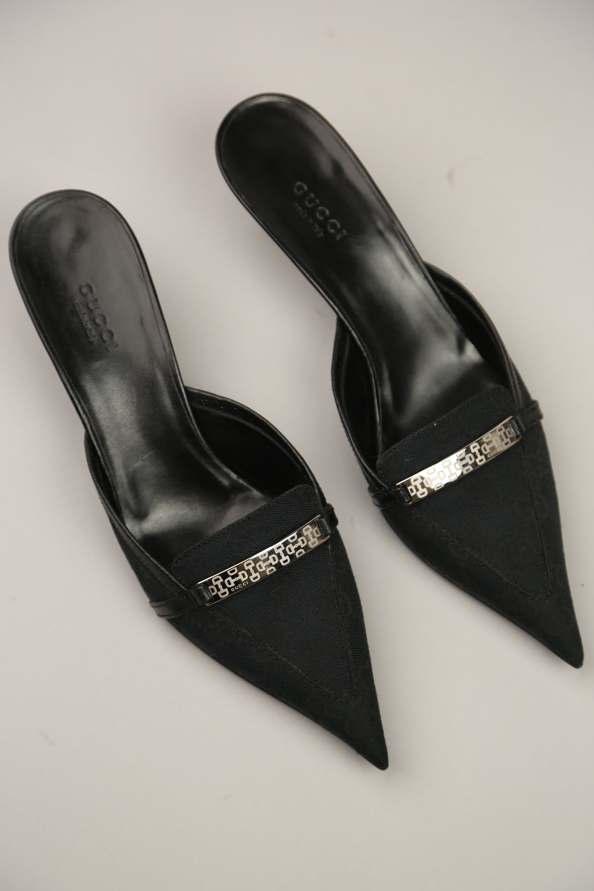 Such a major vintage find! This rare Y2K Gucci piece is not only trending again but is in new, never-worn condition—an incredible score for collectors and fashion lovers. These classic black pointed-toe Gucci heels feature the iconic GG canvas design, paired with sleek silver hardware stamped with Gucci branding. The silhouette is sharp, timeless, and effortlessly chic, making them the perfect blend of early-2000s nostalgia and modern elegance.