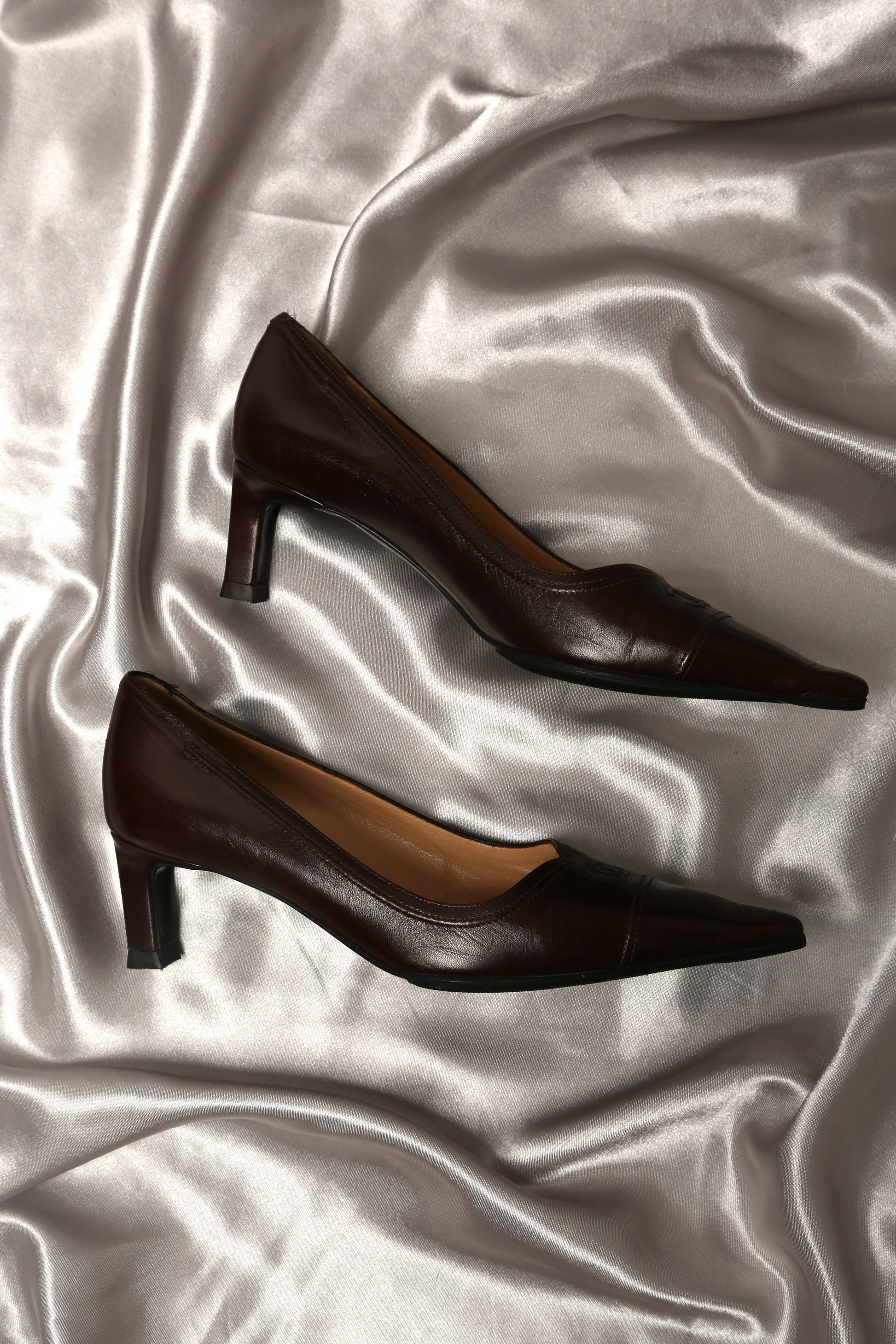 Dark brown Chanel pointed-toe pumps, featuring iconic CC logos for an extra touch of elegance. Crafted from the softest lambskin leather, with leather insoles, these iconic shoes have a unique vintage character. A timeless piece that never goes out of style.