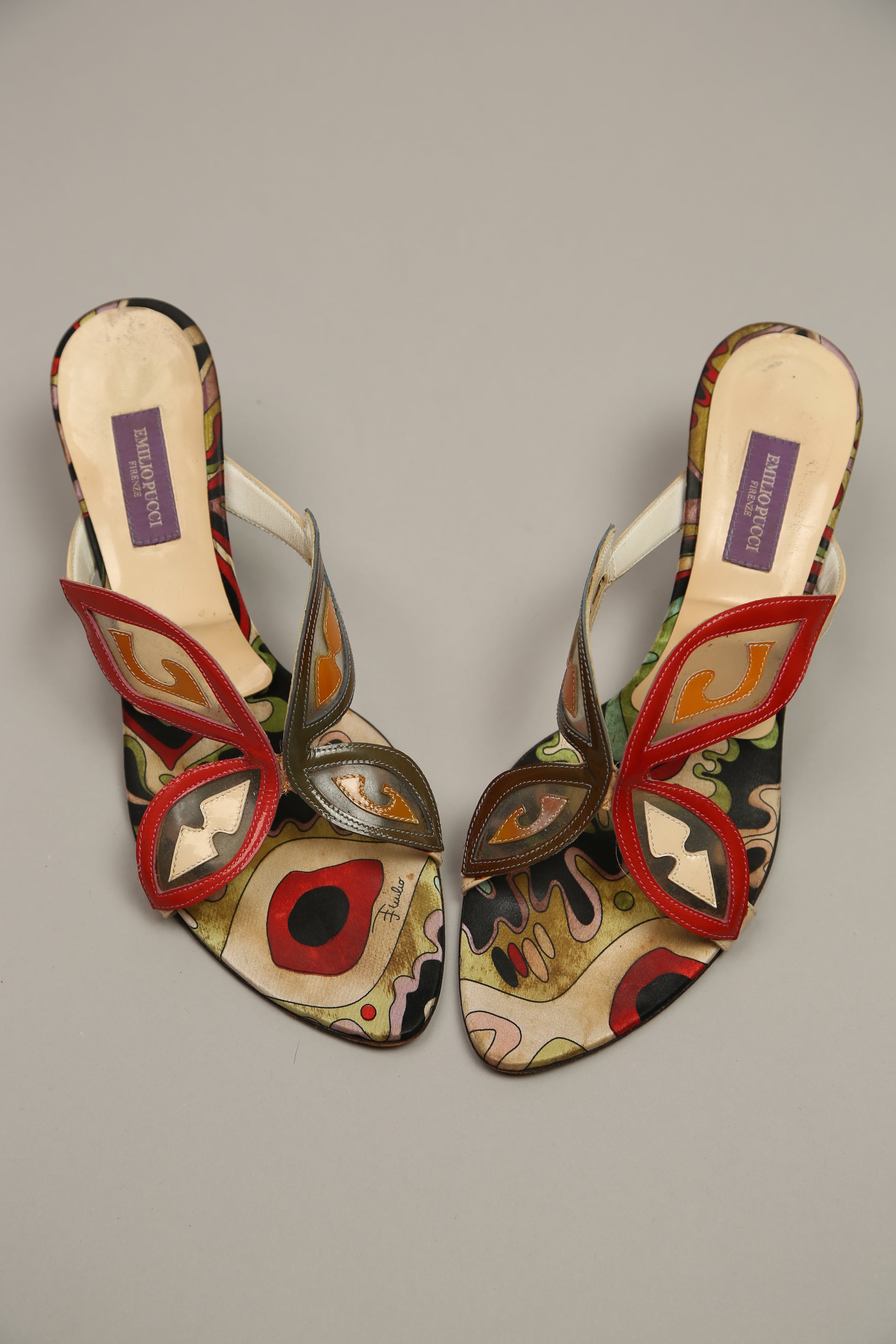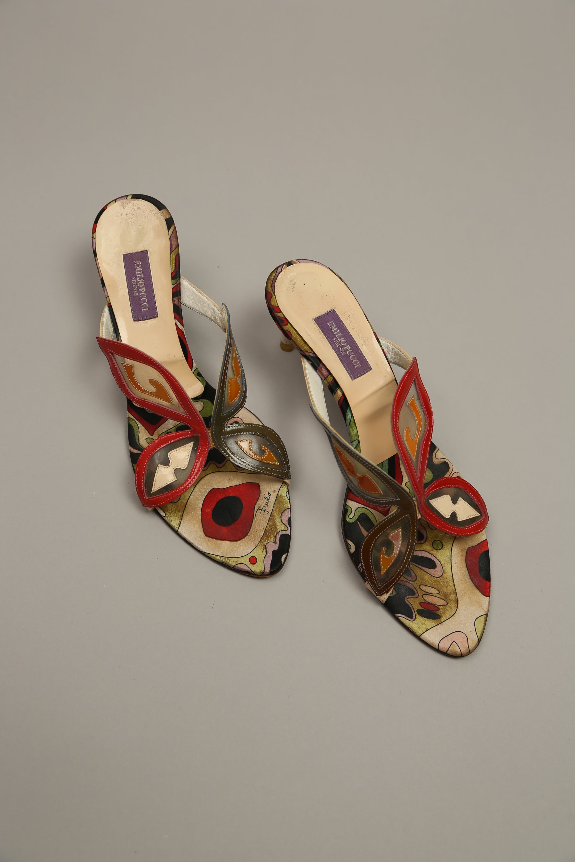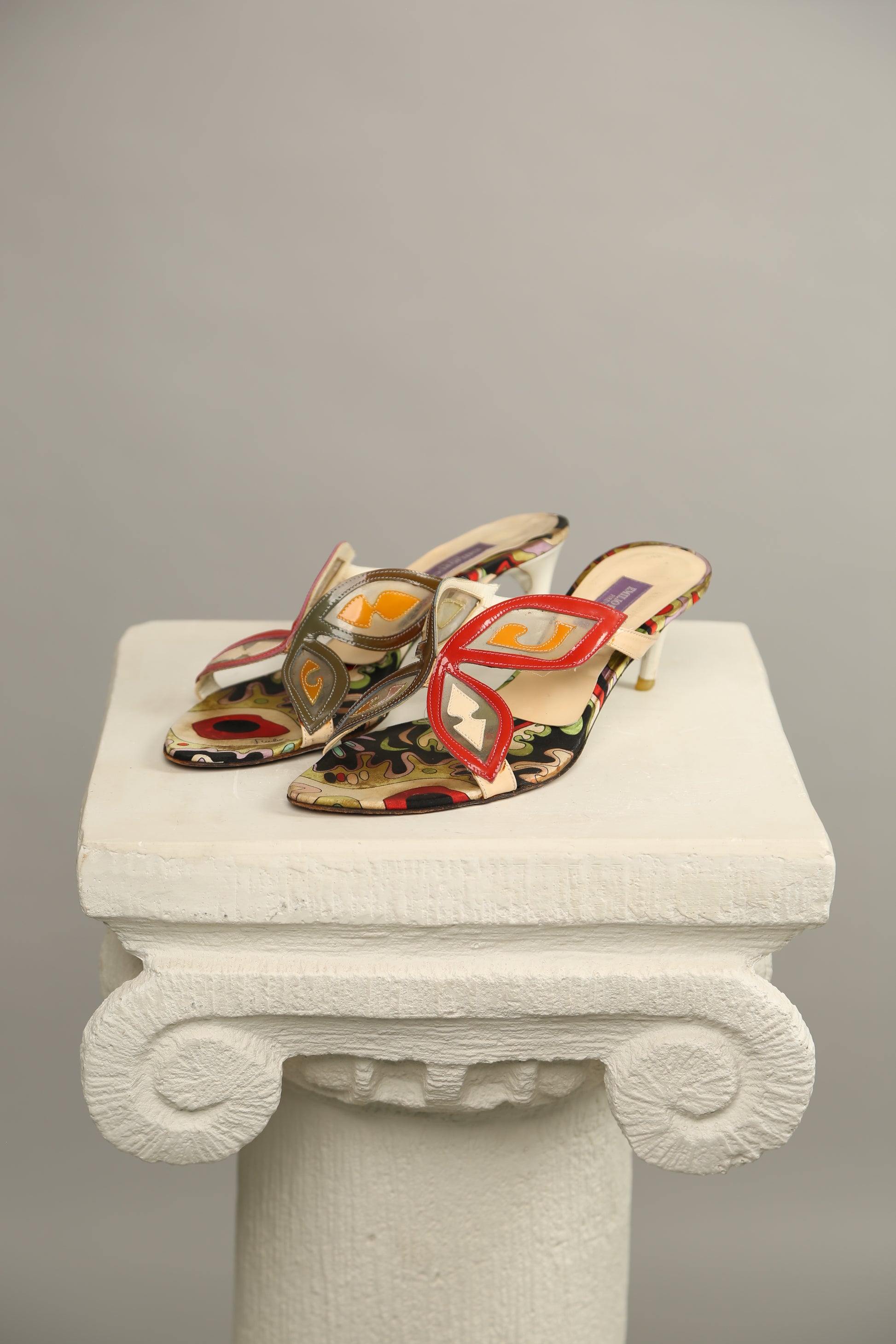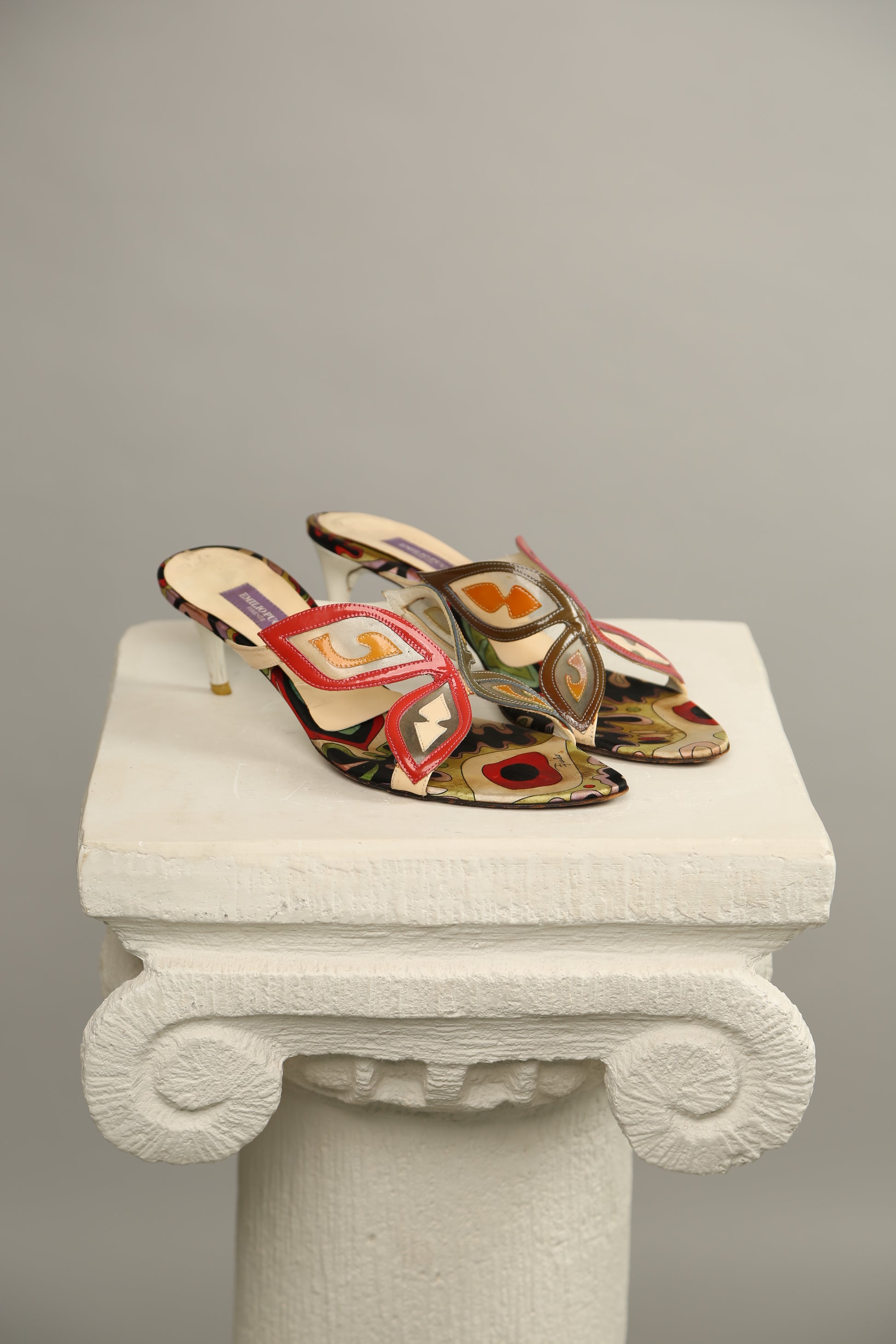 Step into bold vintage glamour with these rare Emilio Pucci butterfly kitten heels. Featuring vibrant multicolor leather appliqué and signature Pucci print, these heels are a wearable piece of art. Signs of wear on the interior, heels, and sole—priced accordingly. A must-have for any Pucci collector.