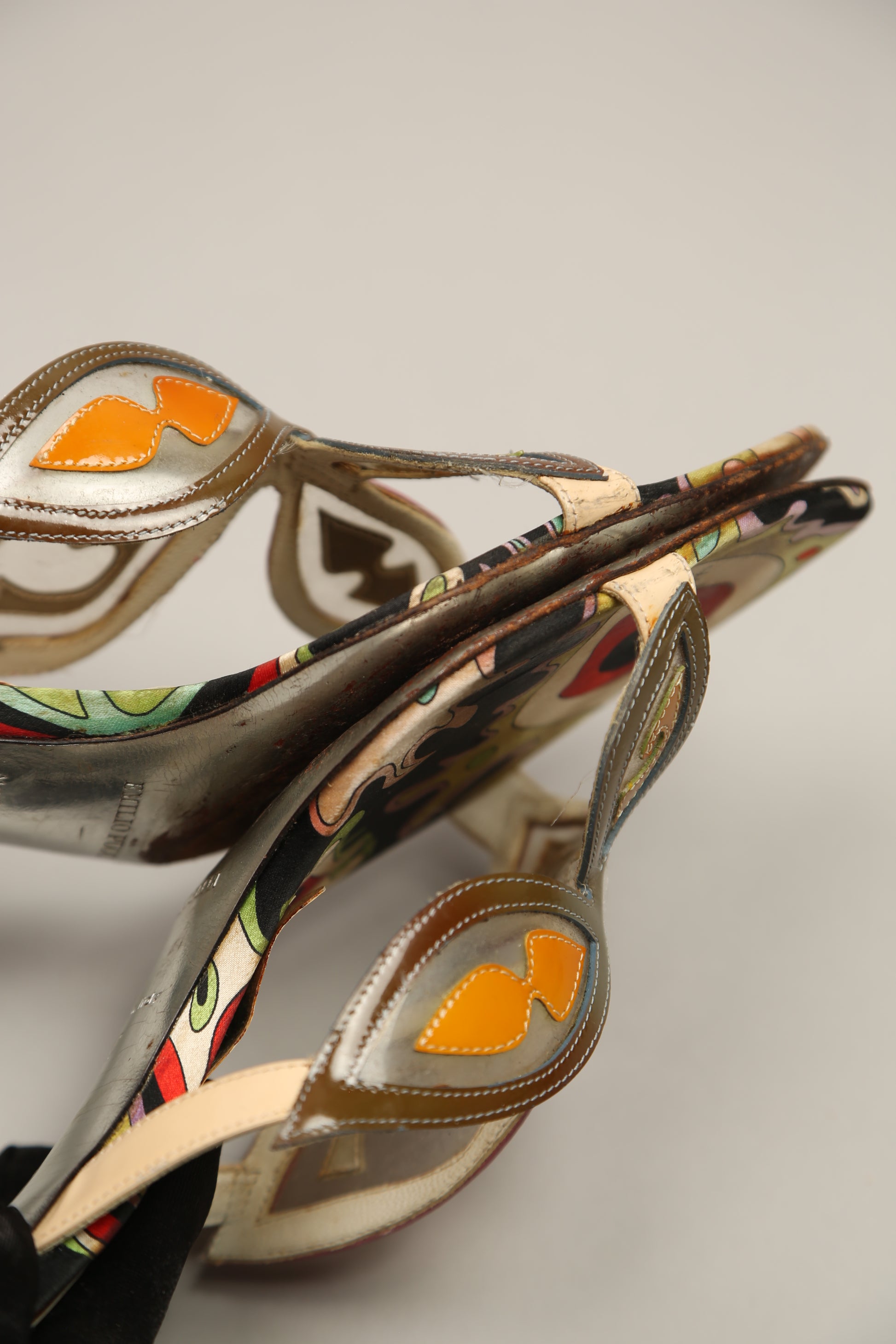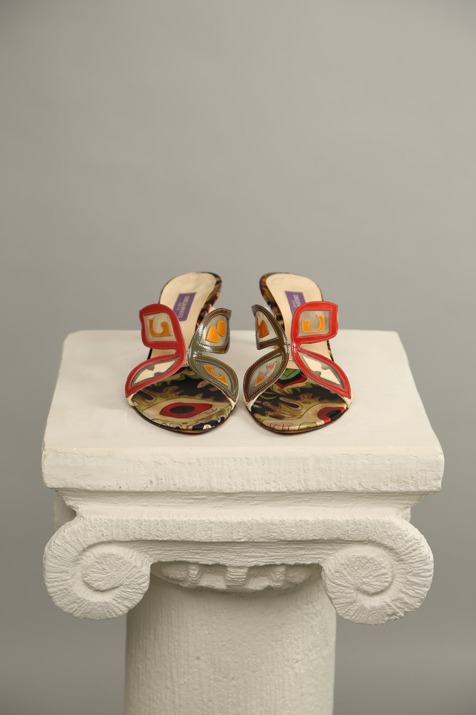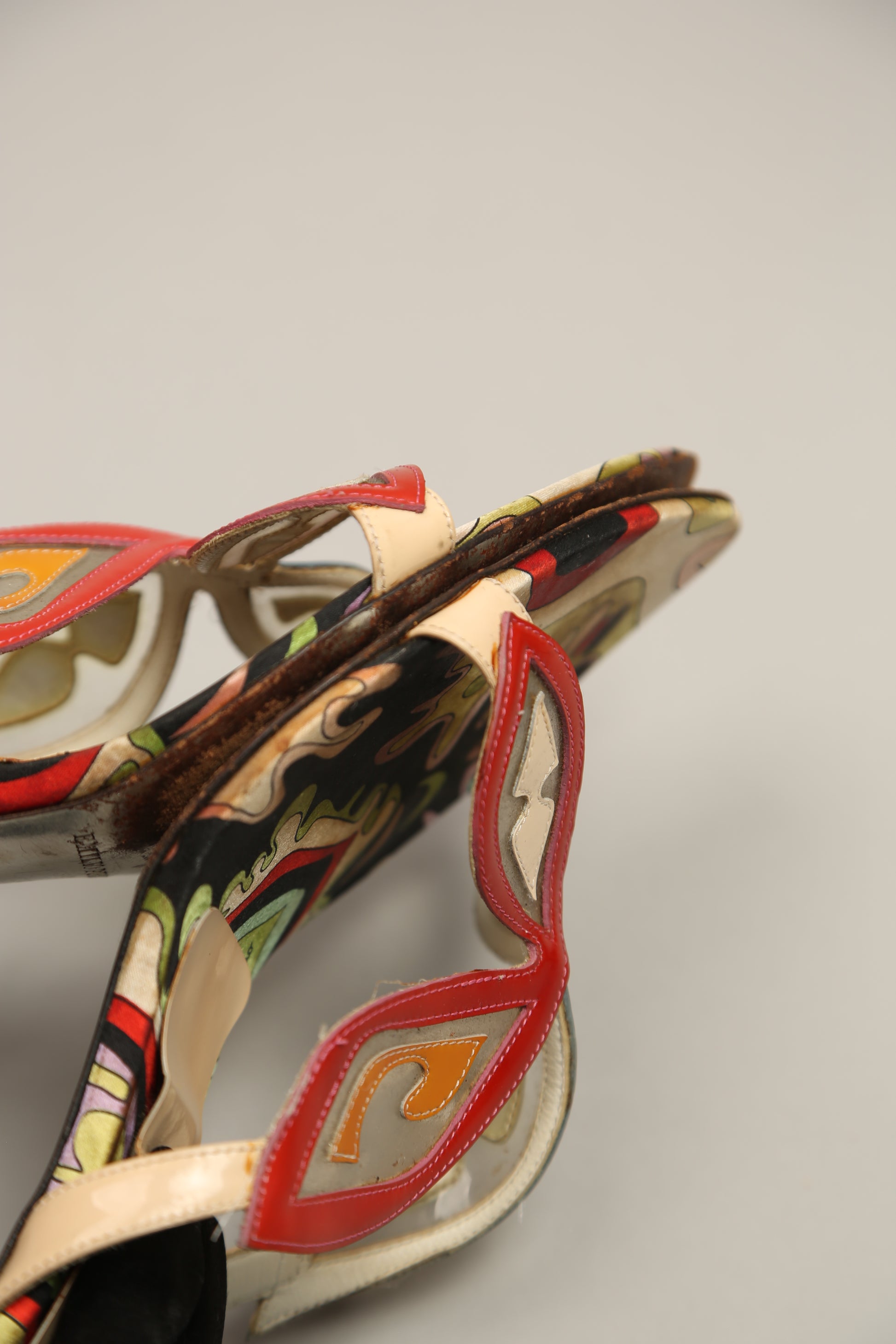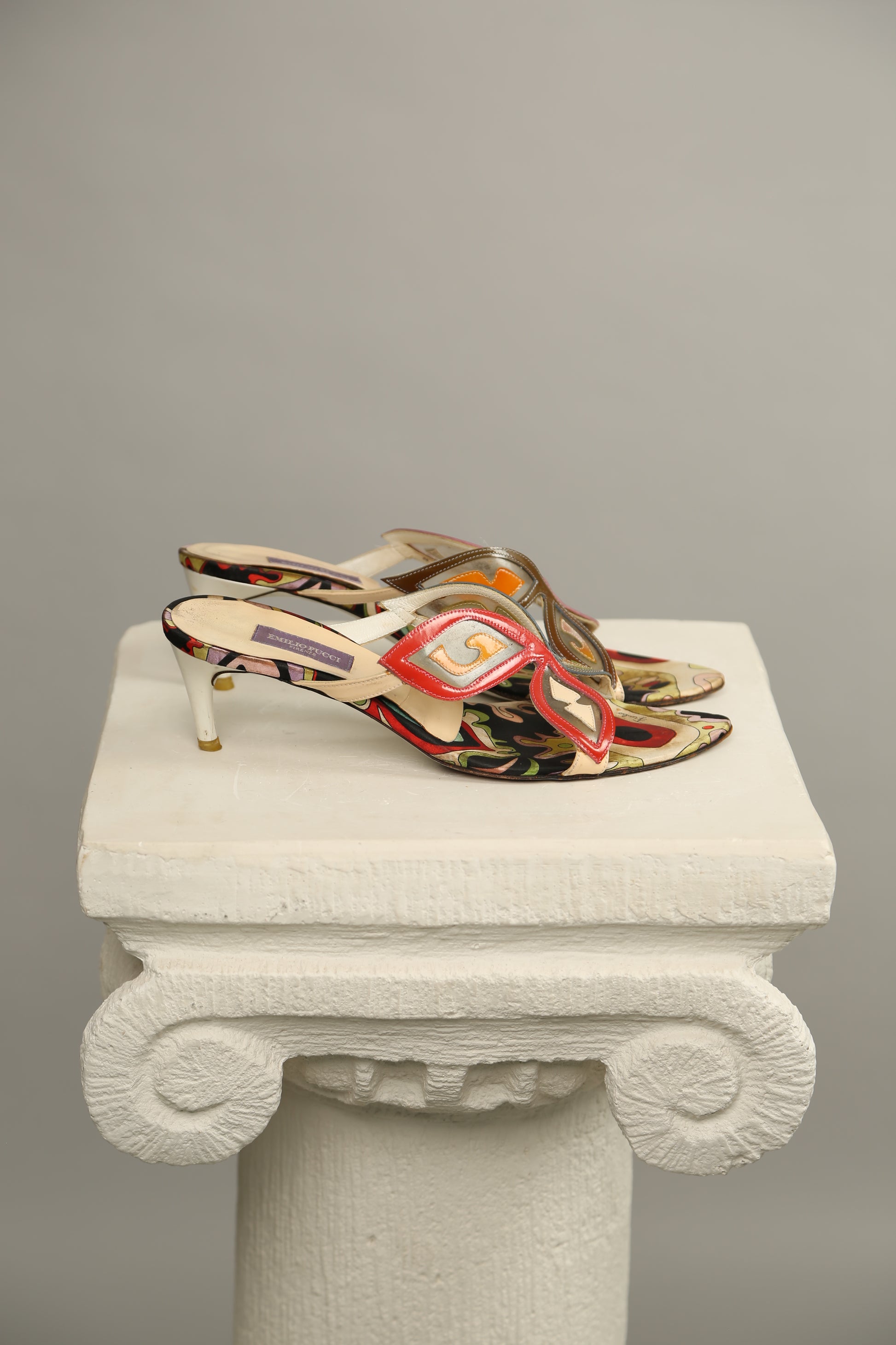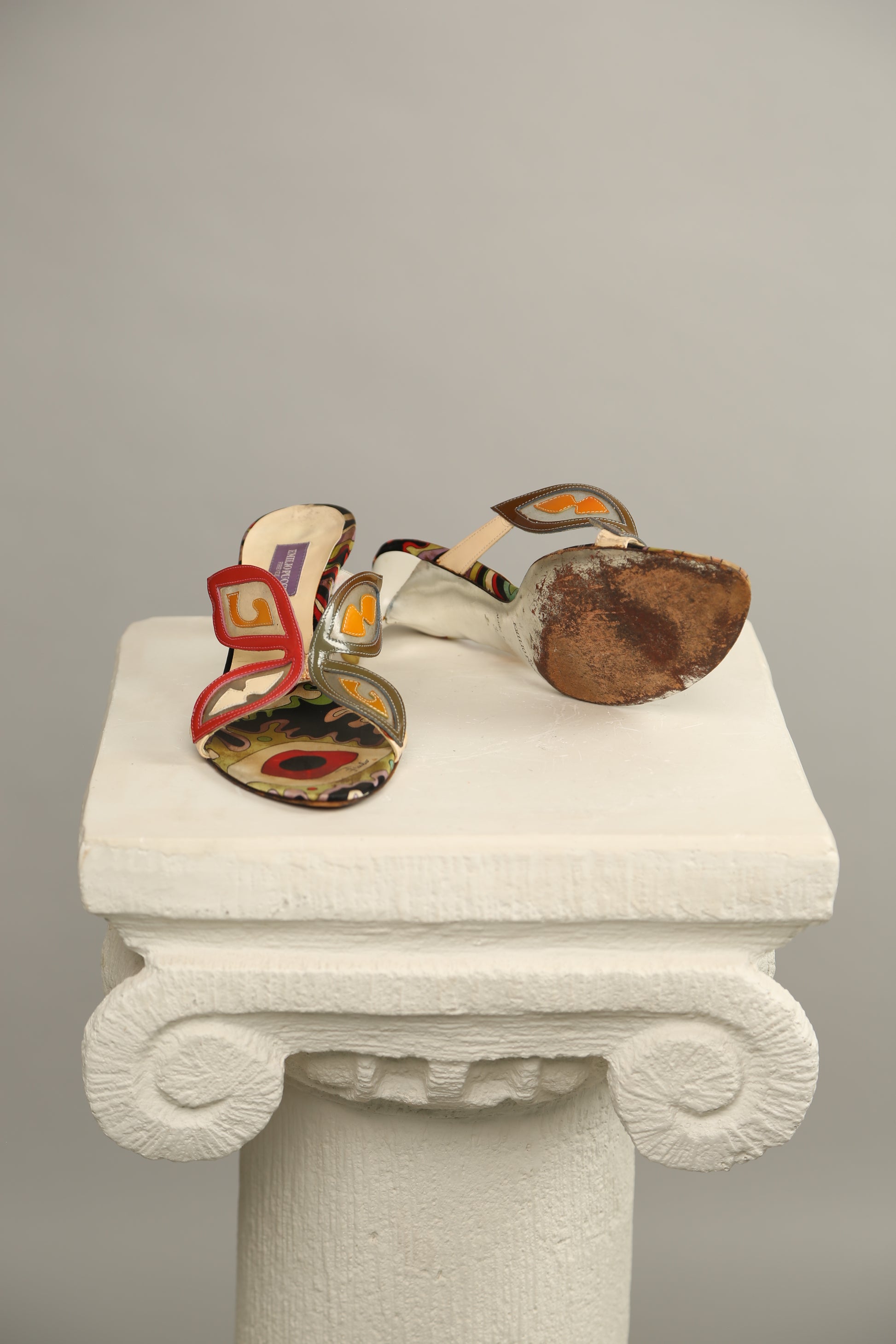 Step into bold vintage glamour with these rare Emilio Pucci butterfly kitten heels. Featuring vibrant multicolor leather appliqué and signature Pucci print, these heels are a wearable piece of art. Signs of wear on the interior, heels, and sole—priced accordingly. A must-have for any Pucci collector.