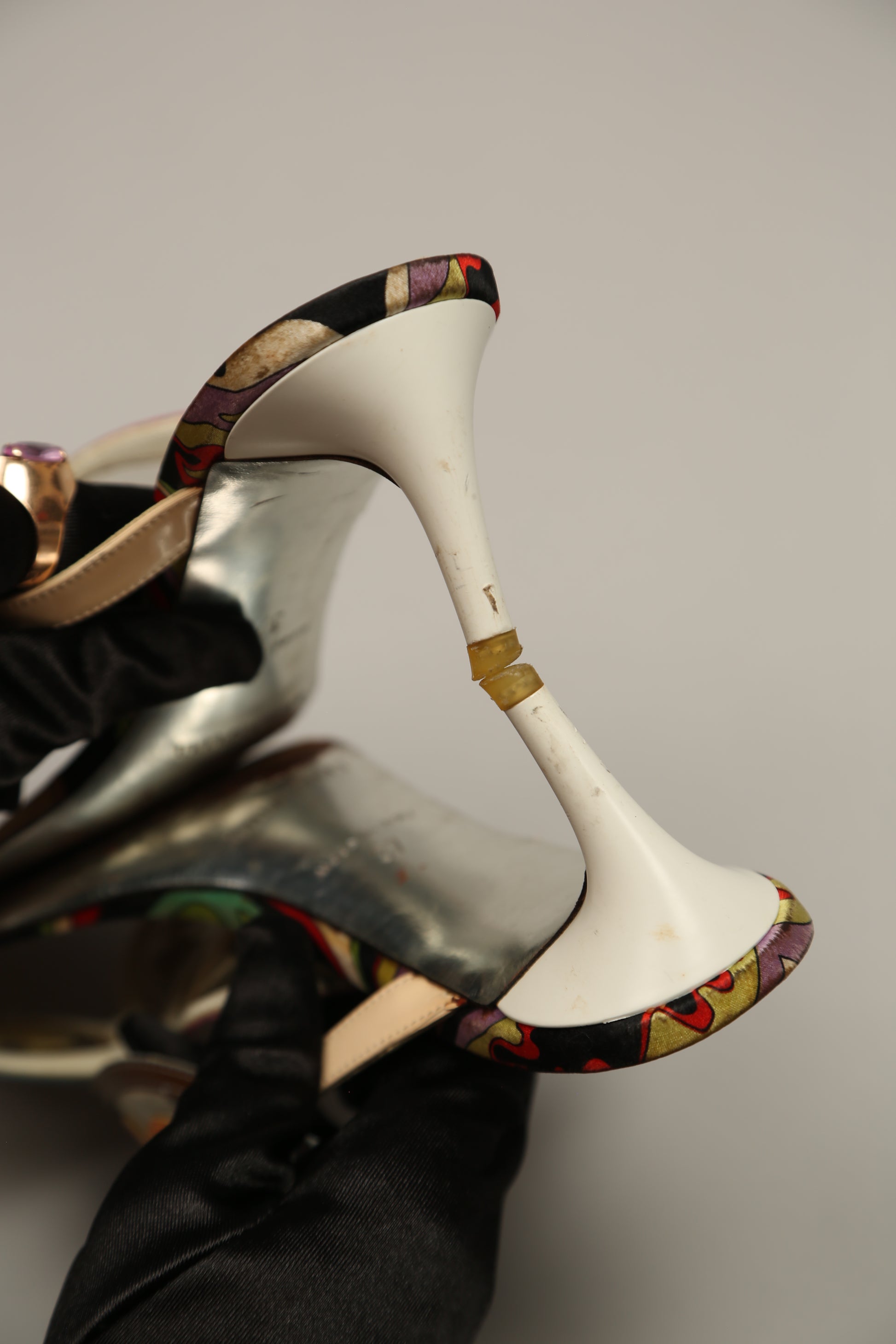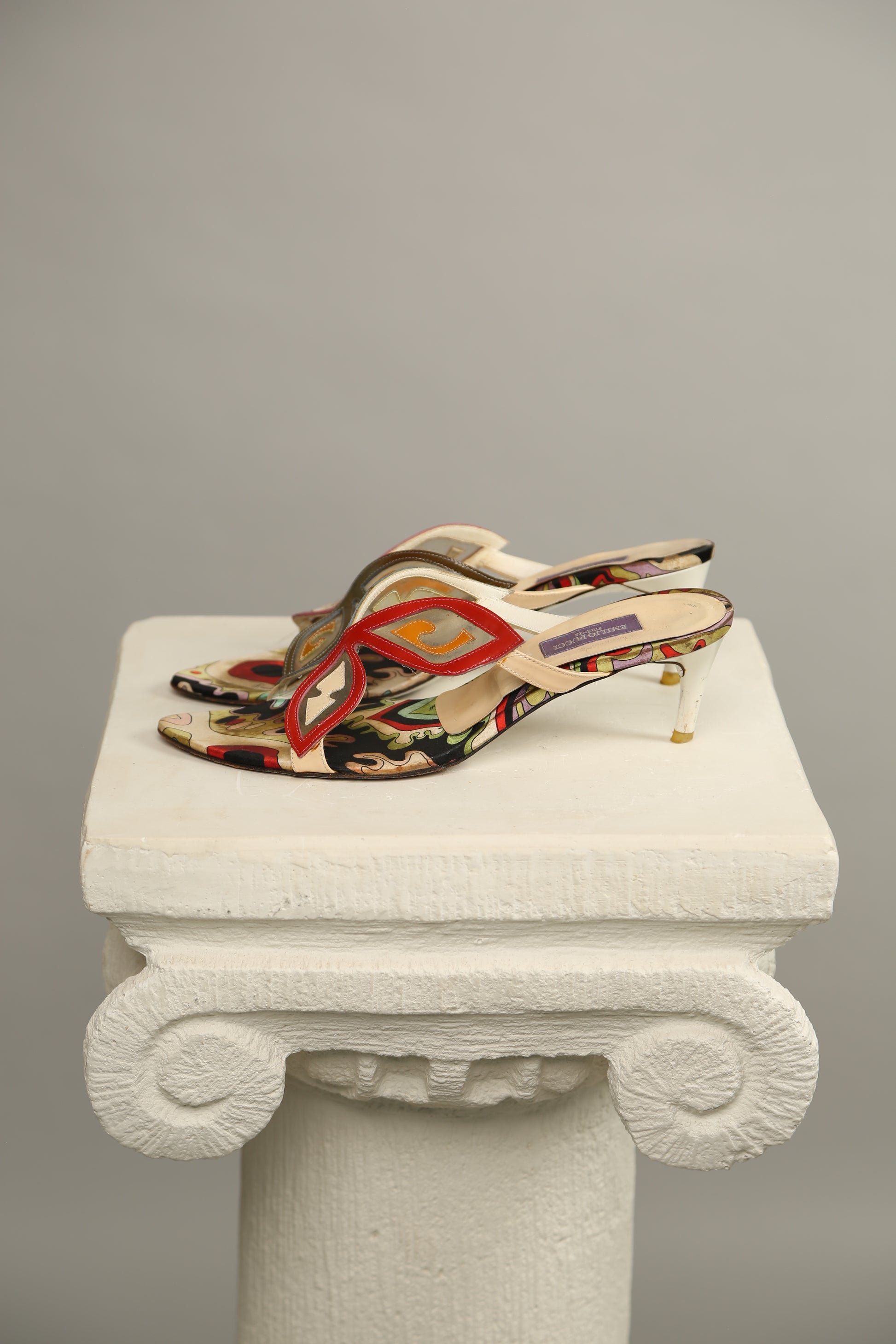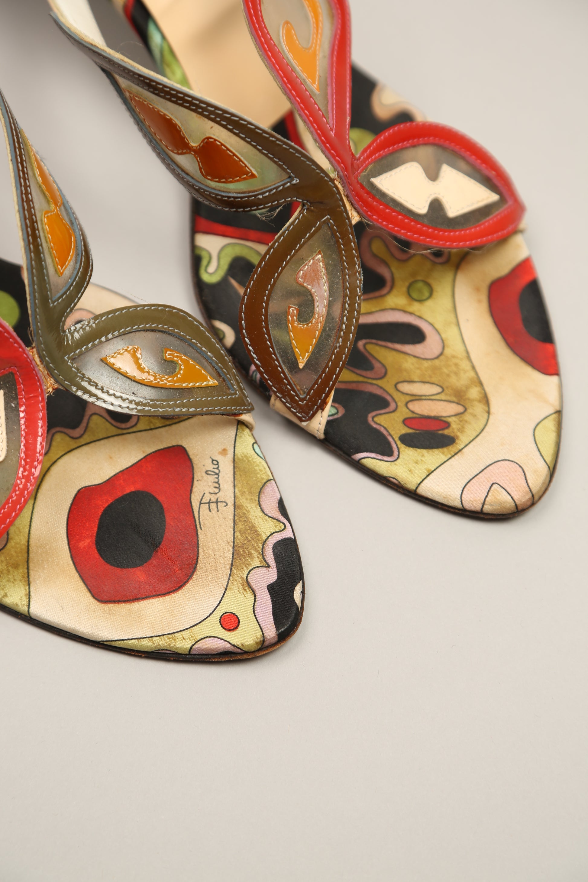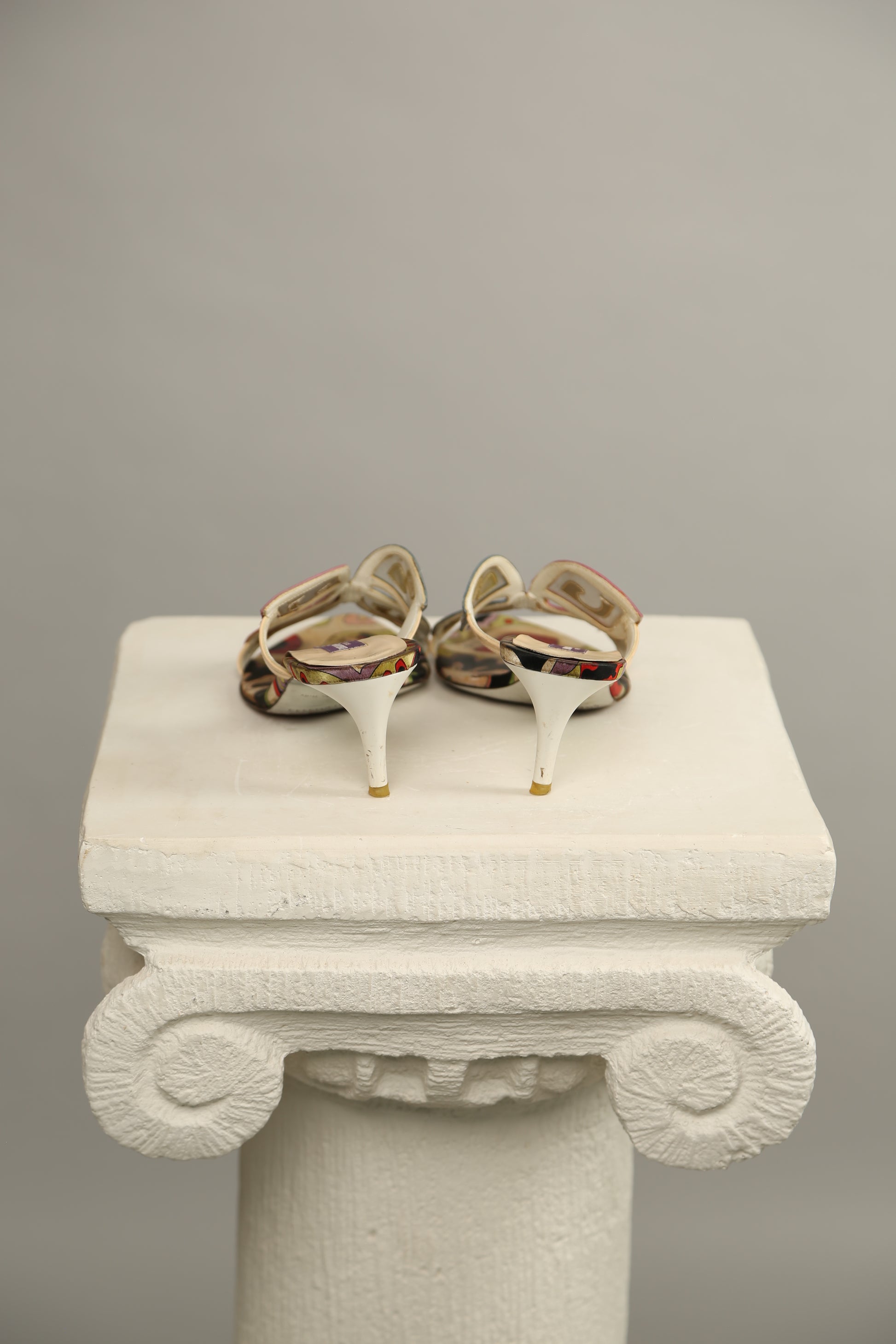 Step into bold vintage glamour with these rare Emilio Pucci butterfly kitten heels. Featuring vibrant multicolor leather appliqué and signature Pucci print, these heels are a wearable piece of art. Signs of wear on the interior, heels, and sole—priced accordingly. A must-have for any Pucci collector.
