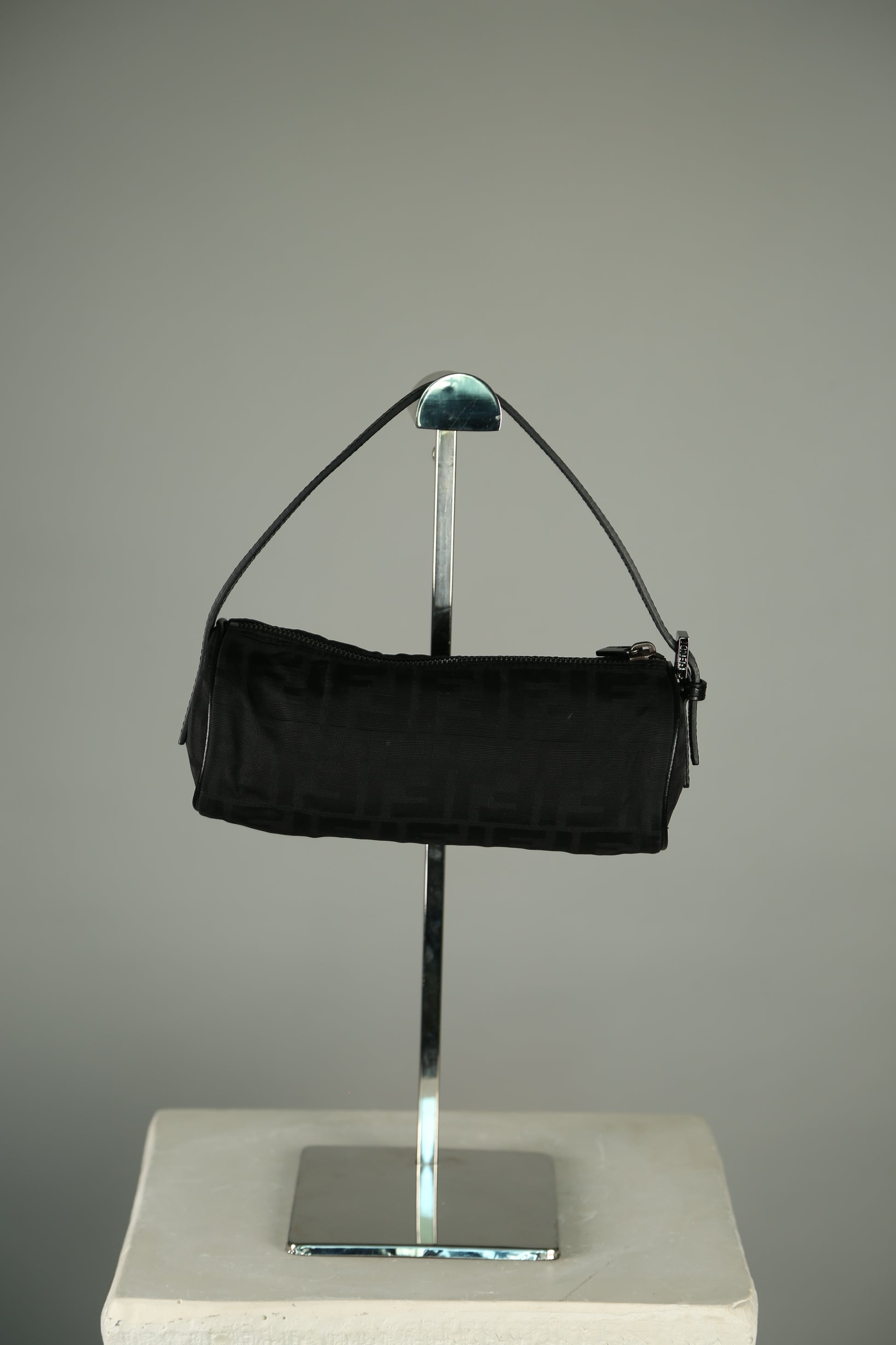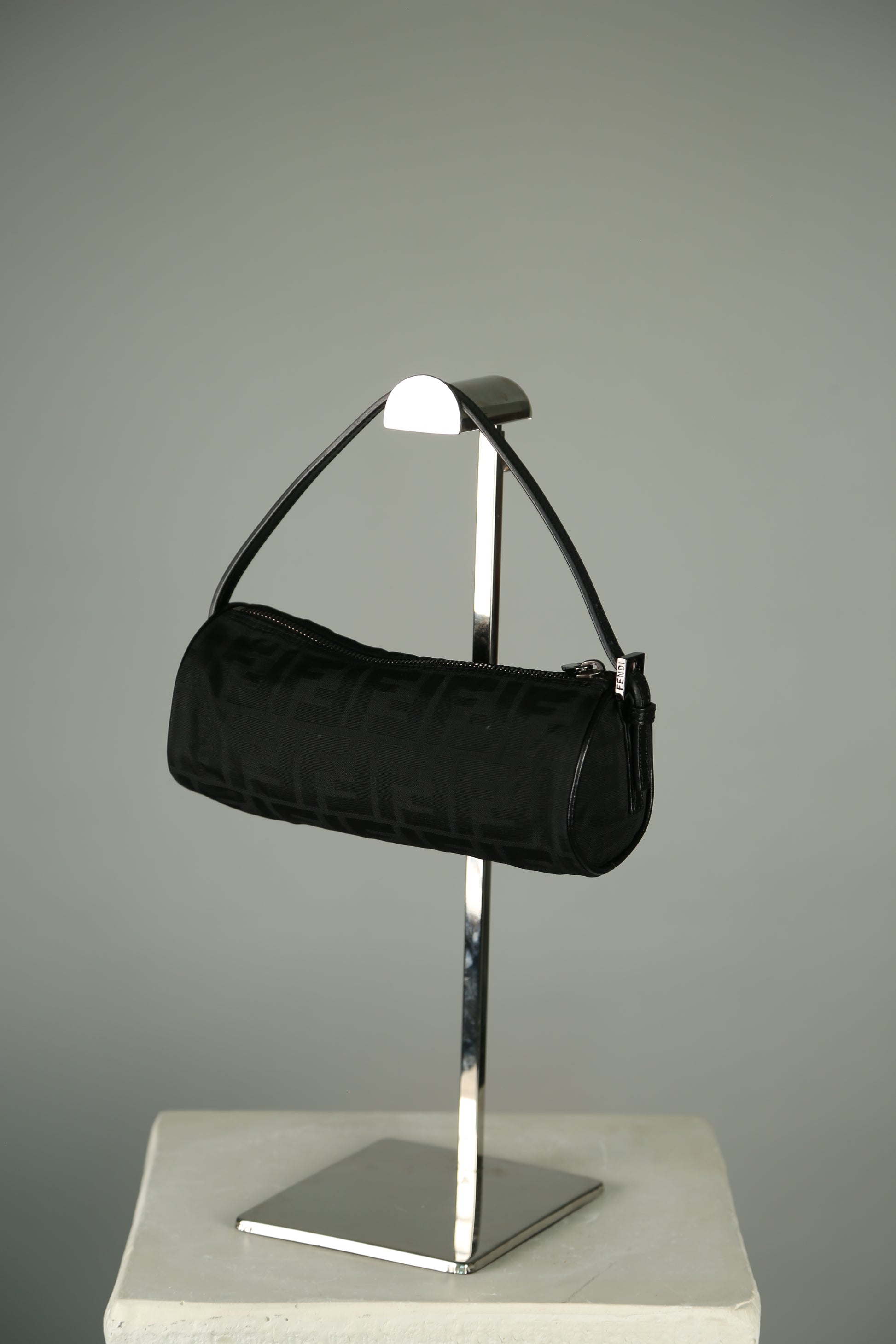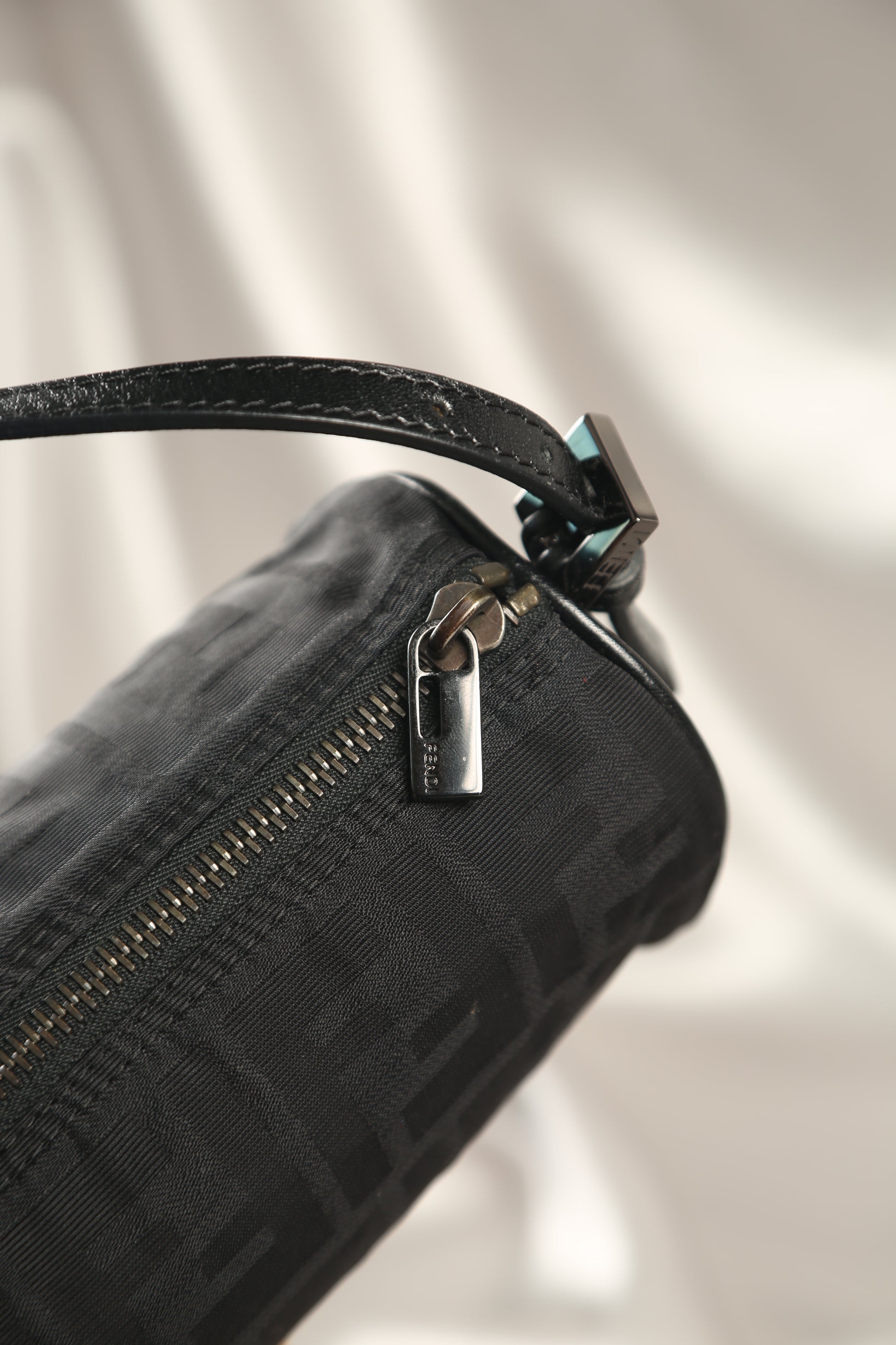 A rare and highly sought-after Fendi barrel bag, crafted in black nylon featuring the iconic Zucca FF monogram. Finished with smooth black leather piping and an adjustable flat leather strap, this piece blends minimalism with unmistakable Fendi heritage. The cylindrical silhouette makes it modern and sleek, while the black-on-black palette keeps it versatile for any outfit—from everyday casual to elevated evening looks. Black gunmetal hardware and a top zipper pull complete the understated yet luxurious aesthetic. Normal signs of wear. Dress it up or down. Effortlessly chic—perfect for daily use or as a subtle statement piece.