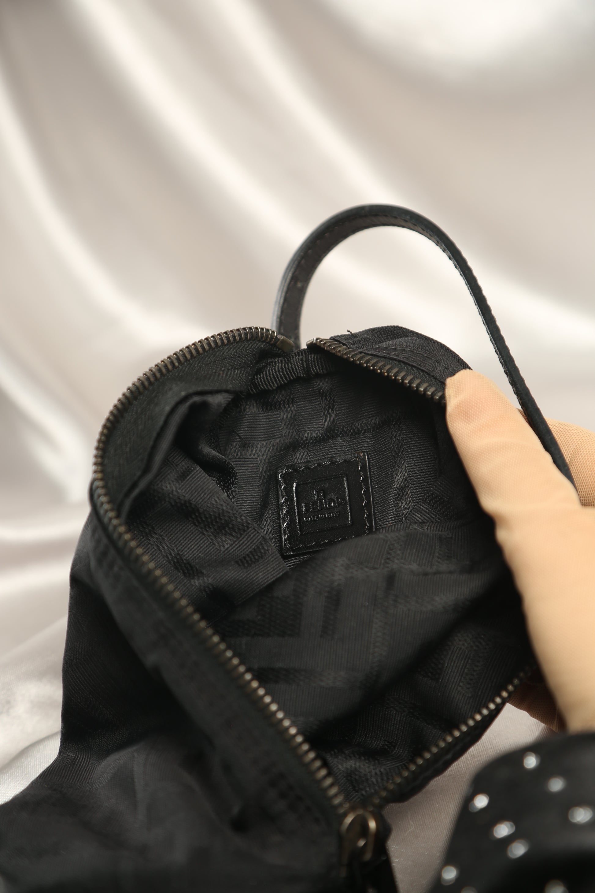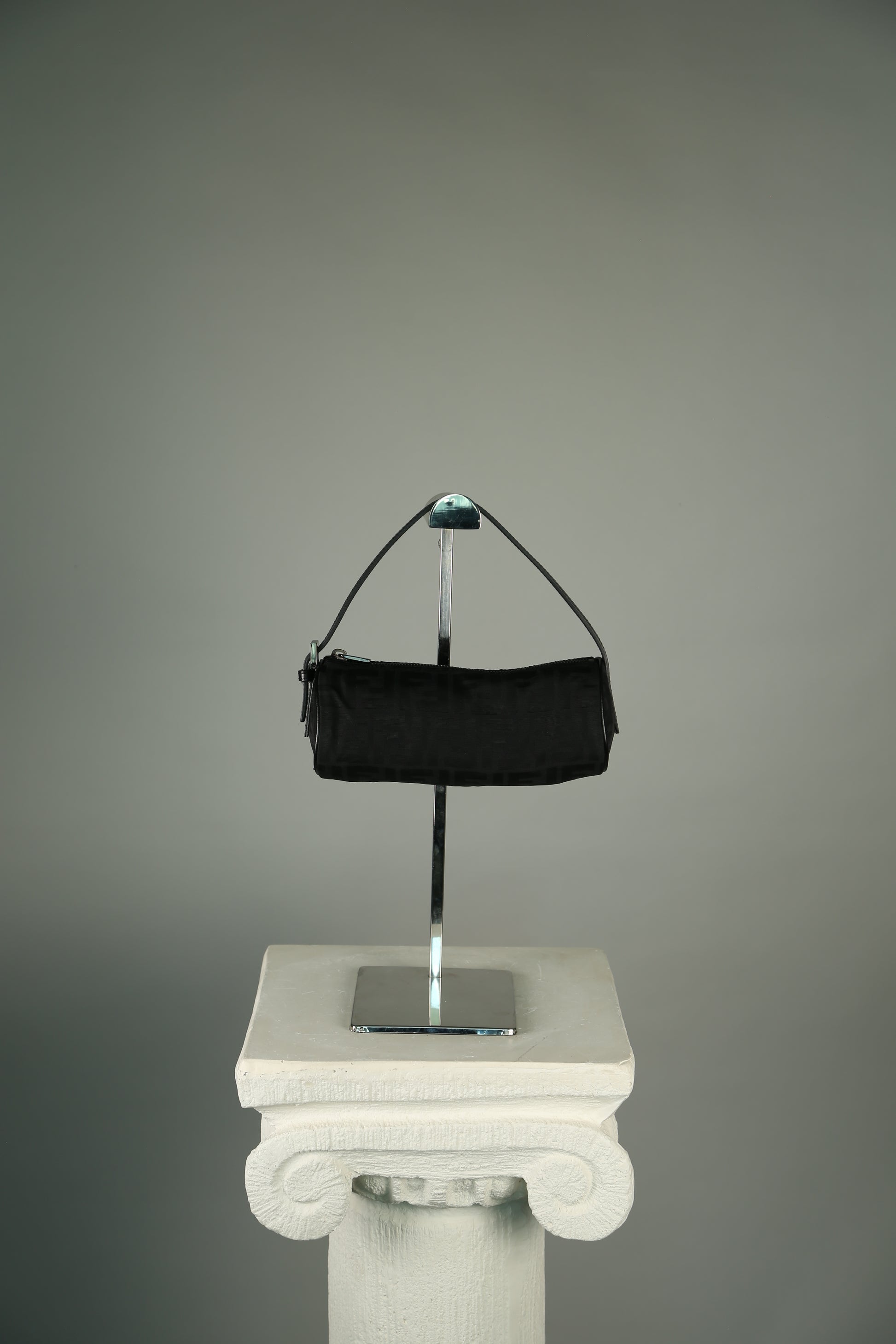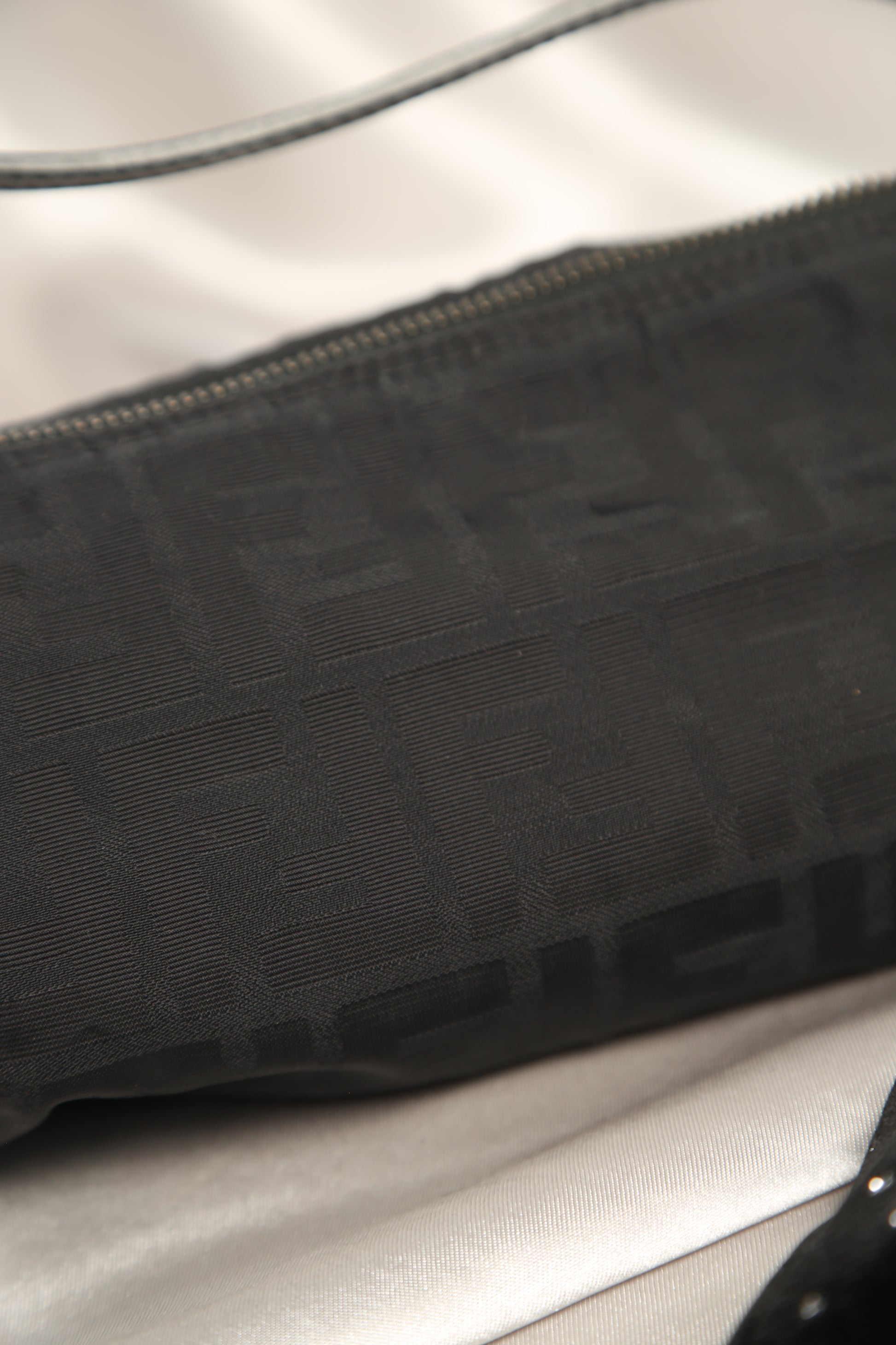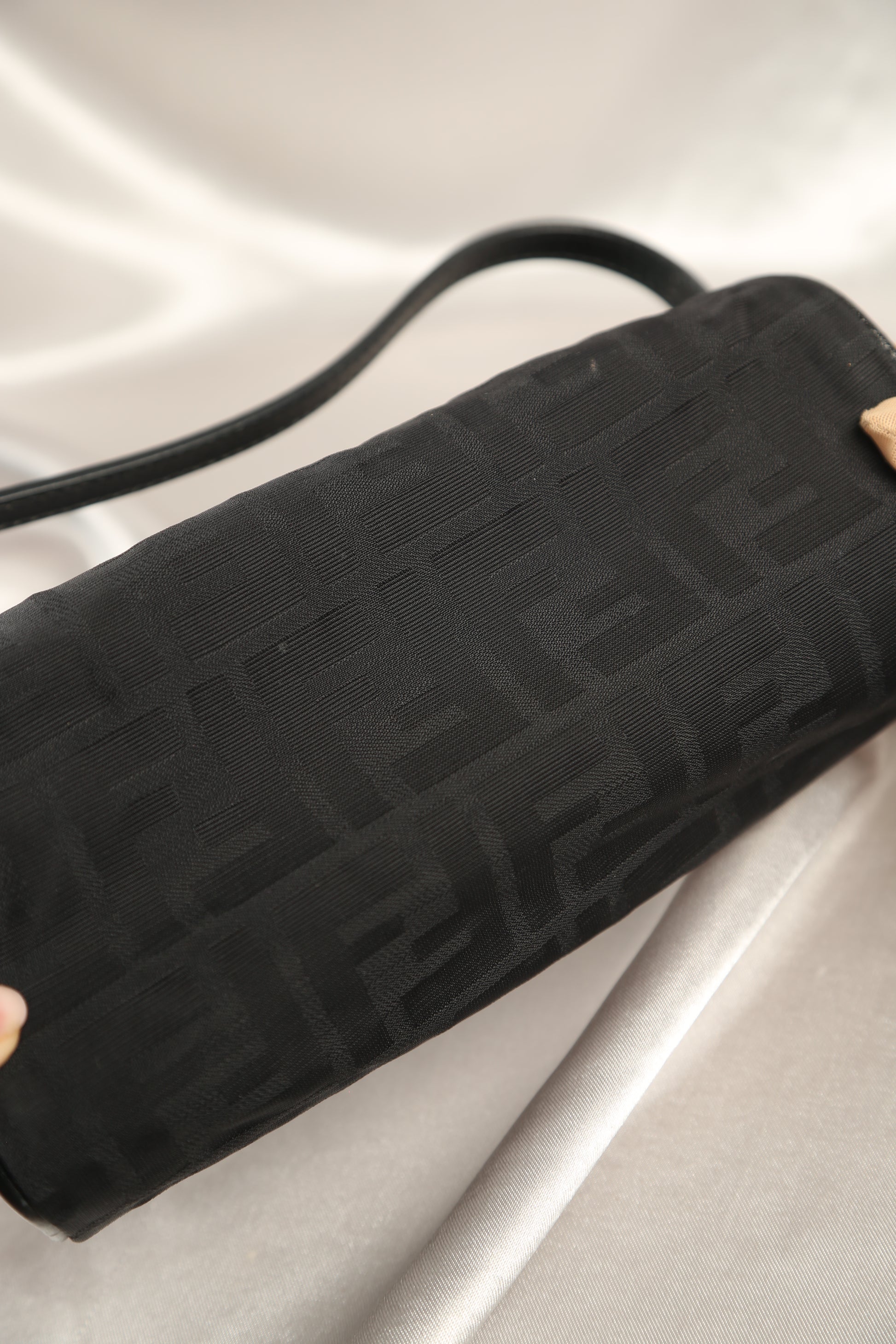 A rare and highly sought-after Fendi barrel bag, crafted in black nylon featuring the iconic Zucca FF monogram. Finished with smooth black leather piping and an adjustable flat leather strap, this piece blends minimalism with unmistakable Fendi heritage. The cylindrical silhouette makes it modern and sleek, while the black-on-black palette keeps it versatile for any outfit—from everyday casual to elevated evening looks. Black gunmetal hardware and a top zipper pull complete the understated yet luxurious aesthetic. Normal signs of wear. Dress it up or down. Effortlessly chic—perfect for daily use or as a subtle statement piece.