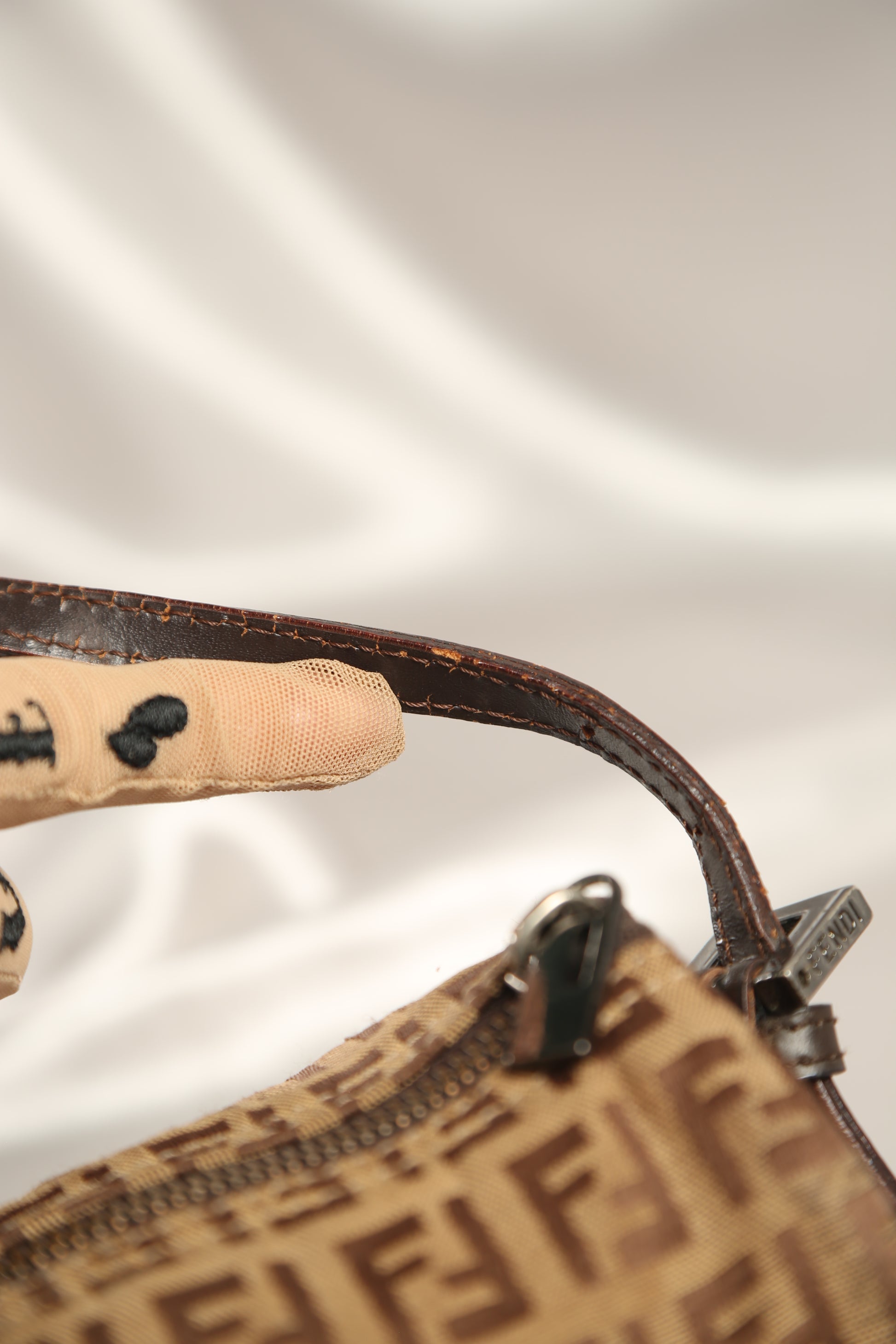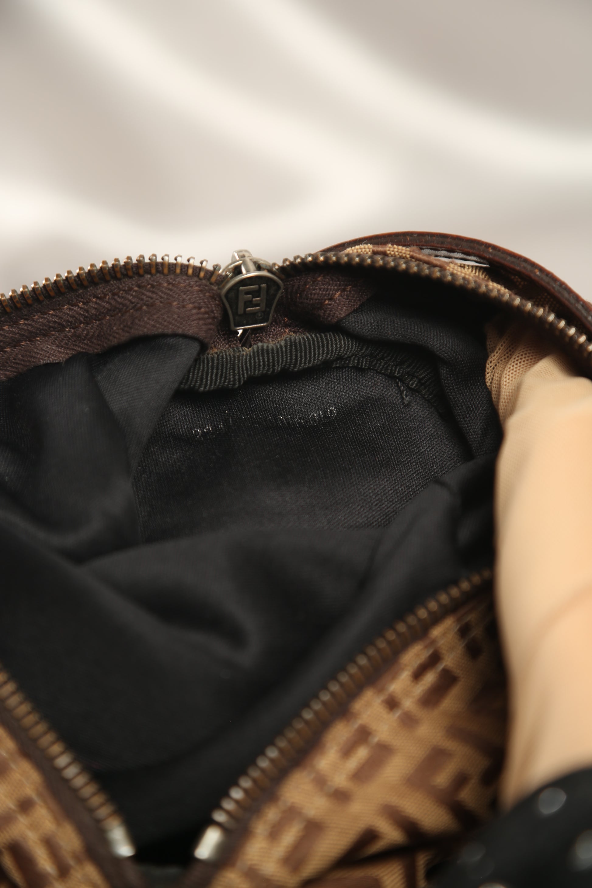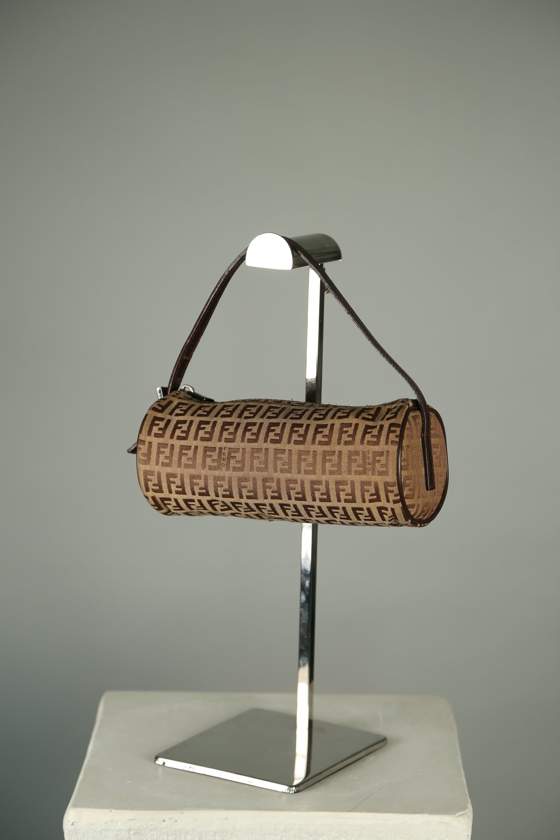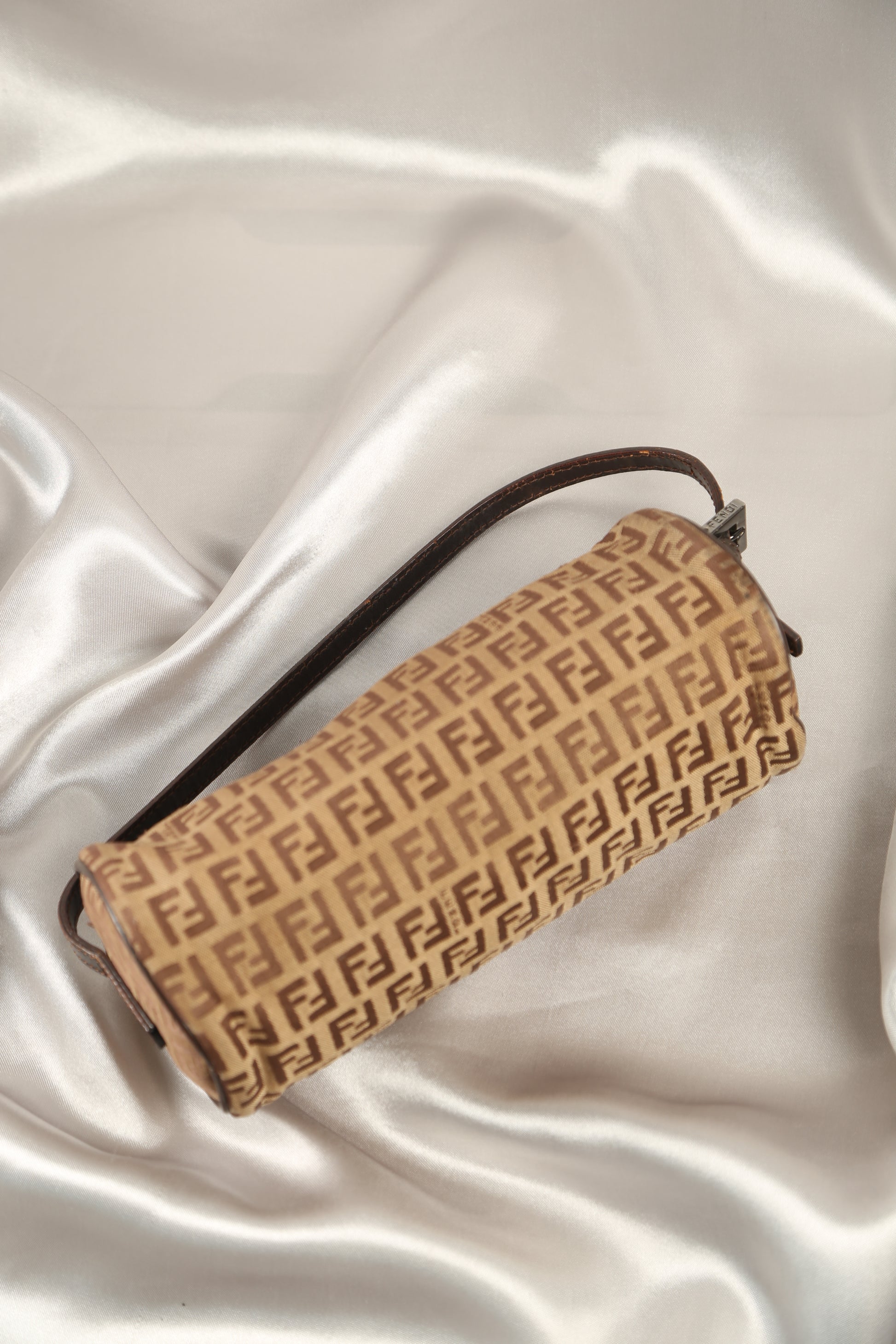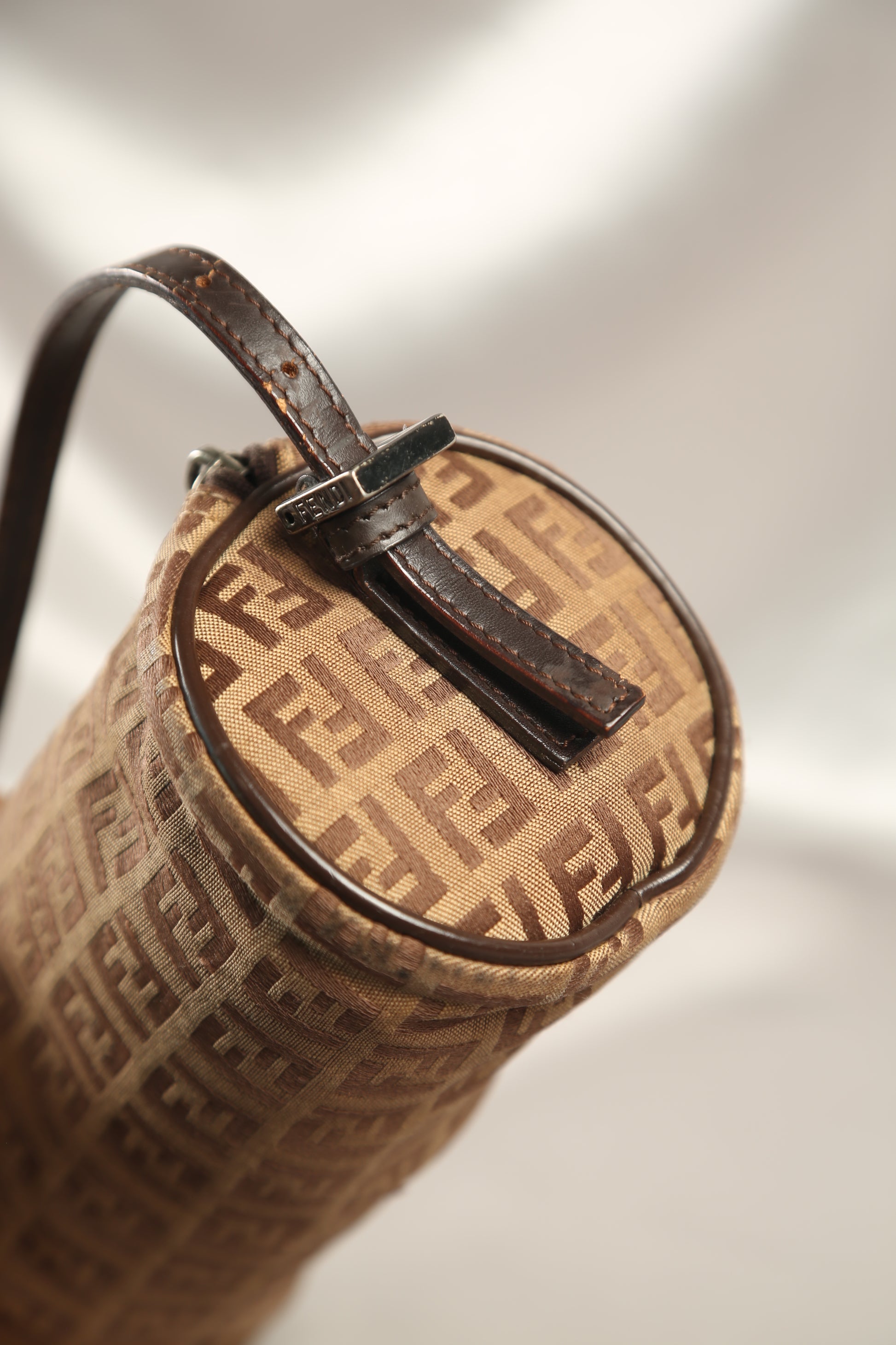 A rare vintage gem from Fendi’s Zucchino collection, this small shoulder bag features the signature FF monogram canvas in warm brown and beige tones. Accented with smooth brown leather piping and an adjustable flat leather strap, it’s the perfect blend of understated luxury and everyday practicality. The gunmetal-tone hardware adds a sleek, modern touch, while the compact barrel-inspired silhouette makes it an ideal go-to bag for effortless styling — from casual looks to elevated outfits. The leather strap has minor wear, and the canvas has a little dirt.