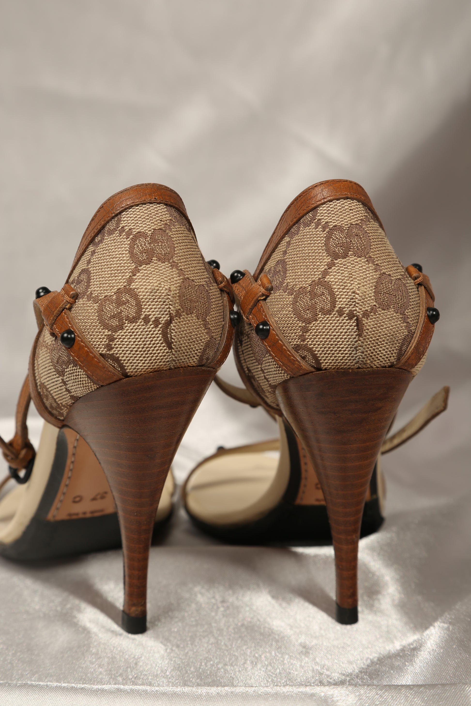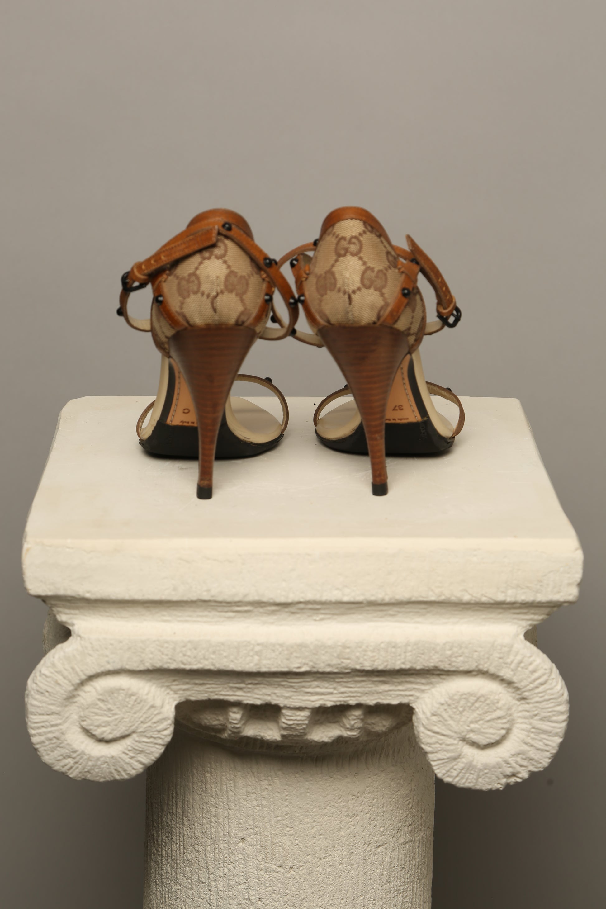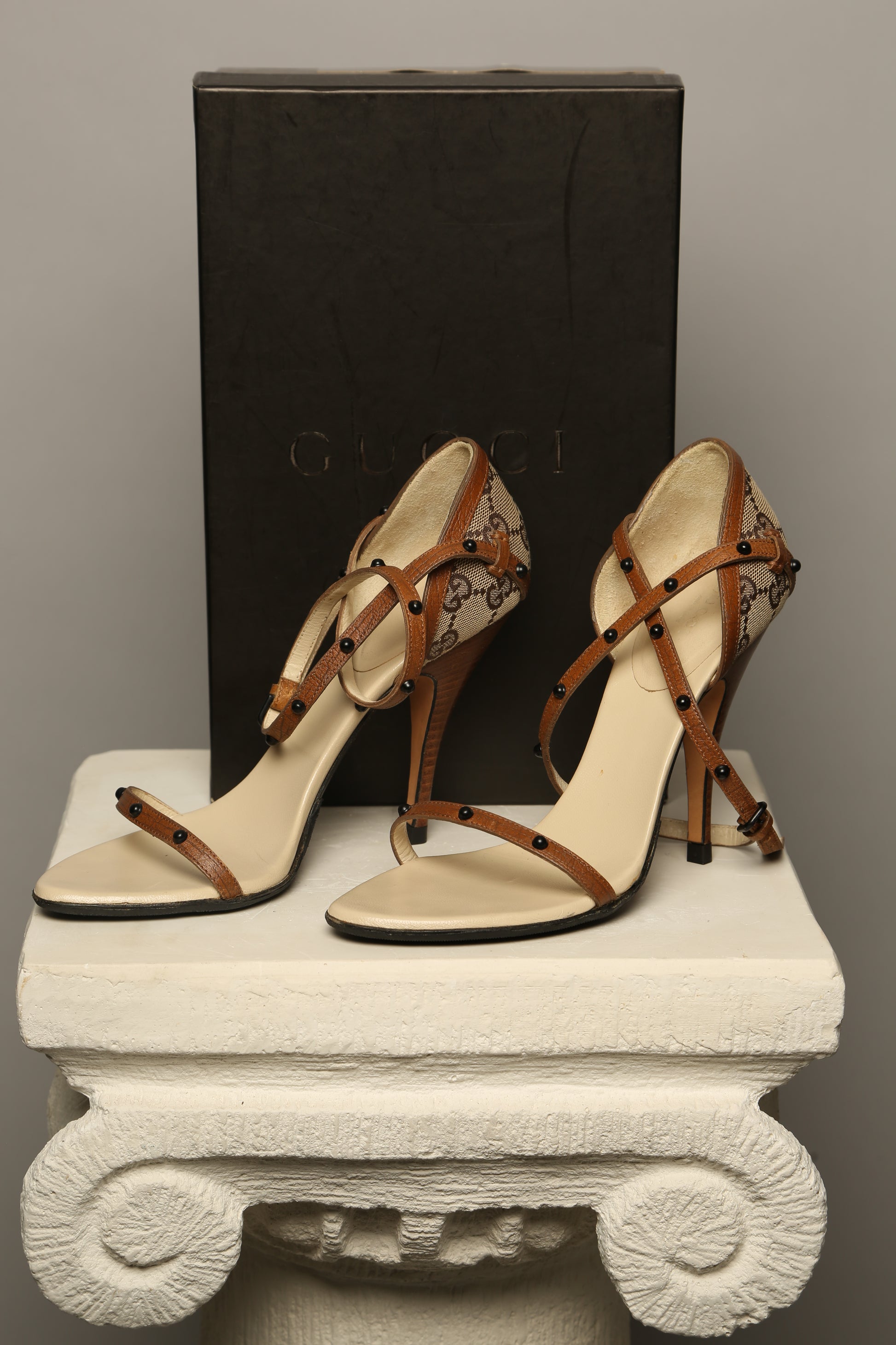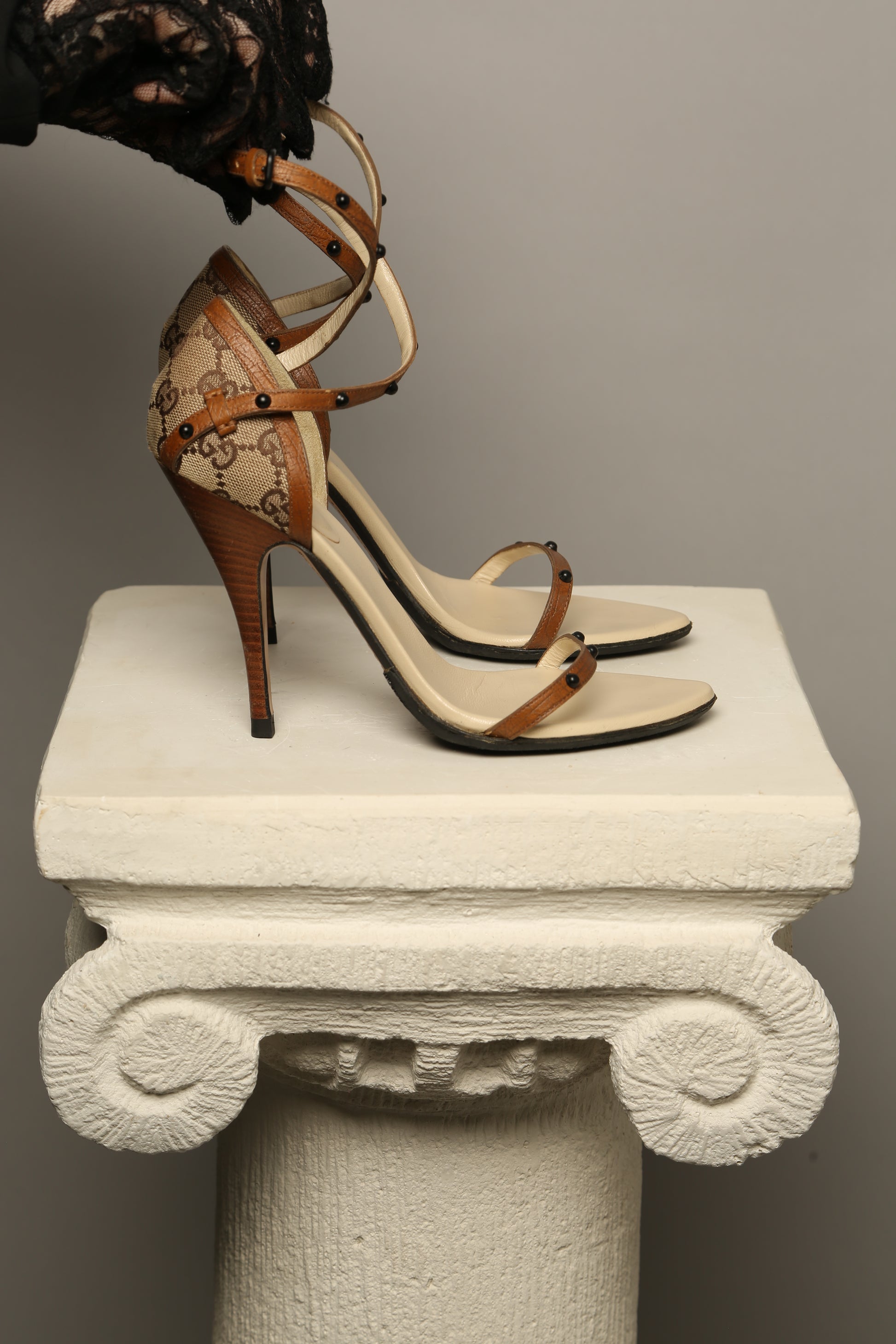 GG Canvas Studded Sandals, a rare and distinctive find crafted with the iconic brown GG canvas and complemented by rich brown leather. These sandals stand out for their unique edgy, accentuated by intricate studded details that add a touch of boldness to the design. The insole, crafted with beige leather, offers comfort and sophistication with each step. Featuring a leather strap that elegantly encircles the ankle.