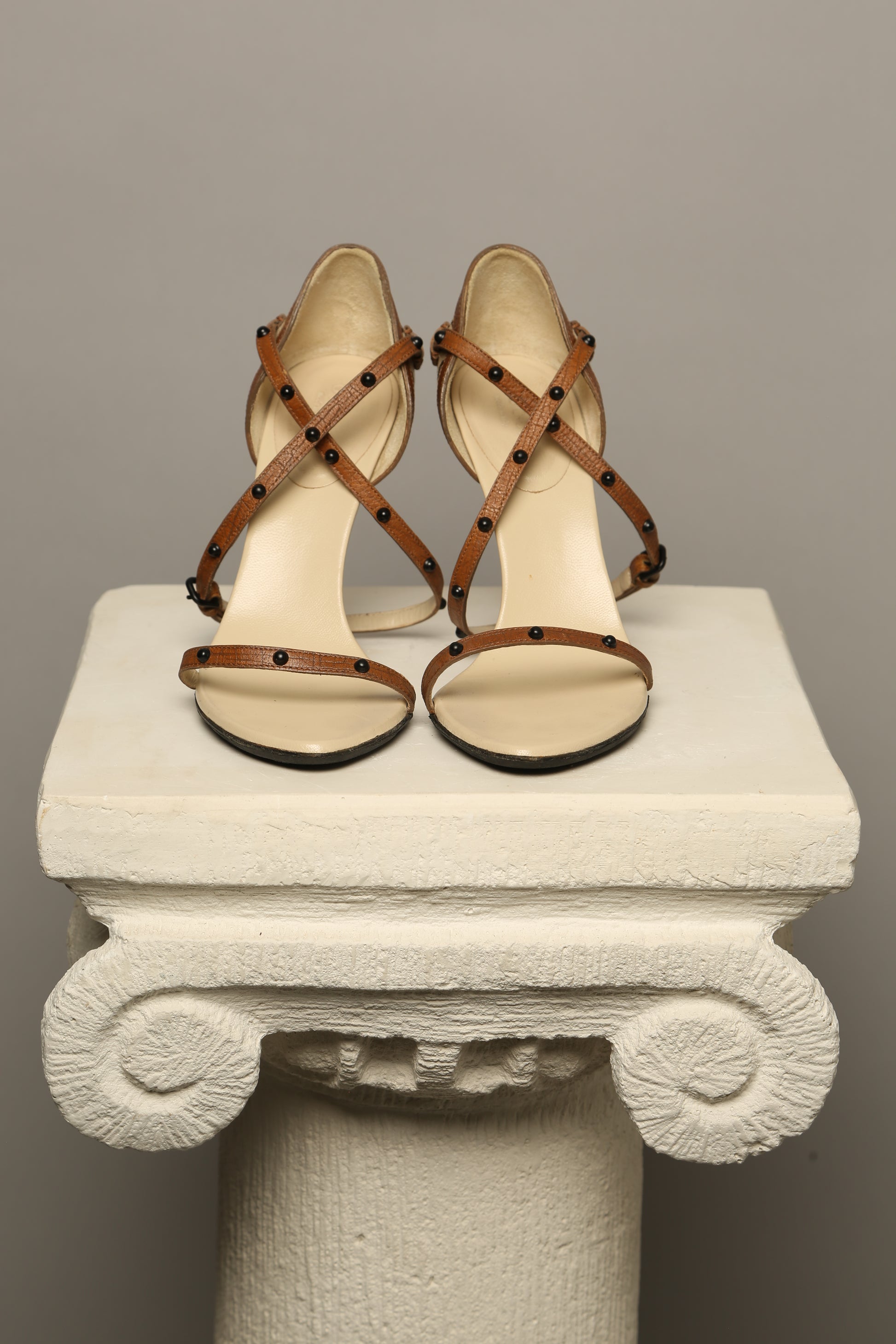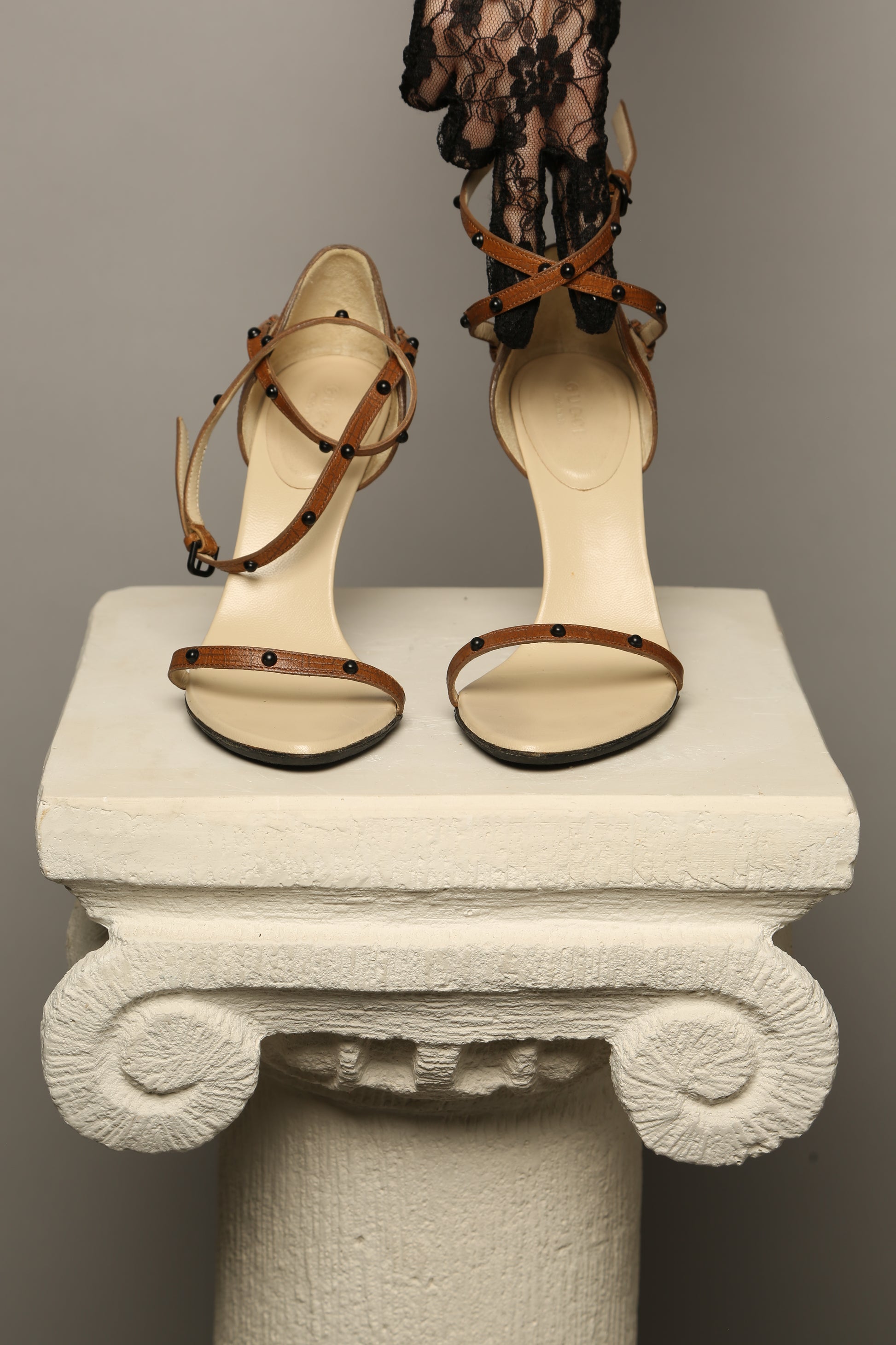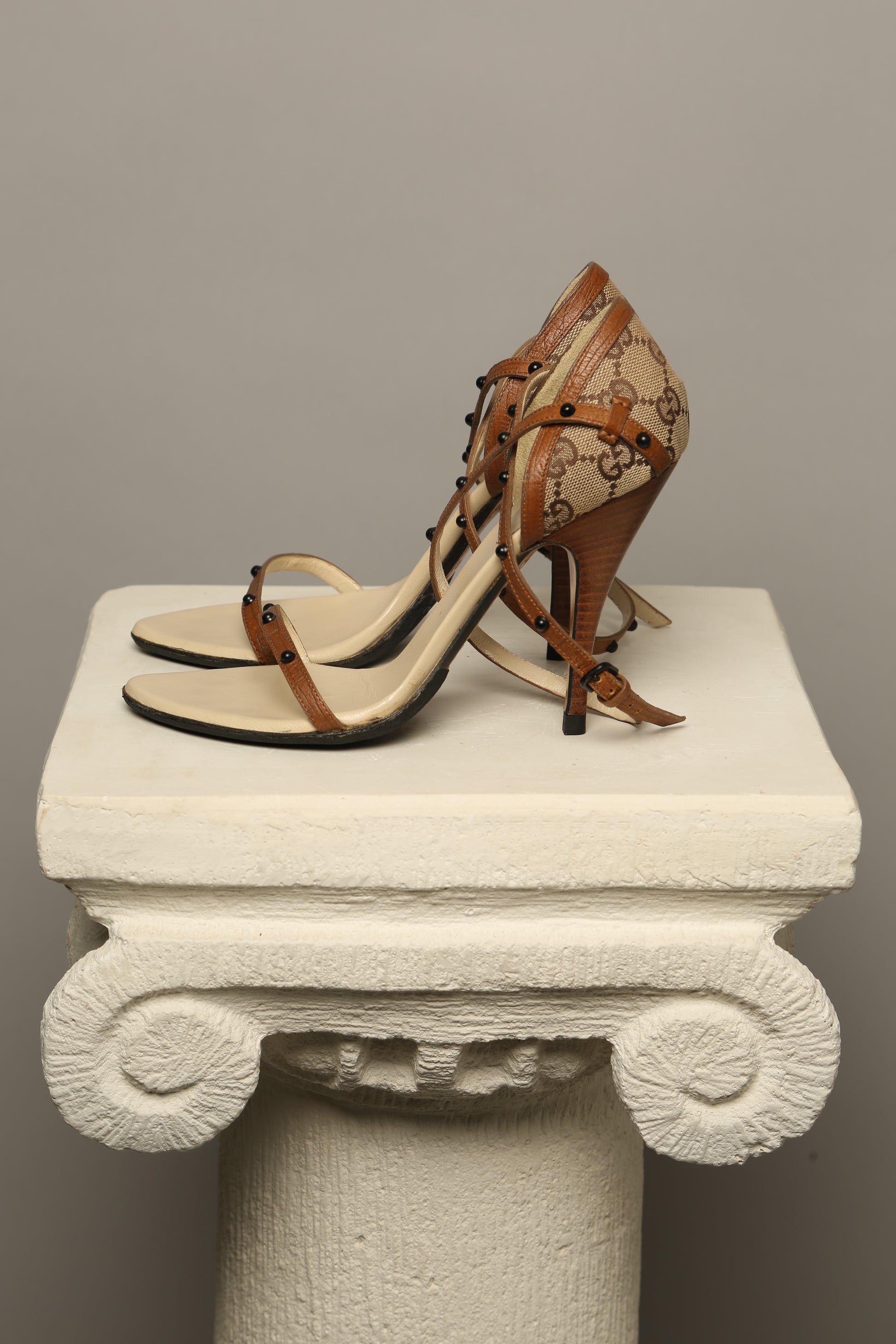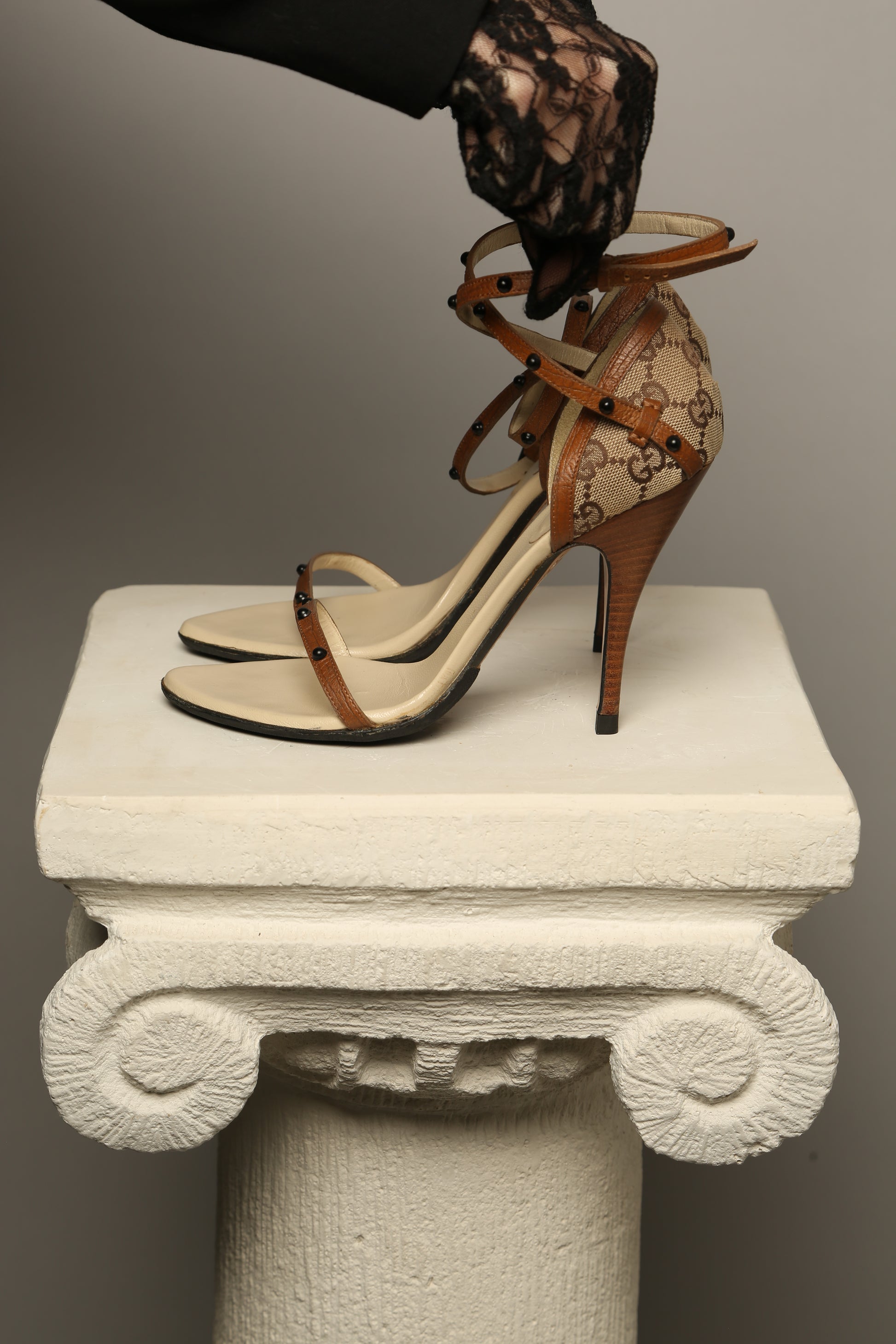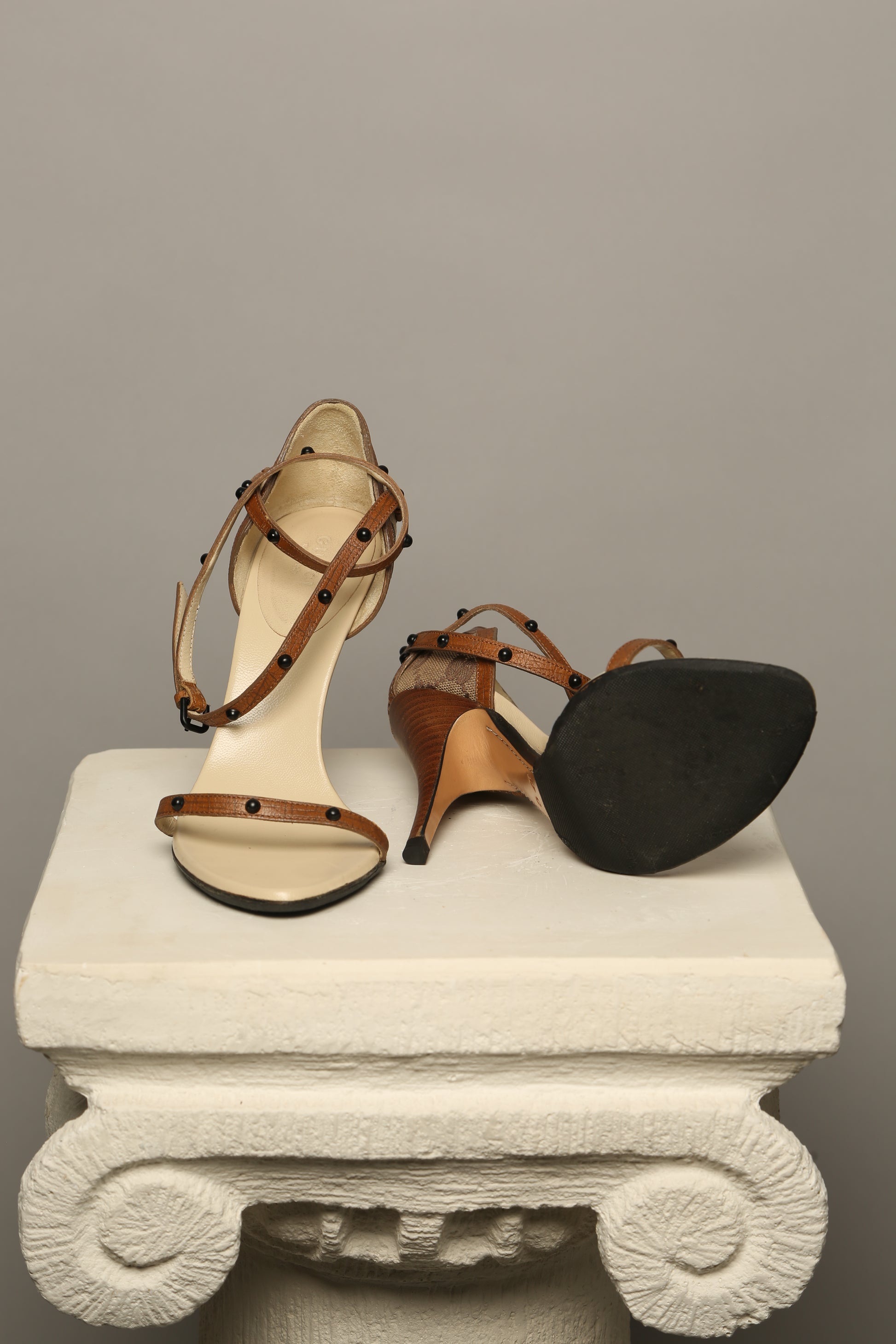 GG Canvas Studded Sandals, a rare and distinctive find crafted with the iconic brown GG canvas and complemented by rich brown leather. These sandals stand out for their unique edgy, accentuated by intricate studded details that add a touch of boldness to the design. The insole, crafted with beige leather, offers comfort and sophistication with each step. Featuring a leather strap that elegantly encircles the ankle.