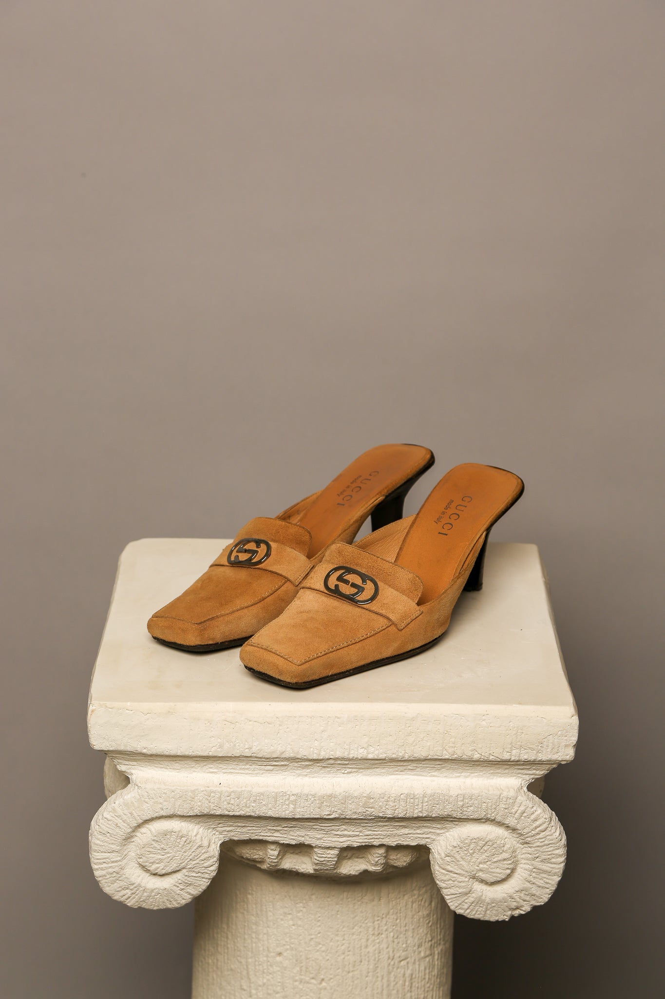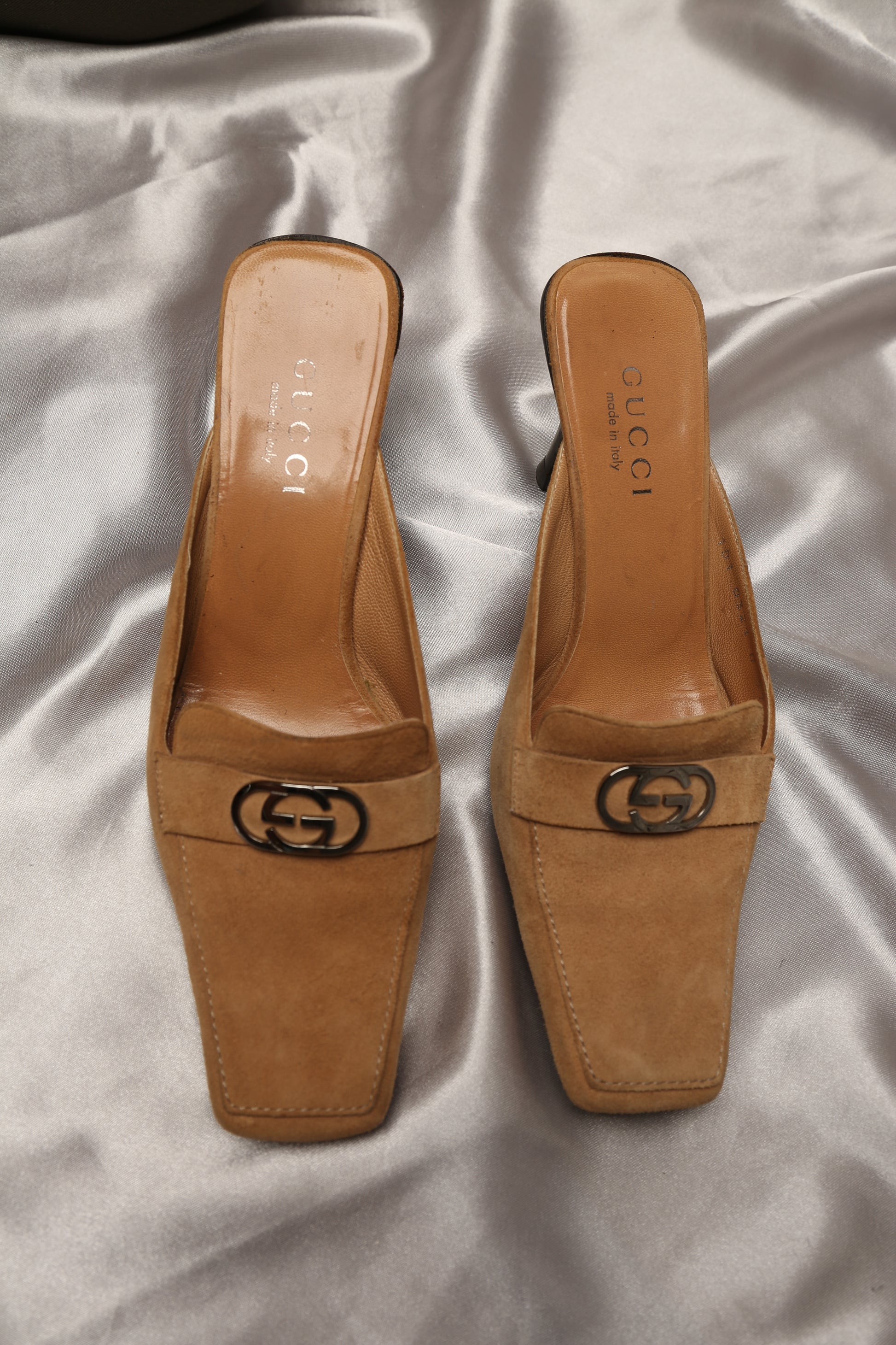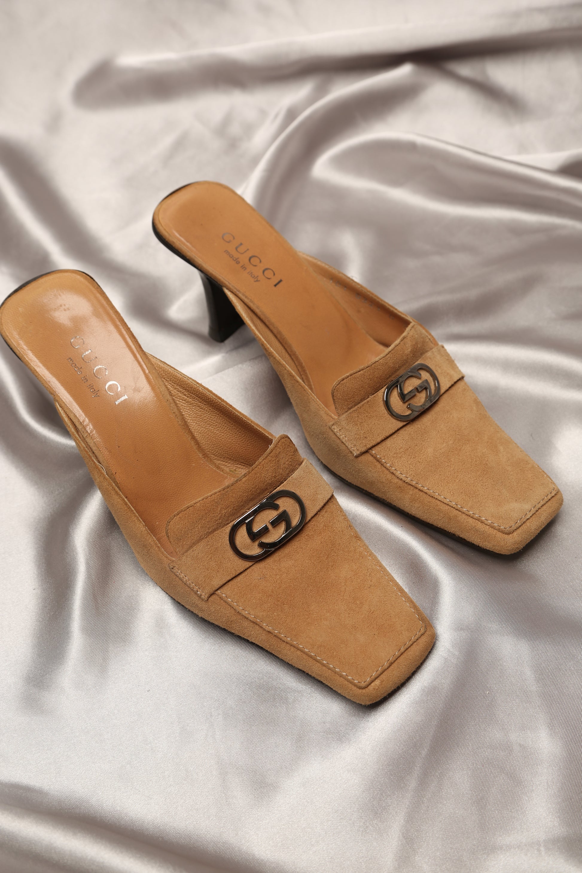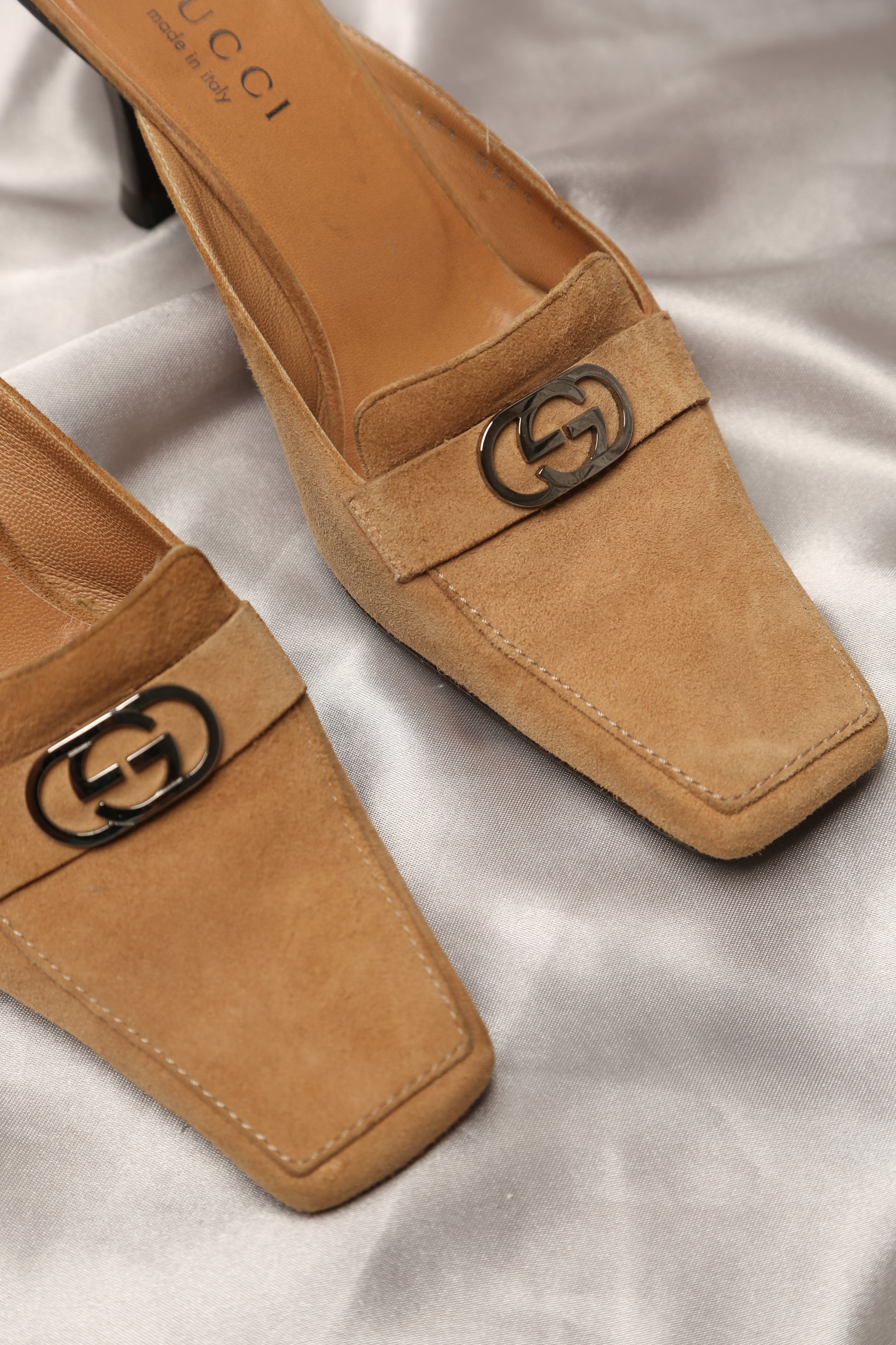 Rare Gucci brown square-toe shoes featuring the iconic Gucci logo detail from the 90s. Crafted from luxurious brown suede leather A timeless statement piece.