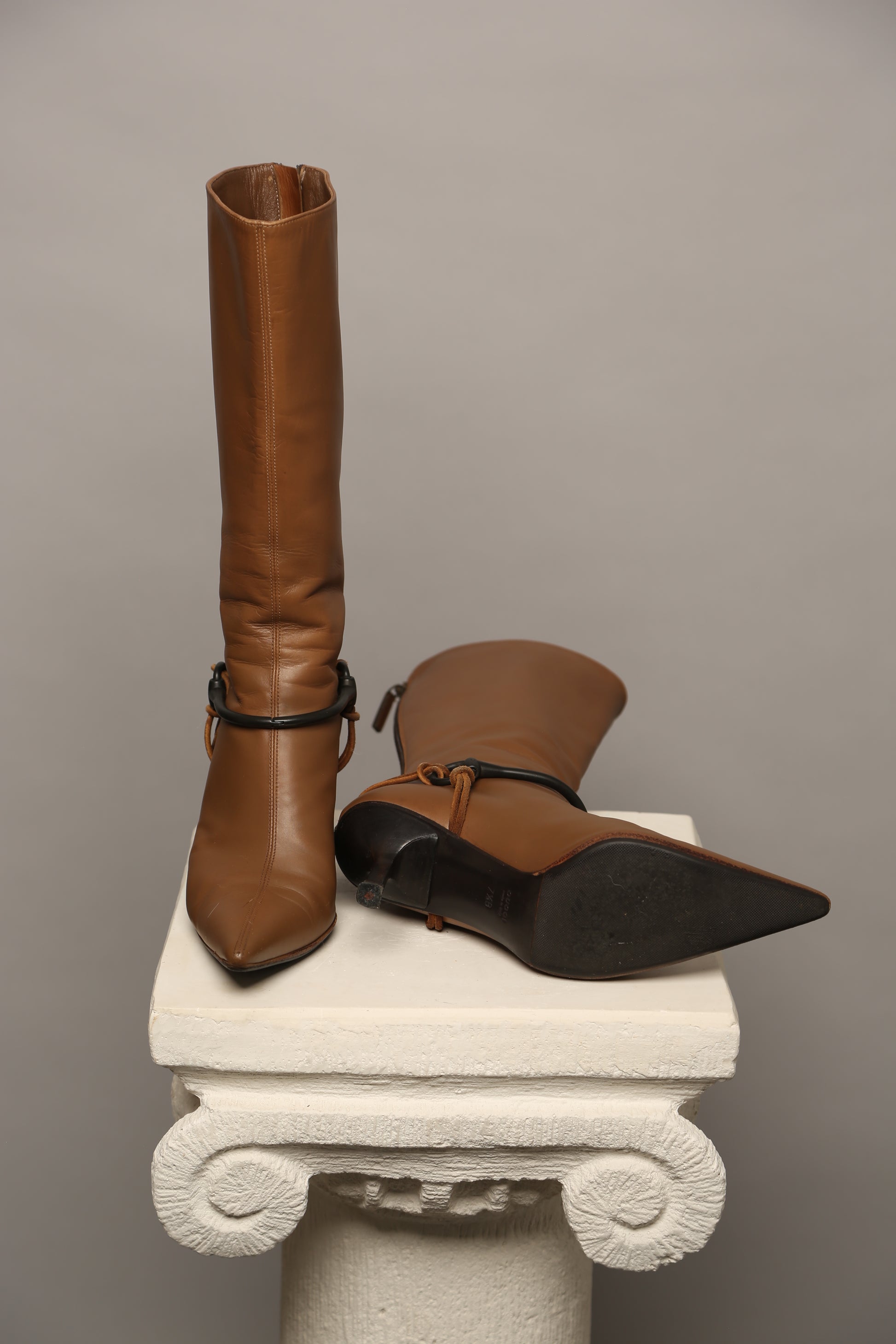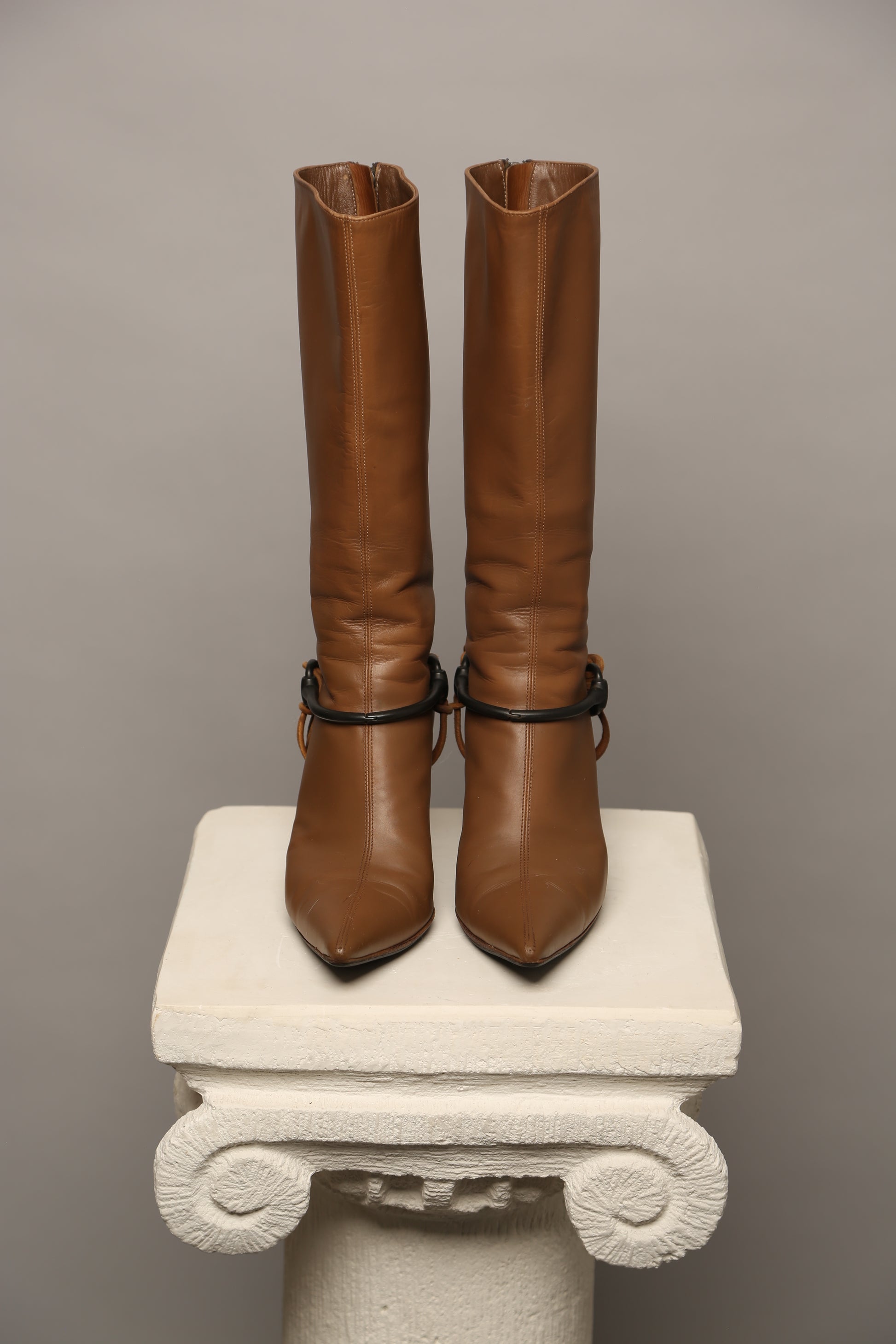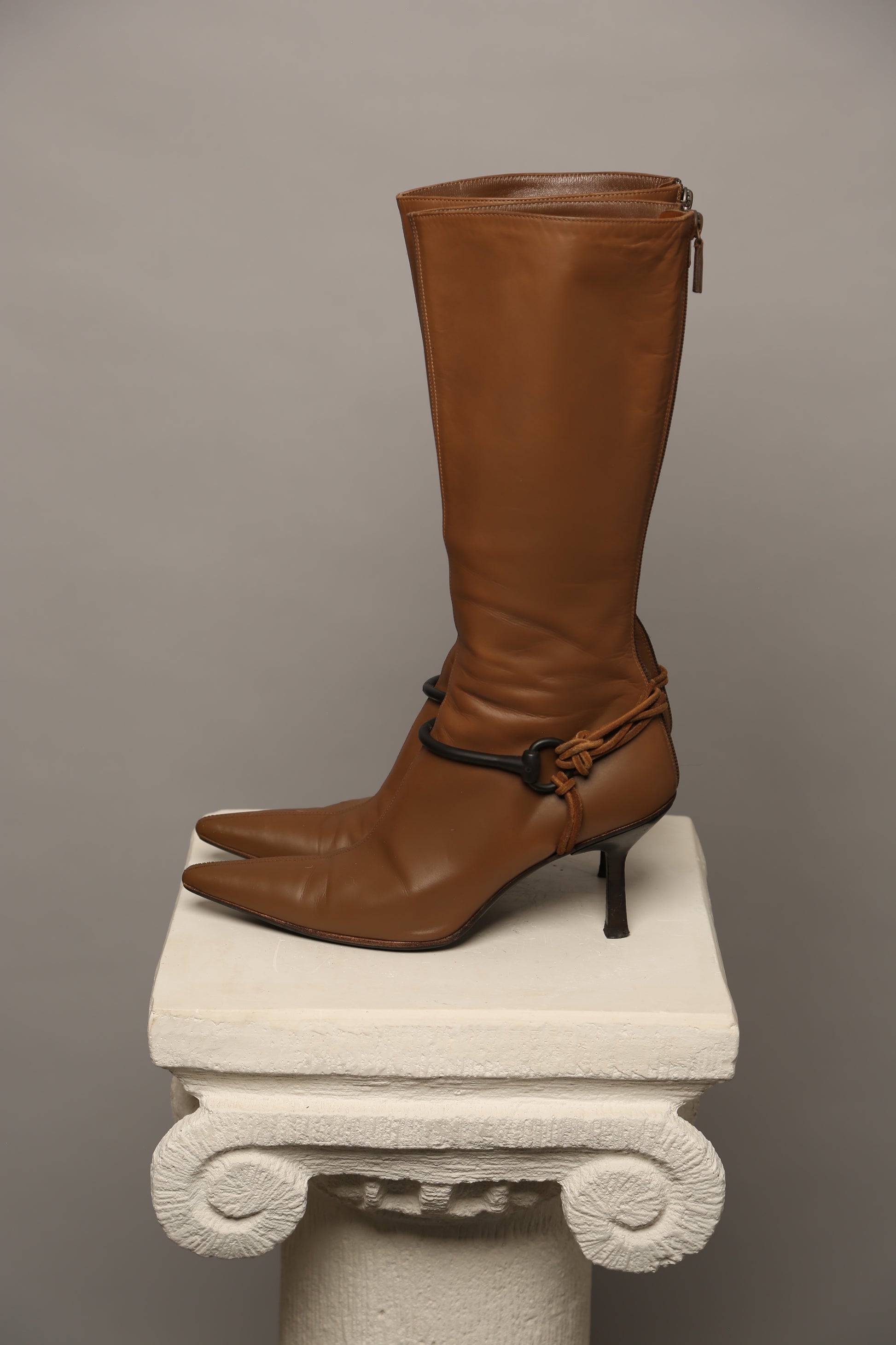 Iconic style with these super trendy Gucci boots is reminiscent of the Tom Ford era, famously donned by fashion girlie Kendall Jenner. Crafted from the softest lambskin leather in a beautiful brown hue, these boots feature the iconic horse-bit detail, exuding a luxurious and timeless appeal.