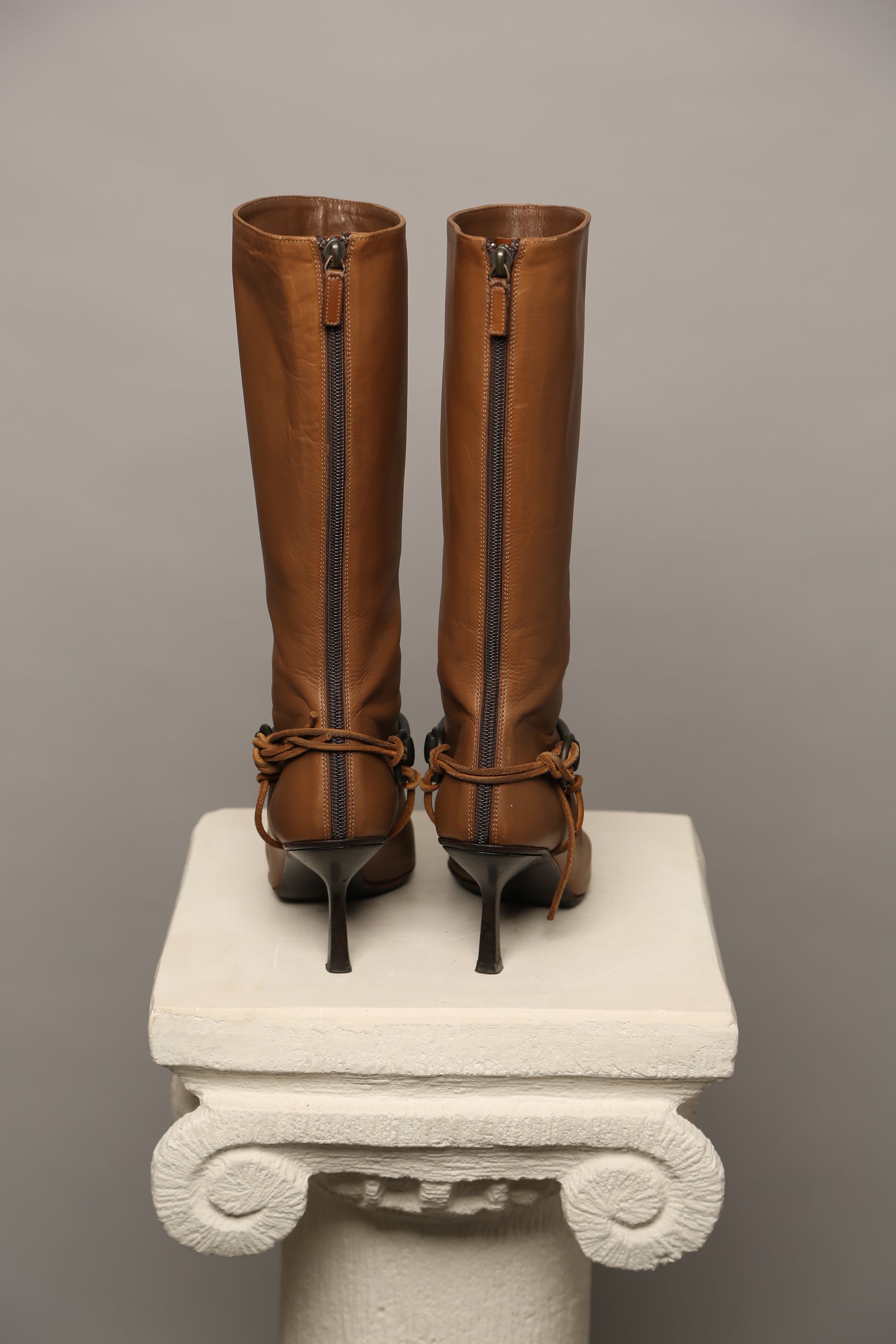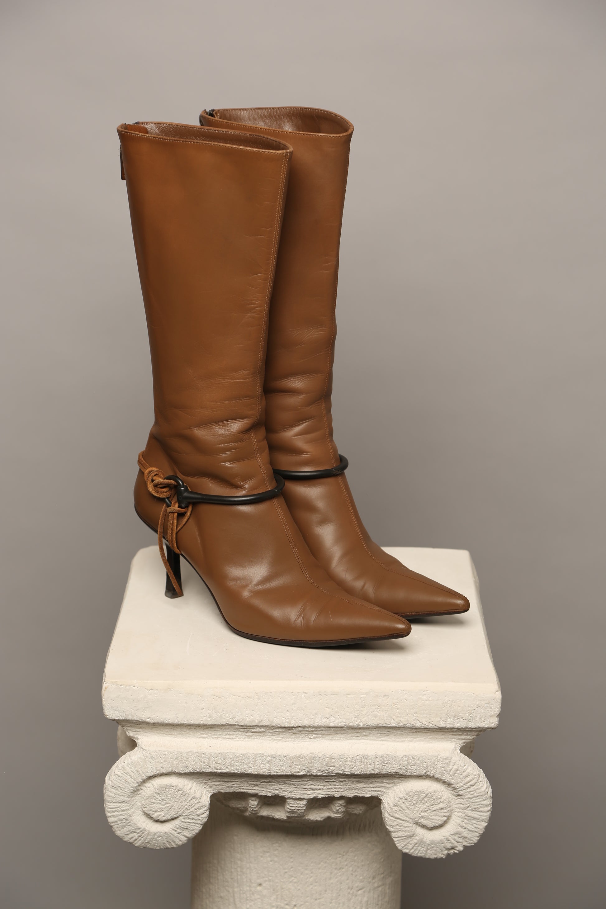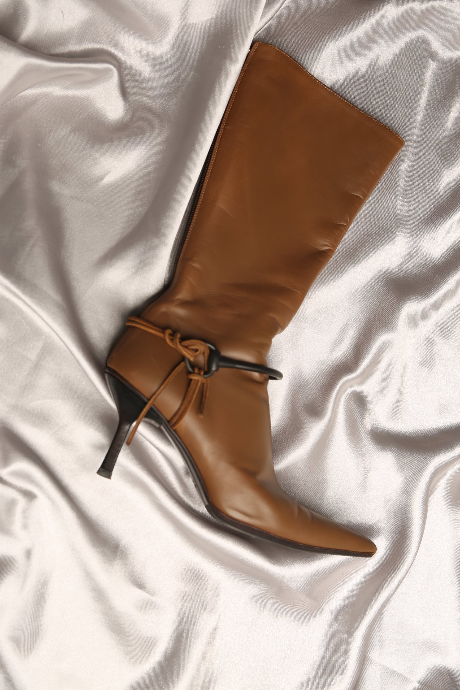 Iconic style with these super trendy Gucci boots is reminiscent of the Tom Ford era, famously donned by fashion girlie Kendall Jenner. Crafted from the softest lambskin leather in a beautiful brown hue, these boots feature the iconic horse-bit detail, exuding a luxurious and timeless appeal.