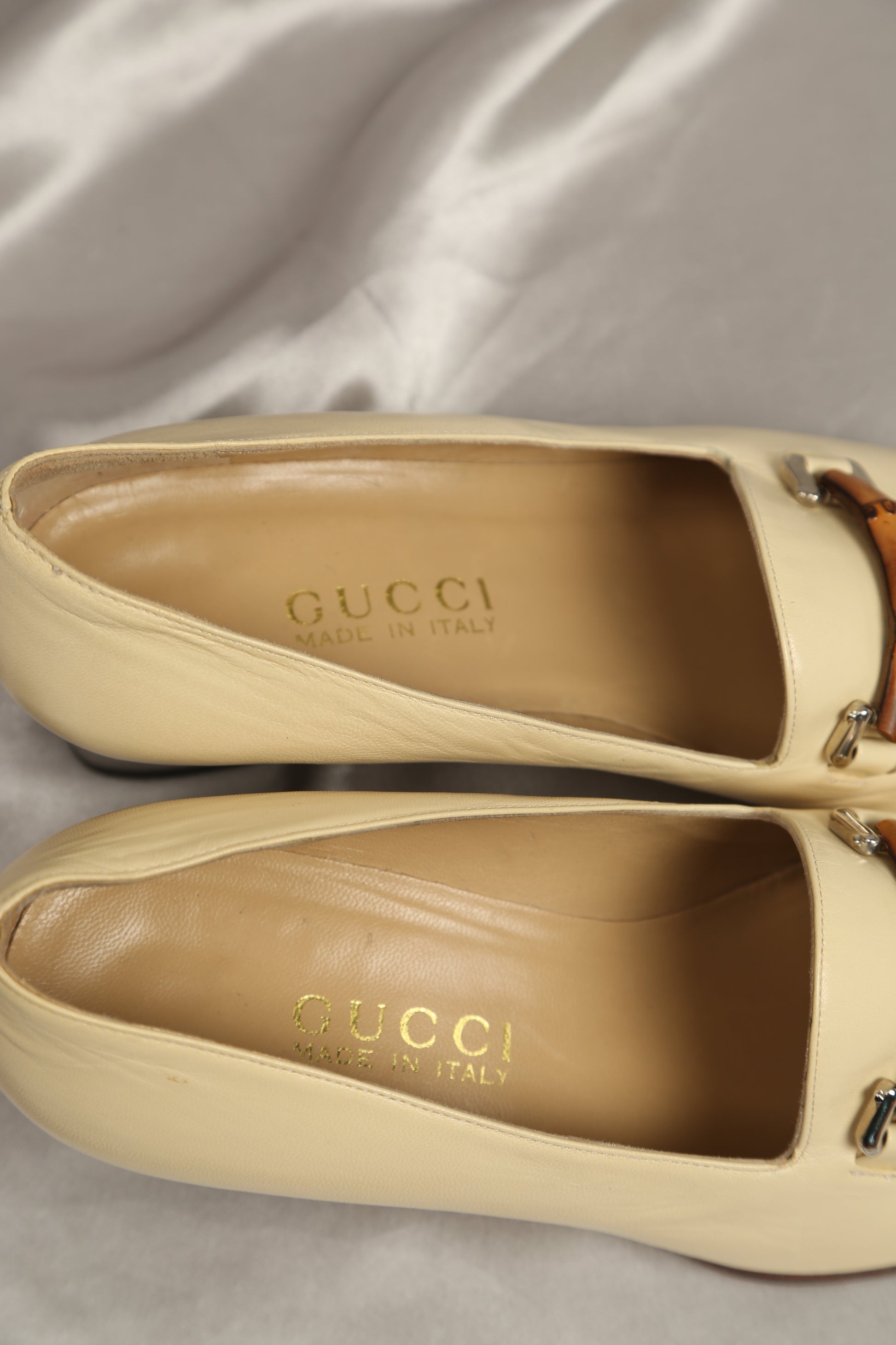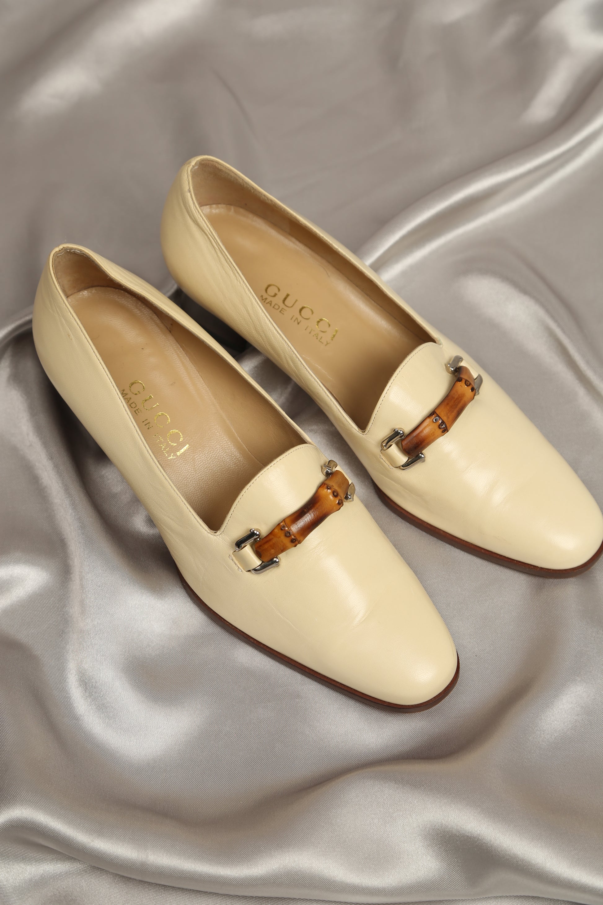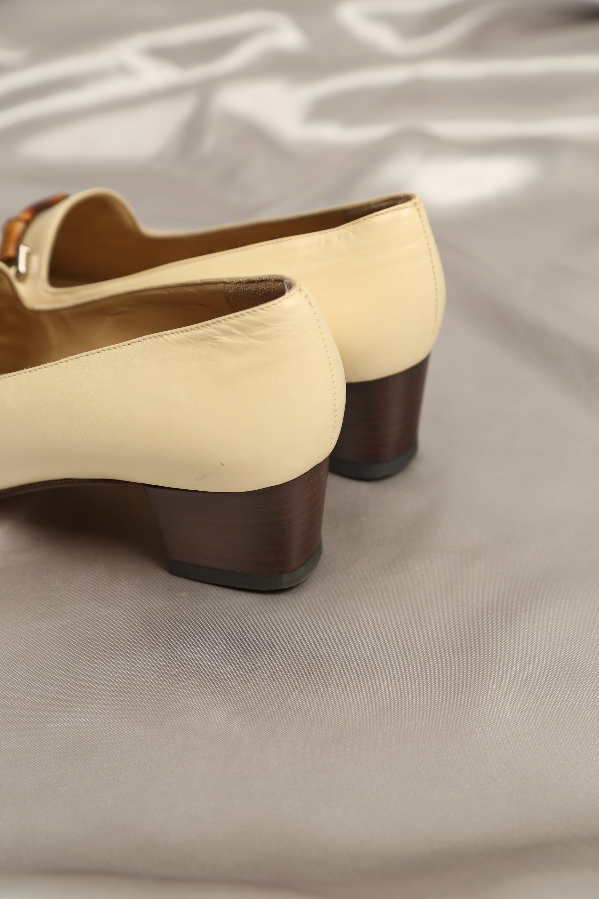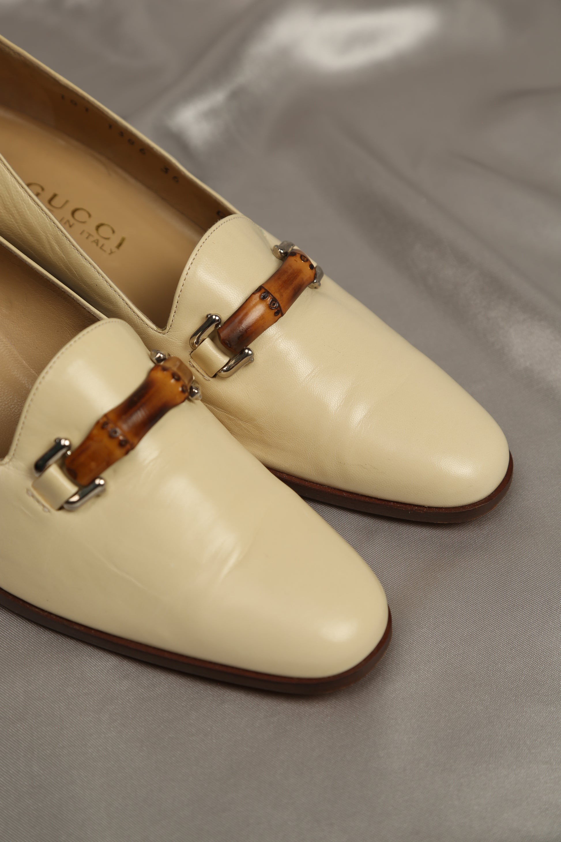 Elevate your summer wardrobe with these vintage Gucci loafers adorned with the iconic bamboo detail. Crafted in a sophisticated light beige lambskin leather, they exude understated luxury and timeless charm. The bamboo accent lends a unique touch, adding to the allure of this classic piece.
