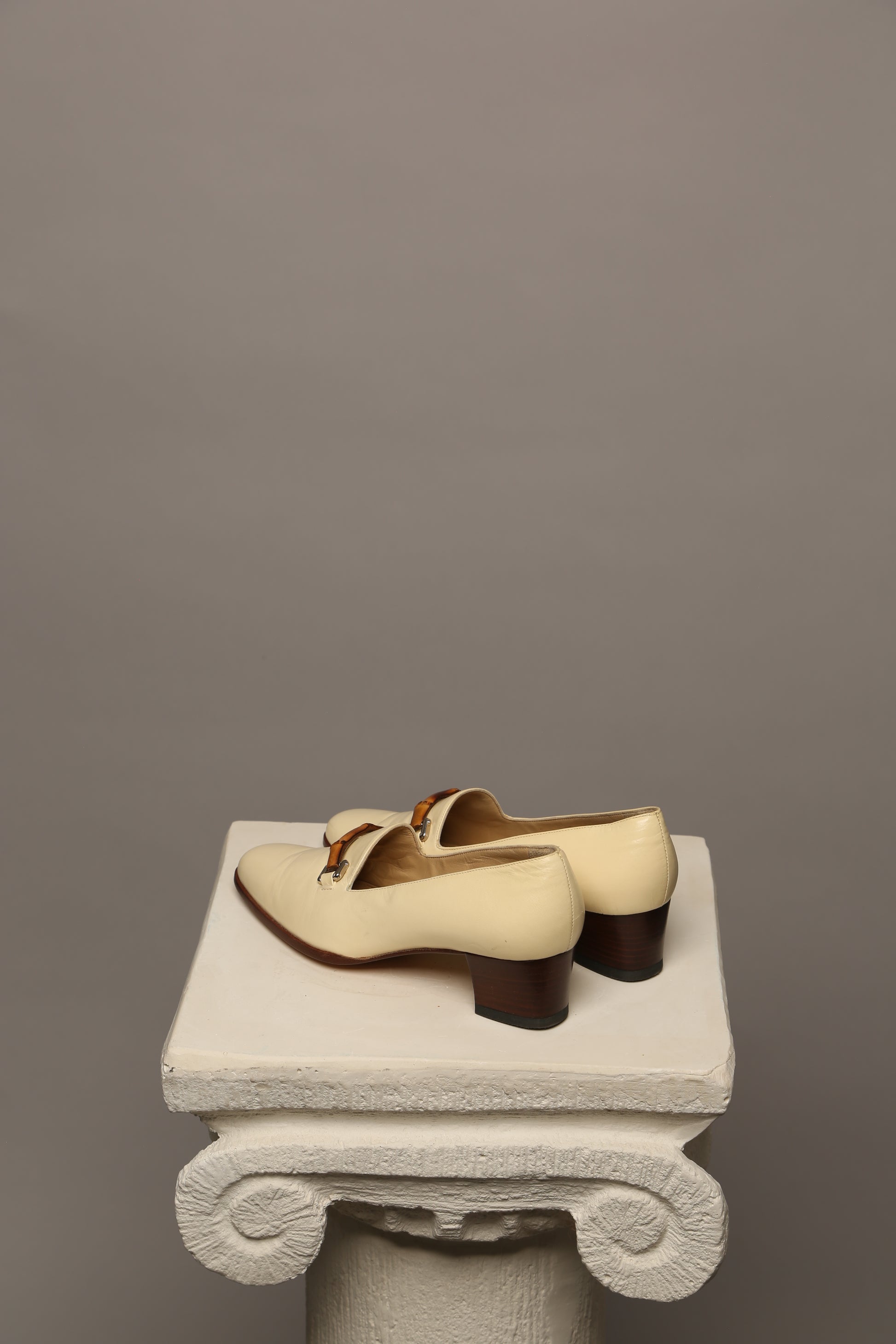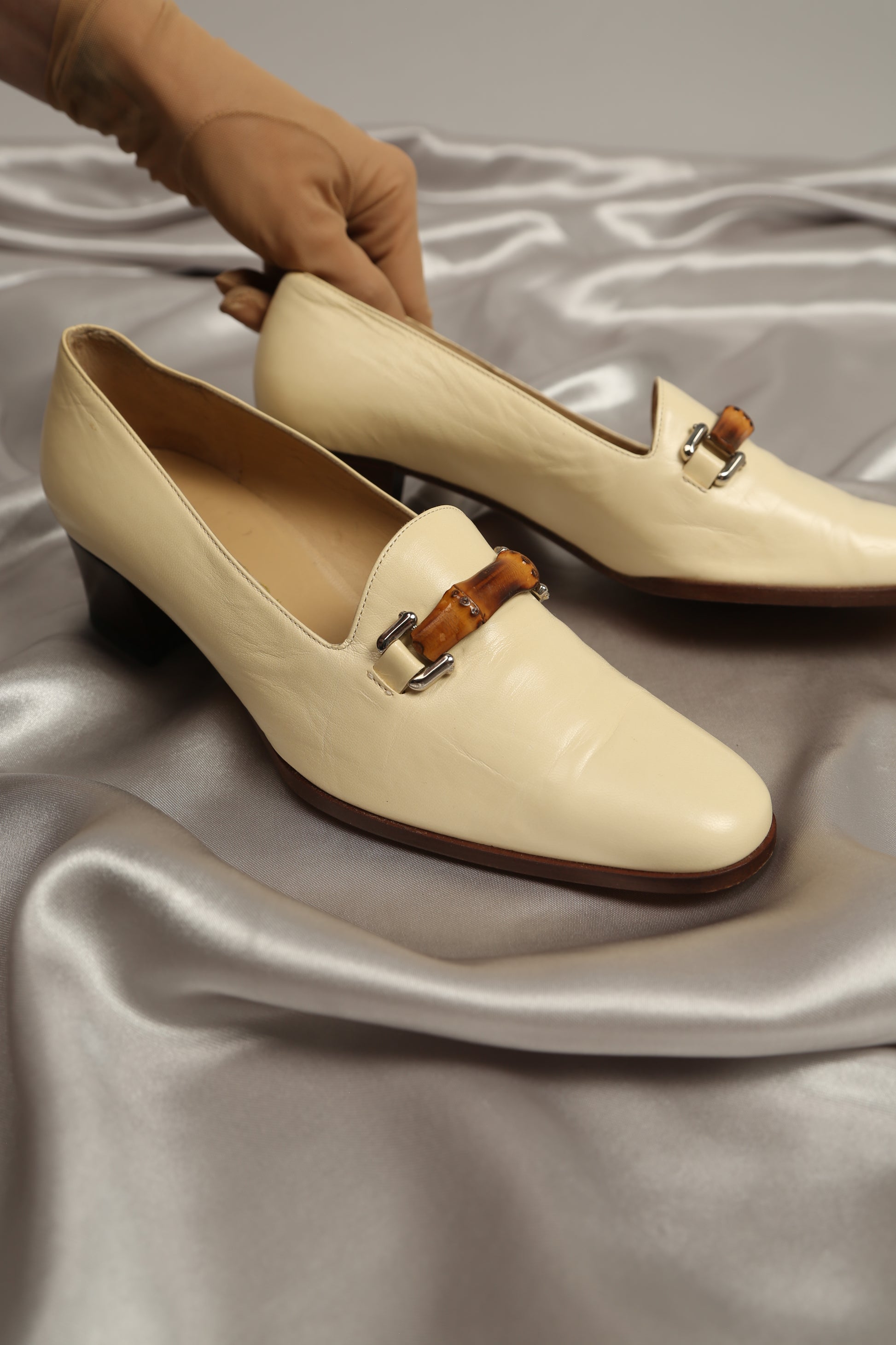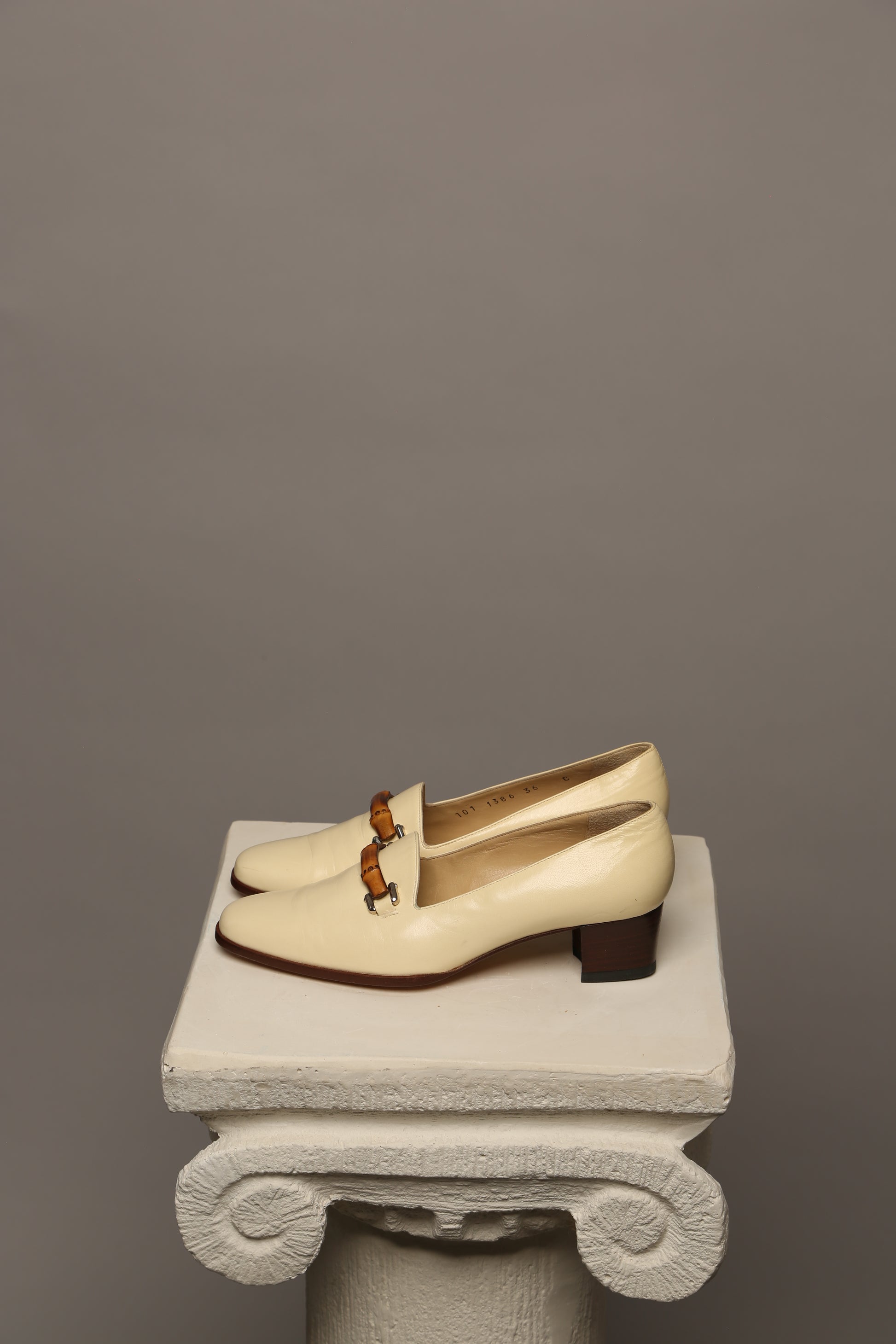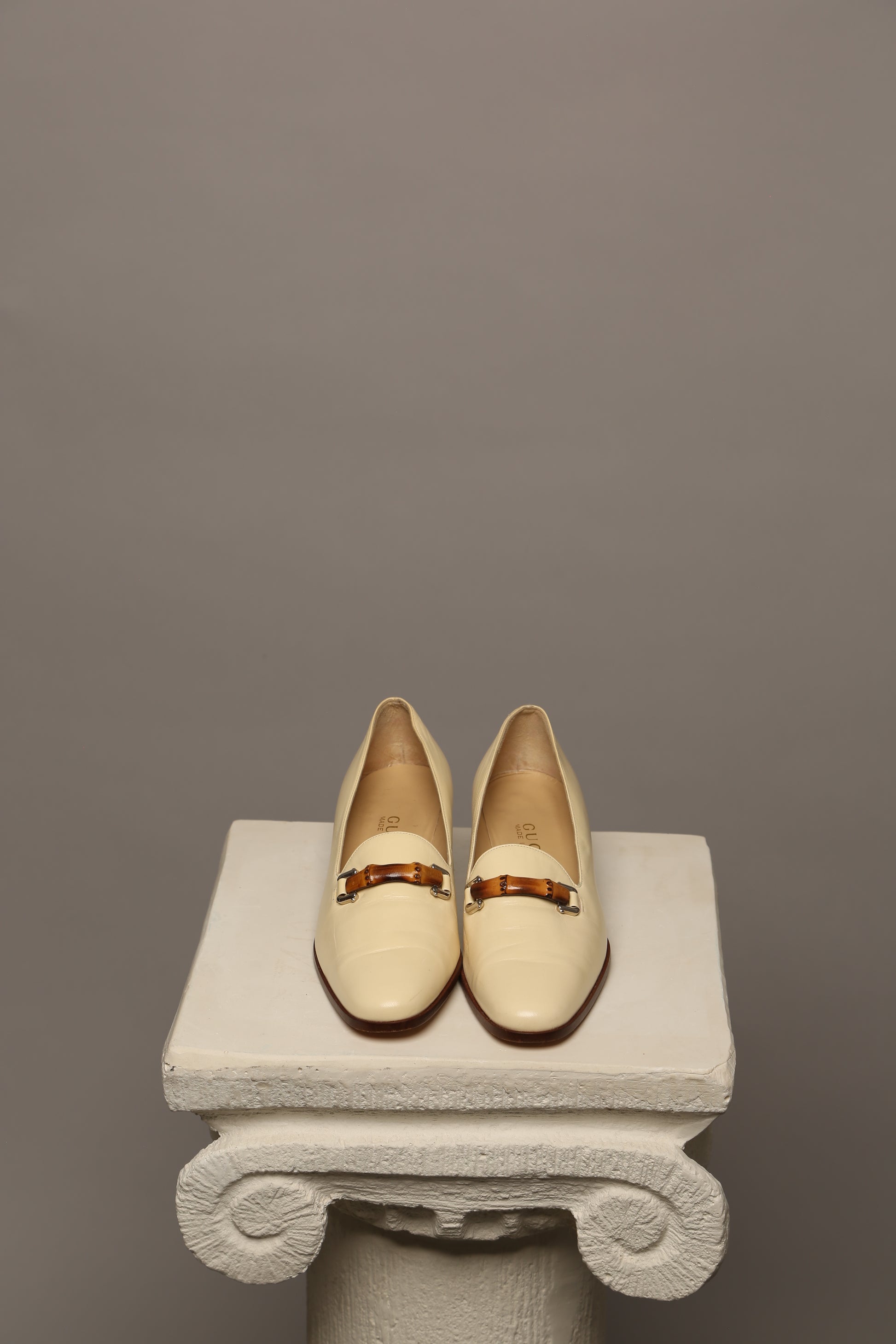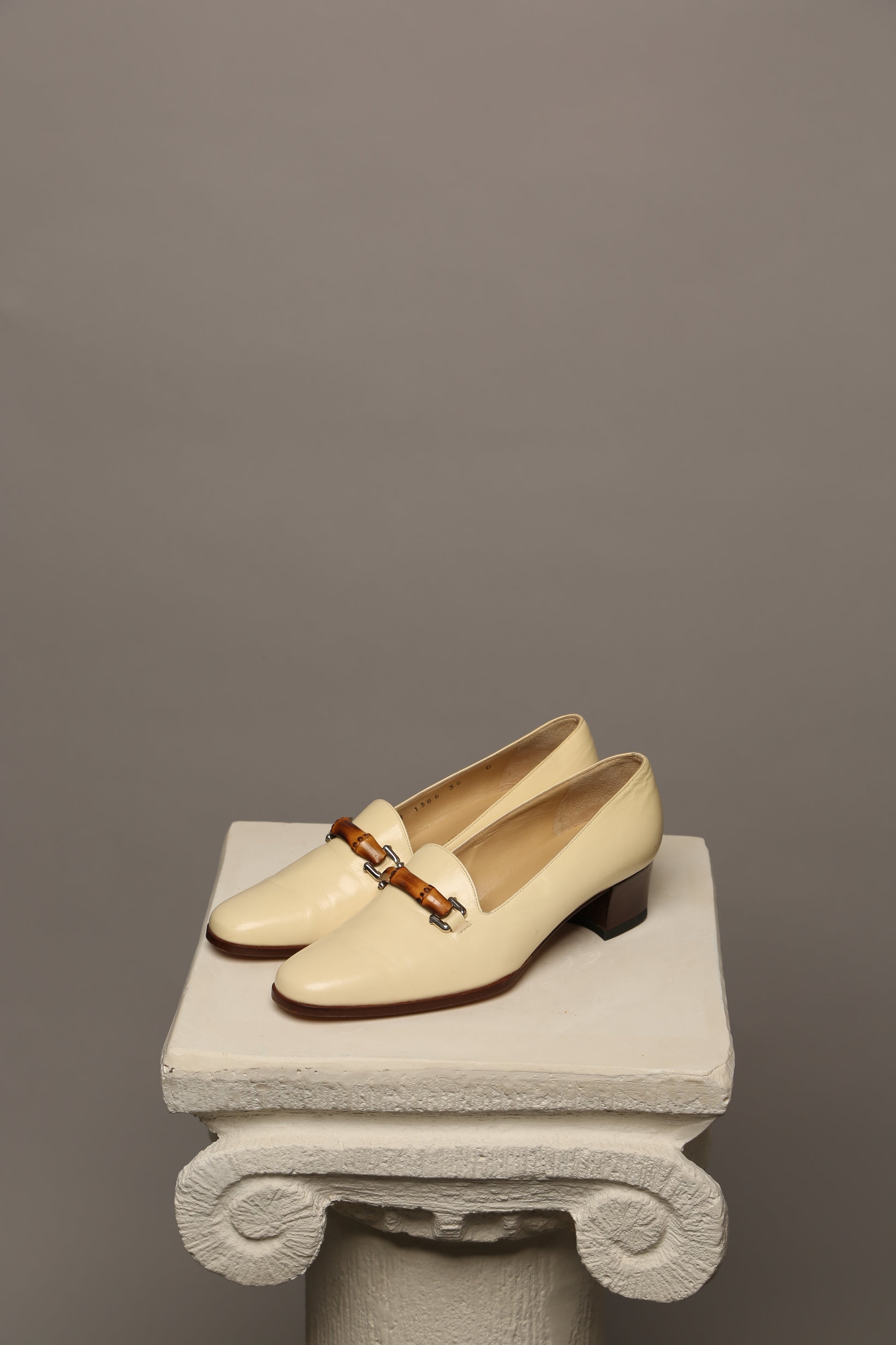 Elevate your summer wardrobe with these vintage Gucci loafers adorned with the iconic bamboo detail. Crafted in a sophisticated light beige lambskin leather, they exude understated luxury and timeless charm. The bamboo accent lends a unique touch, adding to the allure of this classic piece.