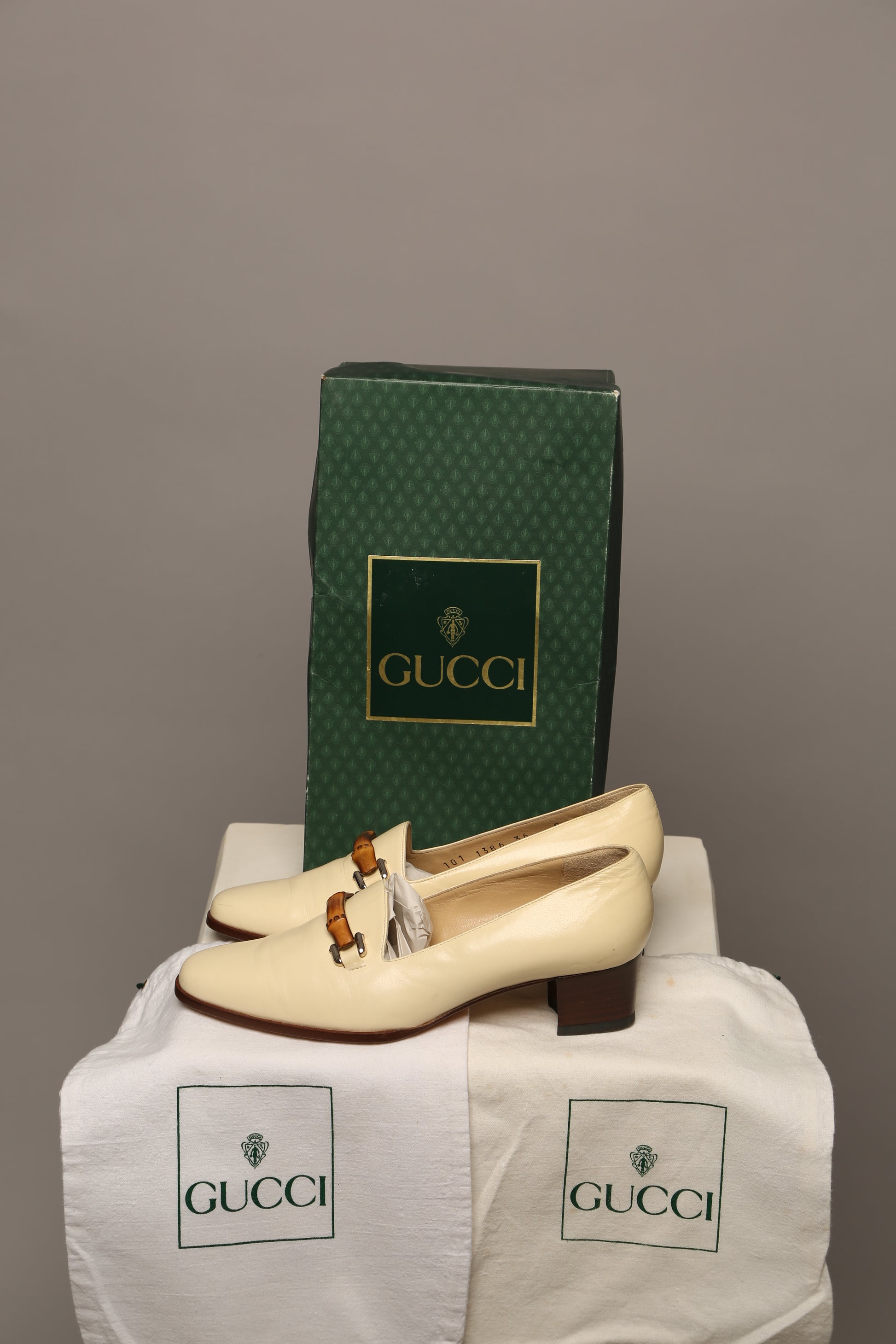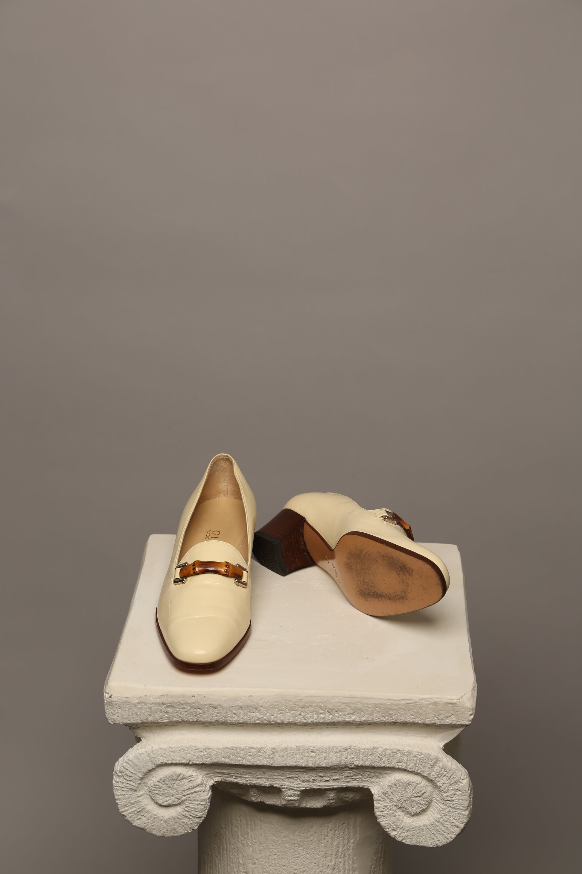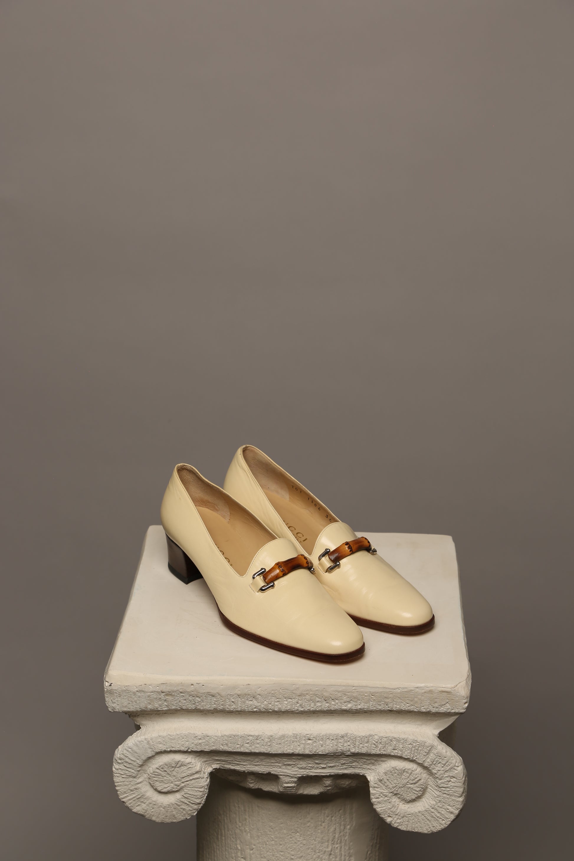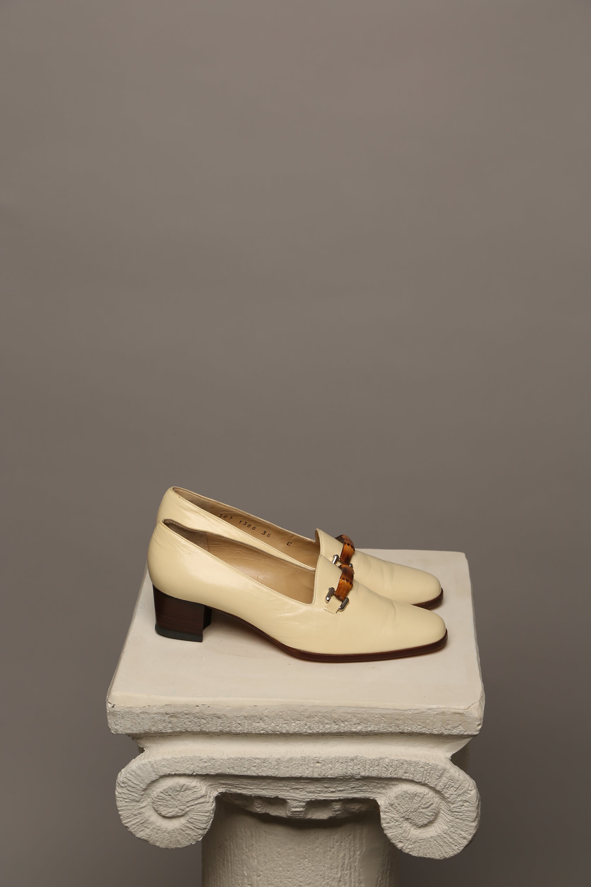 Elevate your summer wardrobe with these vintage Gucci loafers adorned with the iconic bamboo detail. Crafted in a sophisticated light beige lambskin leather, they exude understated luxury and timeless charm. The bamboo accent lends a unique touch, adding to the allure of this classic piece.