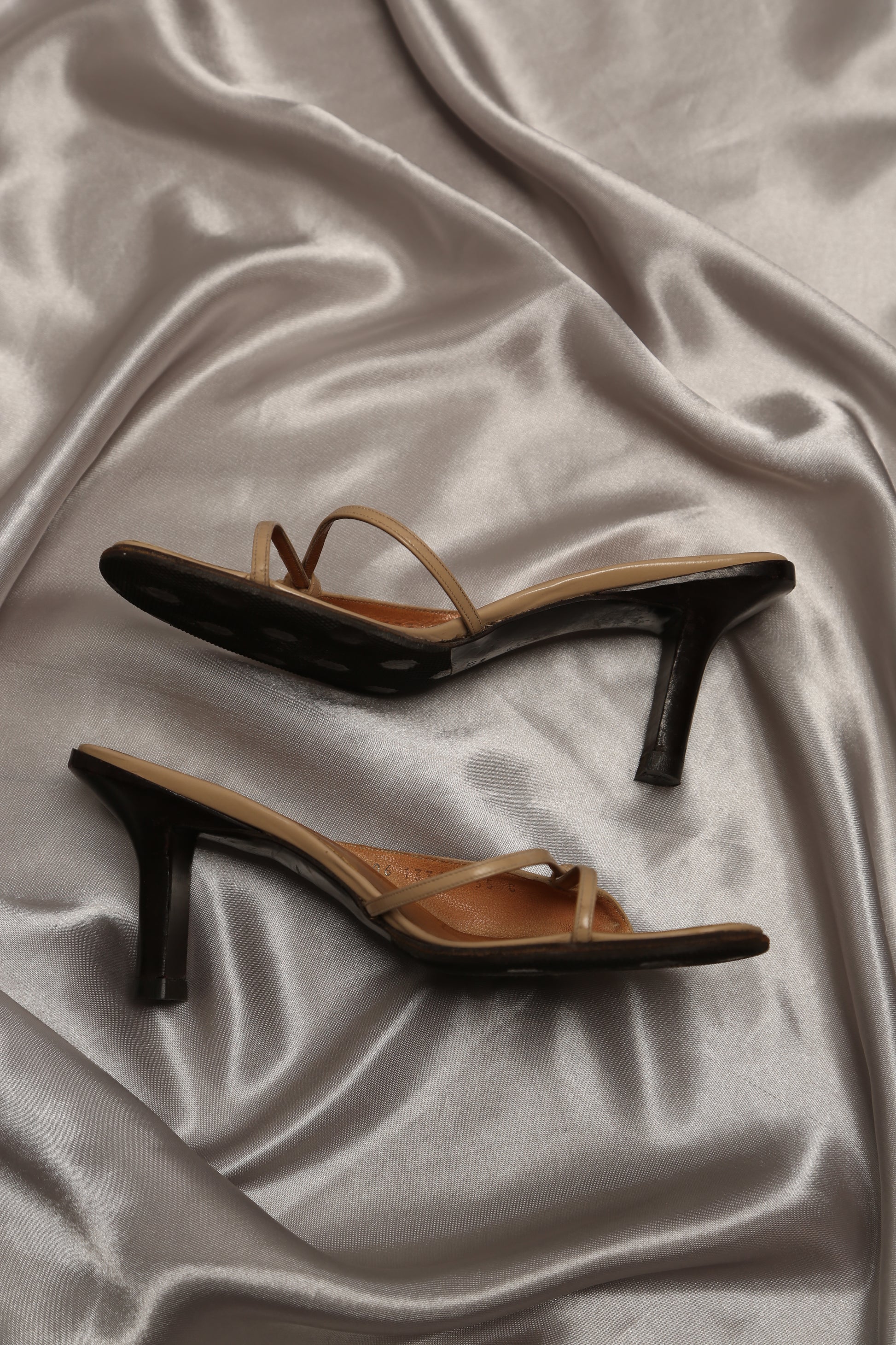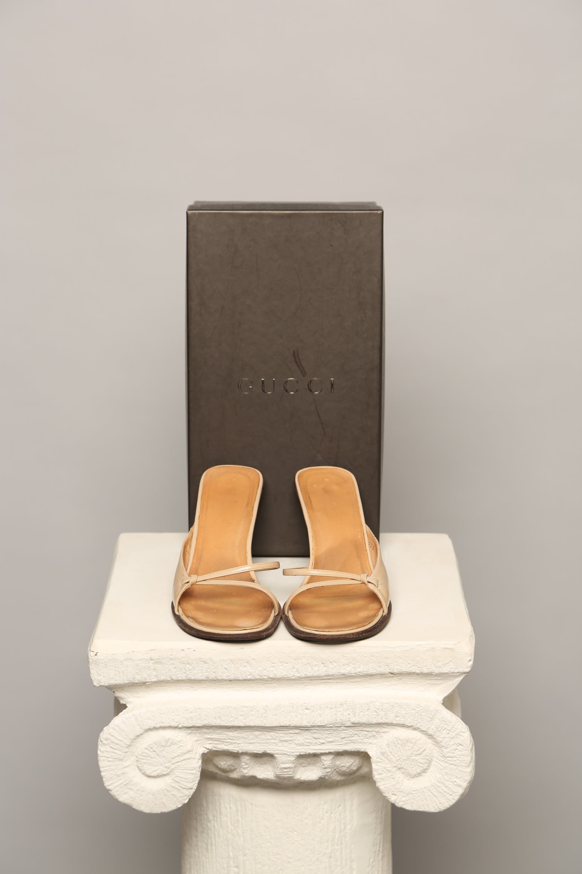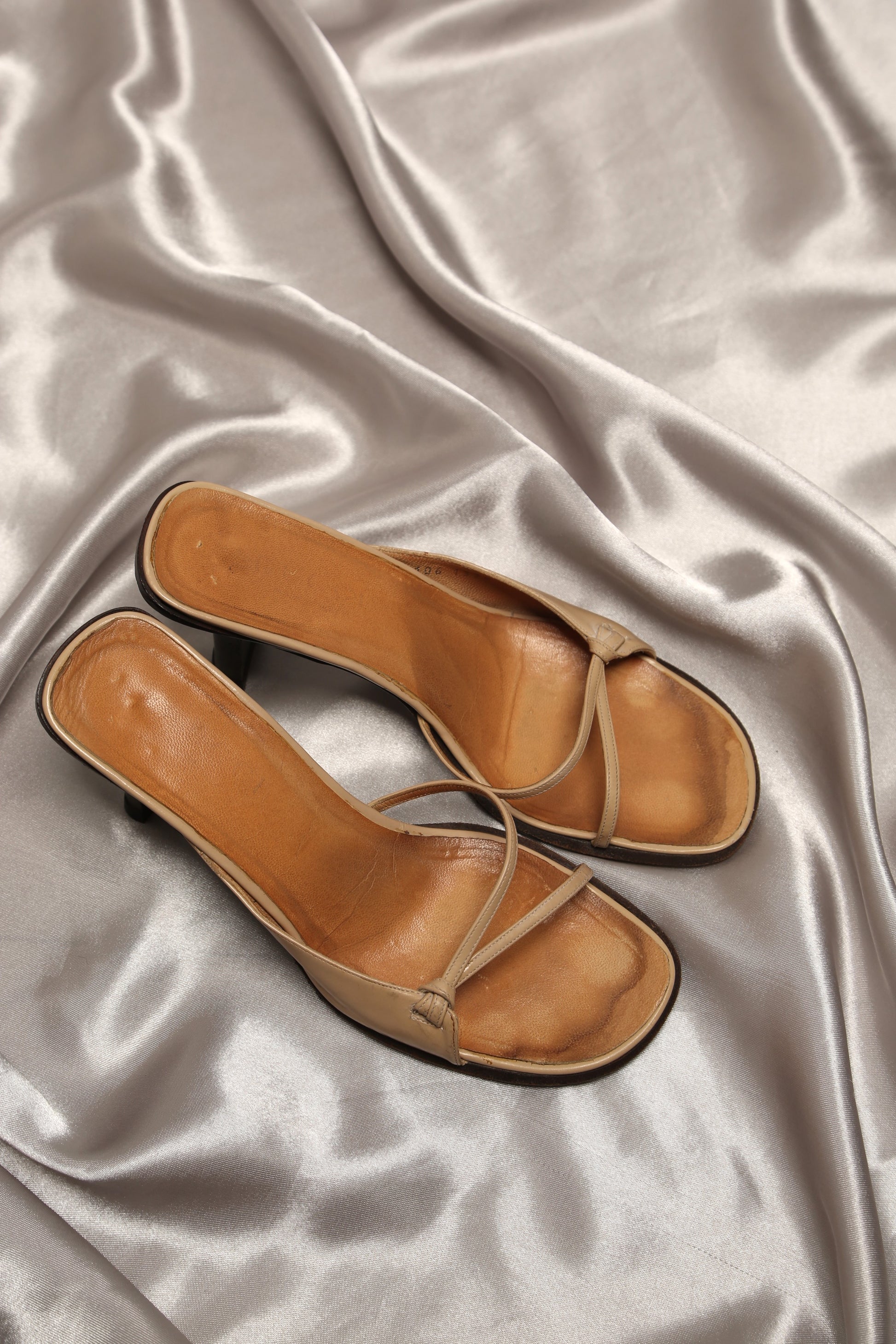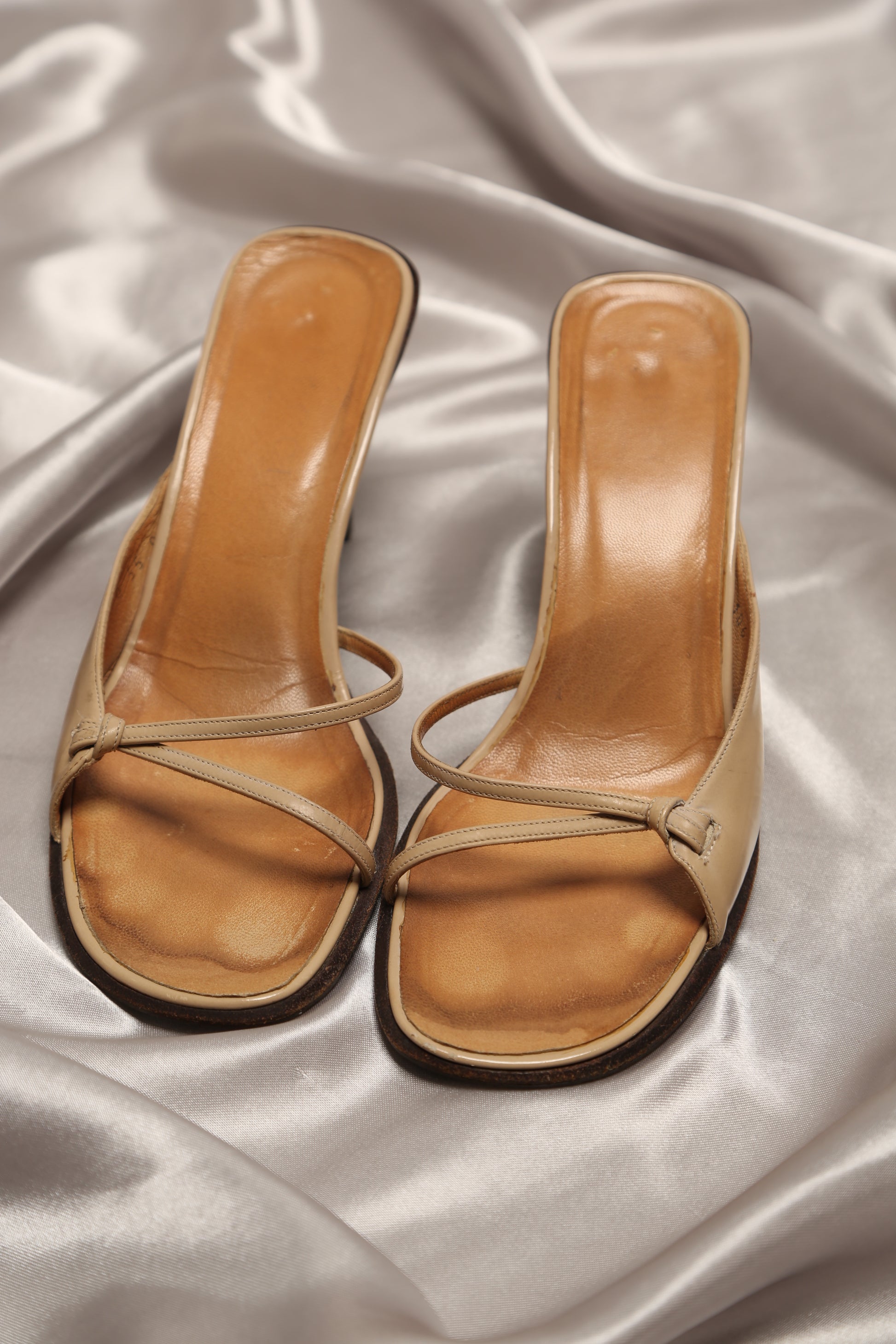 Very rare vintage Gucci strappy sandals by Tom Ford. In a classic nude color, these rare 90s heels exude timeless elegance. They show some signs of wear on the inner soles, but our cobbler has cleaned them and added brand new heel tips, ensuring they’re ready for their next chapter.