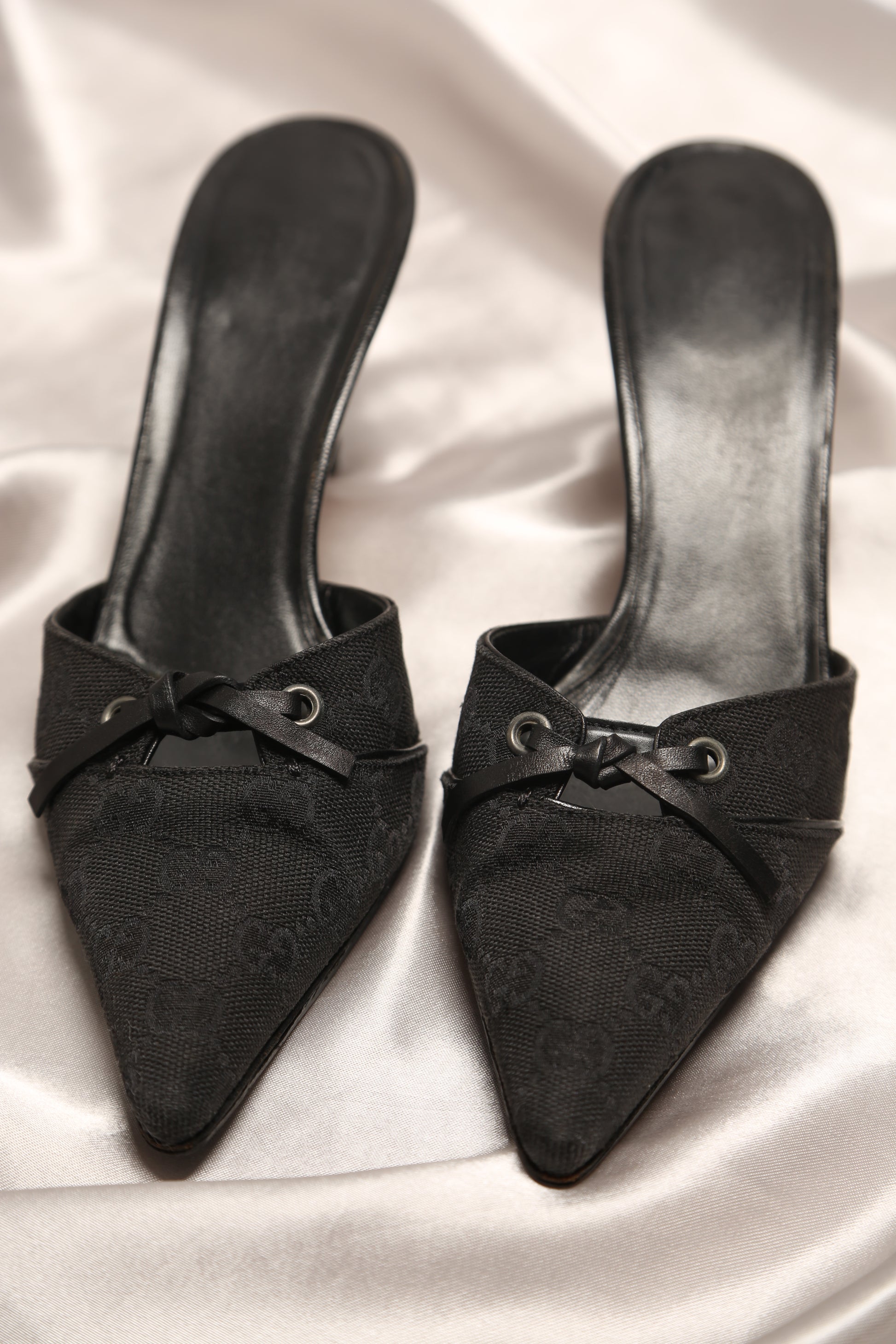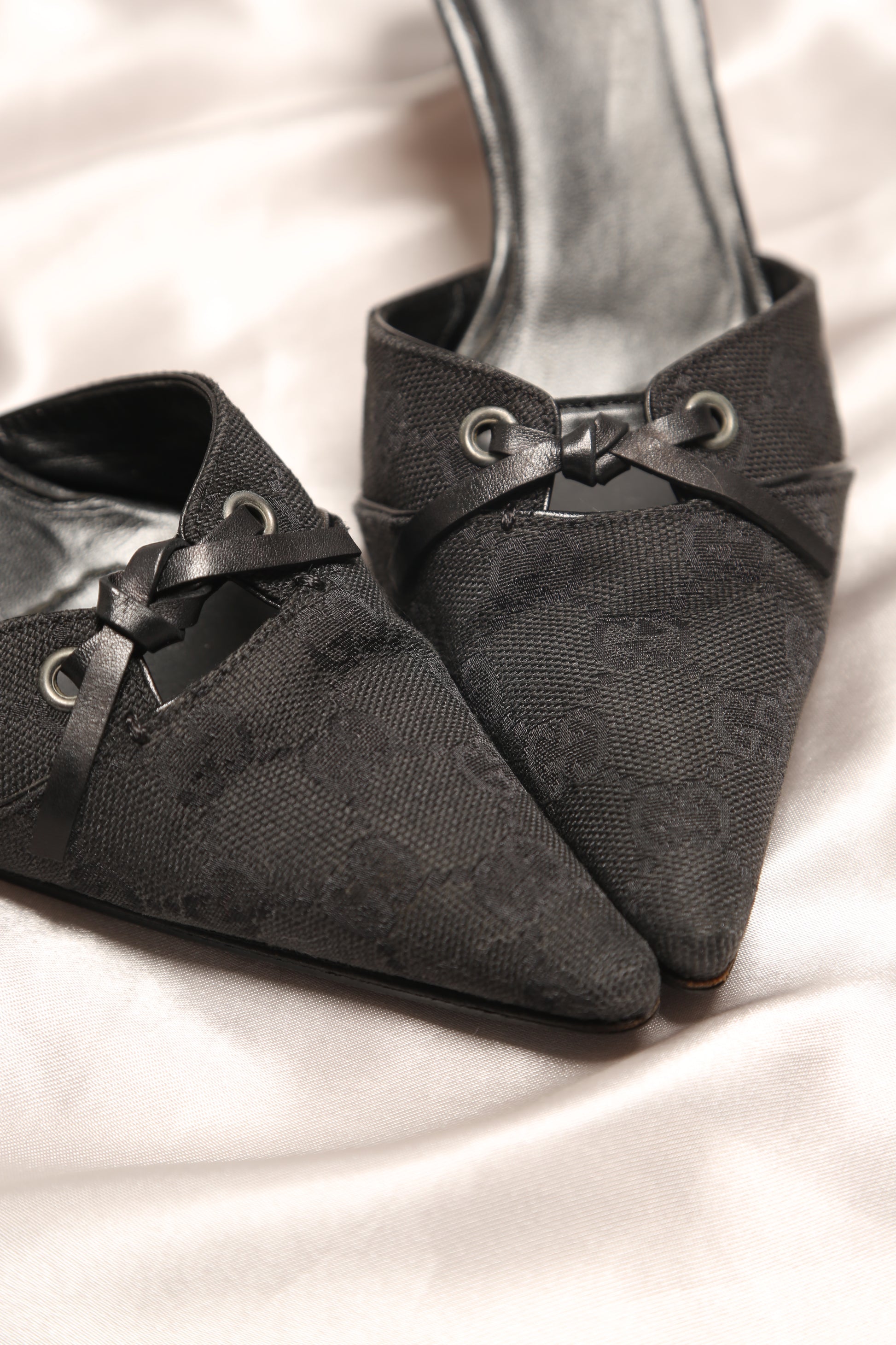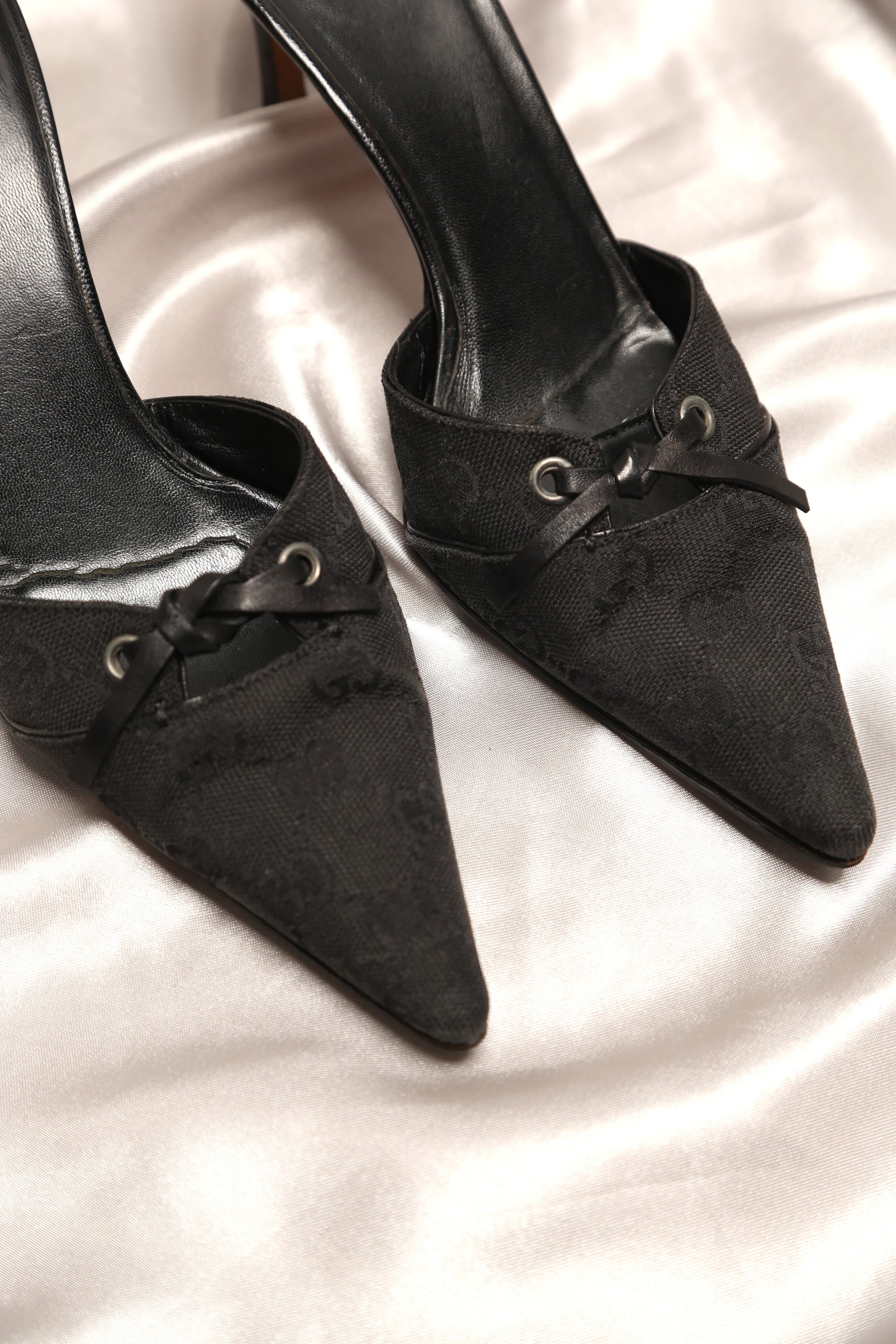 These classic black Gucci pointed-toe heels feature a signature GG canvas design with elegant leather bow detailing. A timeless vintage piece, they exhibit some wear on the leather of the heels, adding character to their sophisticated style.