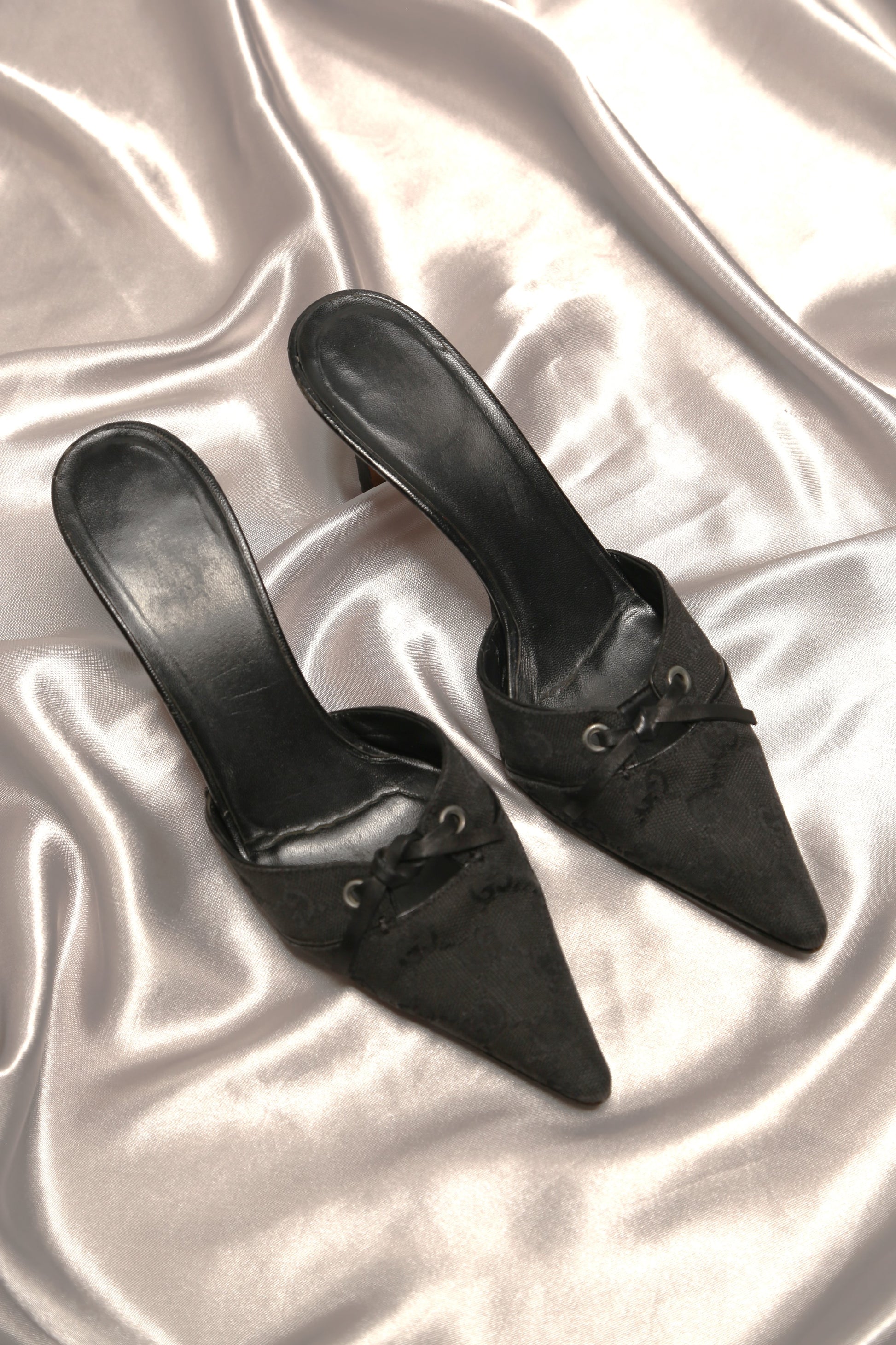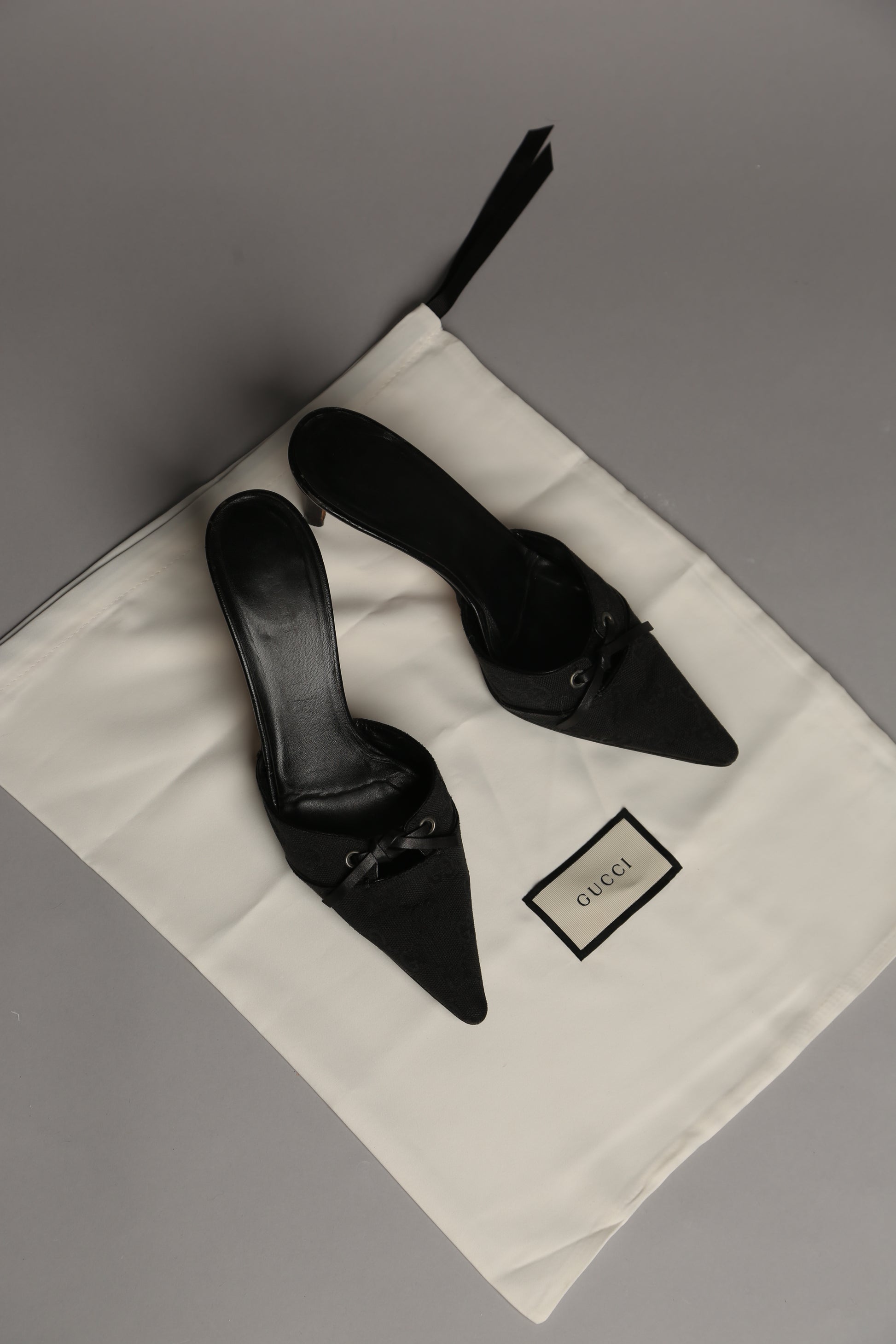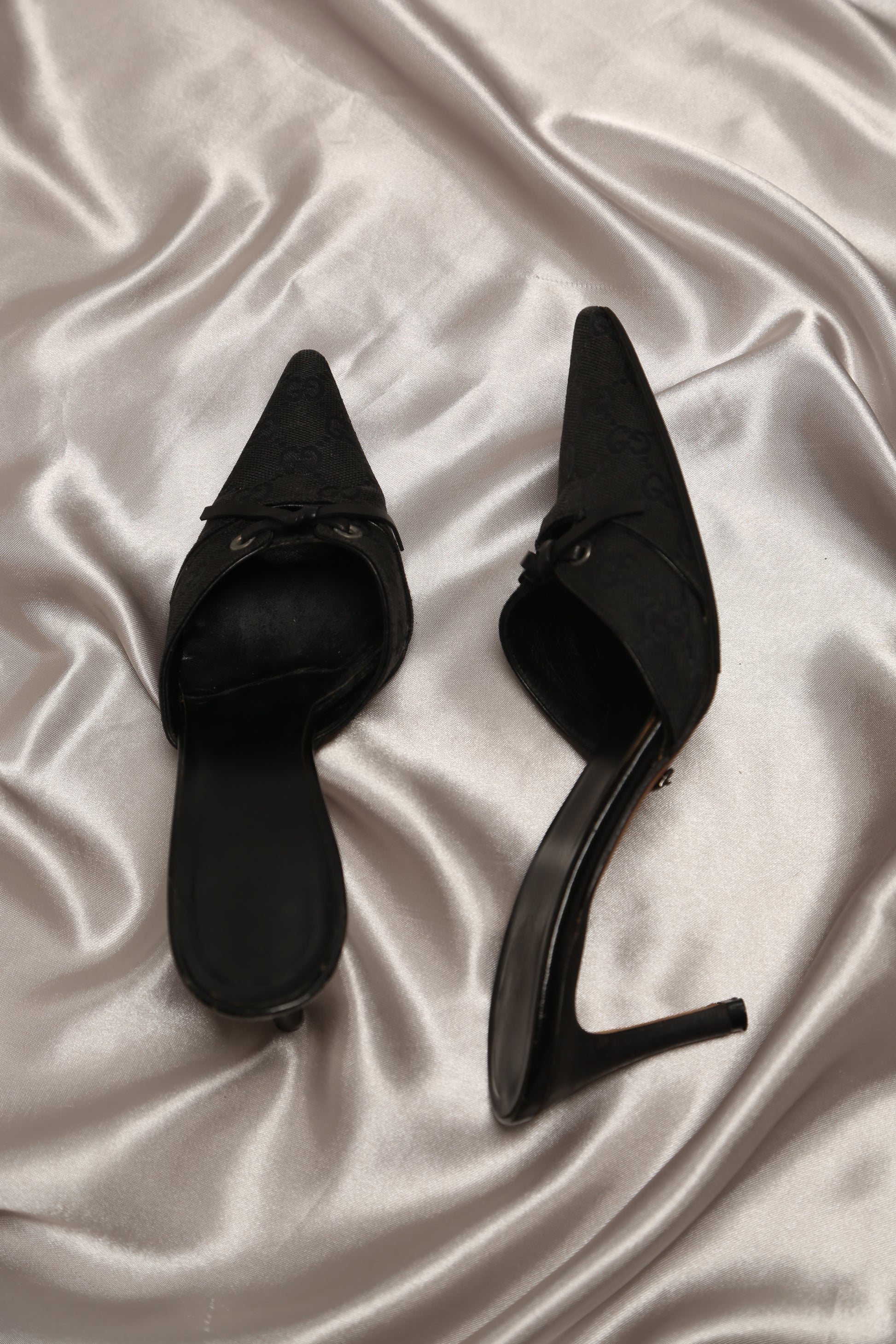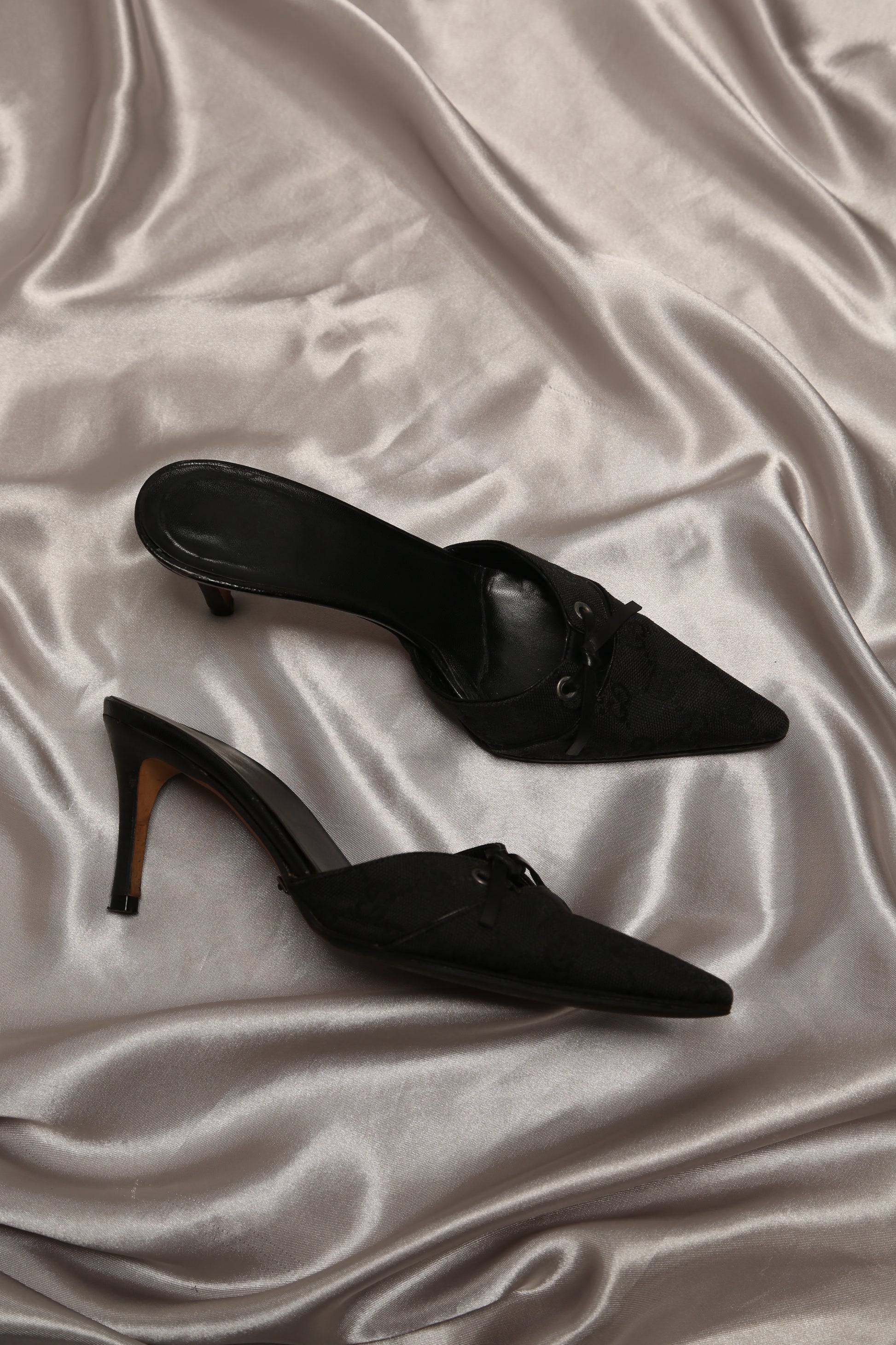 These classic black Gucci pointed-toe heels feature a signature GG canvas design with elegant leather bow detailing. A timeless vintage piece, they exhibit some wear on the leather of the heels, adding character to their sophisticated style.